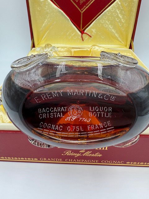 - 1) Text on label: Bottle (printed directly on glass, front/bottom section): E. REMY MARTIN & CIE BACCARAT CRISTAL LIQUOR BOTTLE COGNAC 0.75L FRANCE AG 1743 PRODUCED IN FRANCE BY E. REMY MARTIN & CIE COGNAC IMPORTED BY REMY AMERIQUE, INC. NEW YORK, N.Y. R. LAOPTE Box (inside lid, red diamond panel): LOUIS XIII Rémy Martin GRANDE CHAMPAGNE COGNAC Box (exterior side and lid): LOUIS XIII Rémy Martin GRANDE CHAMPAGNE COGNAC 2) Visual elements: Bottle: A clear Baccarat crystal decanter with 12 distinct glass "teeth" or scallops around its circumference. It features a golden ribbed screw cap. A gold foil band on the neck shows an embossed centaur emblem. The main body has a central embossed circular medallion displaying a centaur holding a spear and shield, with three smaller embossed circular medallions below it, each depicting a centaur or fleur-de-lis. Text is printed directly onto the glass. Box: A red hard case with gold trim and gold fleur-de-lis motifs on the exterior. The interior is lined with quilted gold satin fabric. The inside of the lid features a red diamond-shaped panel with a gold border. A clear glass fleur-de-lis stopper is visible next to the bottle. Font styles: The bottle's primary text uses a clear serif font. The box text for "LOUIS XIII" is a decorative serif style, "Rémy Martin" is in a flowing script, and "GRANDE CHAMPAGNE COGNAC" uses a simple serif font. 3) Fill level estimate: well above shoulder into neck: great