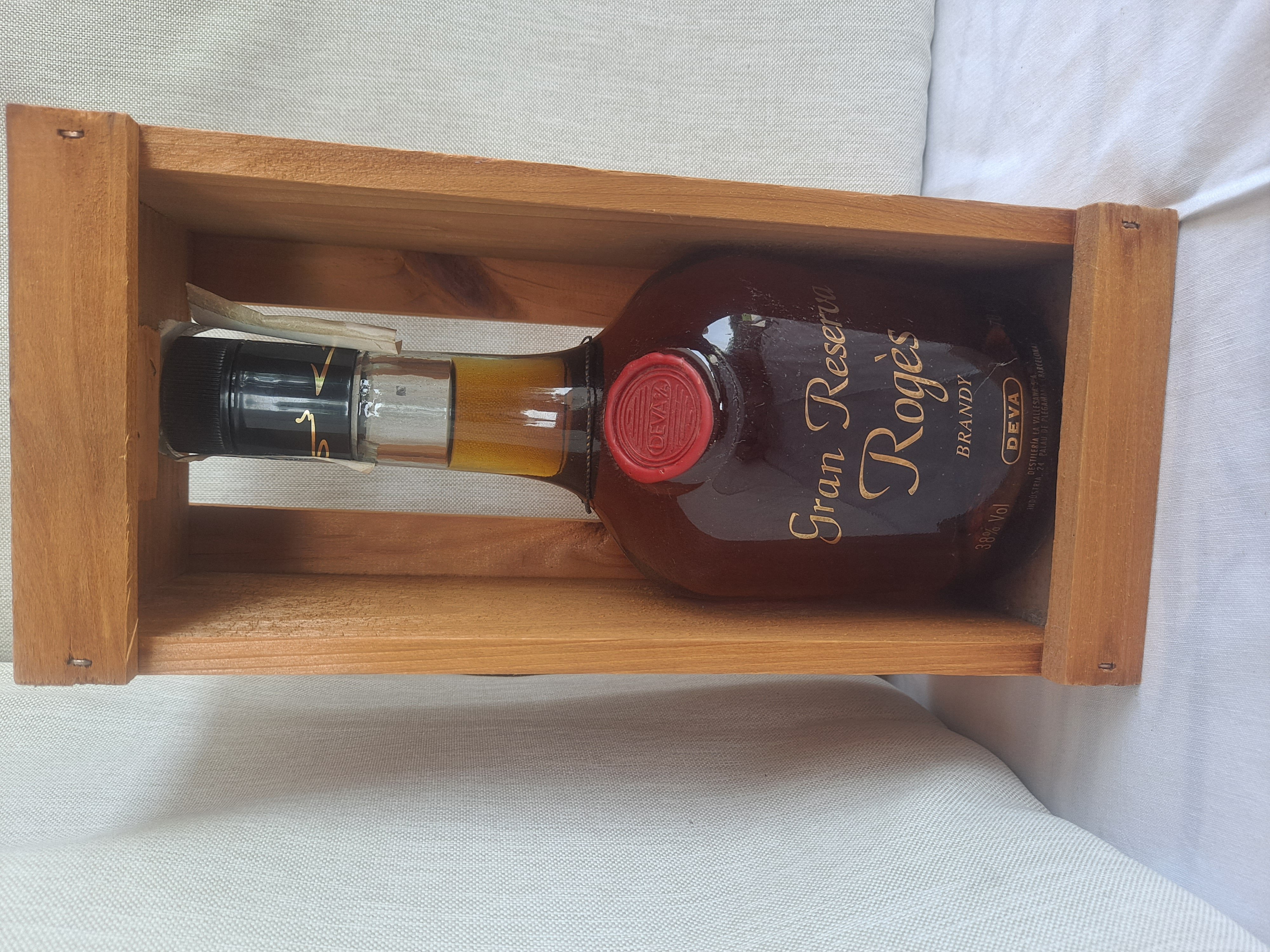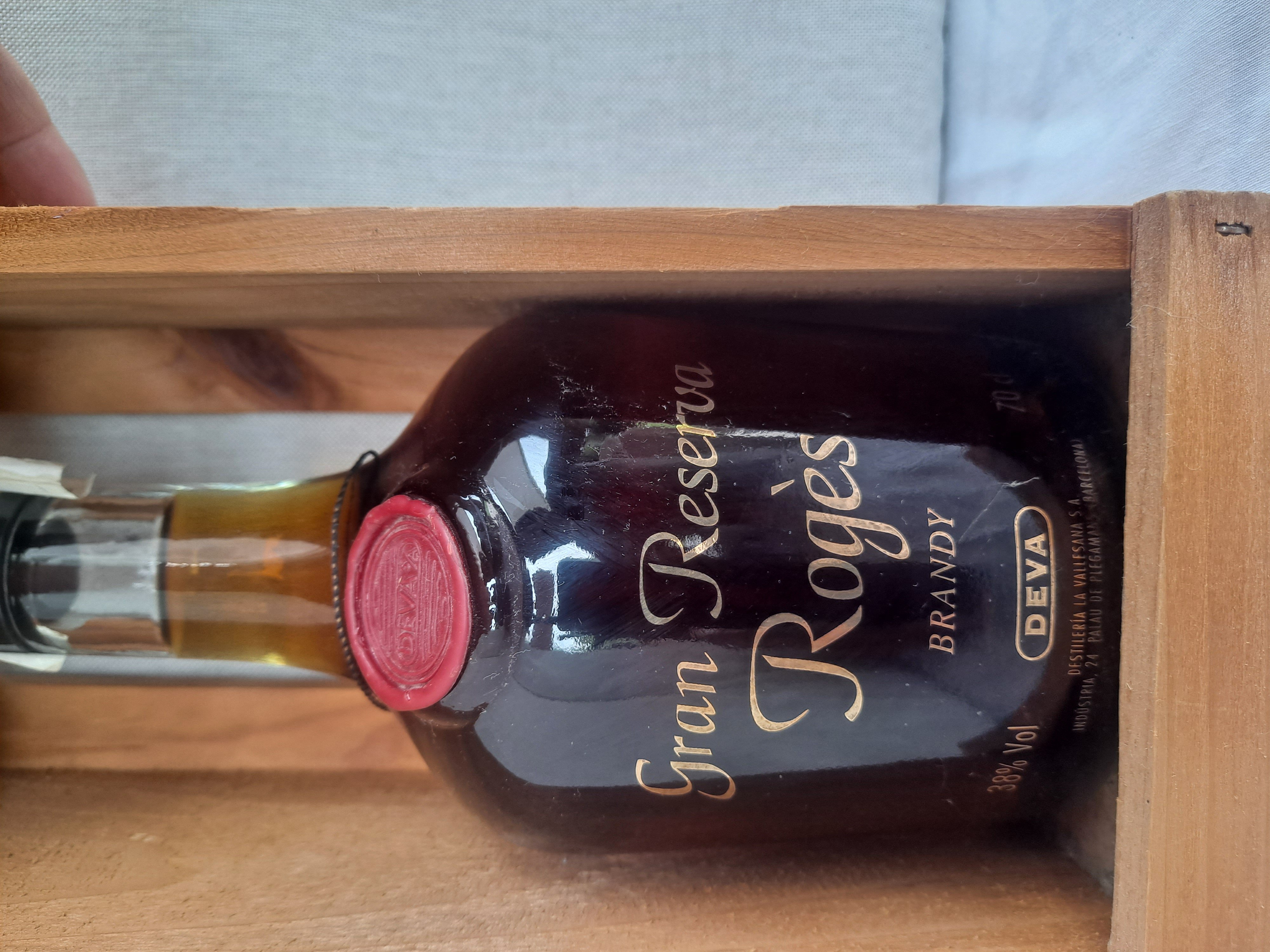 - 1) Text on label: Gran Reserva Rogès BRANDY 38% VOL 70cl DEVA DESTILLERIA LA VALLESANA S.A. INDUSTRIA, 24 PALAU DE PLEGAMANS BARCELONA On wax seal (upper shoulder): DEVA 2) Visual elements (concise): Mid label: "Gran Reserva Rogès" is in a prominent gold decorative/script font. "BRANDY" appears below in a gold sans-serif block font. Smaller text for "38% VOL", "70cl", "DEVA" (logo), and the address is in a gold sans-serif font. Upper shoulder: A red wax seal is affixed, embossed with the word "DEVA" in a sans-serif font. Neck/capsule: A black capsule with a ribbed screw cap features a golden, wave-like, abstract design. Crate: The wooden crate housing the bottle has "Gran Reserva Rogès" in a decorative/script font and "BRANDY" in a sans-serif block font, engraved vertically on its side panel. 3) Fill level estimate: well above shoulder (very good), with no significant air gap visible.