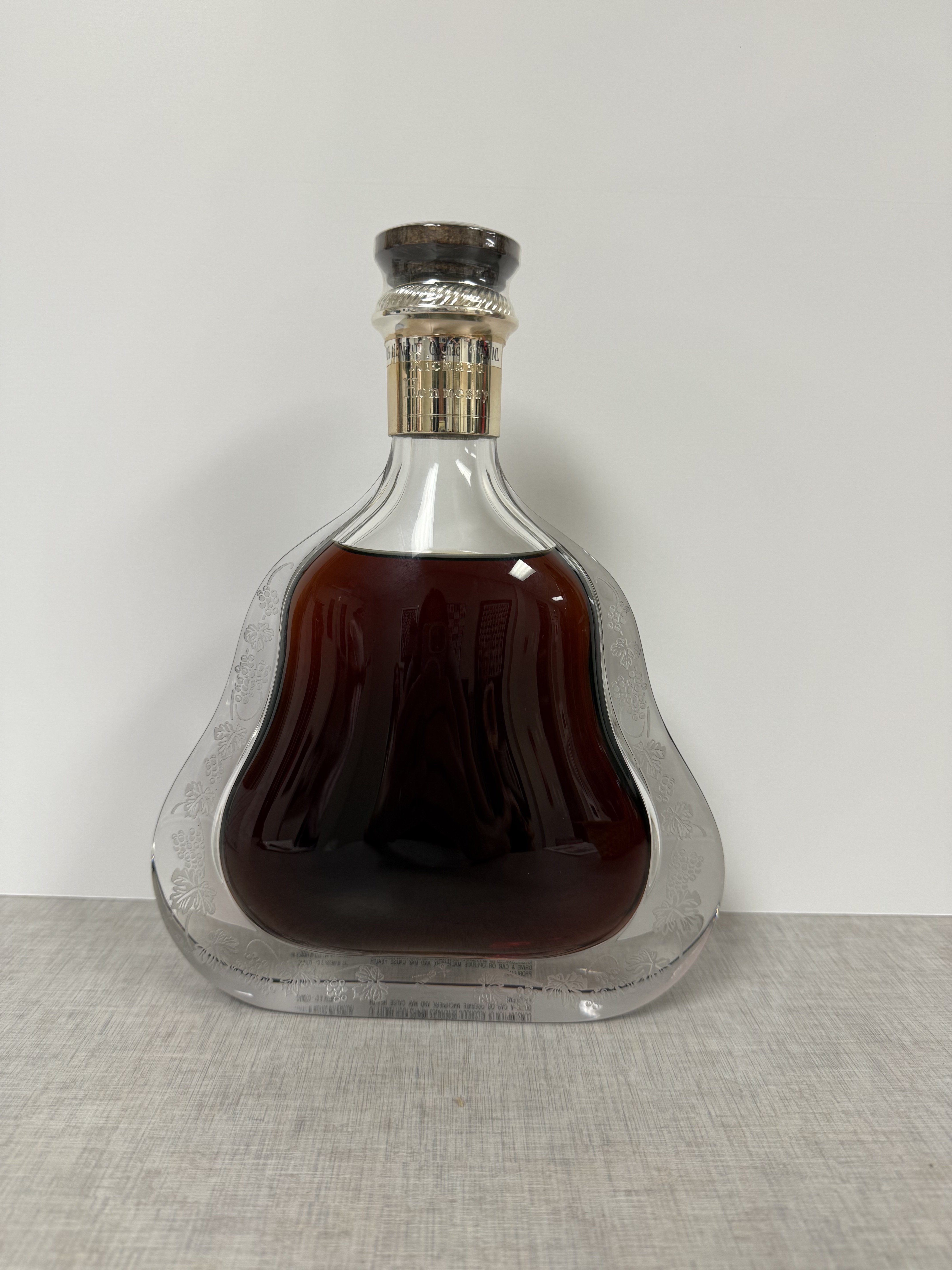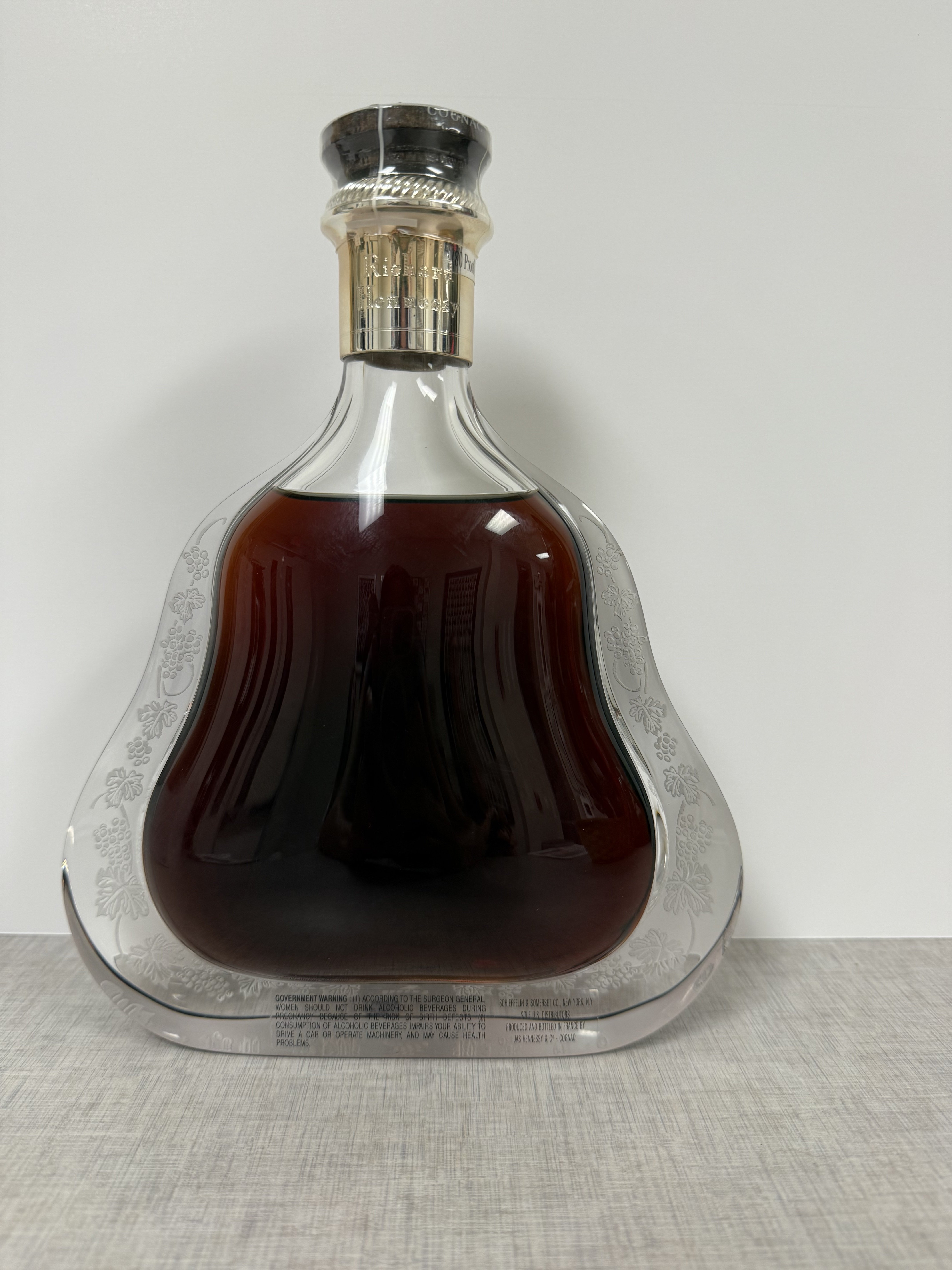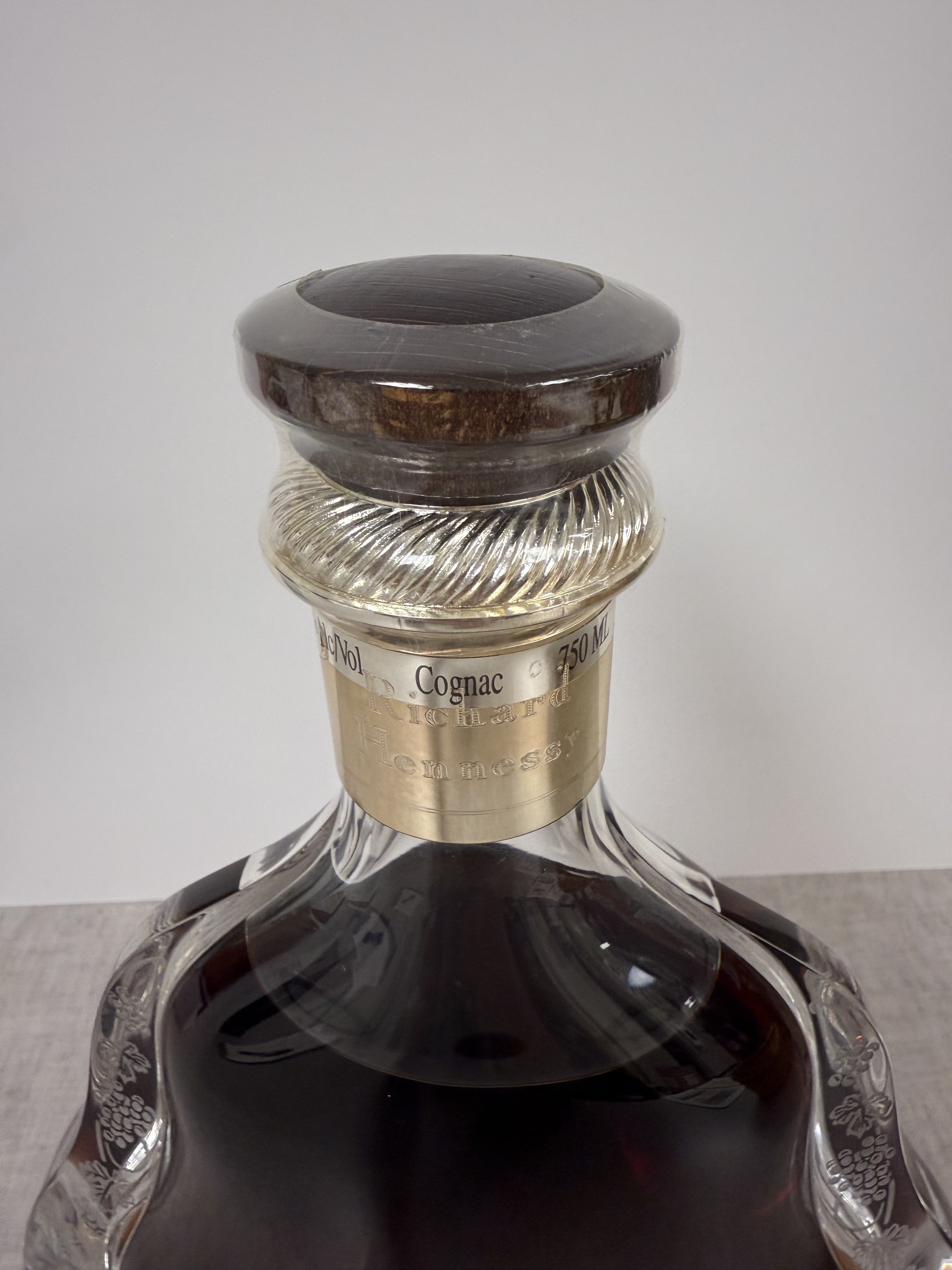 - 1) Text on label: On bottle (neck label): Cognac Richard Hennessy 40% Alc./Vol. 750 ML On bottle (lower etched label): GOVERNMENT WARNING: (1) ACCORDING TO THE SURGEON GENERAL, WOMEN SHOULD NOT DRINK ALCOHOLIC BEVERAGES DURING PREGNANCY BECAUSE OF THE RISK OF BIRTH DEFECTS. (2) CONSUMPTION OF ALCOHOLIC BEVERAGES IMPAIRS YOUR ABILITY TO DRIVE A CAR OR OPERATE MACHINERY, AND MAY CAUSE HEALTH PROBLEMS. CONTENTS 1 LITER OF FINE OLD COGNAC. PRODUCT OF FRANCE. IMPORTED BY MOËT HENNESSY U.S.A., NEW YORK, N.Y. © 2000 MHUSA. On bottle (bottom, etched): A 00993 Richard Hennessy (signature) CRISTAL de S'LOUIS FRANCE On box (front plaque): Richard Hennessy COGNAC On booklet (front plaque): Richard Hennessy COGNAC 2) Visual elements: The bottle has a distinctive flattened pear or bell shape. The neck features a dark wooden stopper, topped with a clear plastic seal, above a textured silver-colored collar with a twisted rope design. A gold-colored strip label wraps around the upper neck. The lower body of the clear glass bottle is etched with a delicate floral or vine pattern. The text on the neck label uses a combination of sans-serif for "Cognac" and "40% Alc./Vol. 750 ML", and a classic serif font for "Richard Hennessy". The lower etched label features small, condensed sans-serif text. The serial number and "Richard Hennessy" signature on the bottom are in a handwritten block/cursive style, accompanied by a circular emblem reading "CRISTAL de S'LOUIS FRANCE". The presentation box is dark green with rounded edges, featuring a silver-colored plaque on the front with a decorative border. The internal lining is made of yellow/gold satin. A matching dark green booklet with a similar silver-colored plaque is included. A clear glass decanter stopper, resembling a faceted teardrop, is also present. 3) Fill level estimate: well above shoulder into neck: great