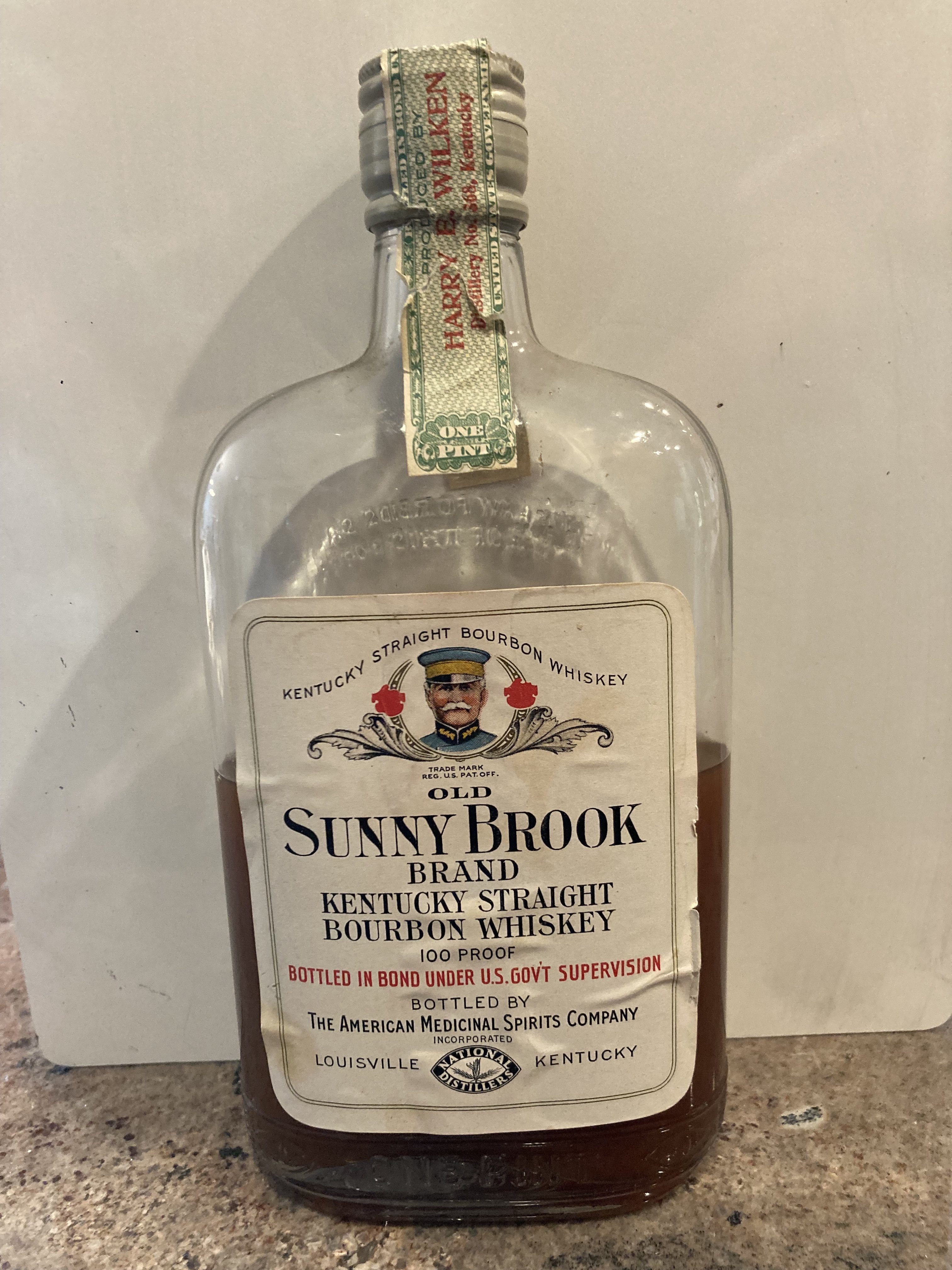 - Kentucky Straight Bourbon Whiskey Old Sunny Brook Brand Kentucky Straight Bourbon Whiskey 100 Proof Bottled in Bond Under U.S. Govt Supervision Bottled By The American Medicinal Spirits Company Louisville Kentucky