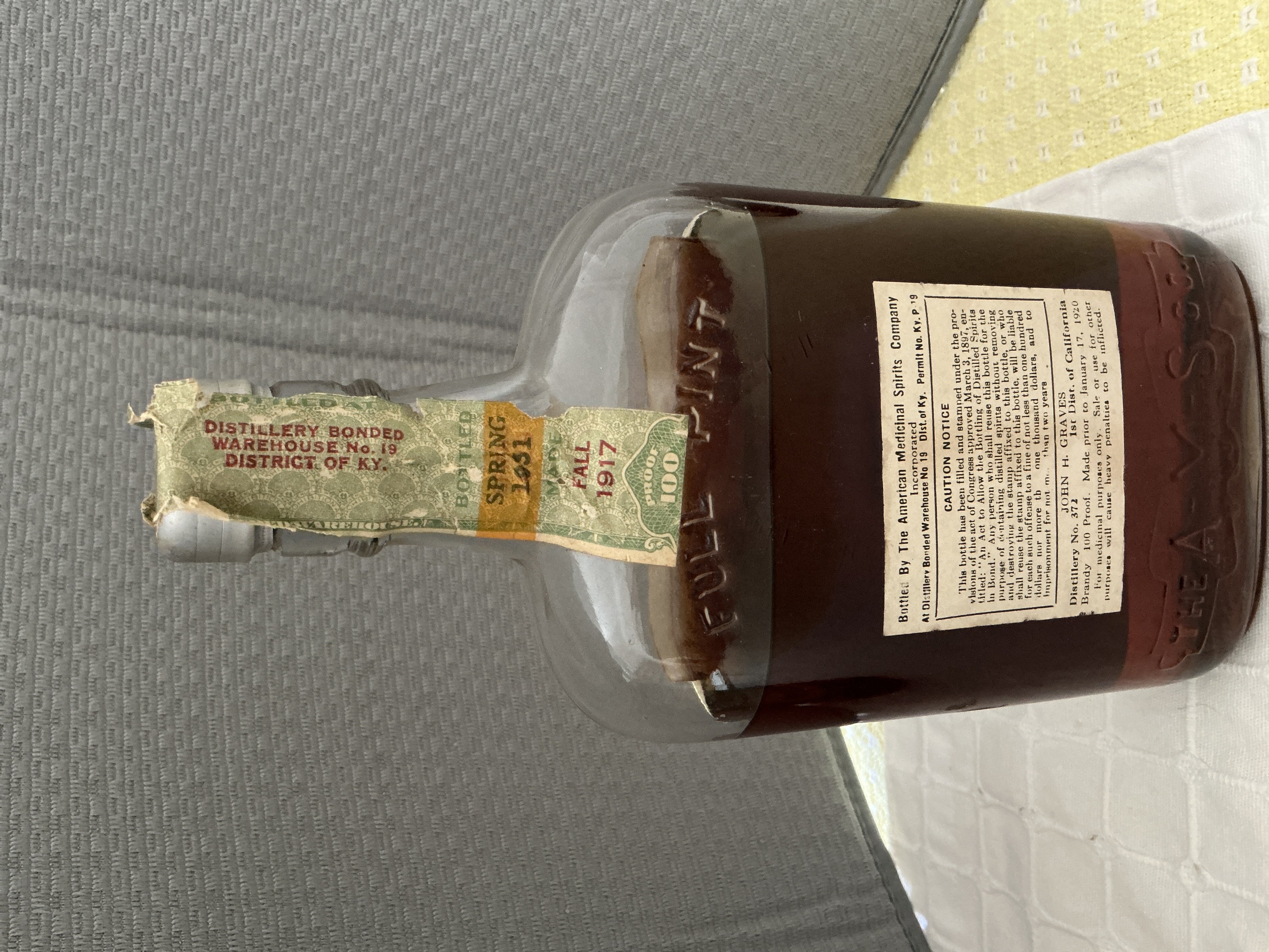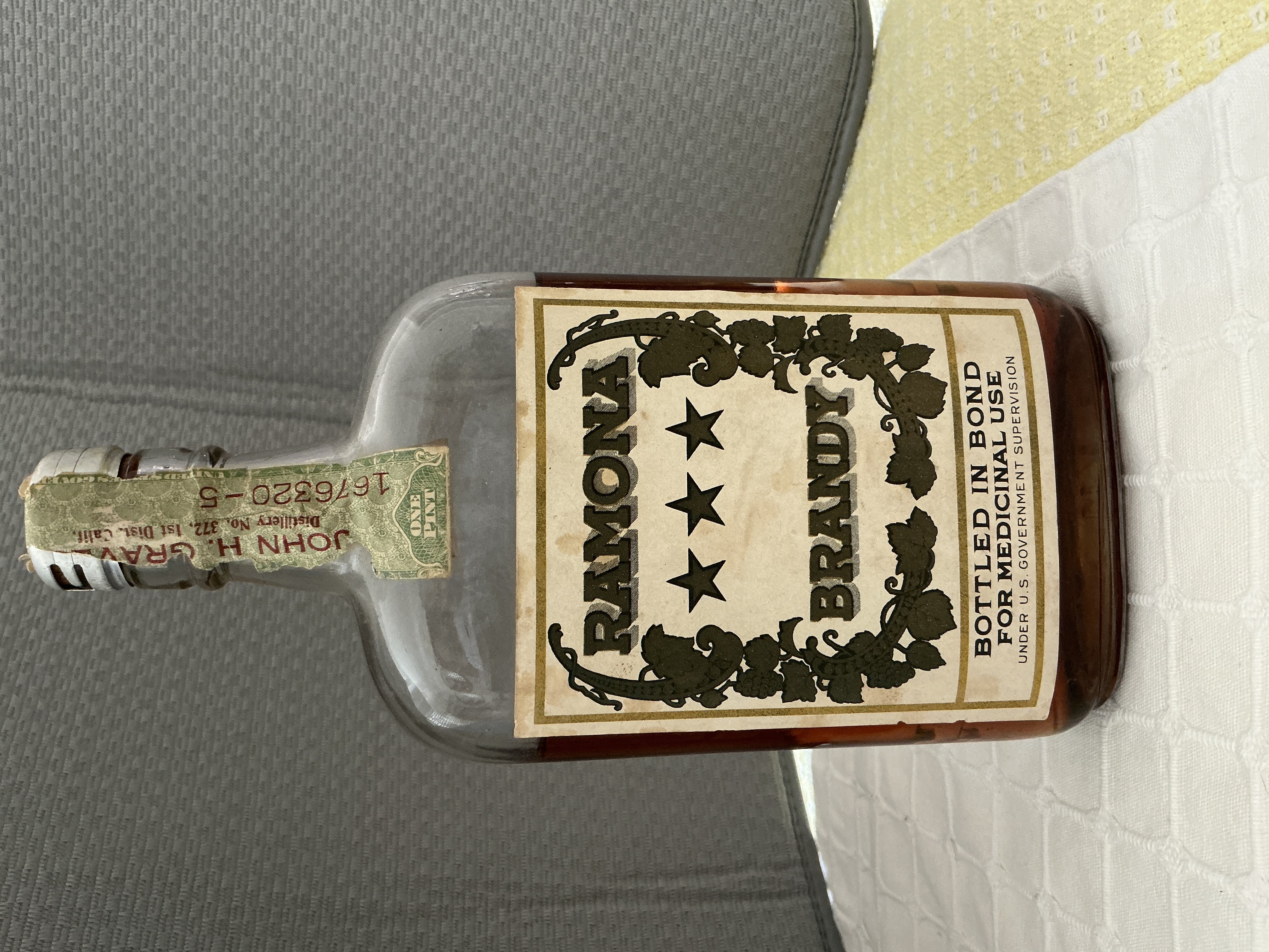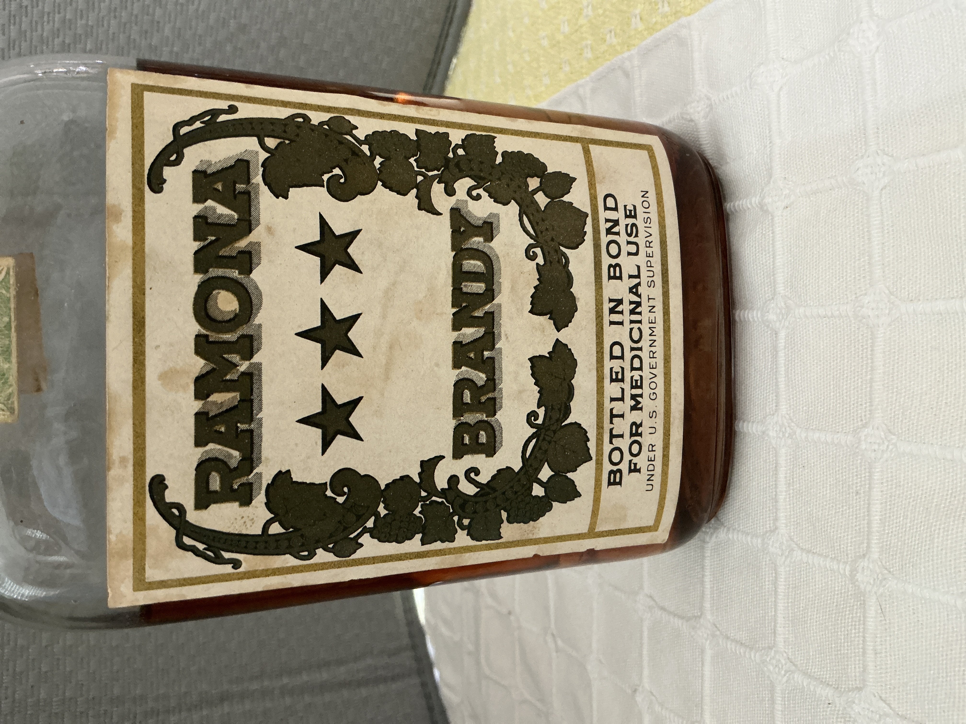 - Ramona Brandy, Bottled in Bond for Medicinal use, under US Government supervision, the back label has the same along with a caution notice and the John H Graves distillery no372 Brandy 100 proof, made prior to January 17, 1920.
