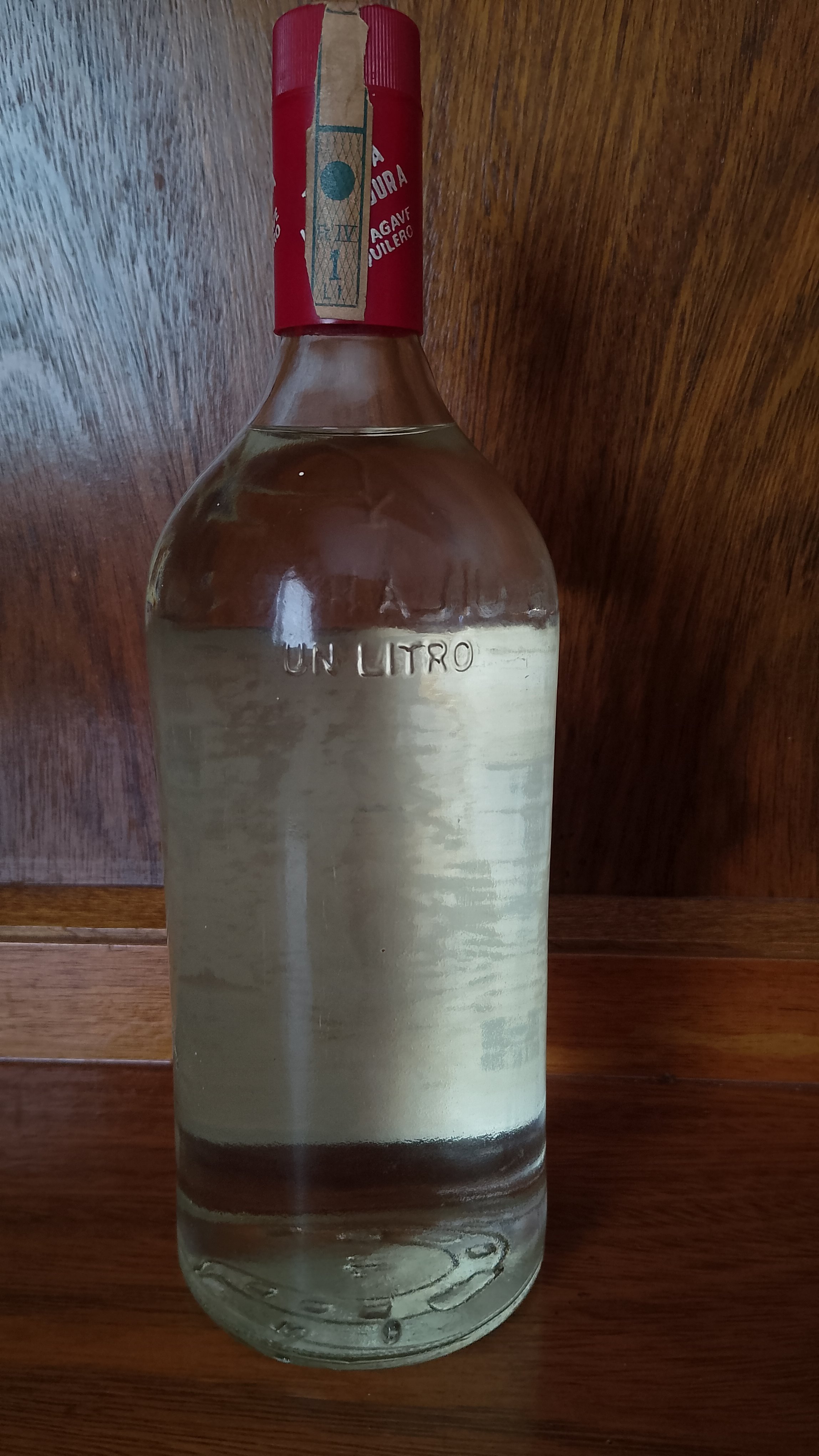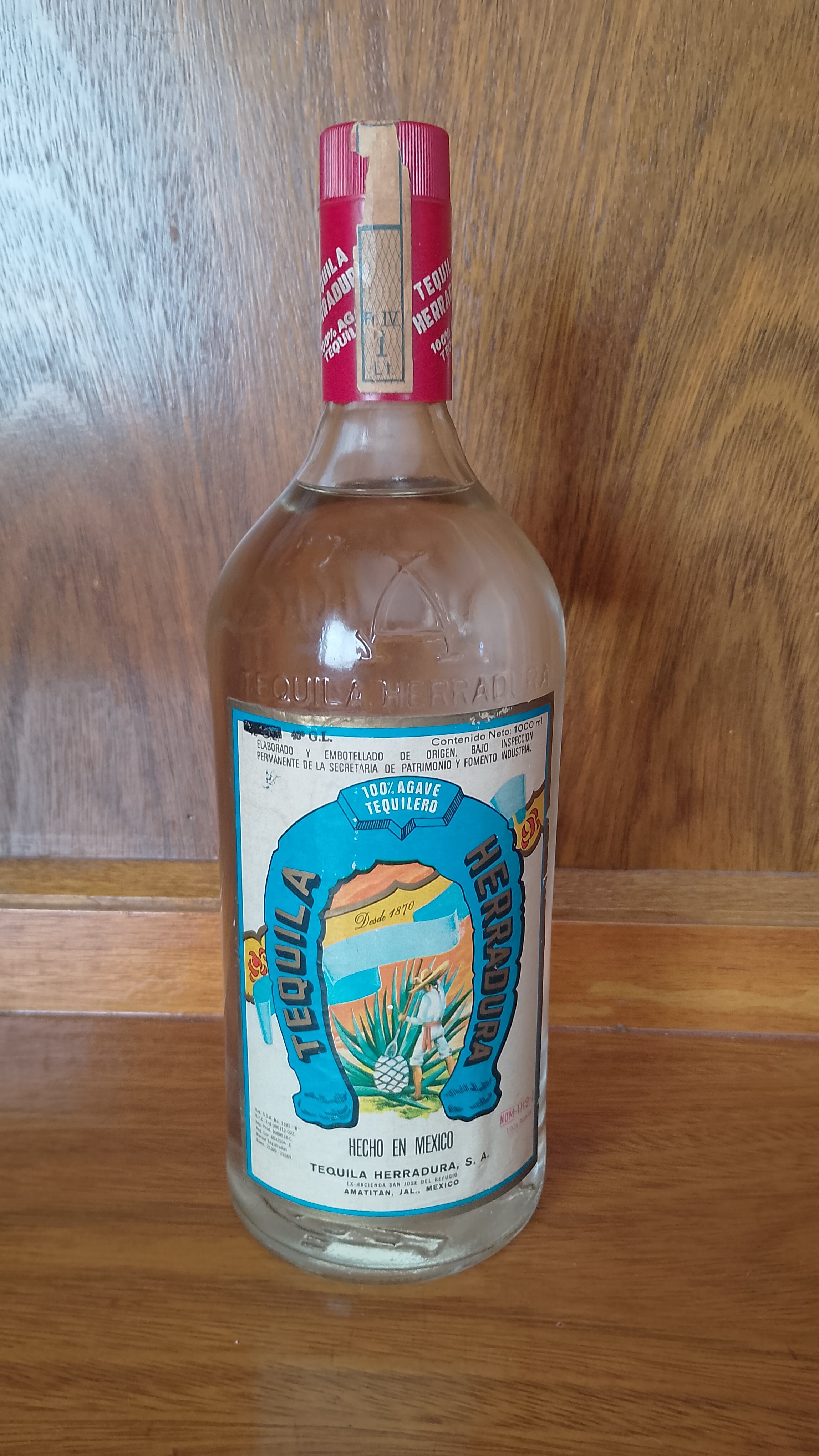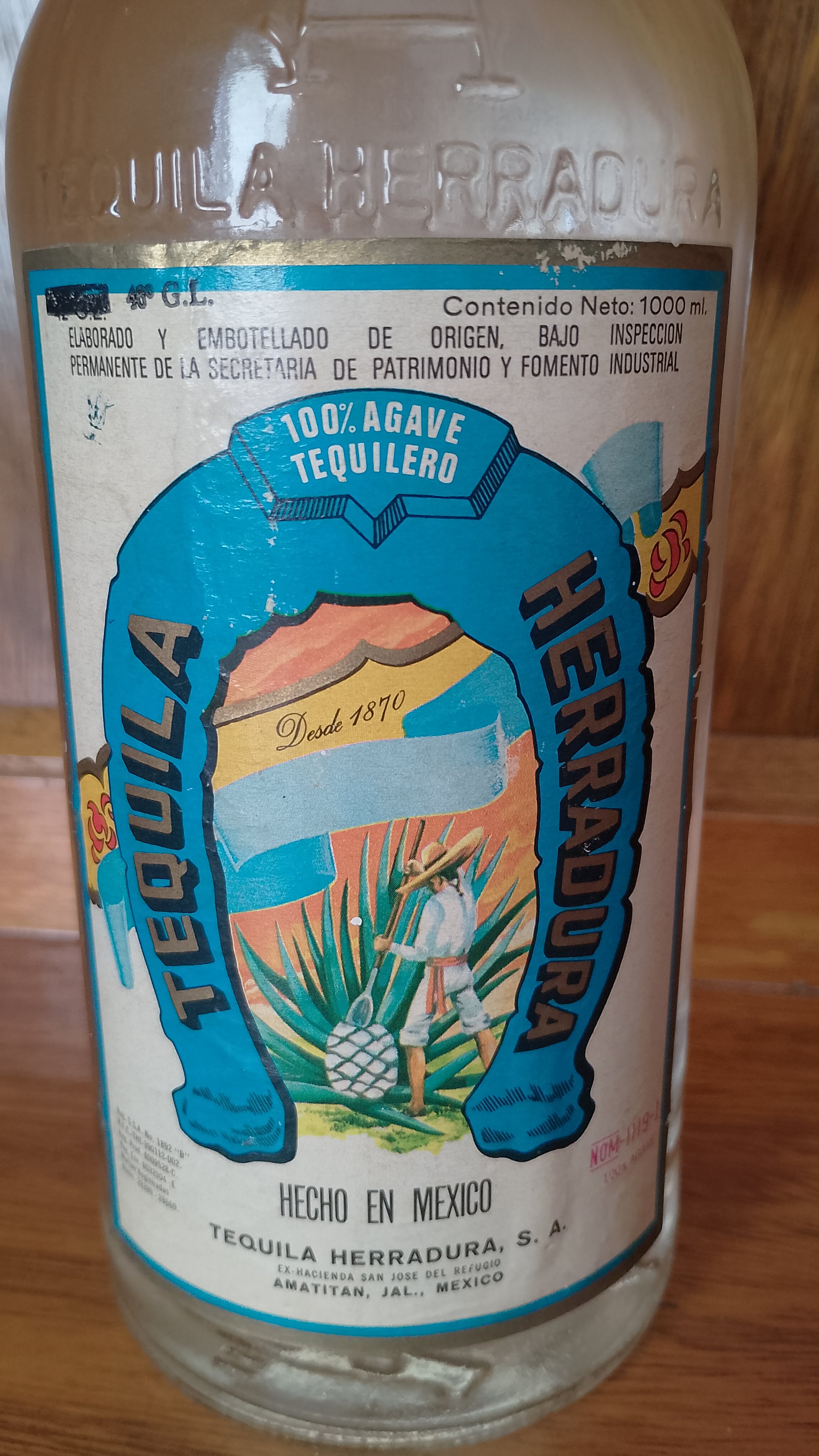 - Tequila Herradura - 100% agave tequilero 46° GL (might be a 48 as well... The second number is bot as clear) -Elaborado y embotellado de origen, bajo inspección permanente de la secretaria de patrimonio y fomento industrial - Cont. neto: 1000 mil. Desde 1870 Hecho en México NOM - 1119-I Reg.S.S.A. No. 1892 "B" R.F.C.-THE-390112-002. Reg.Prod. 0009528-C Reg. Env. 0032504 - E Marcas registradas Núms. 23399 - 28669. TEQUILA HERRADURA EX-hacienda San José del Refugio AMATITAN, JAL., MEXICO