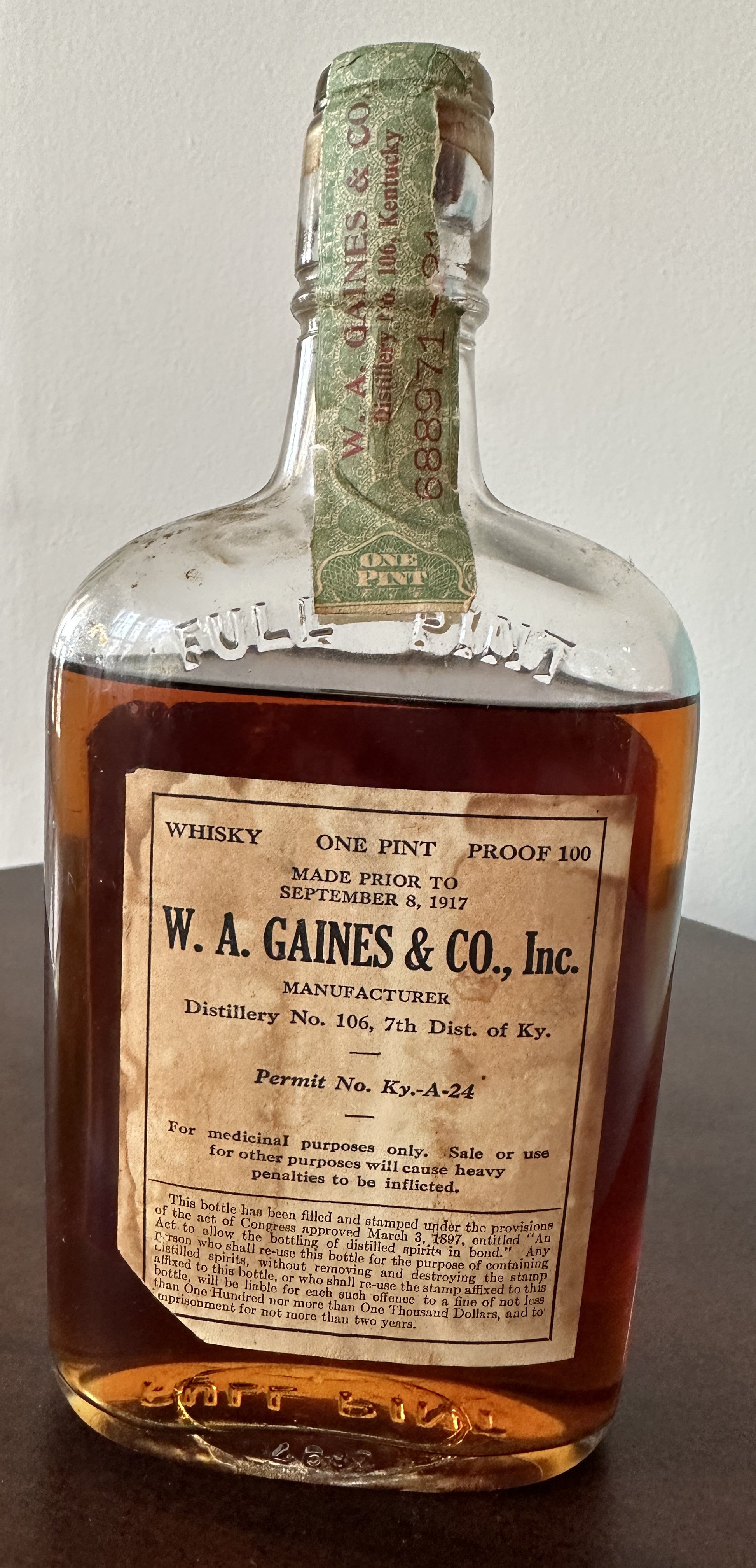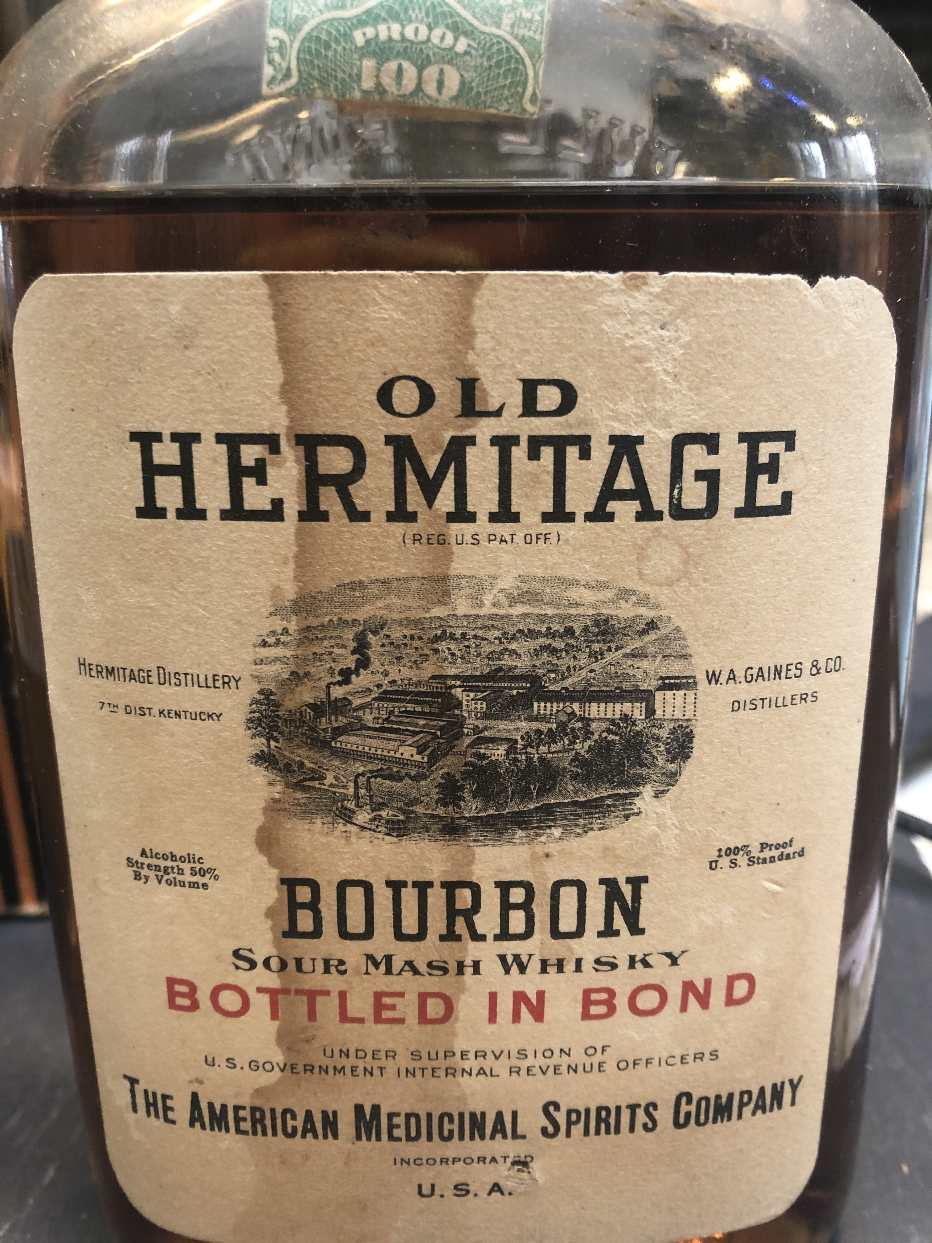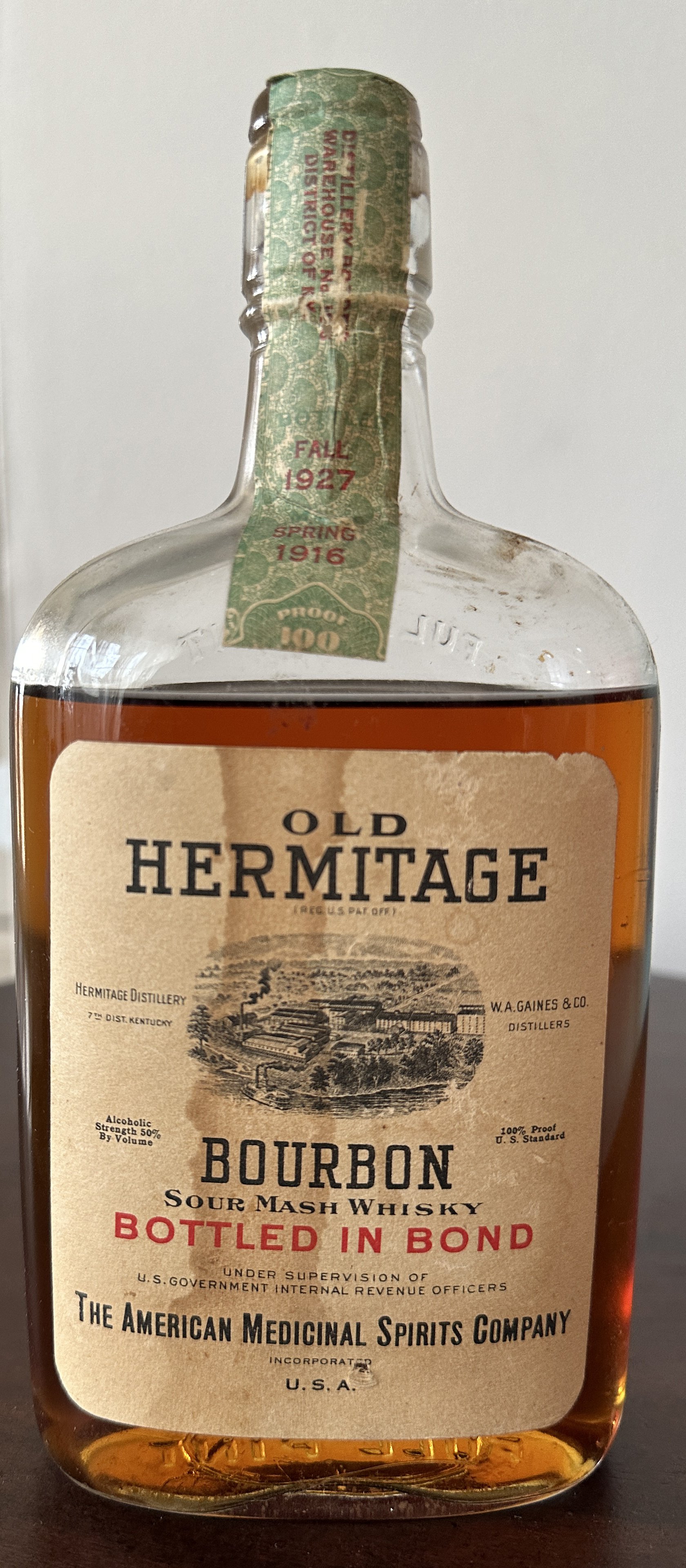 - Tax Seal Front: DISTILLERY [UNCLEAR] WAREHOUSE No. [UNCLEAR] DISTRICT OF [UNCLEAR] BOTTLED FALL 1927 MADE SPRING 1916 PROOF 100 Front Label: OLD HERMITAGE (REG. U.S. PAT. OFF.) HERMITAGE DISTILLERY W. A. GAINES & CO DISTILLERS 7th DIST. KENTUCKY Alcoholic Strength 50% By Volume 100% Proof U.S. Standard BOURBON SOUR MASH WHISKY BOTTLED IN BOND UNDER SUPERVISION OF U.S. GOVERNMENT INTERNAL REVENUE OFFICERS THE AMERICAN MEDICINAL SPIRITS COMPANY INCORPORATED U.S.A. Tax Seal Rear: W.A. GAINES & CO. Distillery No. 106, Kentucky 688971-21 [last two digits presumed, only the tops of numbers are intact] ONE PINT Rear Label: WHISKY ONE PINT PROOF 100 MADE PRIOR TO SEPTEMBER 8, 1917 W. A. GAINES & CO., Inc. MANUFACTURER Distillery N. 106, 7th Dist. of Ky. Permit No. Ky.-A-24 For medicinal purposes only. Sale or use for other purposes will cause heavy penalties to be inflicted. This bottle has been filled and stamped under the provisions of the act of Congress approved March 3, 1897, entitled "An Act to allow the bottling of distilled spirits in bond." Any person who shall re-use this bottle for the purpose of containing distilled spirits, without removing and destroying the stamp affixed to this bottle, or who shall re-use the stamp affixed to this bottle, will be liable for each such offence to a fine of not less than One Hundred nor more than One Thousand Dollars, and to imprisonment for not more than two years.