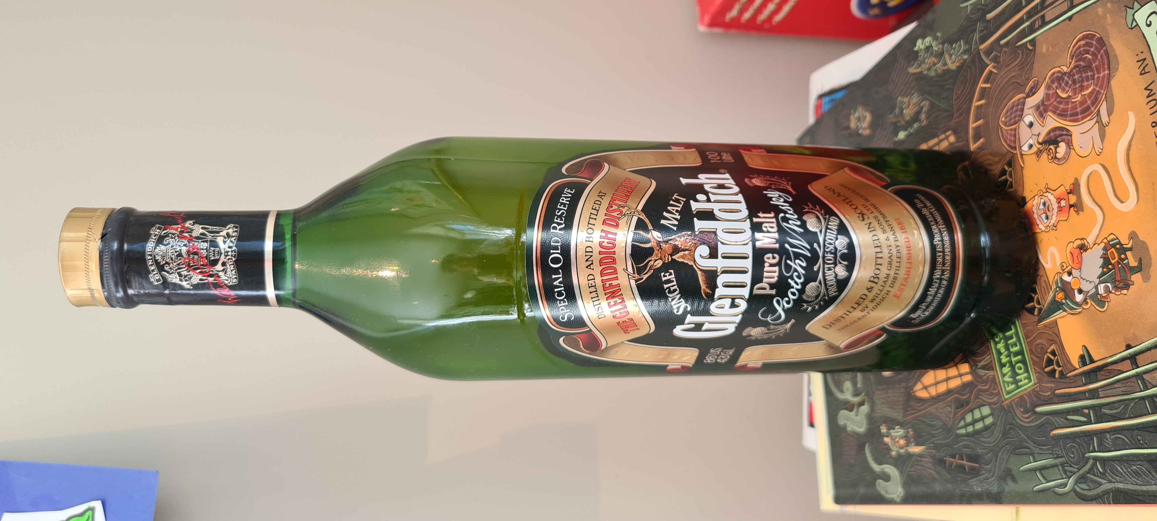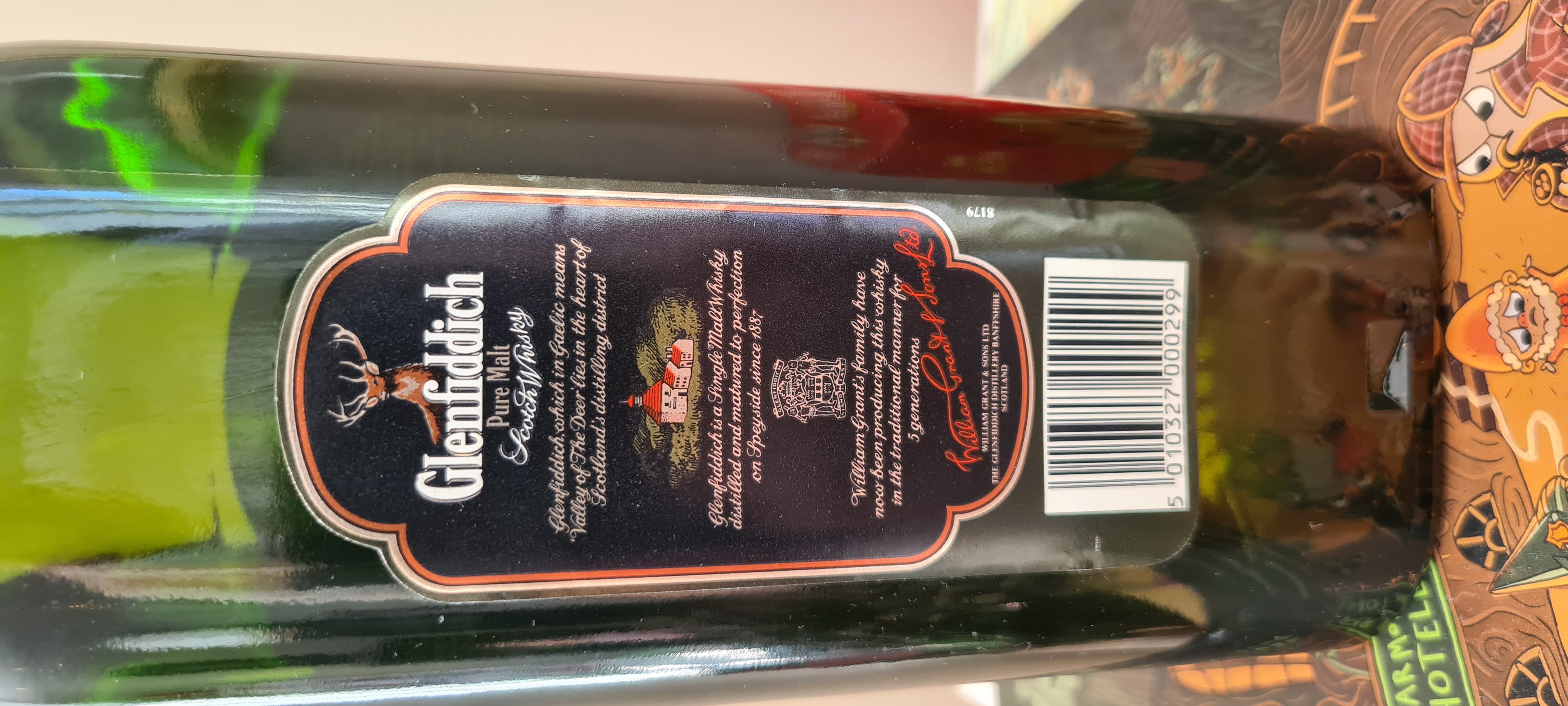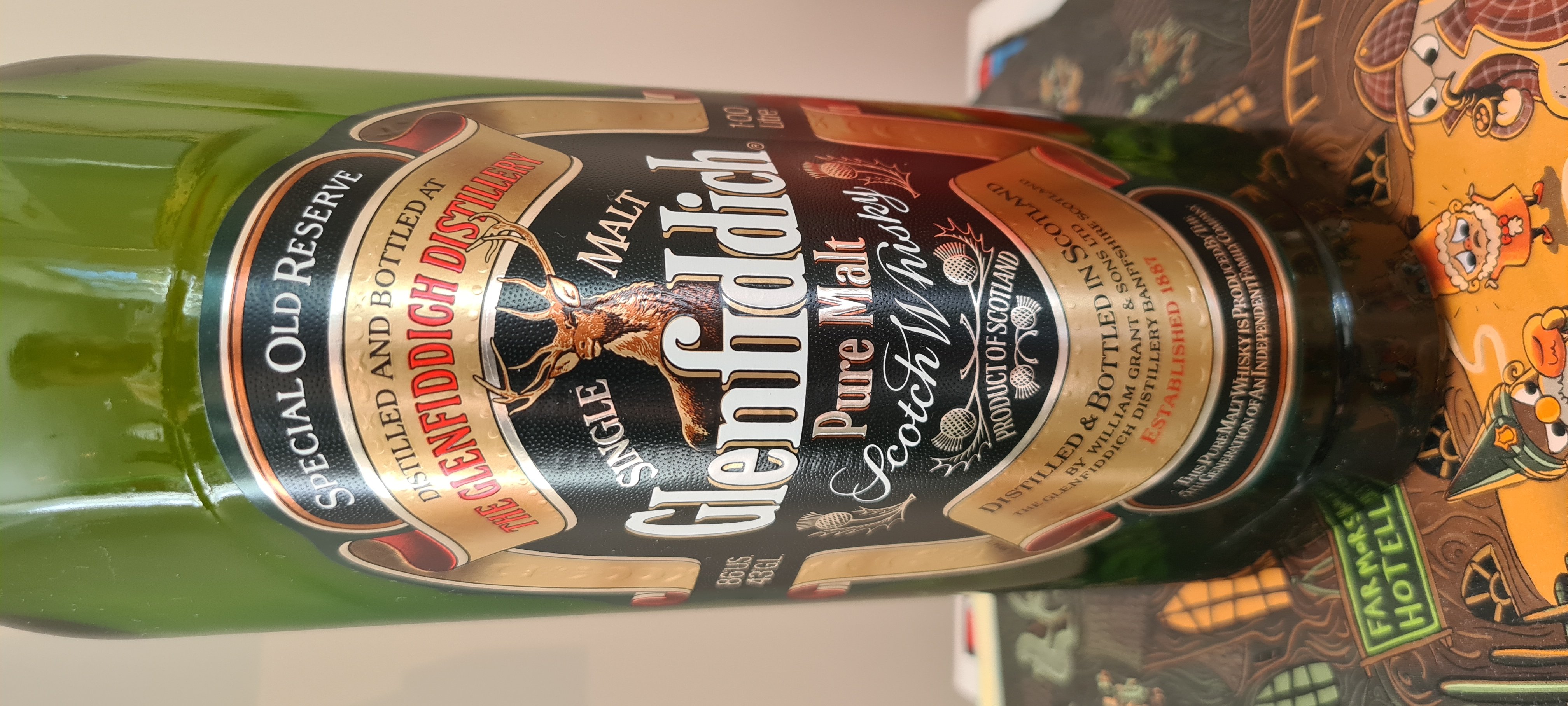- Spesial old reserve Distilled and bosted at The glenfiddich destillert Single malt Glenfiddich pure malt Scotch whisky Product of Skottland Distilled & bosted in Skottland By William grant & syns LTD The glenfiddich distillery banffshire Skottland Establishment 1887 The pure malt wisky is producer by the 5th generasjon of an independent family company