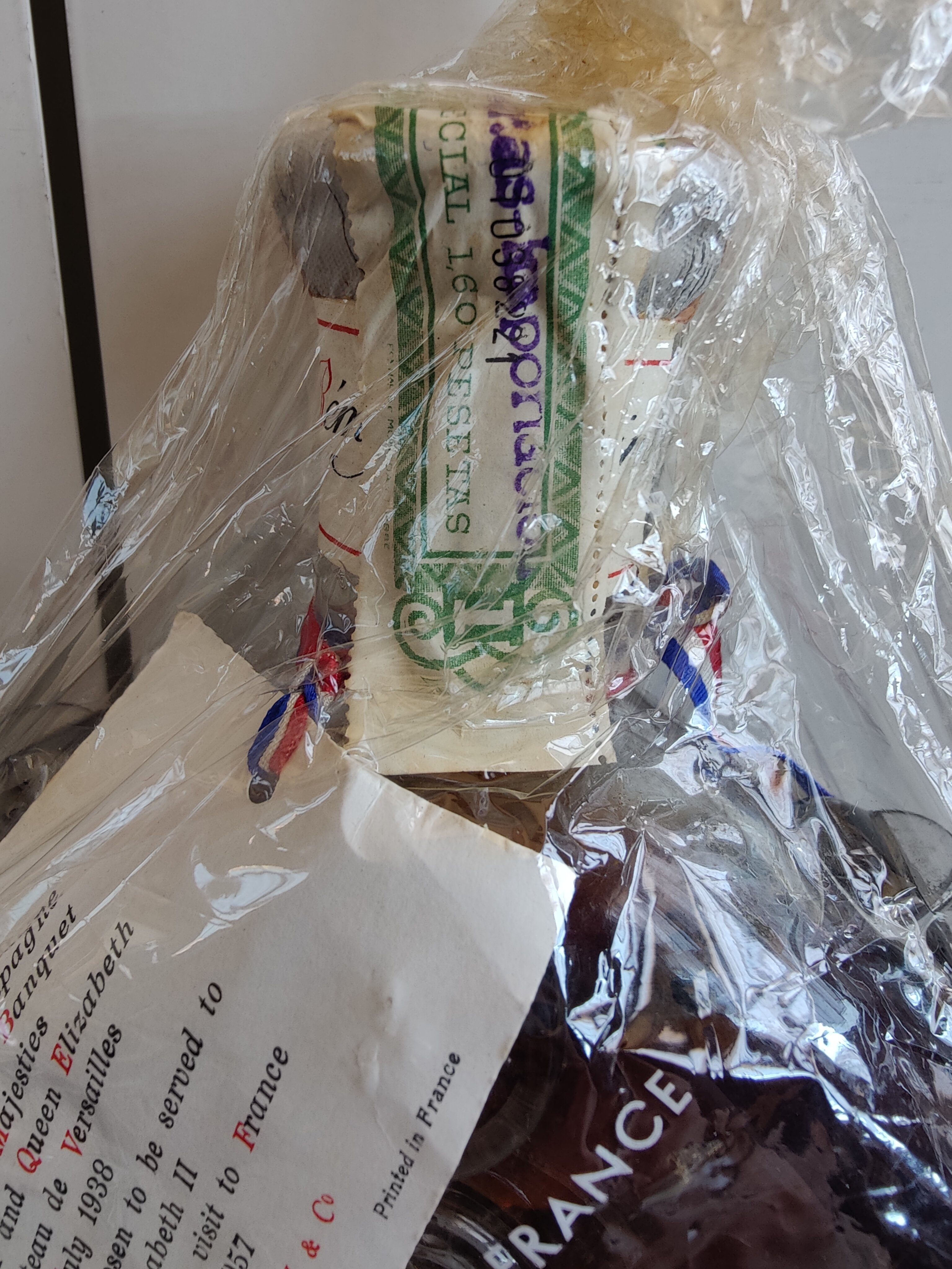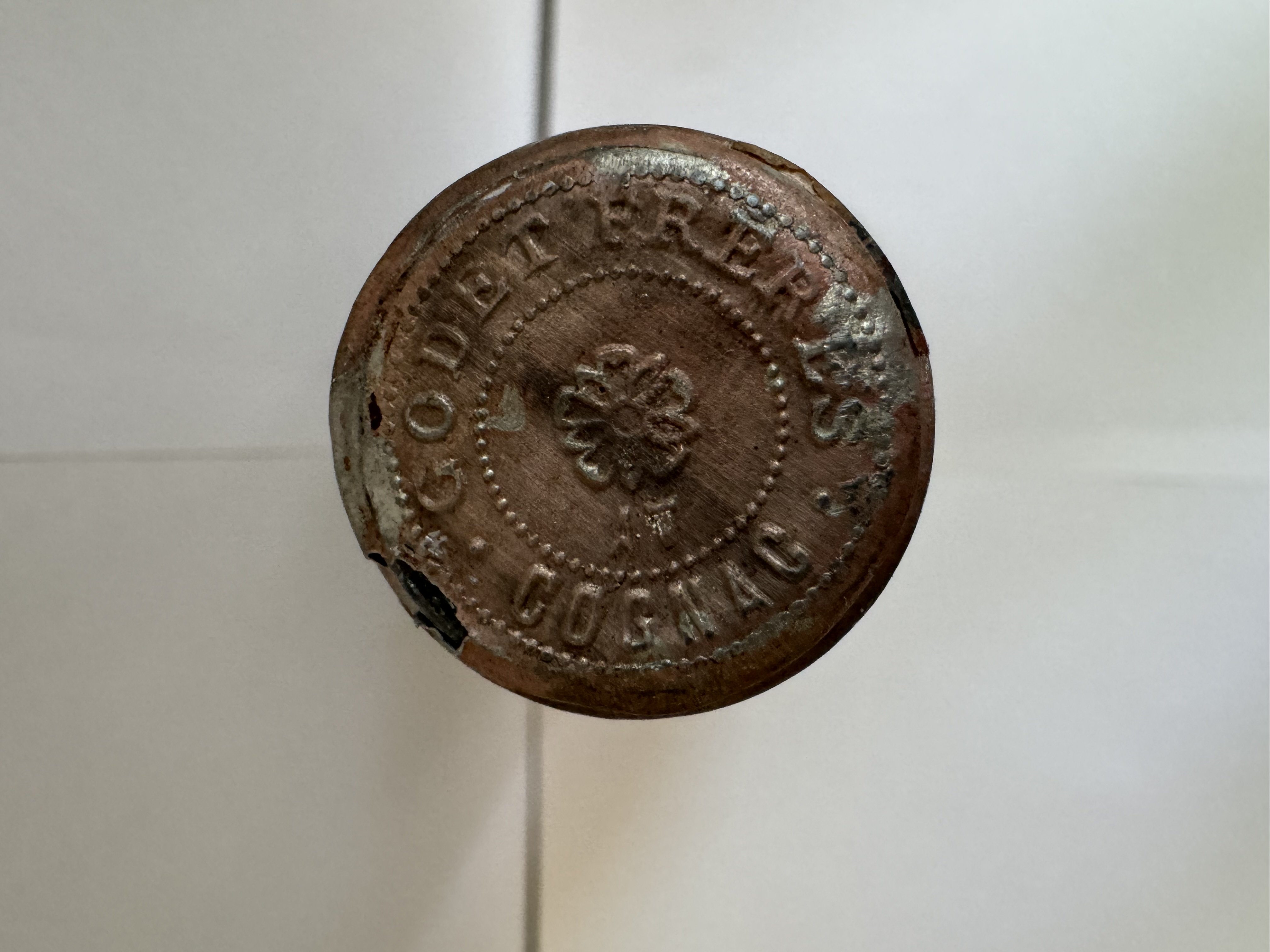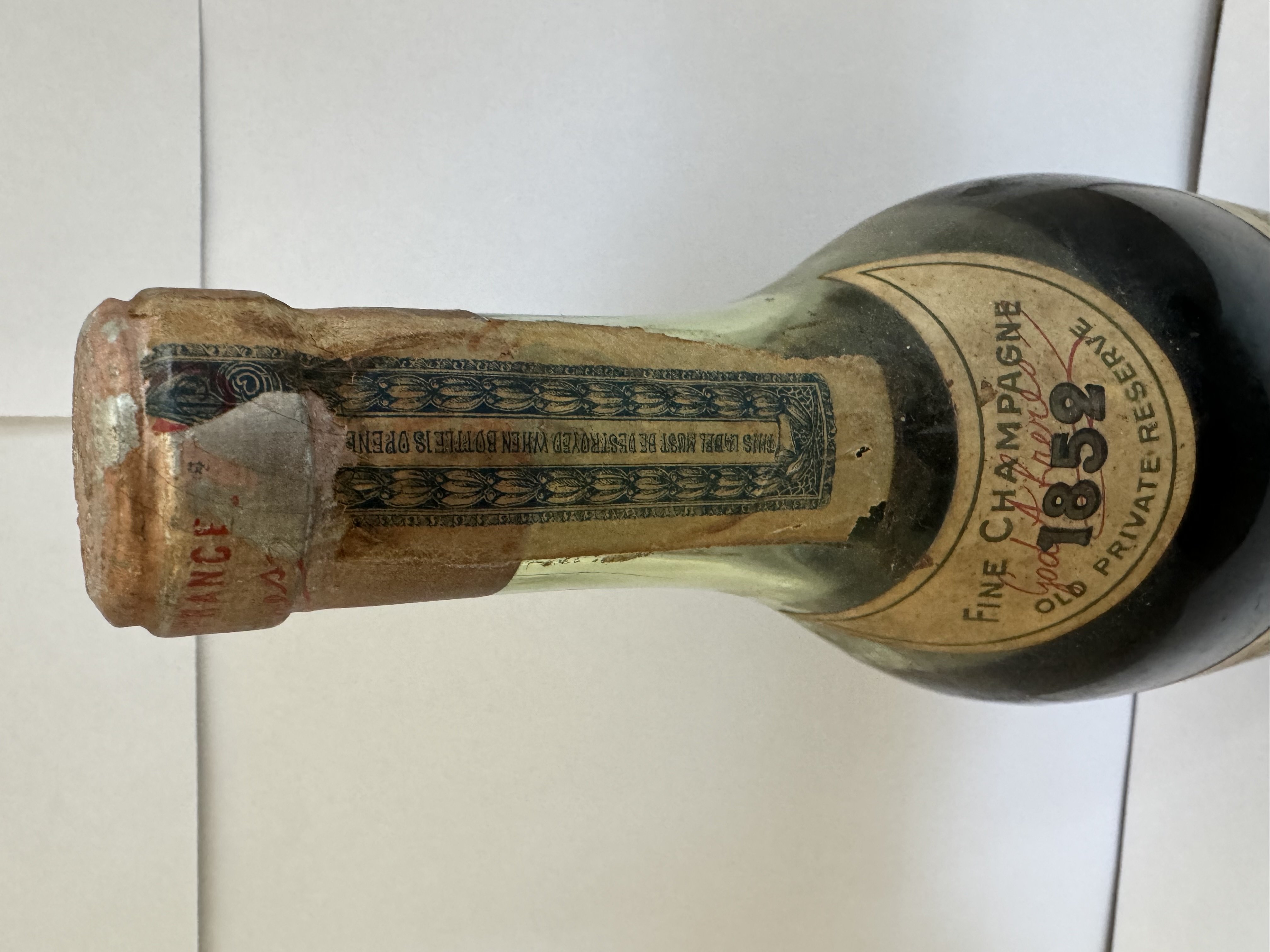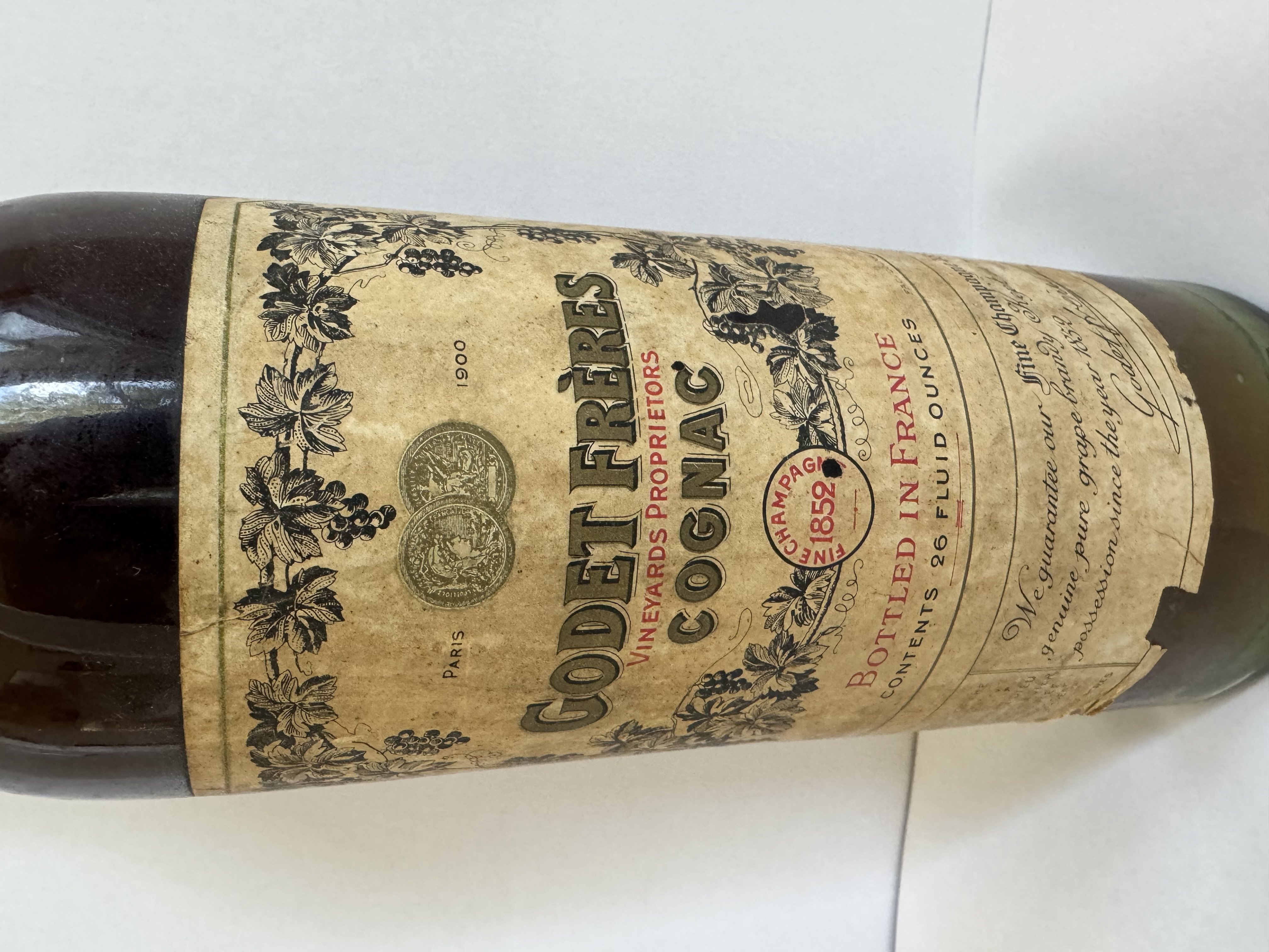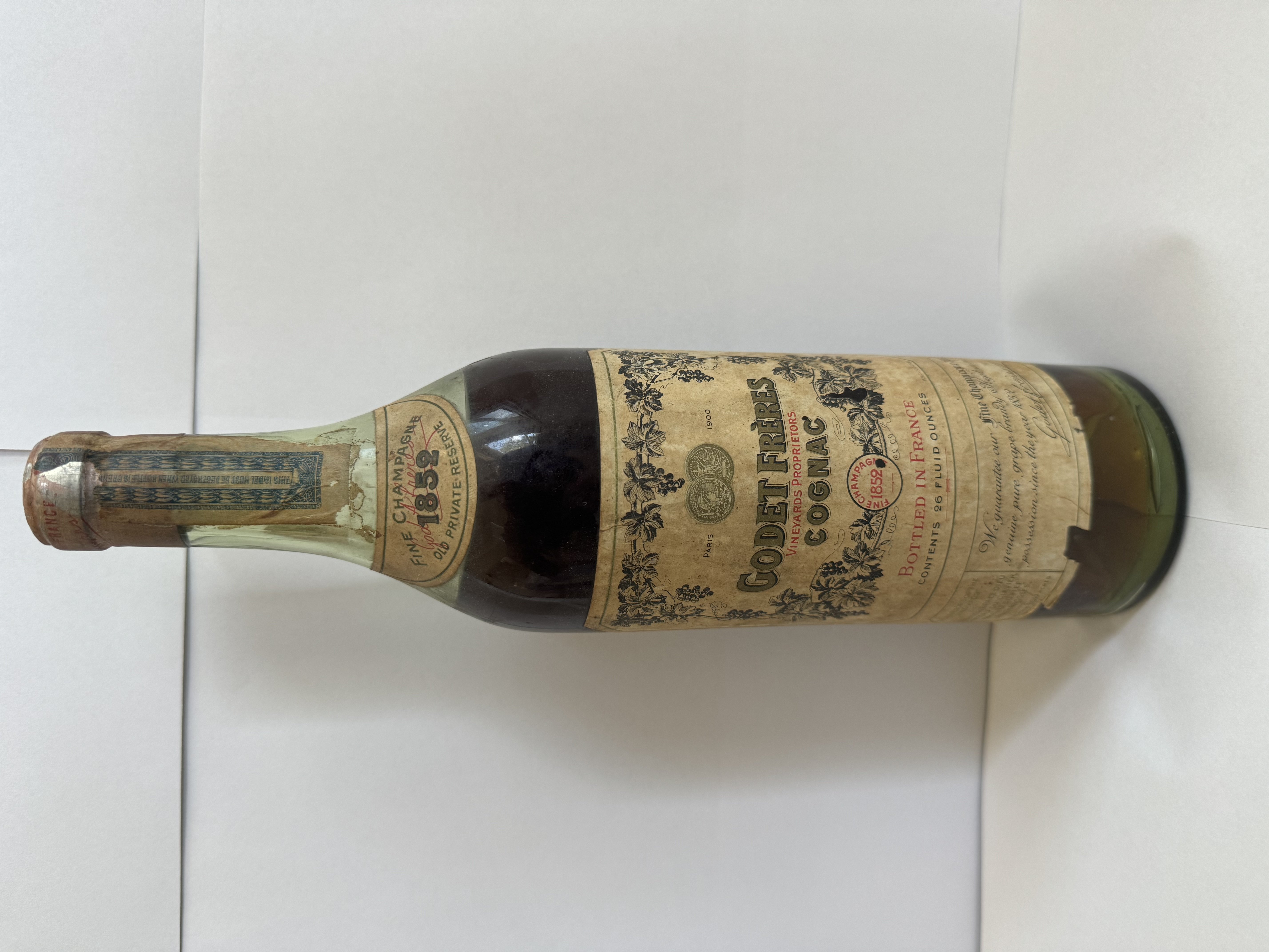 - Bottled in France. Fine Champagne. 1852 Old Private Reserve. Godet A. Freres (in red ink). Paris 1900. Godet Freres. Vineyards Proprietors. Cognac. Fine Champagne 1852. Bottled in France. Contents 26 Fluid Ounces. We guarantee our fine champagne 1852 genuine pure grape brandy Kept in our possession since the year 1852.