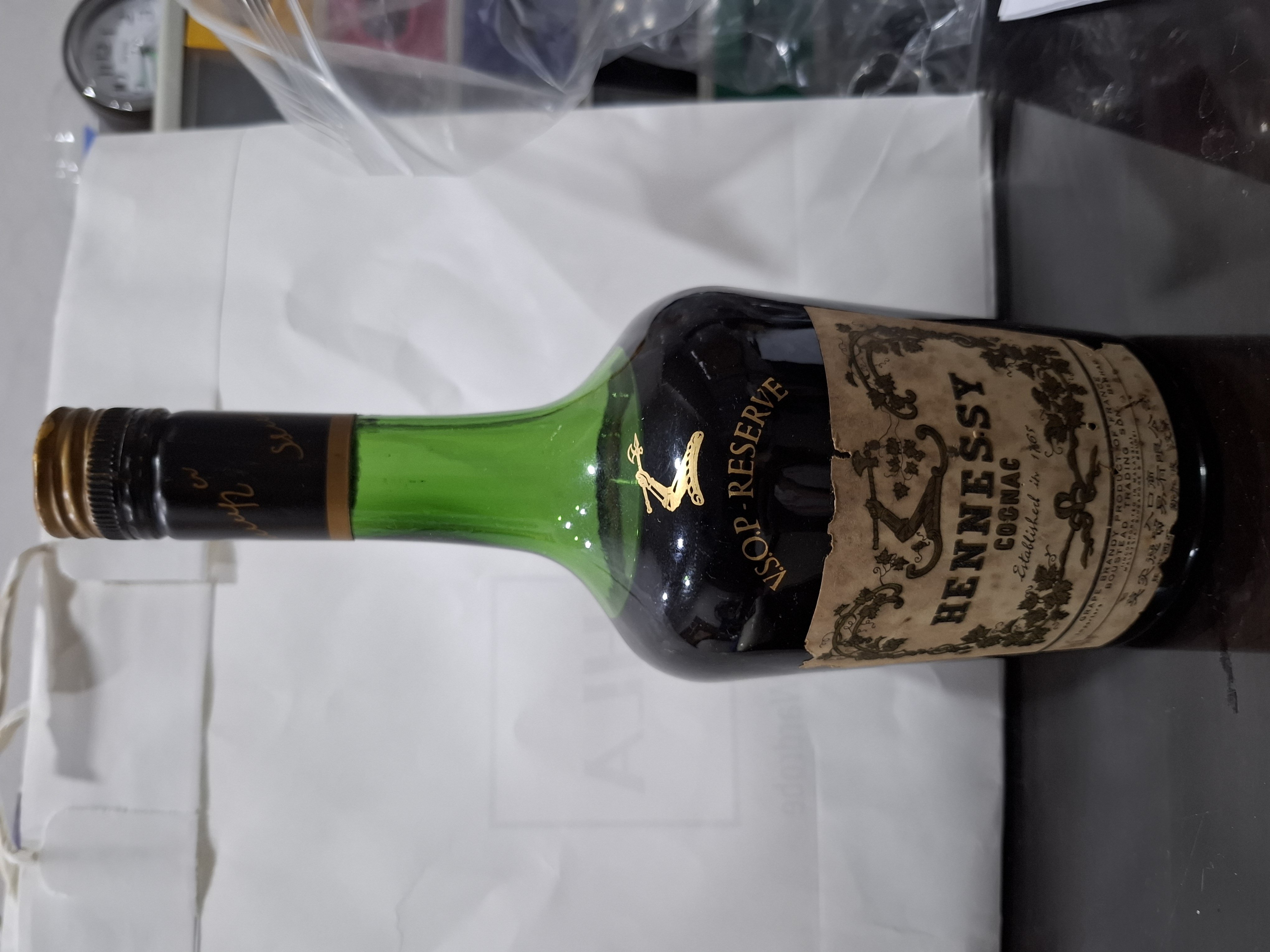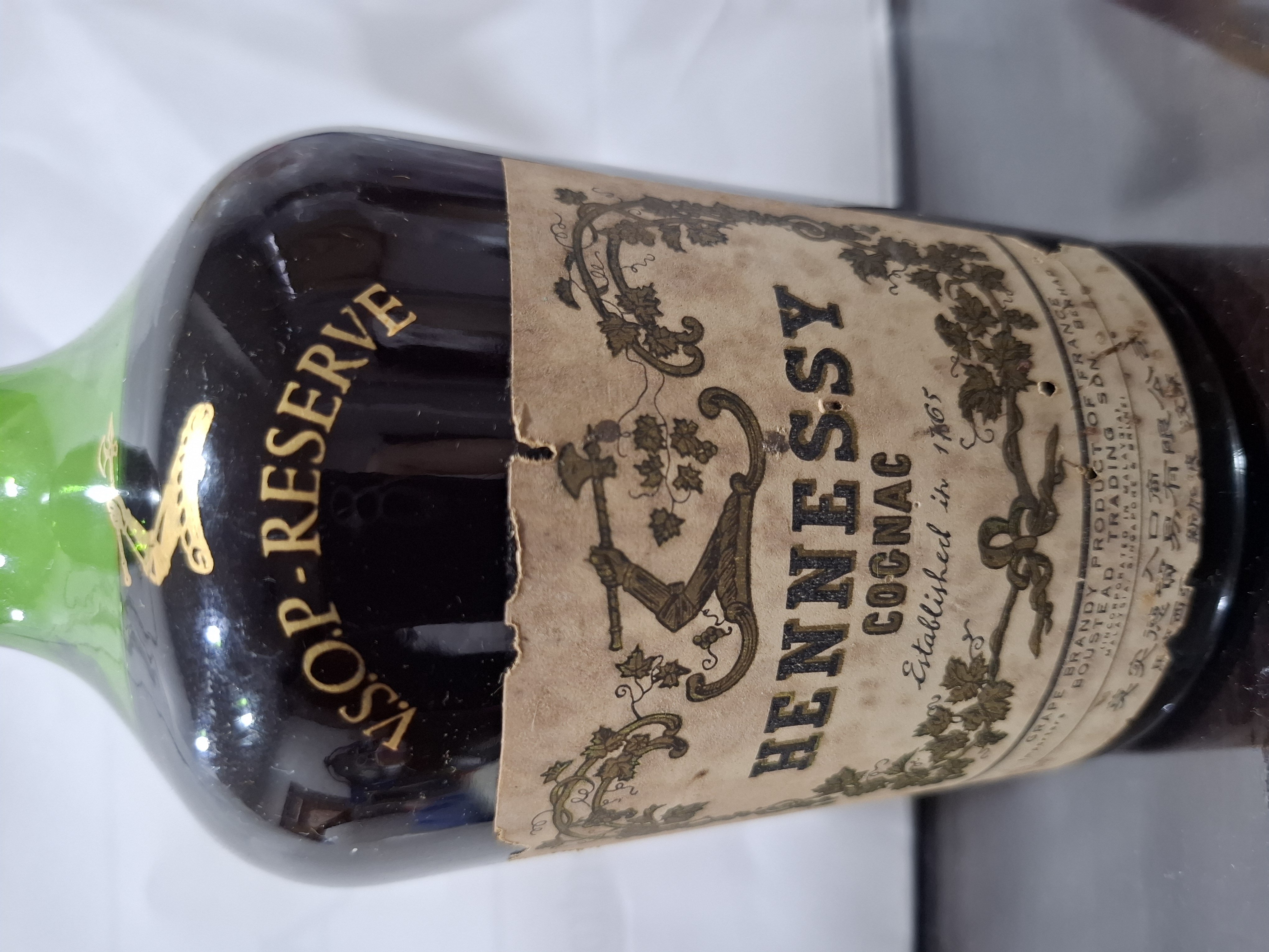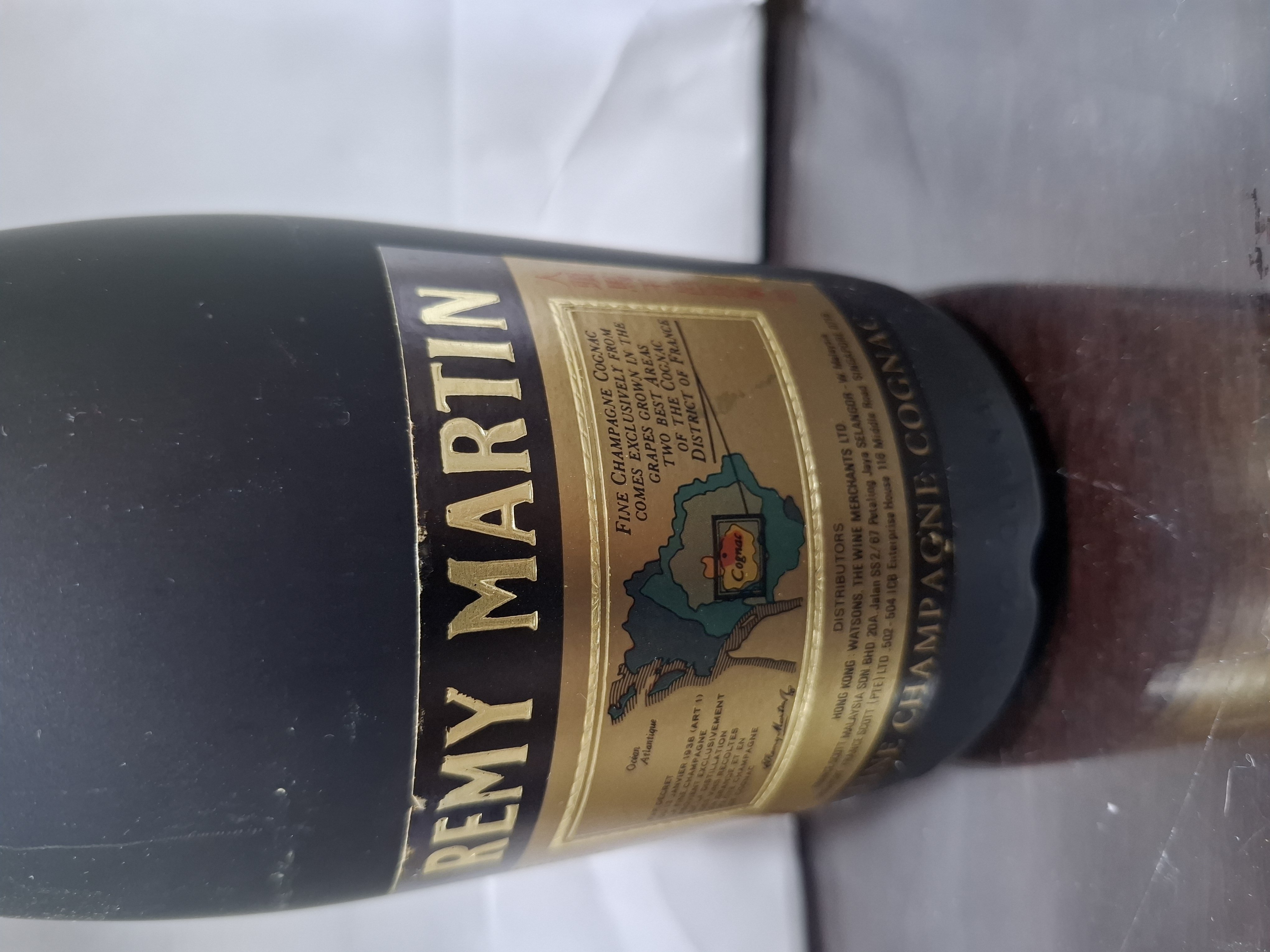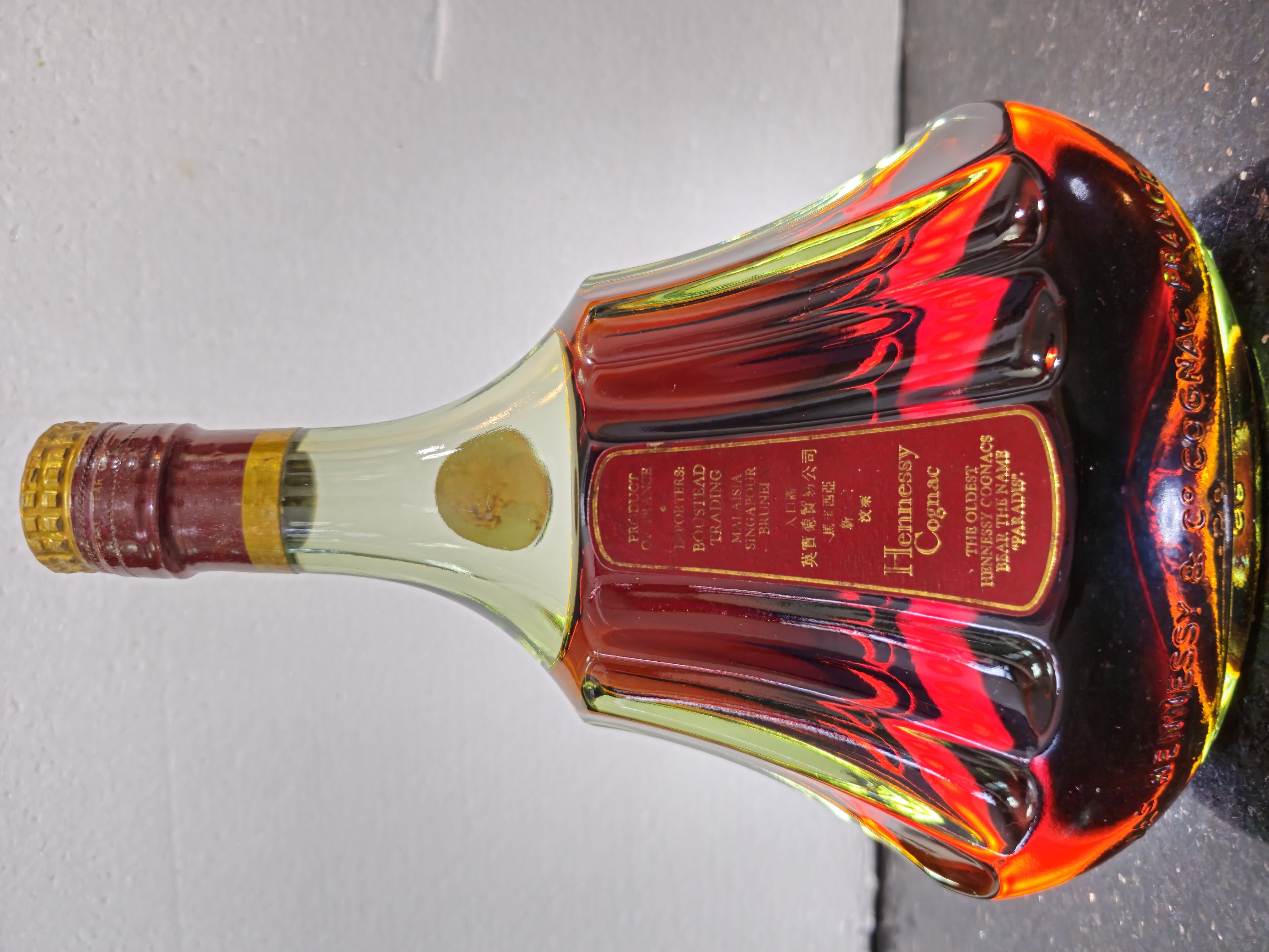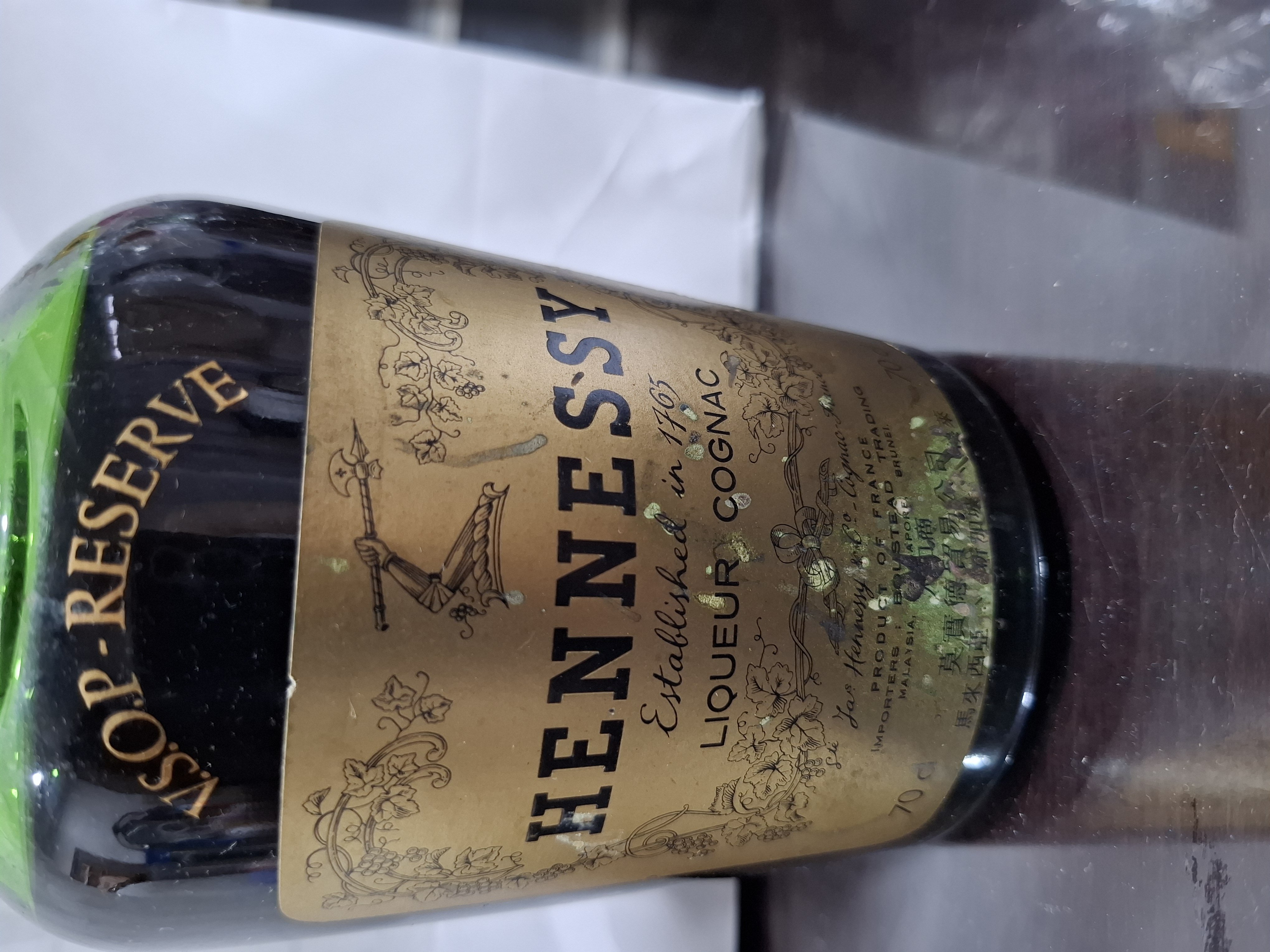 - HENNESSY COGNAC establishd in 1765 GRAPE BRANDY PRODUCT OF FRANCE Importers BOUSTEAD TRADING SDN BERHAD (words too fine) .... follow by CHINESE CHARACTERS