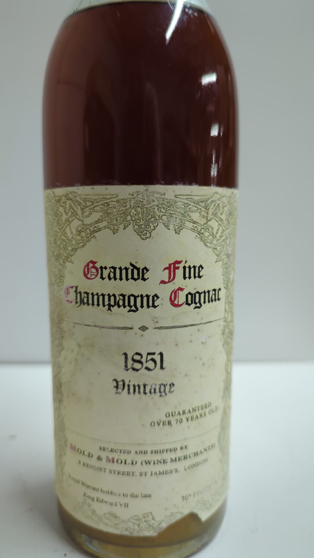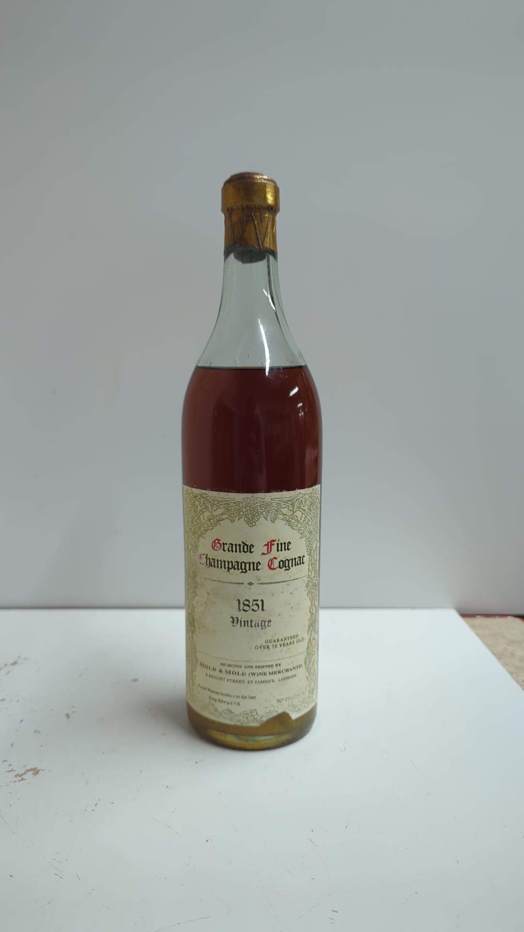 - Grande Fine Champagne Cognac Vintage 1851 Guarantee over 70 years old Selected and shipped by: Mold & Mold (wine merchants) Royal warrant holders to the late King Edward VII * Bottle was purchased and delivered to my friend, I'm unable to confirm the weight at this stage ** Same for the pictures - at this stage I couldn't follow the guidelines as won't be seeing my bottle till mid May