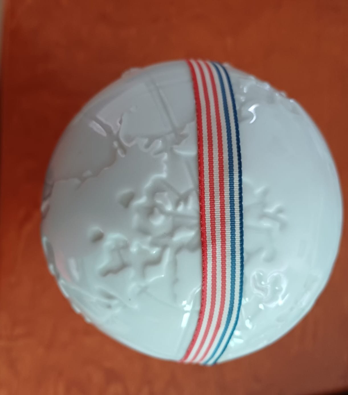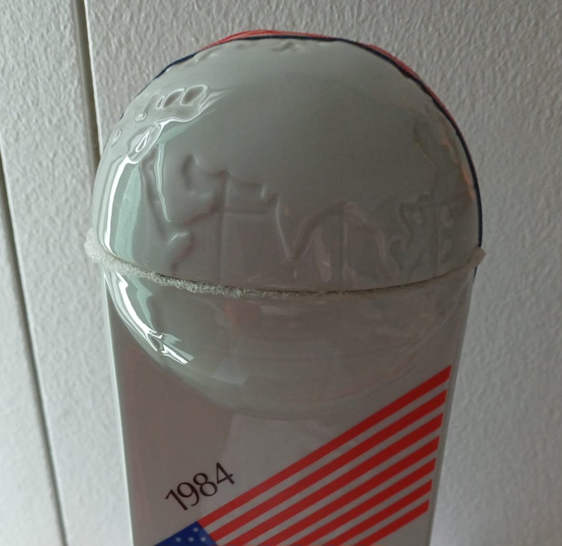 - 1) Text on label: 1984 LOS ANGELES SUMMER GAMES COGNAC CAMUS NAPOLEON 2) Visual elements: Neck/Cap: A white spherical cap featuring an embossed world map (continents) with a red, white, and blue striped ribbon vertically wrapped around it. Mid label: A diagonal graphic resembling the American flag, displaying stars on a blue background and red and white stripes. Font style(s): Predominantly sans-serif, with "1984" slightly italicized, and "CAMUS" in a bold sans-serif. 3) Fill level estimate: Not visible (bottle is opaque ceramic/porcelain).