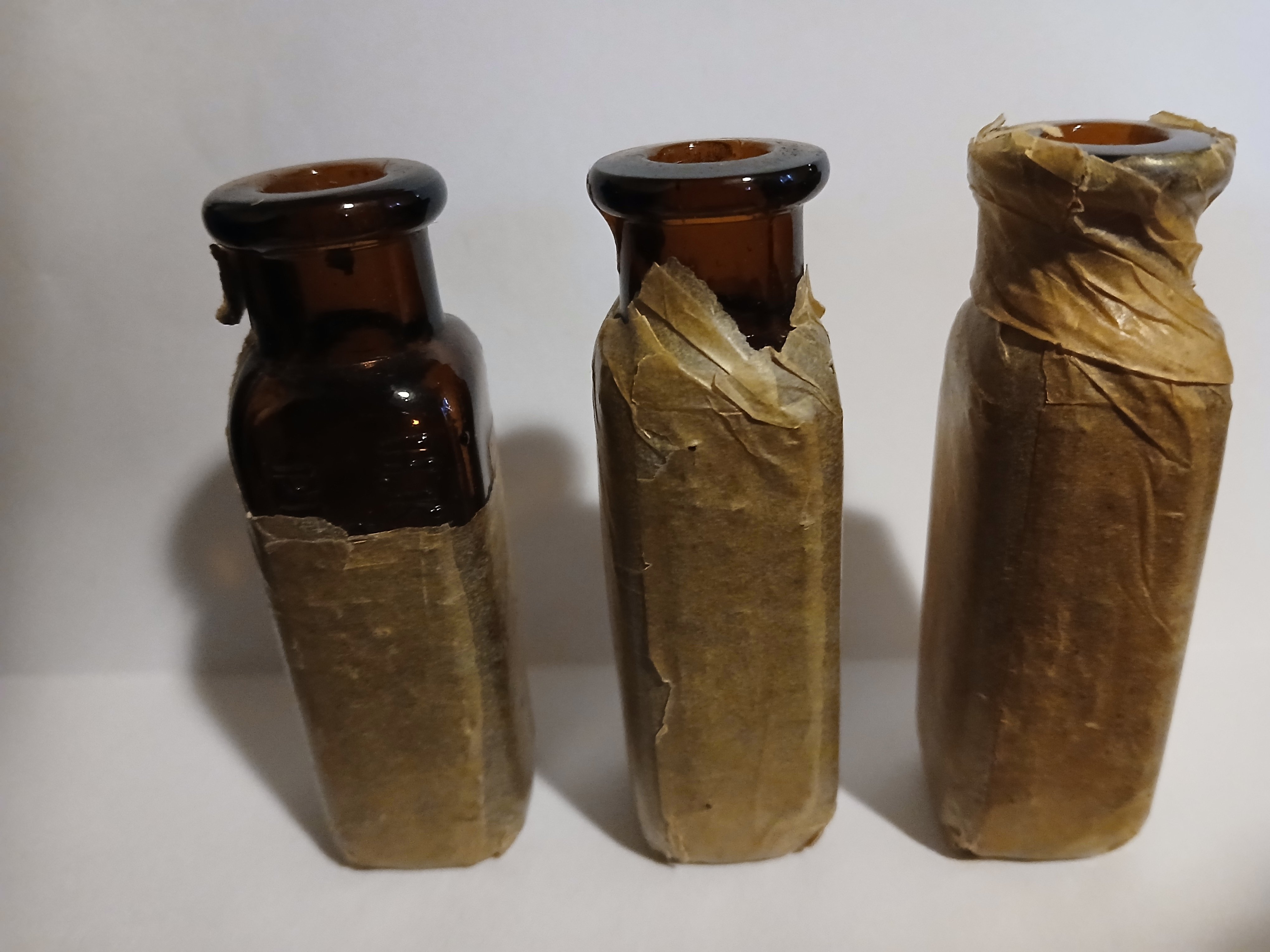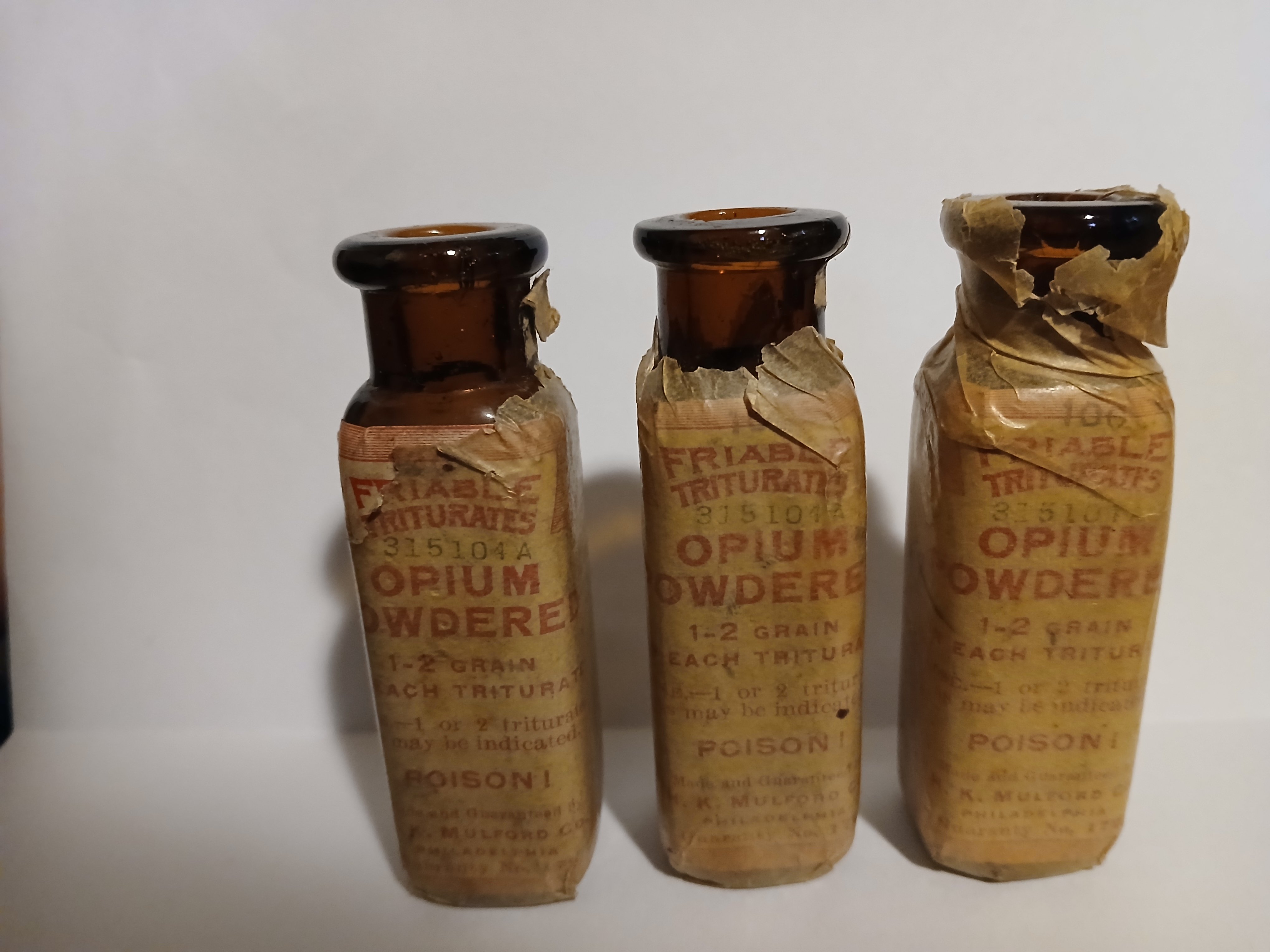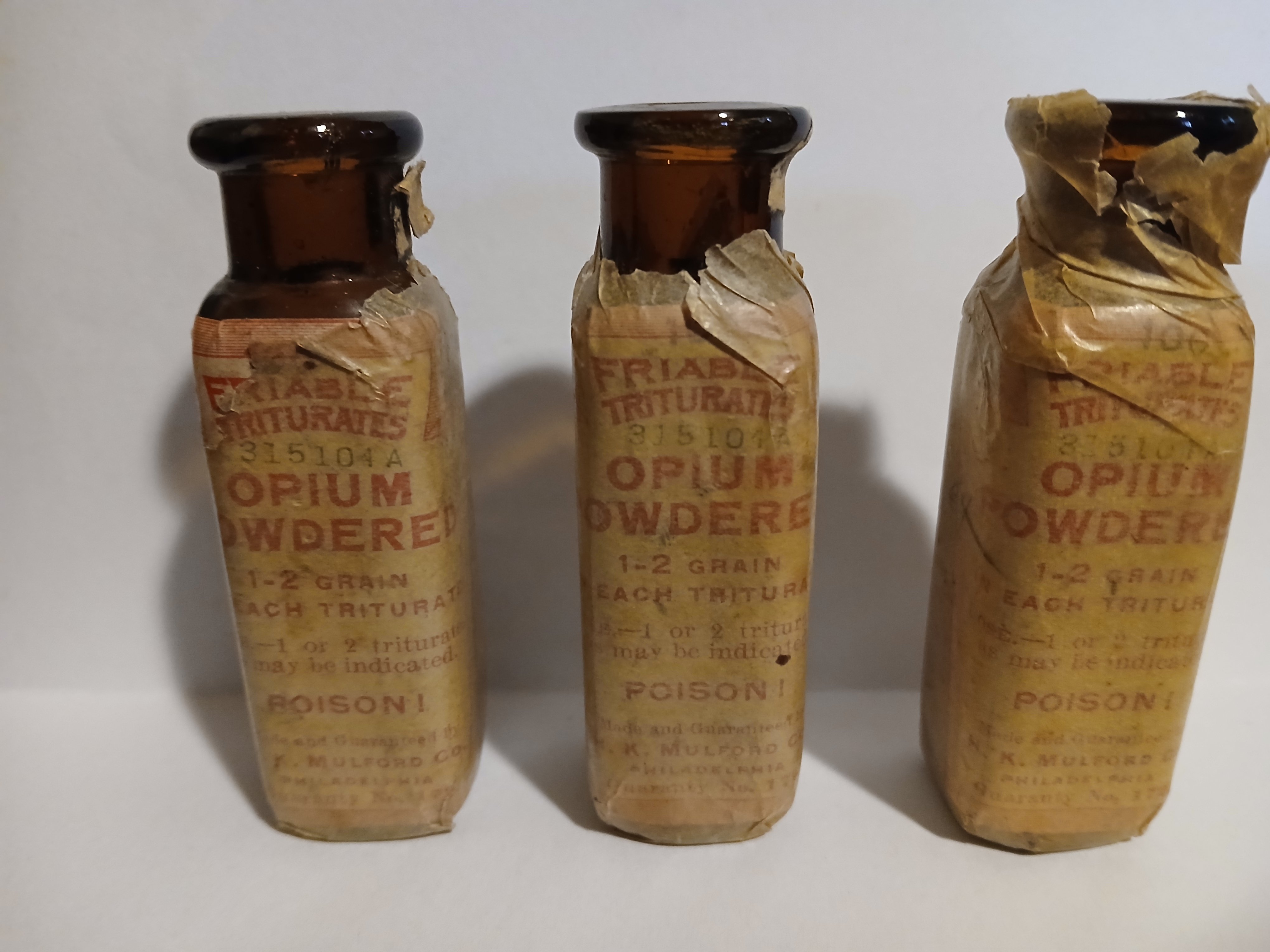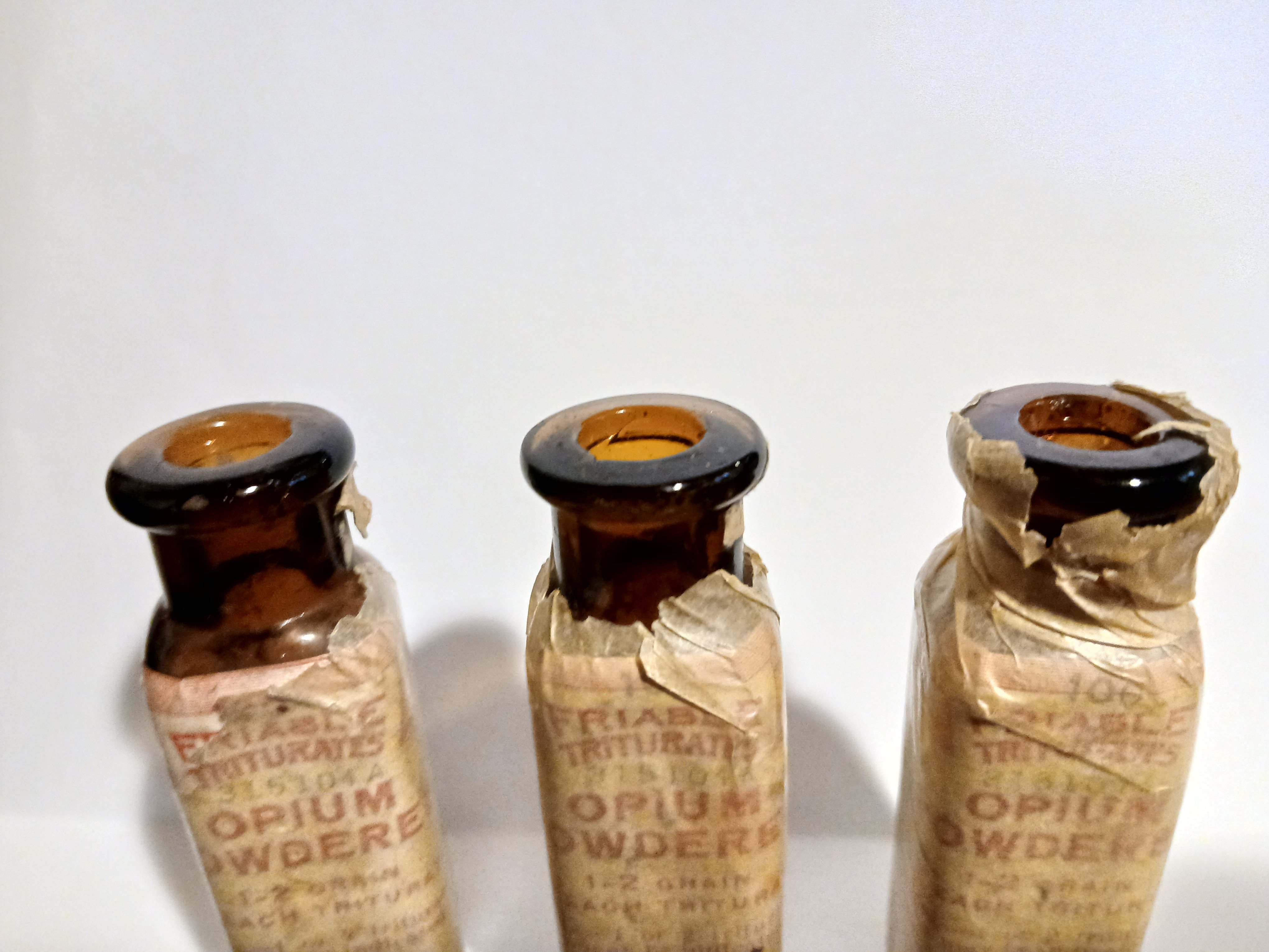 - 1) Text on label: (Note: Bottle on the far right also shows "106" partially visible at the top right corner of its label.) 2) Visual elements: Mid label (all bottles): Rectangular, light beige/tan paper label, significantly aged, discolored, and torn, particularly around the top edges. Graphics: A red horizontal line pattern is visible at the very top of the main text area, above "FRIABLE TRITURATES". Font styles: The main text, such as "OPIUM POWDERED", is in a bold, uppercase sans-serif. Smaller descriptive text (e.g., "1-2 GRAIN", "Mfd and Guaranteed by") is also sans-serif. Emphasized phrases like "FRIABLE TRITURATES" and "POISON!" are in a bold, uppercase sans-serif, rendered in red color. 3) Fill level estimate: below shoulder: not that good