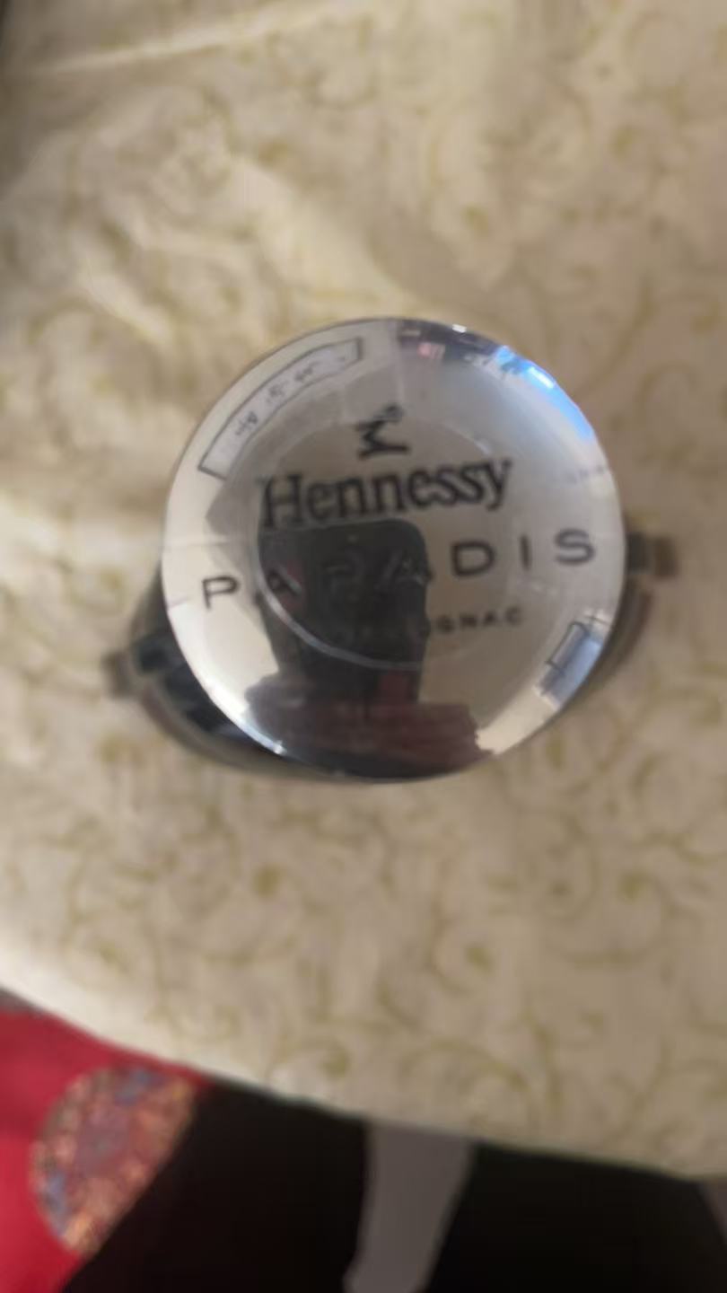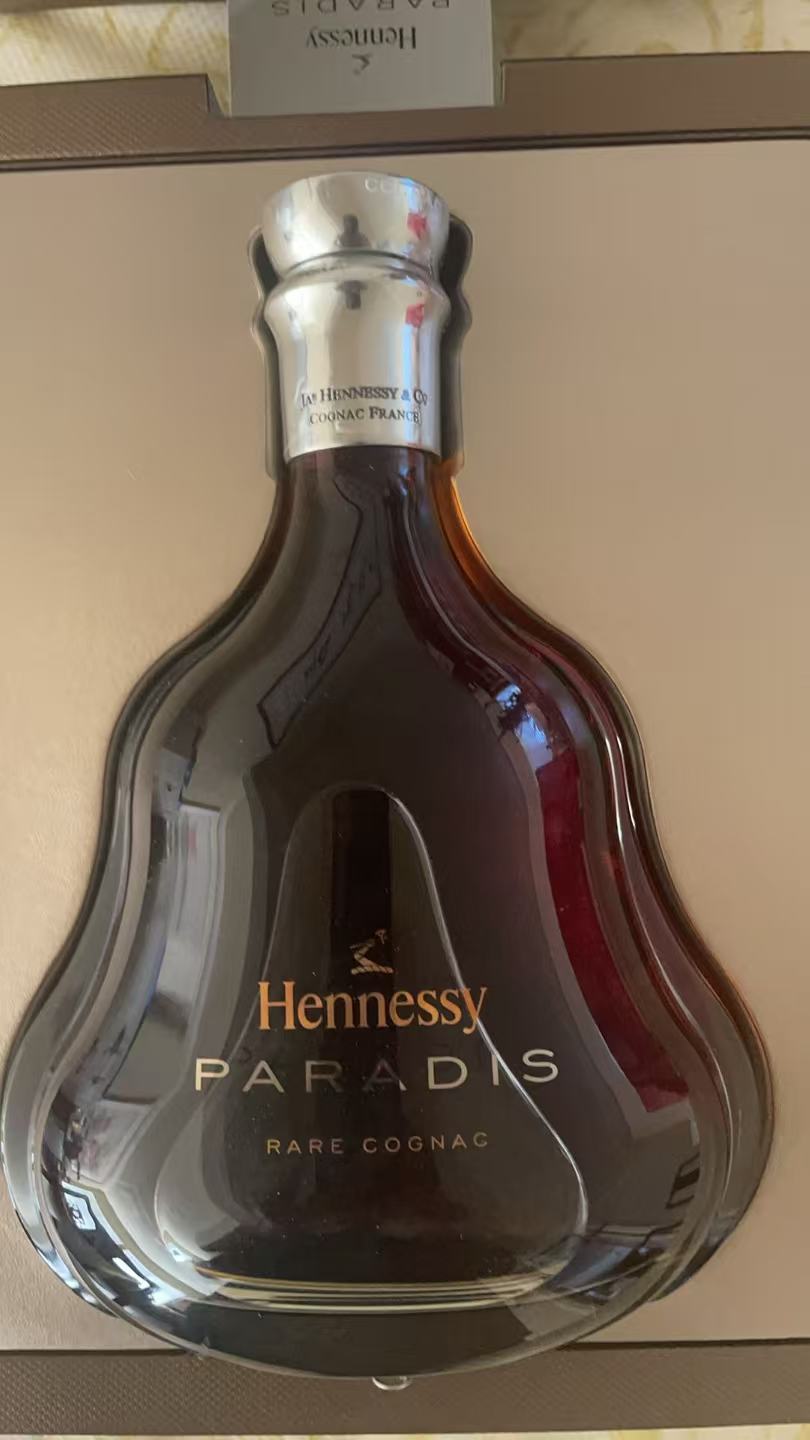 - 1) Text on label: Front Label (etched on glass): Hennessy (small fox/feline logo) PARADIS RARE COGNAC Neck Label (silver band): JAS HENNESSY & Cº COGNAC FRANCE Capsule (top): (fox/feline logo) Hennessy PARADIS COGNAC Back Label (etched on glass): TRAVEL RETAIL COGNAC JAS HENNESSY & Cº Produced and bottled in Cognac 16100, France. 40% vol e 70cl L2 327 10 000313 Accompanying Card: PARADIS IS AN EXCEPTIONAL COGNAC ELABORATED FROM SEVERAL HUNDRED RARE EAUX-DE-VIE AGED FROM 25 TO 130 YEARS. PARADIS IS PURE INDULGENCE, AN EXPERIENCE OFFERING SUCCESSIVE WAVES OF INFINITE FINESSE. THIS PRODUCT IS AN ORIGINAL CREATION, CRAFTED AND TESTED TO ENSURE IT MEETS HENNESSY'S STANDARDS OF EXCELLENCE. QUALITY CONTROL N°13 2) Visual elements: Emblem/Animal: A stylized fox or feline motif appears above "PARADIS" on the mid label and is repeated on the top of the capsule. Bottle Shape: The bottle has a distinctive, curvaceous, somewhat pear-shaped or gourd-like design. Neck/Capsule: A silver-colored metallic capsule covers the cork and upper neck. Labels: The main "labels" are etched directly onto the glass. There is a metallic strip label on the neck. Font Styles: "Hennessy" uses a distinctive serif font. "PARADIS" is in a bold sans-serif font. "RARE COGNAC" and the smaller texts on the neck and back labels are predominantly sans-serif, with varying weights. The accompanying card also uses a sans-serif font. 3) Fill level estimate: well above shoulder into neck: great