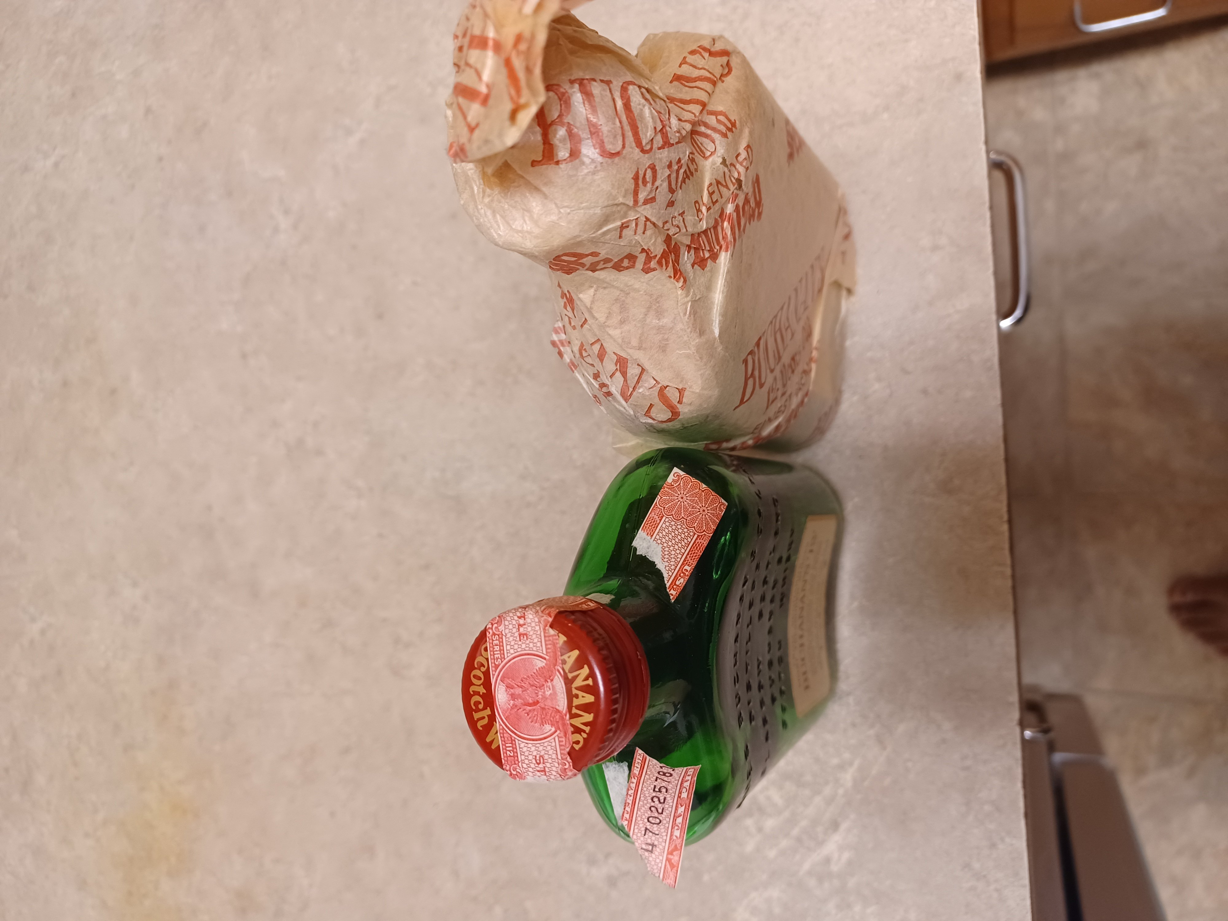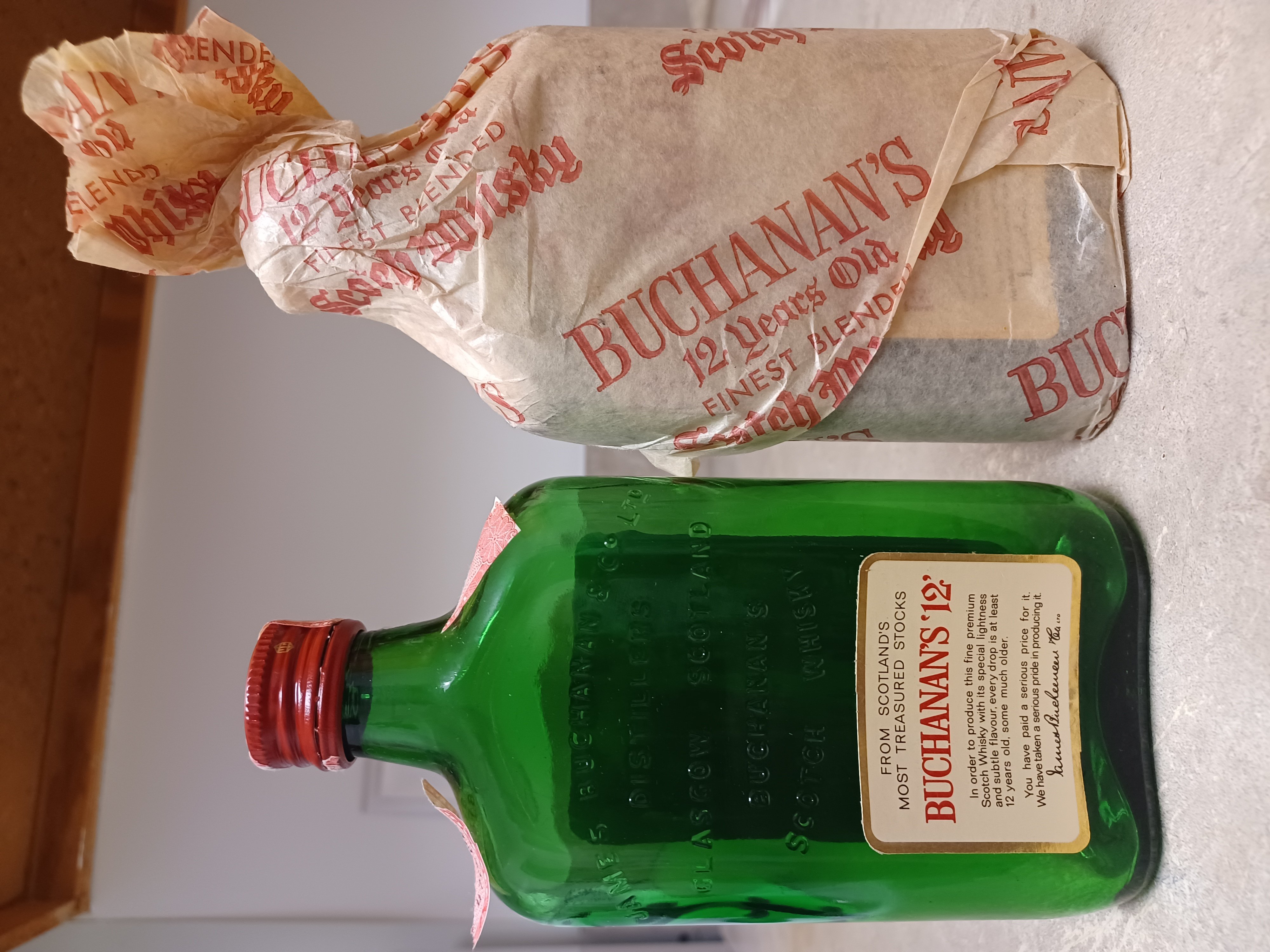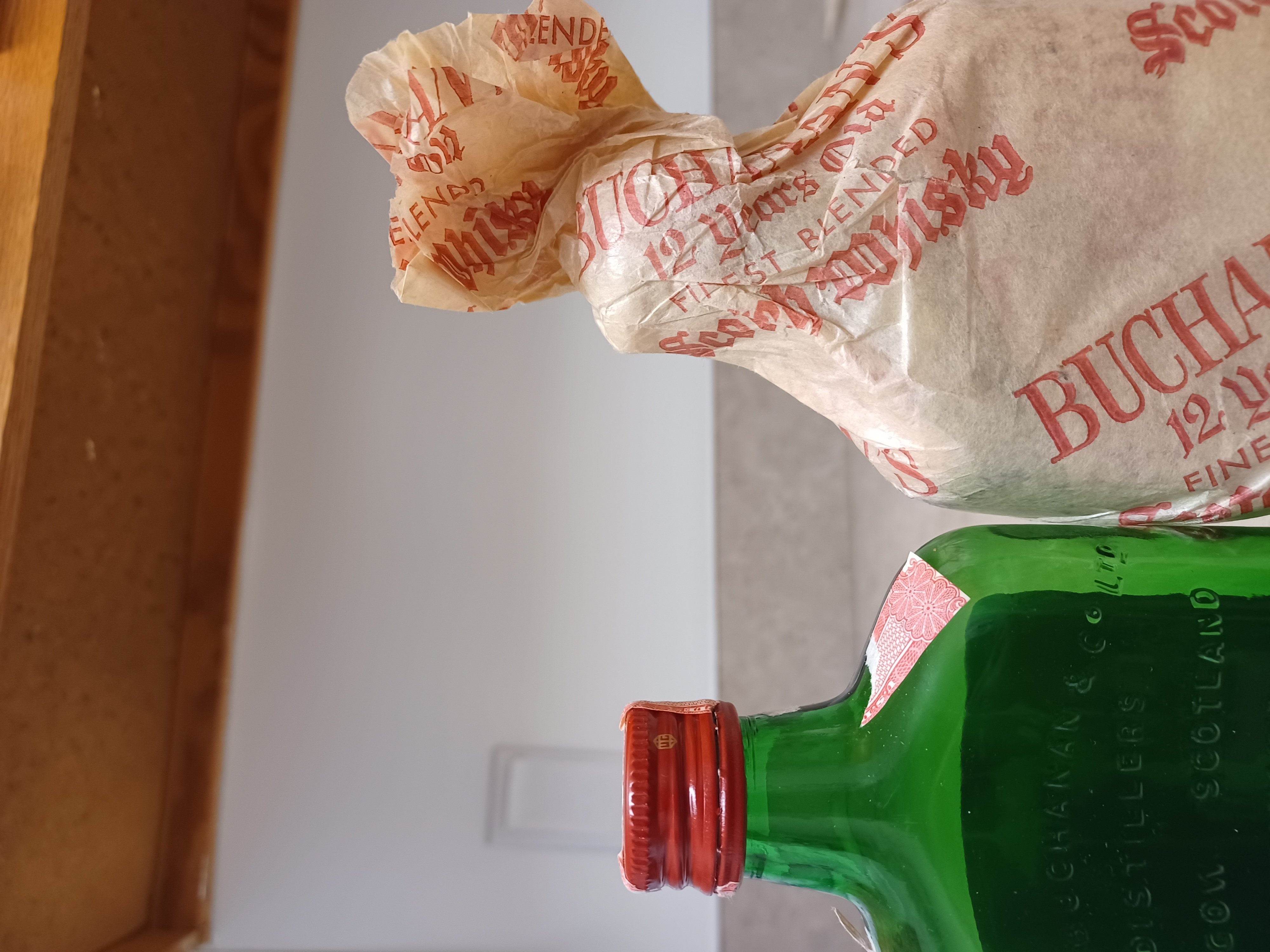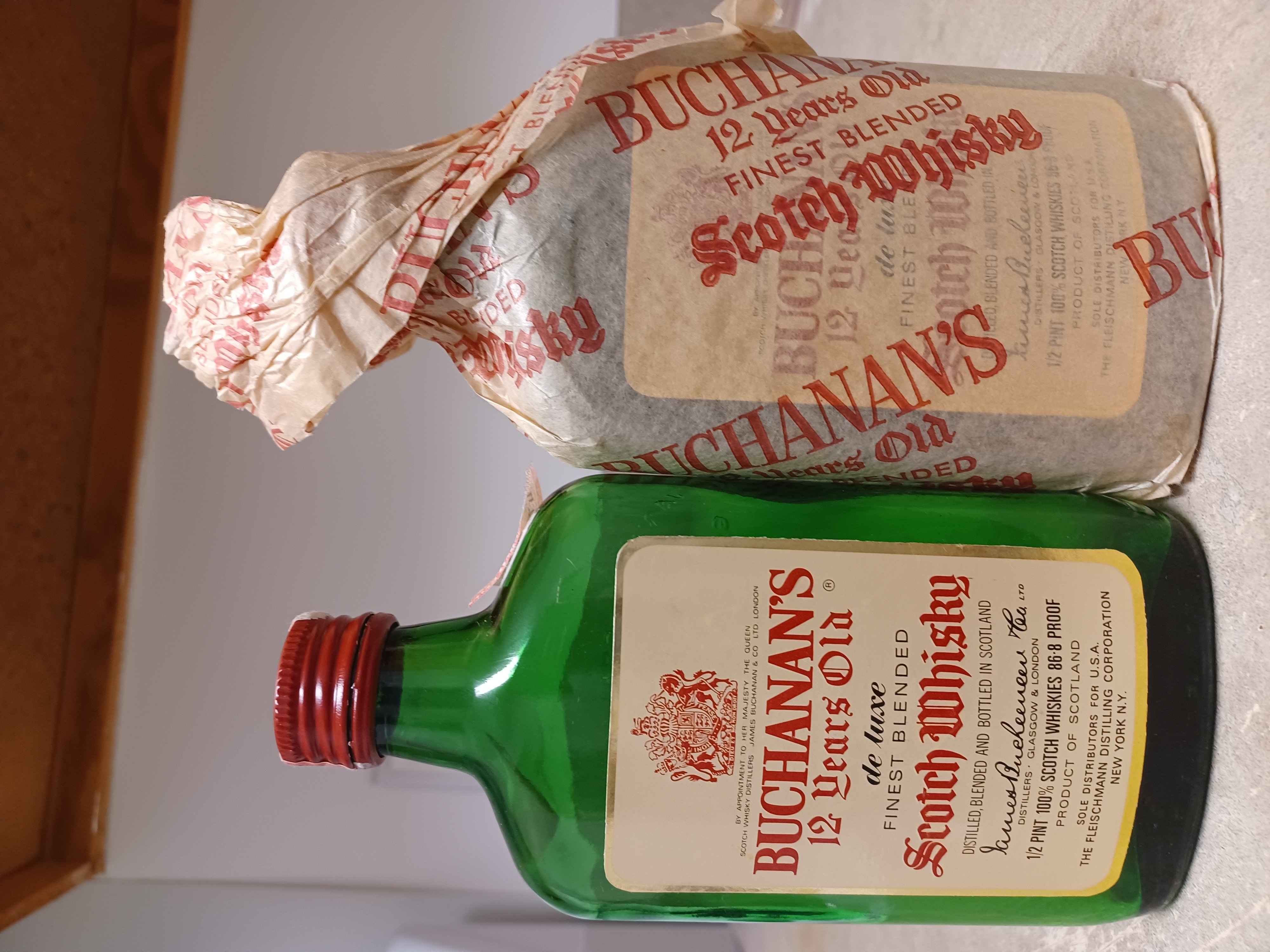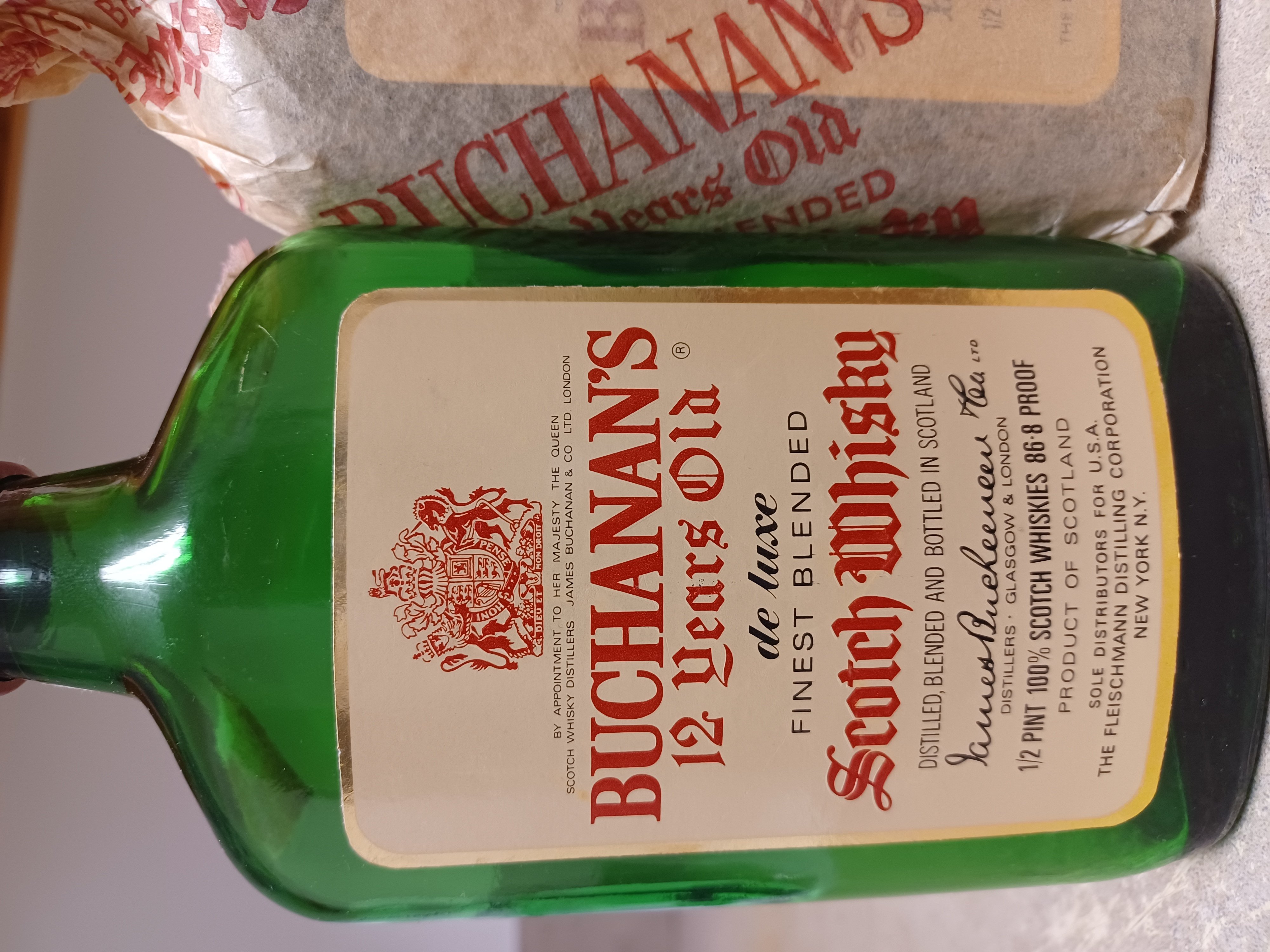 - By appointment to her Majesty the Queen Scotch whiskey distillers James Buchanan & CO Ltd London Buchanan's 12 Years Old de luxe FINEST BLENDED Scotch Whiskey DISTILLED BLENDED AND BOTTLED IN SCOTLAND JamesBuchanan Tea Ltd Distillers • GLASCOW & LONDON 1/2 PINT 100% SCOTCH WHISKIES 86•8PROOF PRODUCT OF SCOTLAND SOLE DISTRIBUTORS FOR U.S.A. THE FLEISCHMANN DISTILLING CORPORATION NEW YORK N.Y.