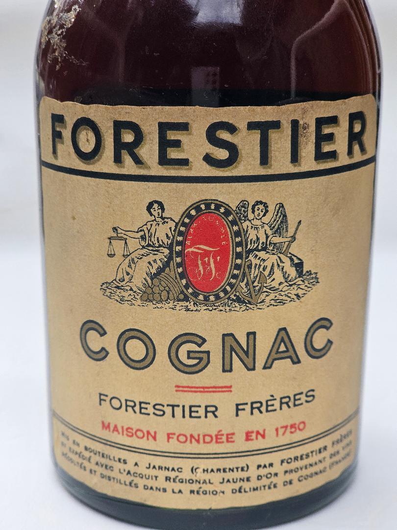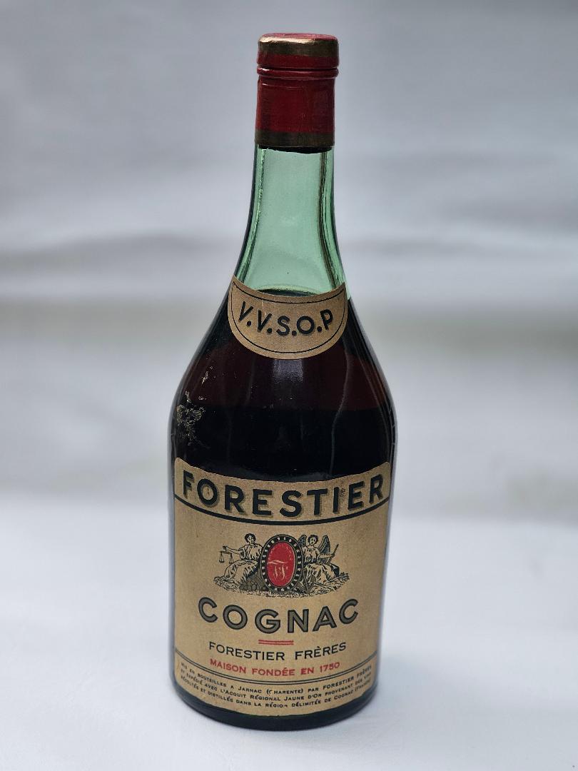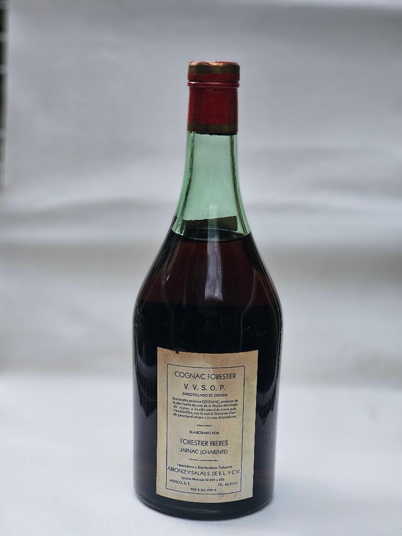 - CAP METAL SEAL READS: "FORESTIER * FRANCE* " FRONT NECK OF BOTTLE LABEL READS: "V.V.S.O.P." FRONT BODY BOTTLE LABEL READS: "FORESTIER" AN EMBLEM READS: "FF" (IN THE CENTER OF IT SOUROUNDED BY AN OVAL) THE OVAL IS HOLD BY TWO CHARACTERS: ONE LOOKING AS A WOMEN HOLDING A BALANCE ESCALE ON HER RIGHT HAND , AND THE OTHER CHARACTER LOOKS AS AN ANGEL WITH WINGS) (THE OVAL BASE IS SOUROUNDED BY A BASKET WITH SOME SORT OF ROUNDED ITEMS FALLING FROM IT ON ITS RIGHT SIDE AND A ANCHOR ON THE LEFT SIDE) "COGNAC" "FORESTIER FRÈRES" "MAISON FONDÉE EN 1750" "MIS EN BOUTELLES A JARNAC (CHARENTE) PAR FORESTIER FRÈRES" "ET EXPÉDIÉ AVEC L'ACQUIT RÉGIONAL JAUNE D'OR PROVERANT DES VINS" "RÉCOLTES ET DISTILLÉS DANS LA RÉGION DÉLIMITÉ DE COGNAC (FRANCE)" BACK LABEL IS IN SPANISH AND IT READS: "COGNAC FORESTIER" "V. V. S. O. P." "EMBOTELLADO DE ORIGEN" "ESTA BOTELLA CONTIENECOGNAC, PRODUCTO DE" "LA DESTILACION DE UVAS DE LA REGION DELIMITADA" "DE COGNAC, Y HA SIDO EXPEDIDO CON LA GUIA" "AMARILLO-ORO, CON LA CUAL EL GOBIERNO FRAN-" "CES GARANTIZA EL ORIGEN Y PUREZA DEL PRODUCTO." "ELABORADO POR" "FORESTIER FRERES" "JARNAC (CHARENTE)" "IMPORTADORES Y DISTRIBUIDORES EXCLUSIVOS" "ARRONIZ Y SALAS S. DE R.L. Y C.V." "IGNACIO MARISCAL 32- 204 Y 205" "MEXICO D.F. TEL. 46-31-77" "REG. S.S.A. 39797 A"