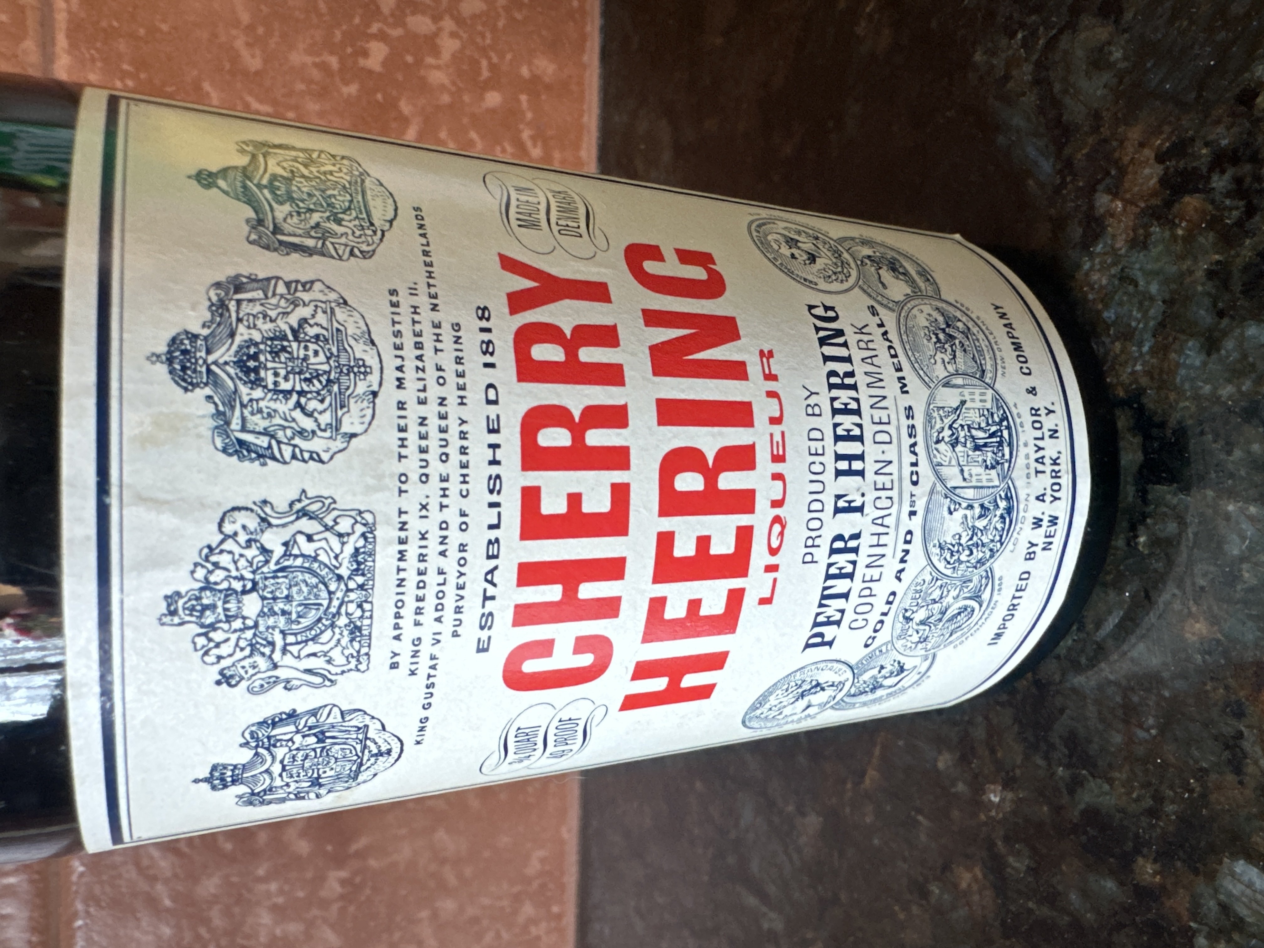 - Peter heering 1818-1968 150years Copenhagen Established 1818 cherry herring liqueur Produced by Peter f heeering Copenhagen de mark Imported by wa Tayler &co ny ny