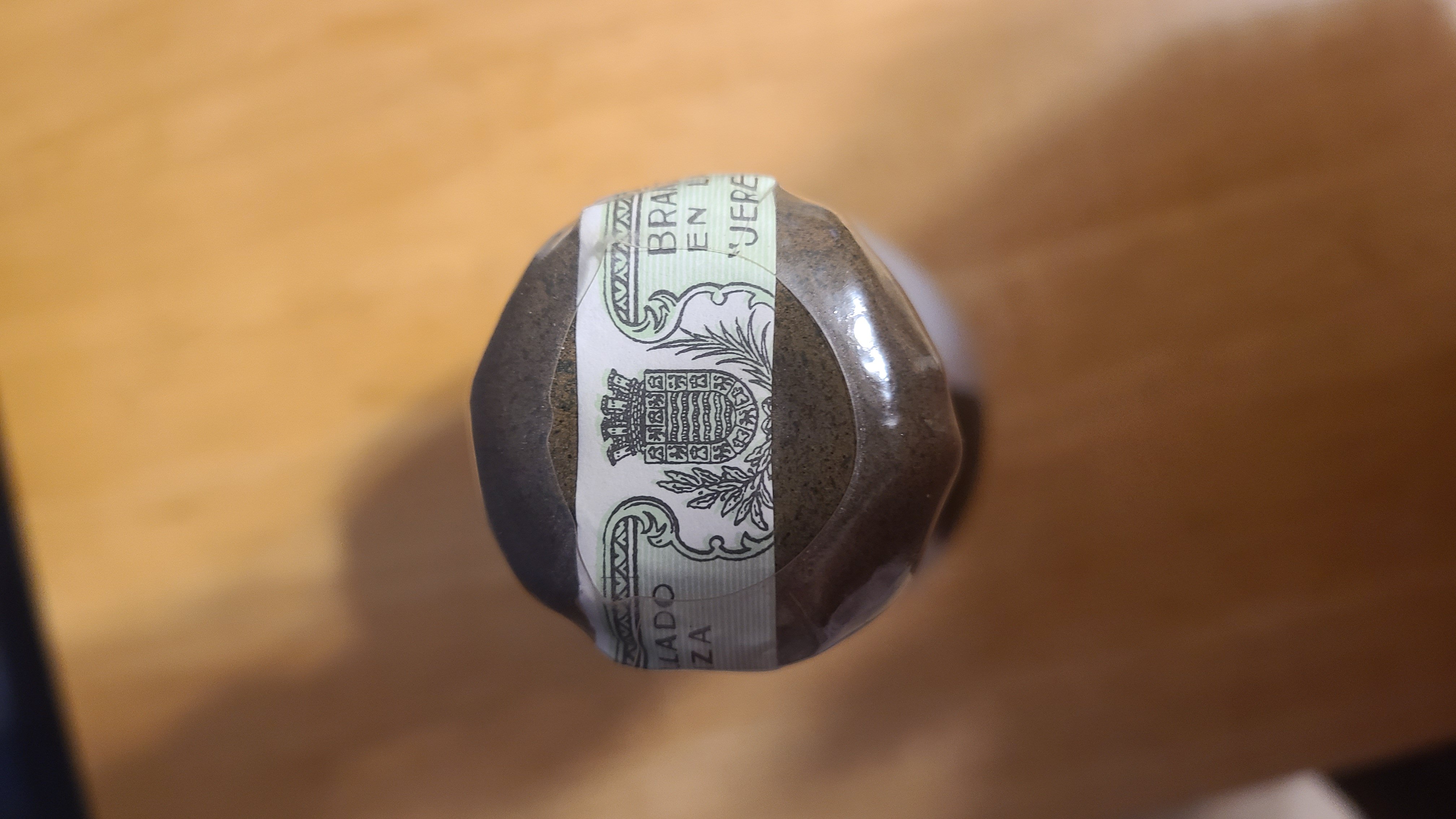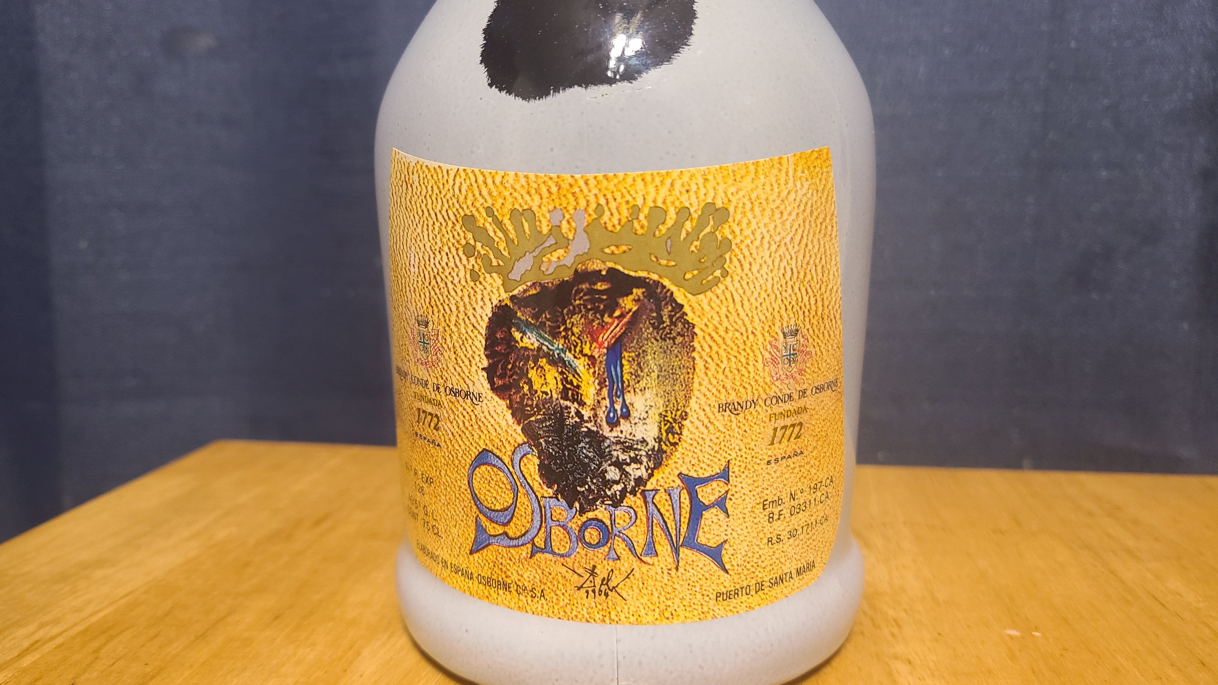 - Brandy Conde De Osborne Fundata 1772 España N. ° R. EXP. 126 40'5° G.L. CONT. 75 CL. ELABORADO EN ESPAÑA OSBORNE C SA Puerto de Santa Maria Brandy Elaborado y Embotellado en la Zona de --anza (not sure on what comes before, it's covered by wax) del "Jerez" 14 A 4 215673
