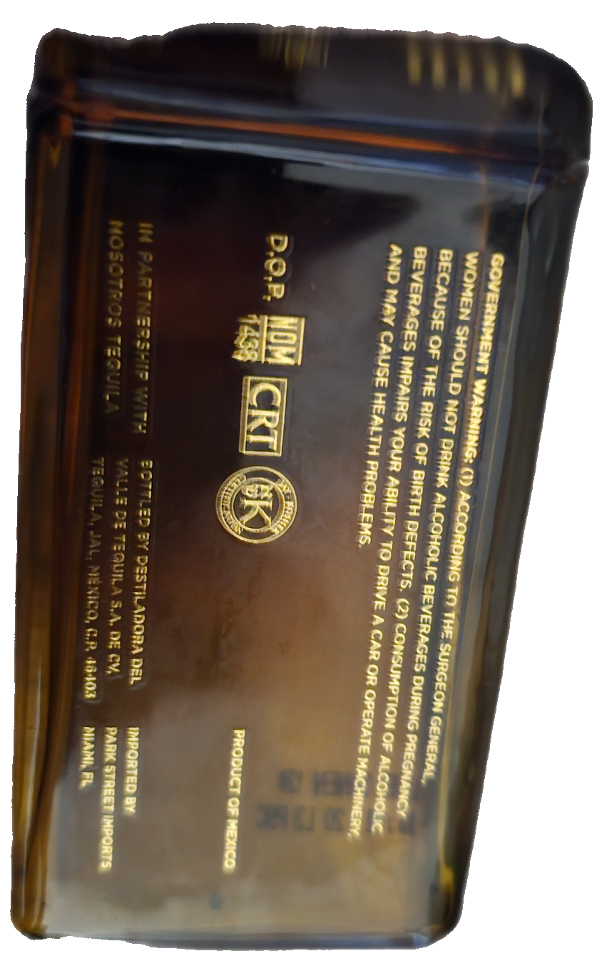 - SOVERNMENT WARNING: (1) ACCORDING TO THE SURGEON GENERAL, WOMEN SHOULD NOT DRINK ALCOHOLIC BEVERAGES DURING PREGNANCY BECAUSE OF THE RISK OF BIRTH DEFECTs, (2) CONSUMPTION OF ALCOHOLic BEVERAGES IMPAIRS YOUR ABILITY TO DRIVE A CAR OR OPERATE MACHINERY, AND MAY CAUSE HEALTH PROBLEMS. OSH S RRCATIO D.O.P CRT PRODUCT OF MEXICO IN PARTNERSHIP WITH NOSOTROS TEQUILA BOTTLED BY DESTILADORA DEL vALLE DE TEQUIlA S.A.DE cv, TEQUILA, JAL, MÉXICO, C.P. 46403 IMPORTED BY PARK STREET IMPORTS MIAMI, FL