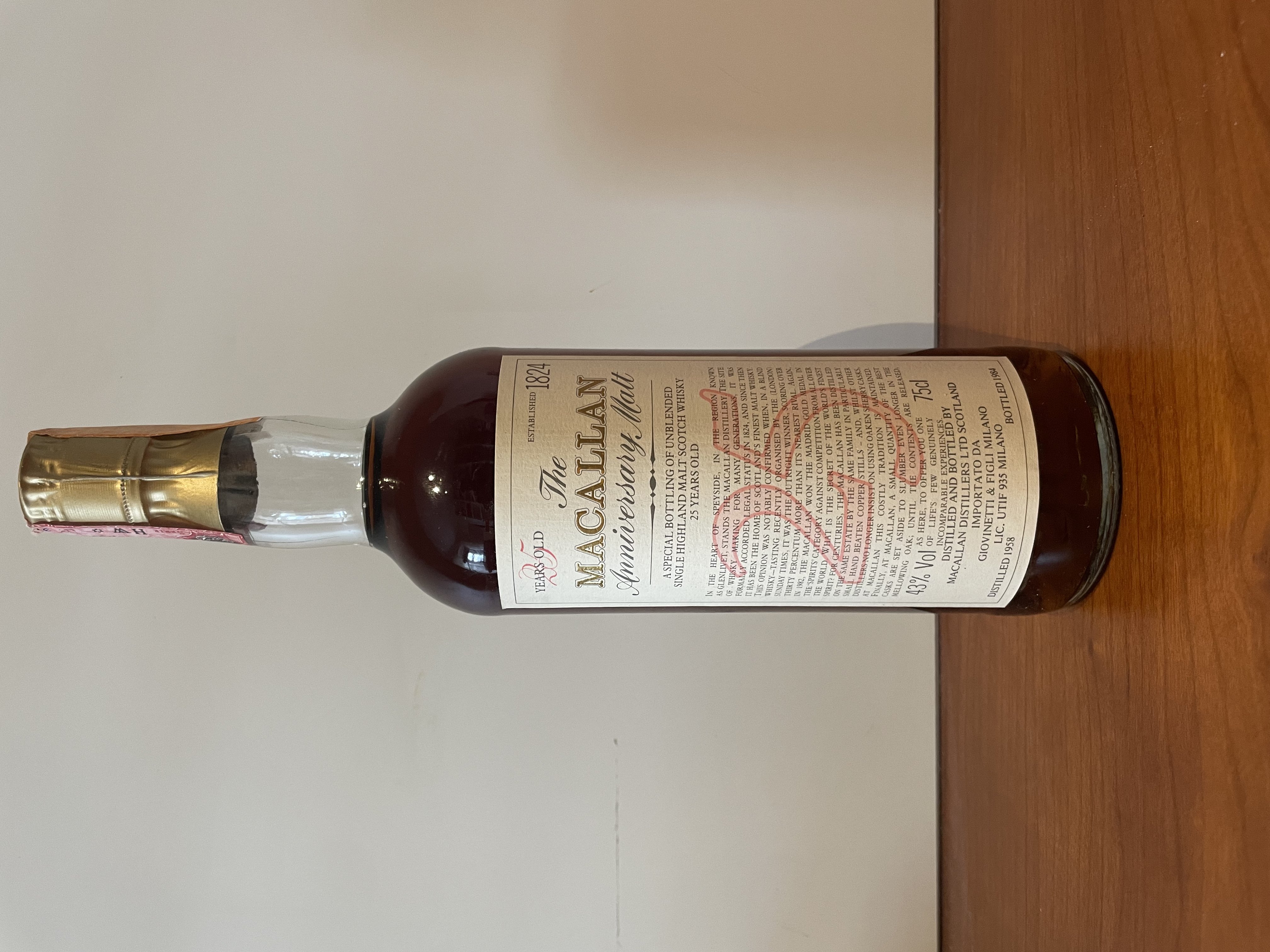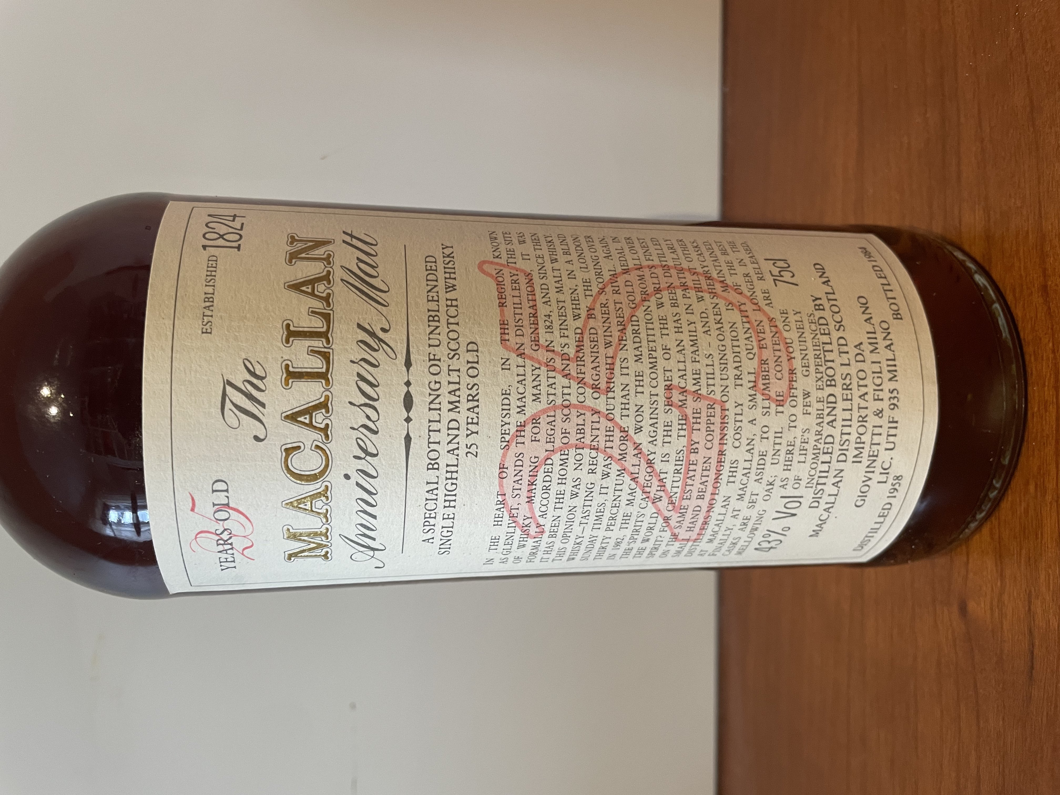 - The Macallan Anniversary Malt A special bottling of unblended single highland malt scotch whisky 25 years old