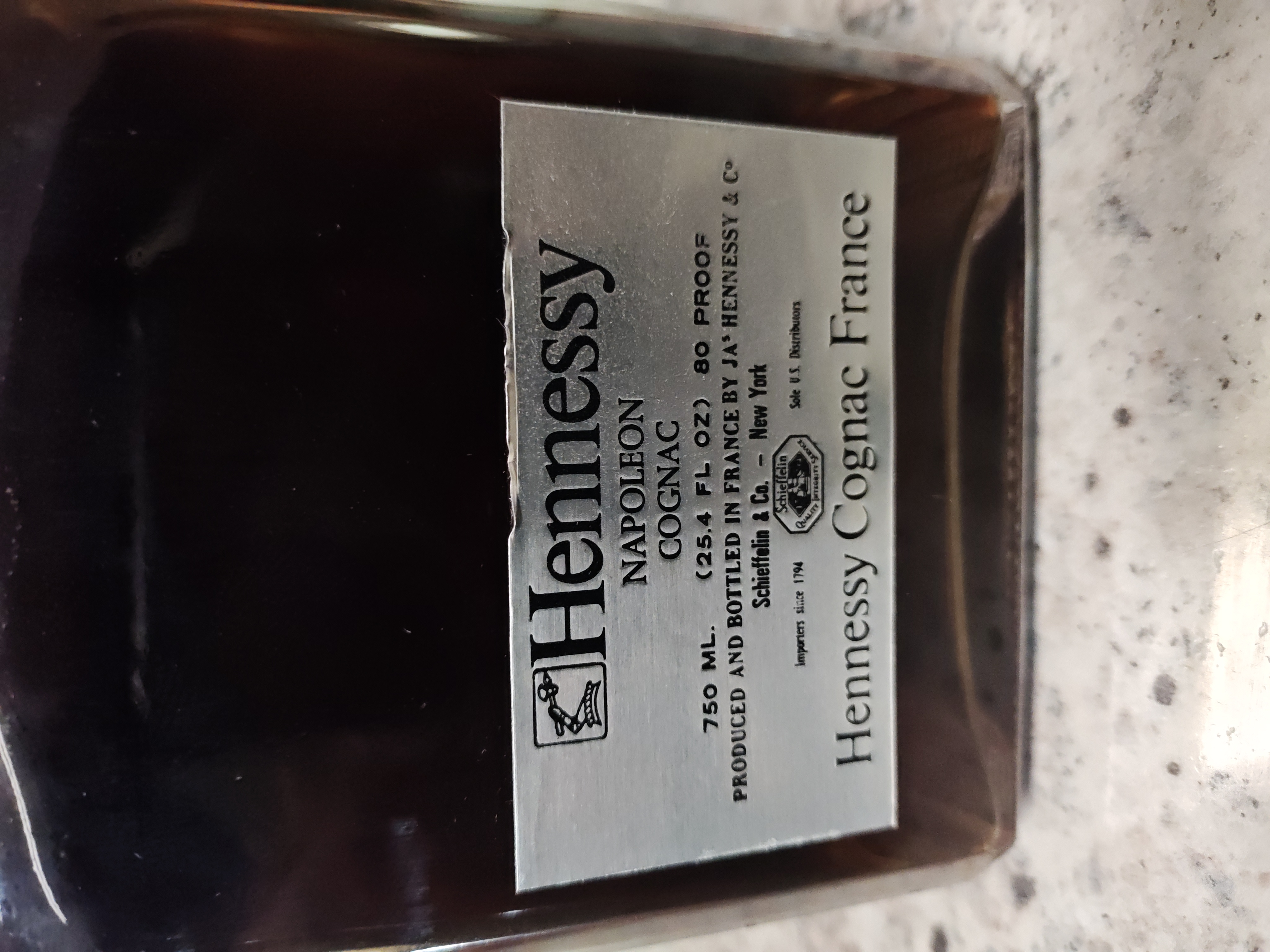 - 1) Text on label: Bottle - Main Label: Hennessy NAPOLEON COGNAC 750 ML. (25.4 FL. OZ.) 80 PROOF PRODUCED AND BOTTLED IN FRANCE BY JAS HENNESSY & Cie Schieffelin & Co. - New York Sole U.S. Distributors IMPORTED SINCE 1794. Hennessy Cognac France Bottle - Neck Tag: NAPOLEON E. HENNESSY COGNAC Bottle - Tax Strip: BUREAU OF A 079738909 BOTTLE STAMP SERIES Schieffelin & Co. I-35 New York, N. Y. Box: COGNAC Hennessy NAPOLEON 2) Visual elements: Neck: A silver-colored metal tag/medallion attached by a chain around the neck features the text "NAPOLEON E. HENNESSY COGNAC" in a blocky sans-serif font. A pink-patterned federal tax strip with an eagle emblem in the center wraps around the cork/capsule and the neck. Mid Label (Bottle): The main label is silver with black text. It features the "Hennessy" brand name in a distinctive decorative serif/script font, accompanied by a small square graphic emblem depicting an arm holding an axe. Below this, a circular emblem shows a more detailed coat of arms with the arm and axe motif. "NAPOLEON COGNAC" and "Hennessy Cognac France" are in a prominent serif font, while descriptive text is in a sans-serif font. Box: The red box features gold-colored text and graphics. "Hennessy" is in the same decorative serif/script font as on the bottle, with the accompanying arm-and-axe emblem. "COGNAC" is in a sans-serif font and "NAPOLEON" in a serif font. 3) Fill level estimate: well above shoulder into neck: great