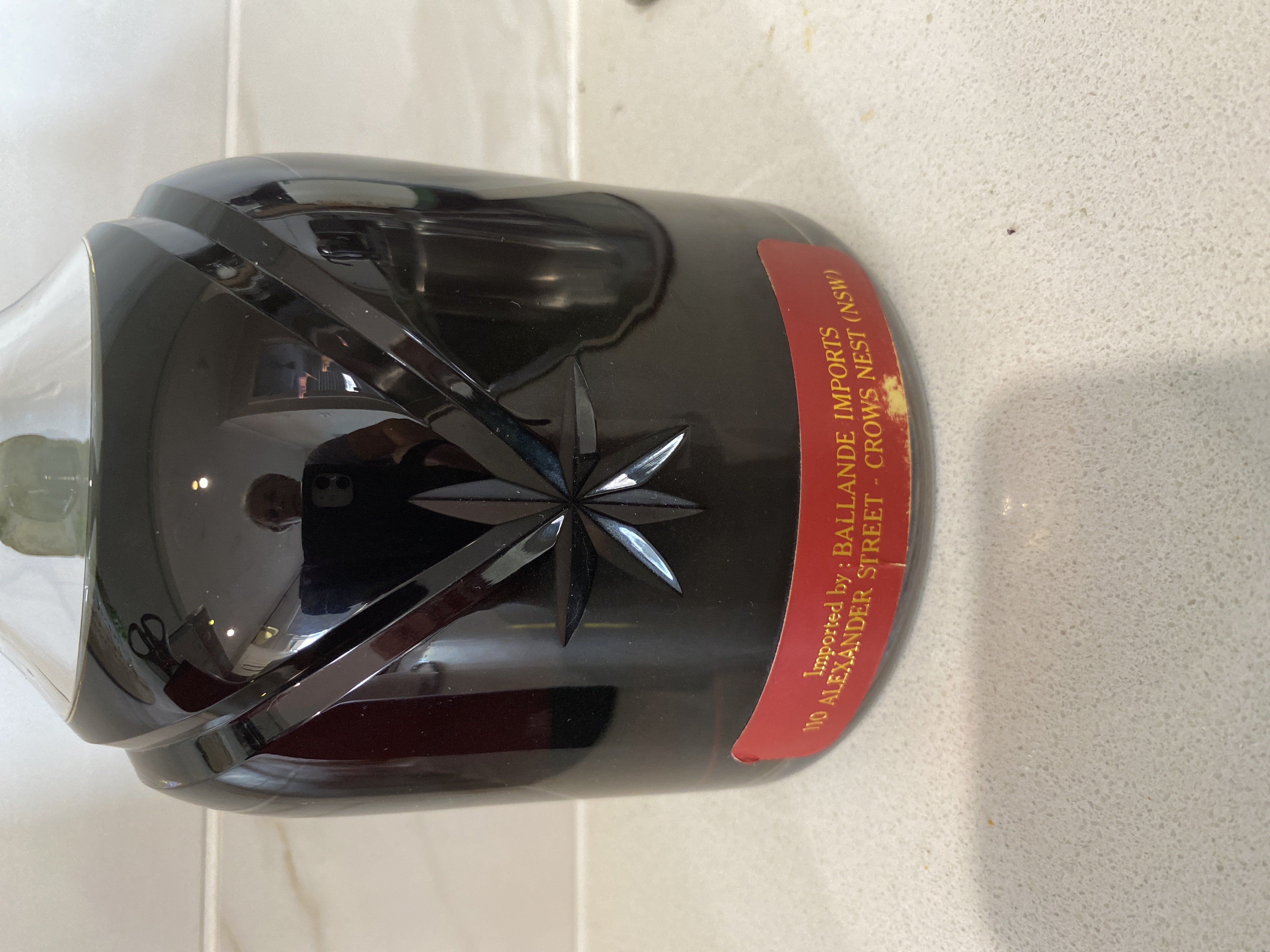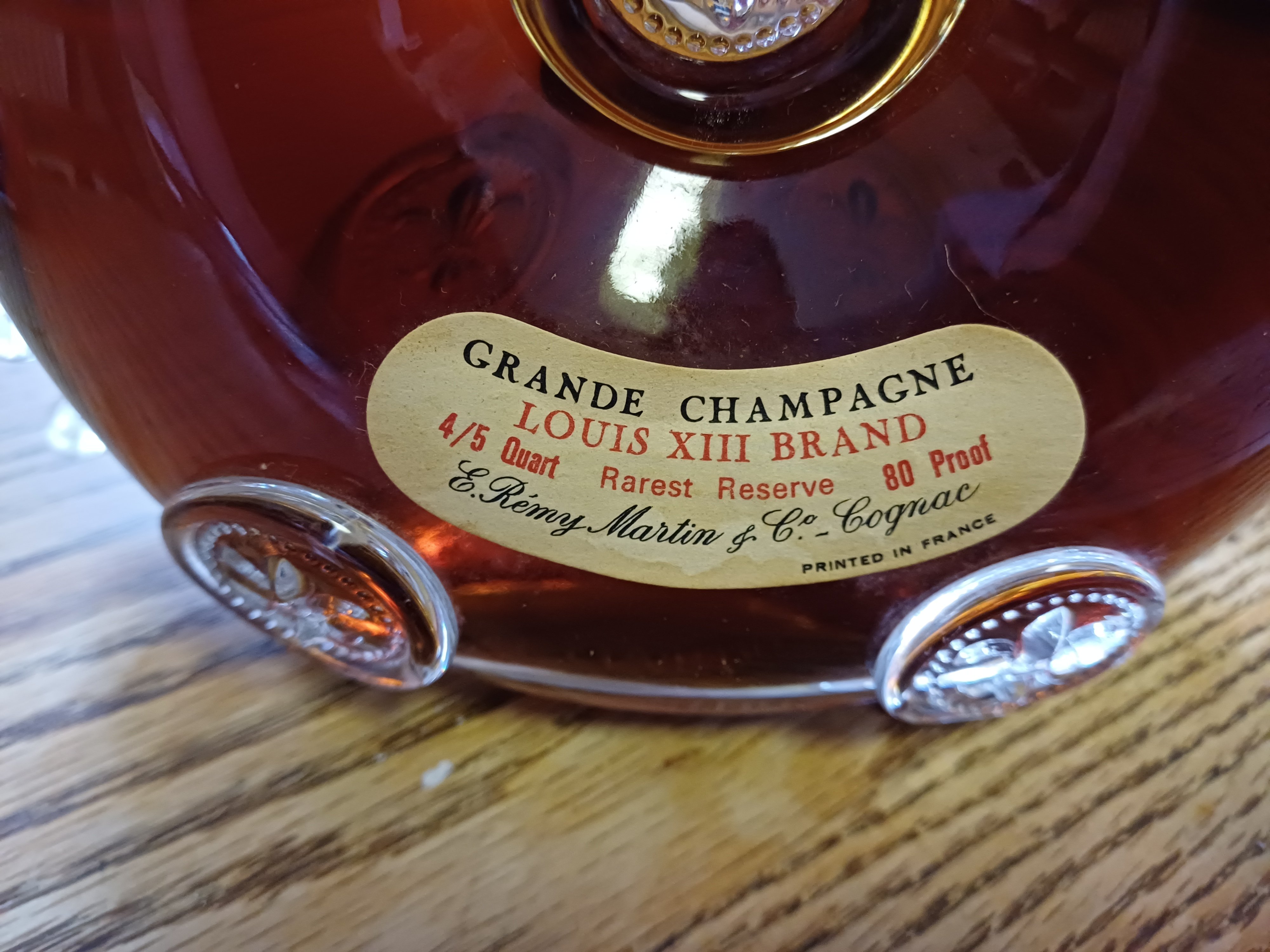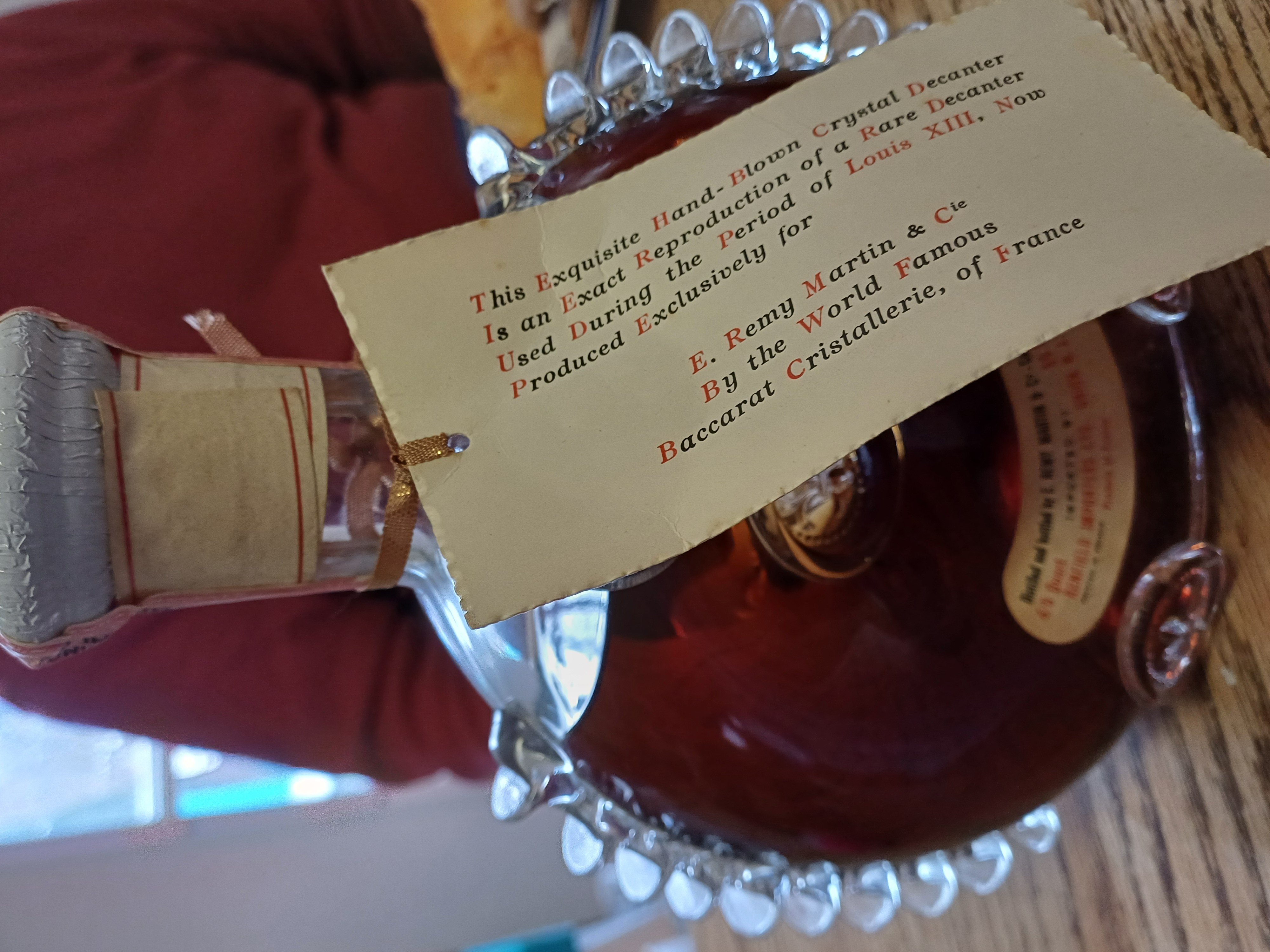 - Distilled and bottled by E. REMY Martin & Co - Cognac. 4/5 quart 80 proof. Imported by Renfield importers Ltd, union NJ. Printed in France, product of France. It also has the Tax Paid bottle stamp for Renefield Importers. It also has a tag on it noting "This exquisite hand blown crystal decanter is an exact reproduction of a rare decanter used during the period of louis XIII, now produced exclusively for E Remy Martin and Cie by the World Famous Baccarat Crustallerier of France
