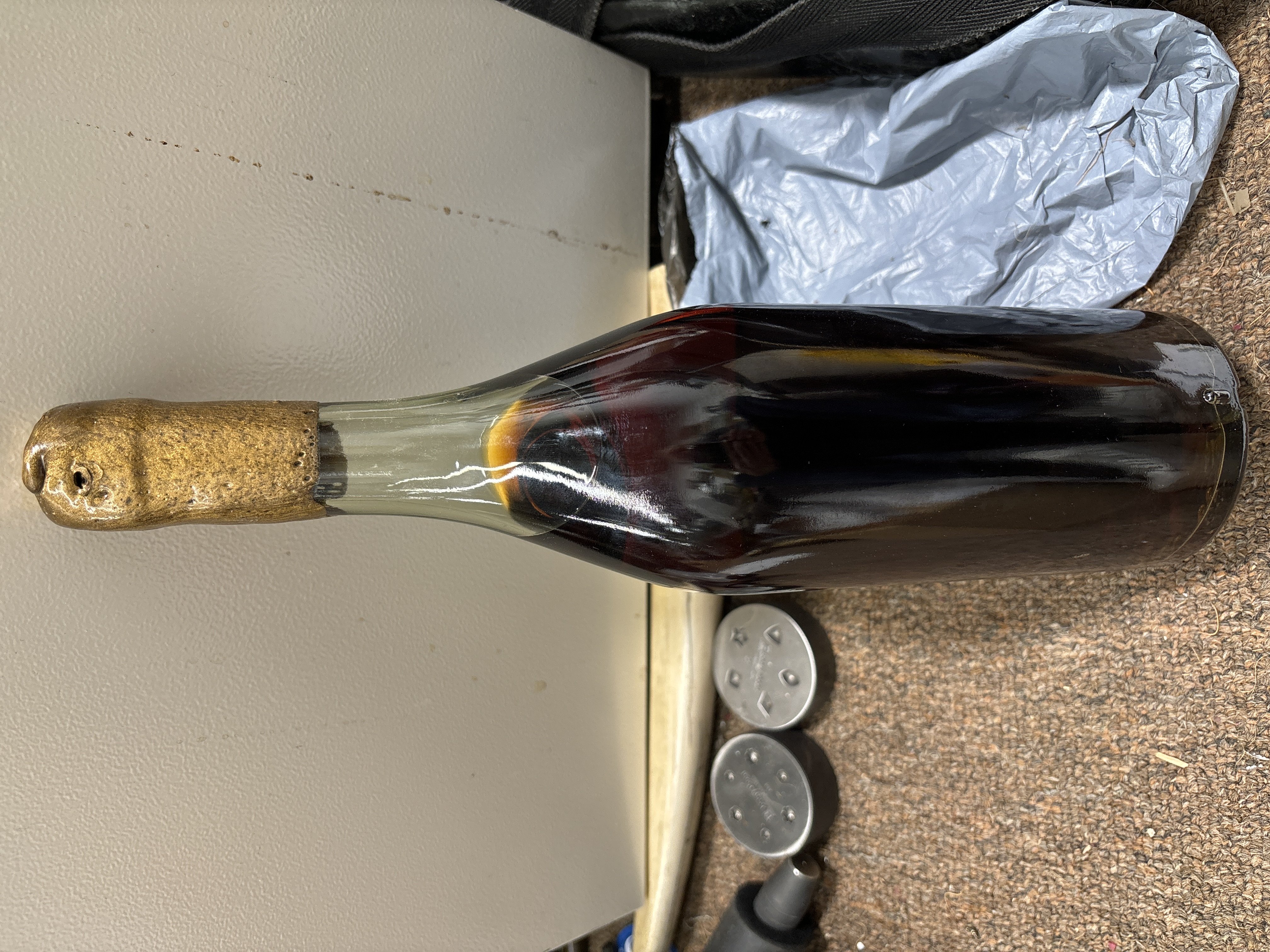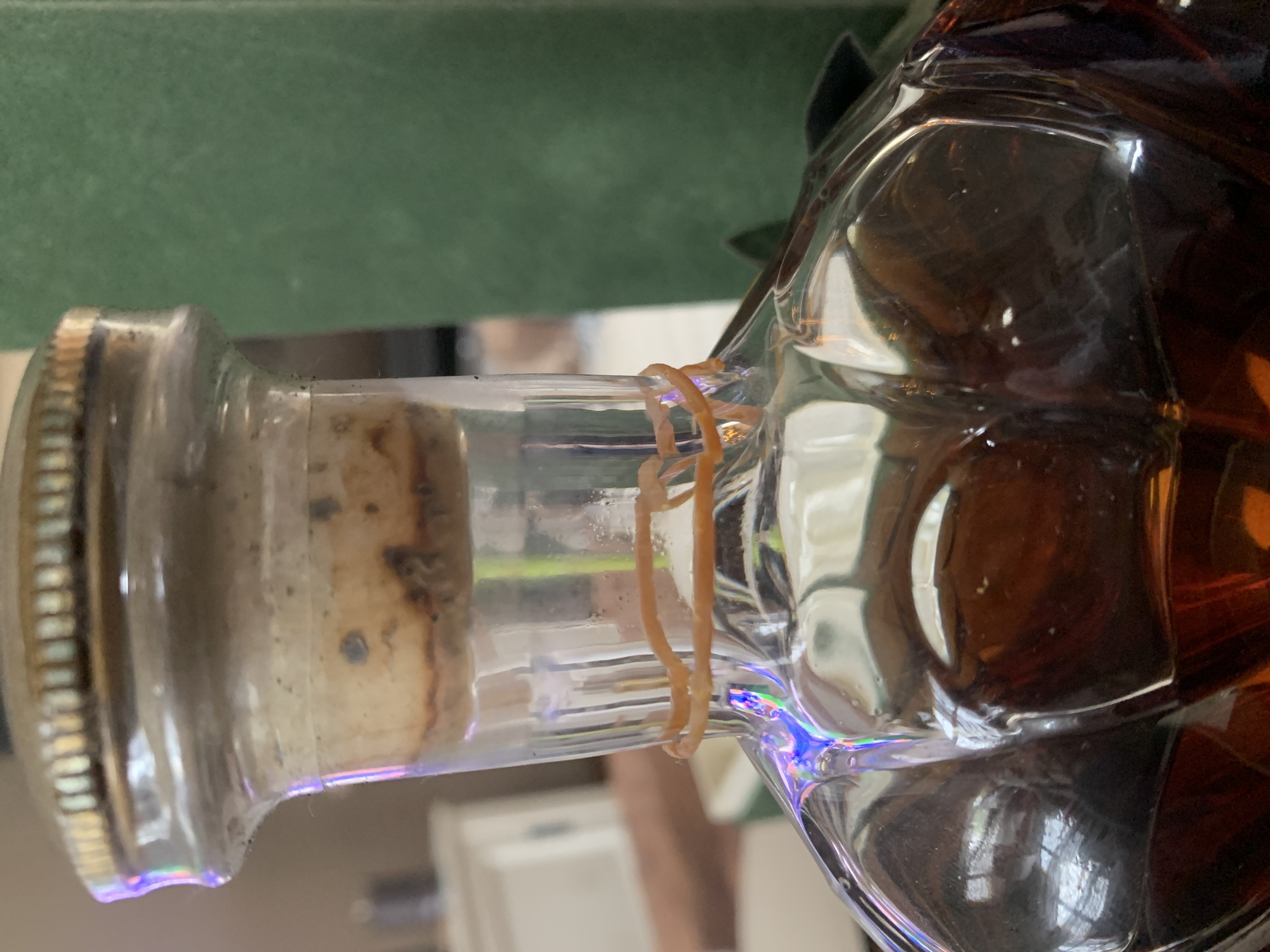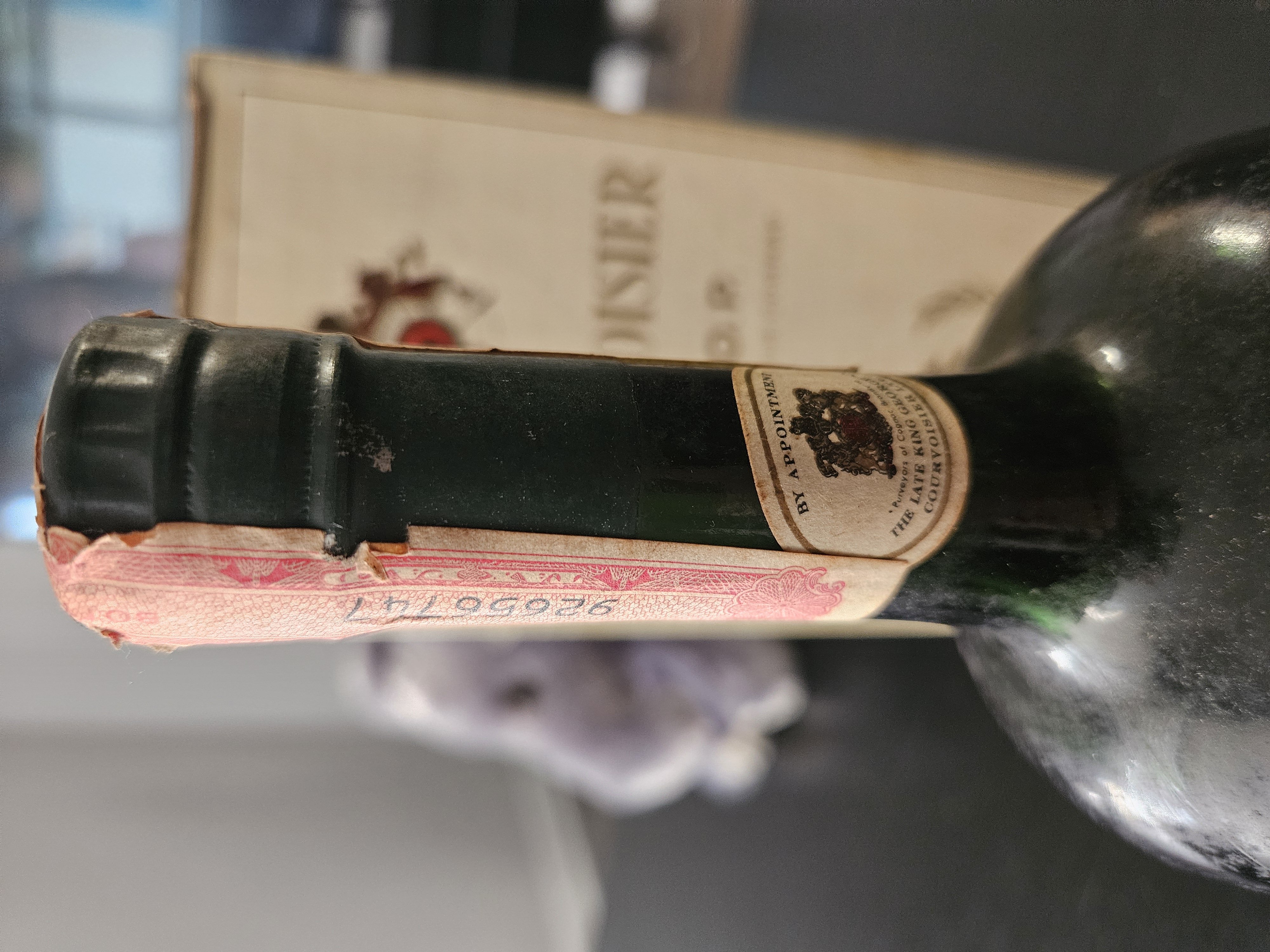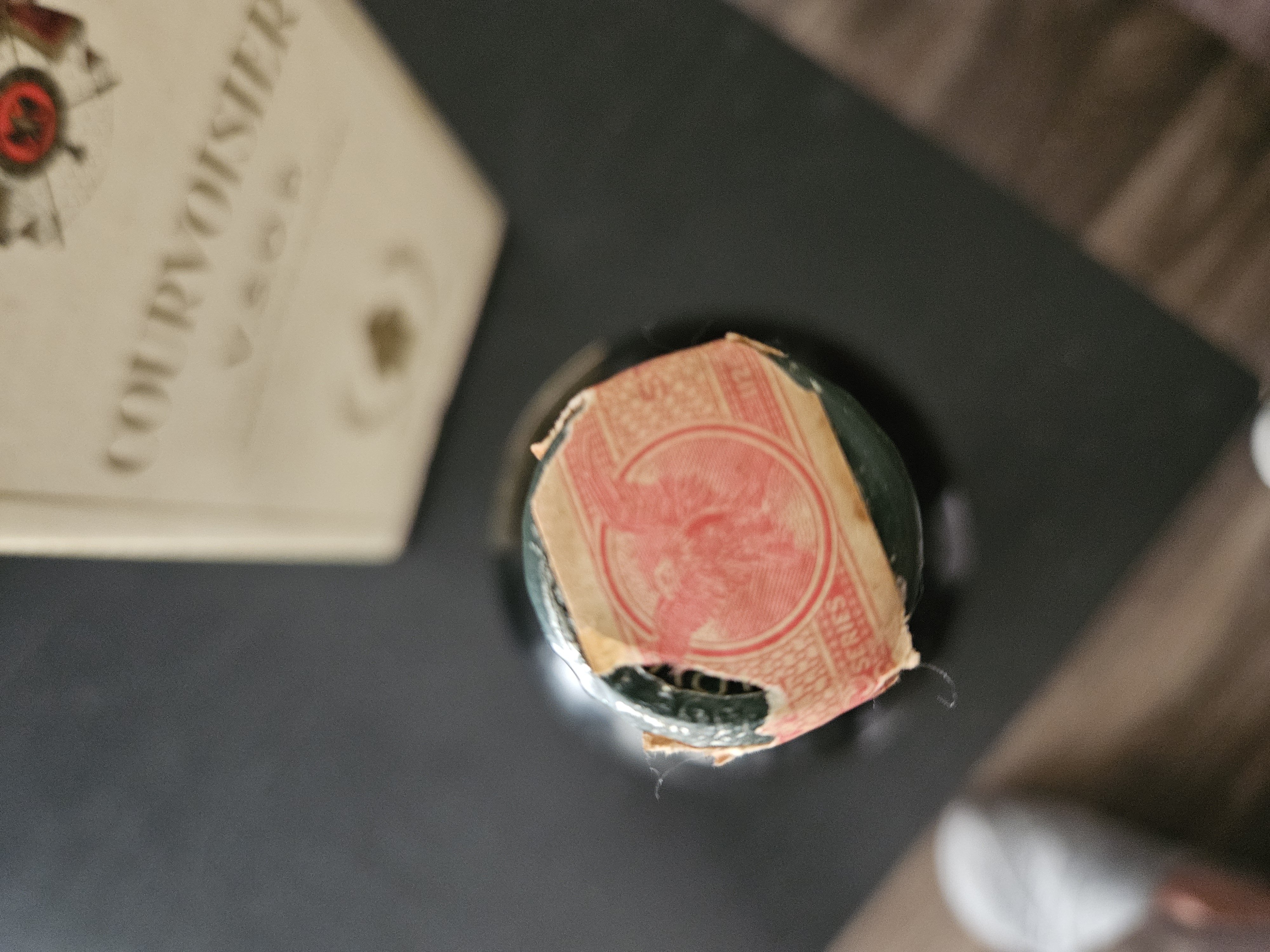 - We recently inherited the family home and found it in the liquor cabinet. It is still in the straw basket container and has never been taken out. I cannot get it out so I really can’t see the top of the bottle but it looks like it is a wax seal with a paper seal across it, and there’s a number on the paper seal that I can see that is I – 549. U able to send pictures you desire because of the inability to remove from basket. I’m sure it can be removed but I’m afraid I might mess it up.