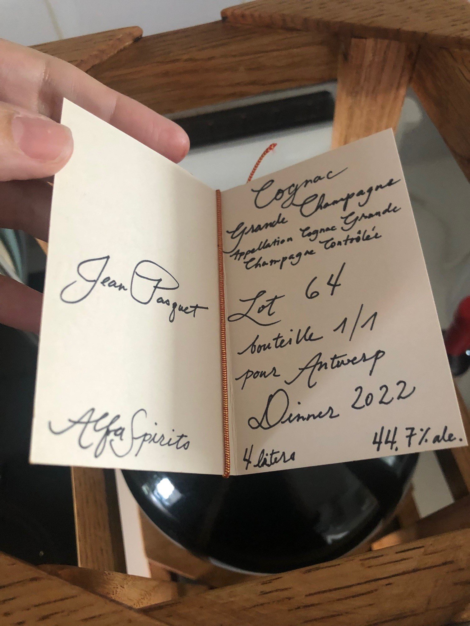 - This is an exclusive one of a kind bottle of 4 L; especially mise en bouteille for a Gala Event Antwerp Dinner 2022 where it was the first prize in a good cause auction. A special wooden crate was created and it also has a 'pipet' included. There is also a tiny bottle Jean-Luc Pasquet L'esprit de Famille with it. Special limited edition.