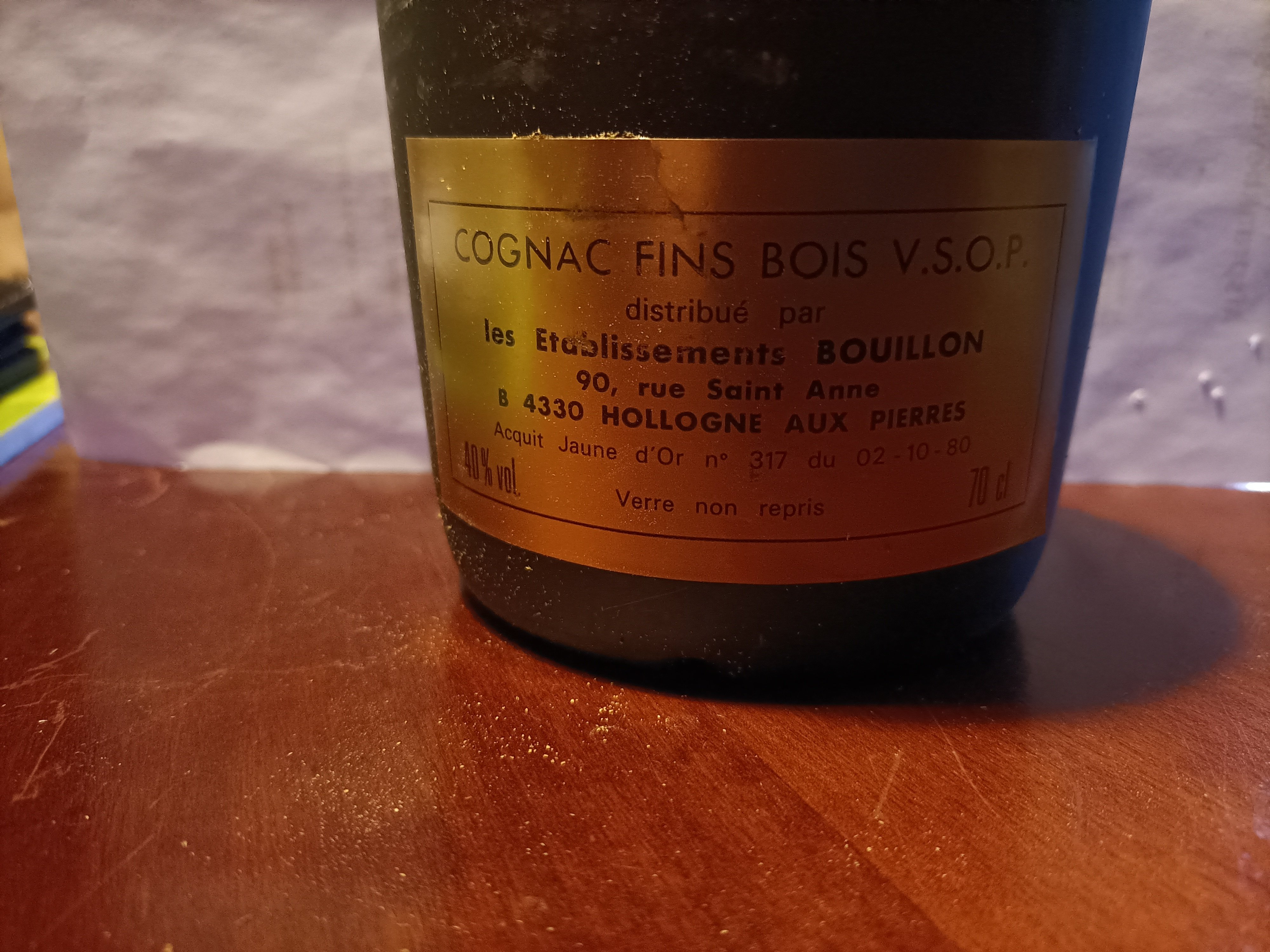 - Cognac fins bois vsop distribue par les etablissement Bouillon 90 rue Saint Anne 8 4330 Hollogne aux pierres Acquit jaune d or nr 317 du 02/10/80.