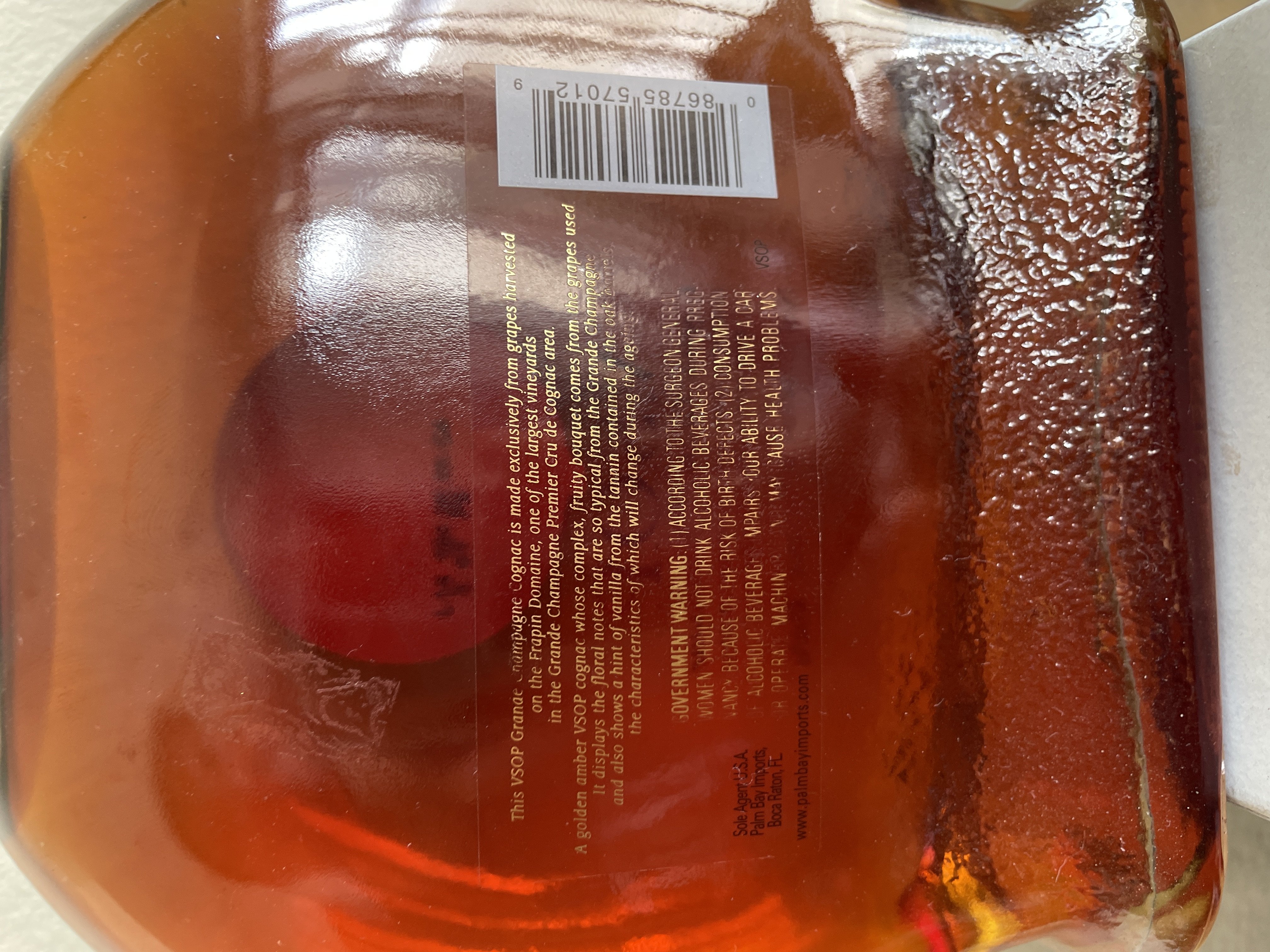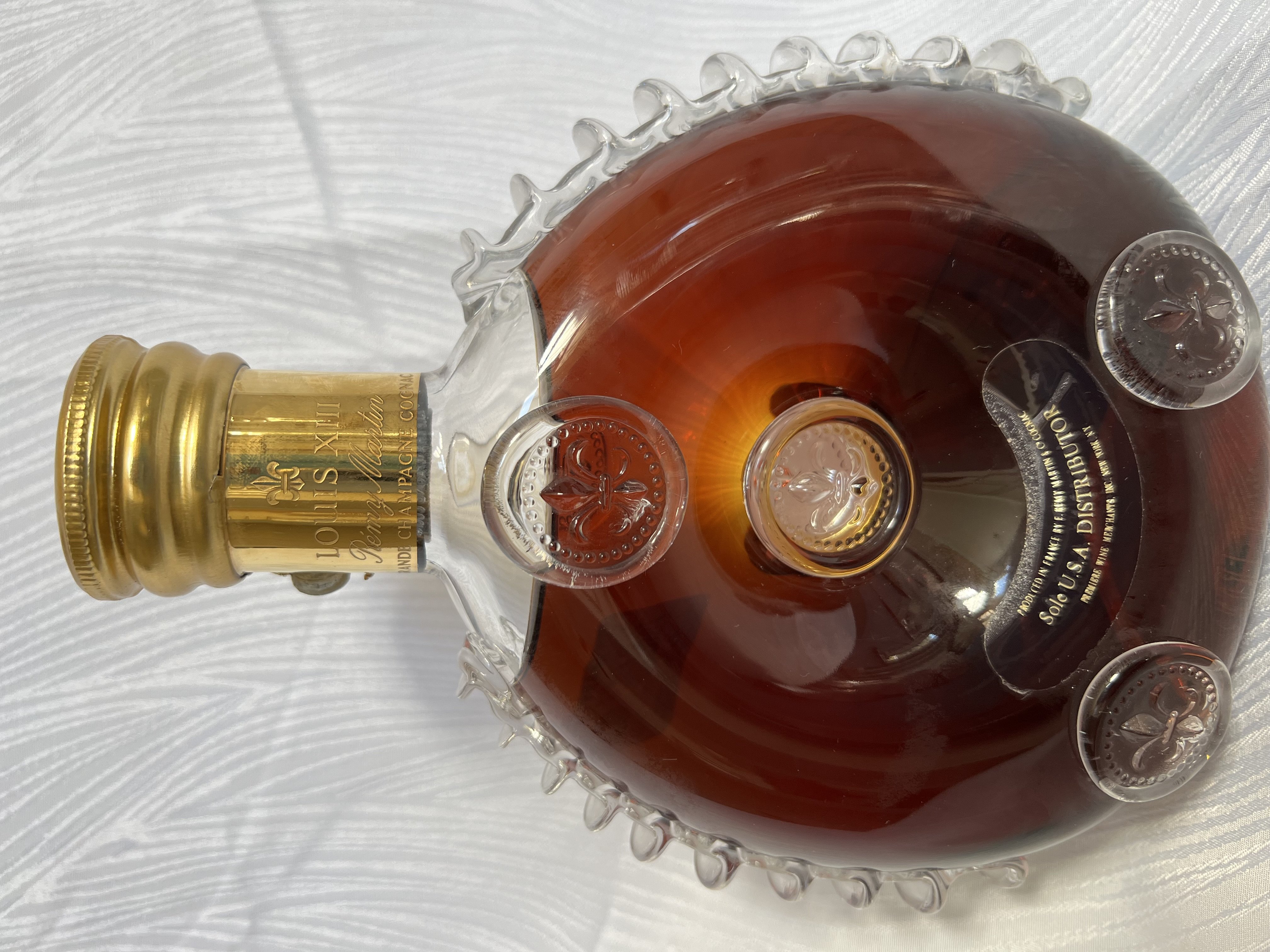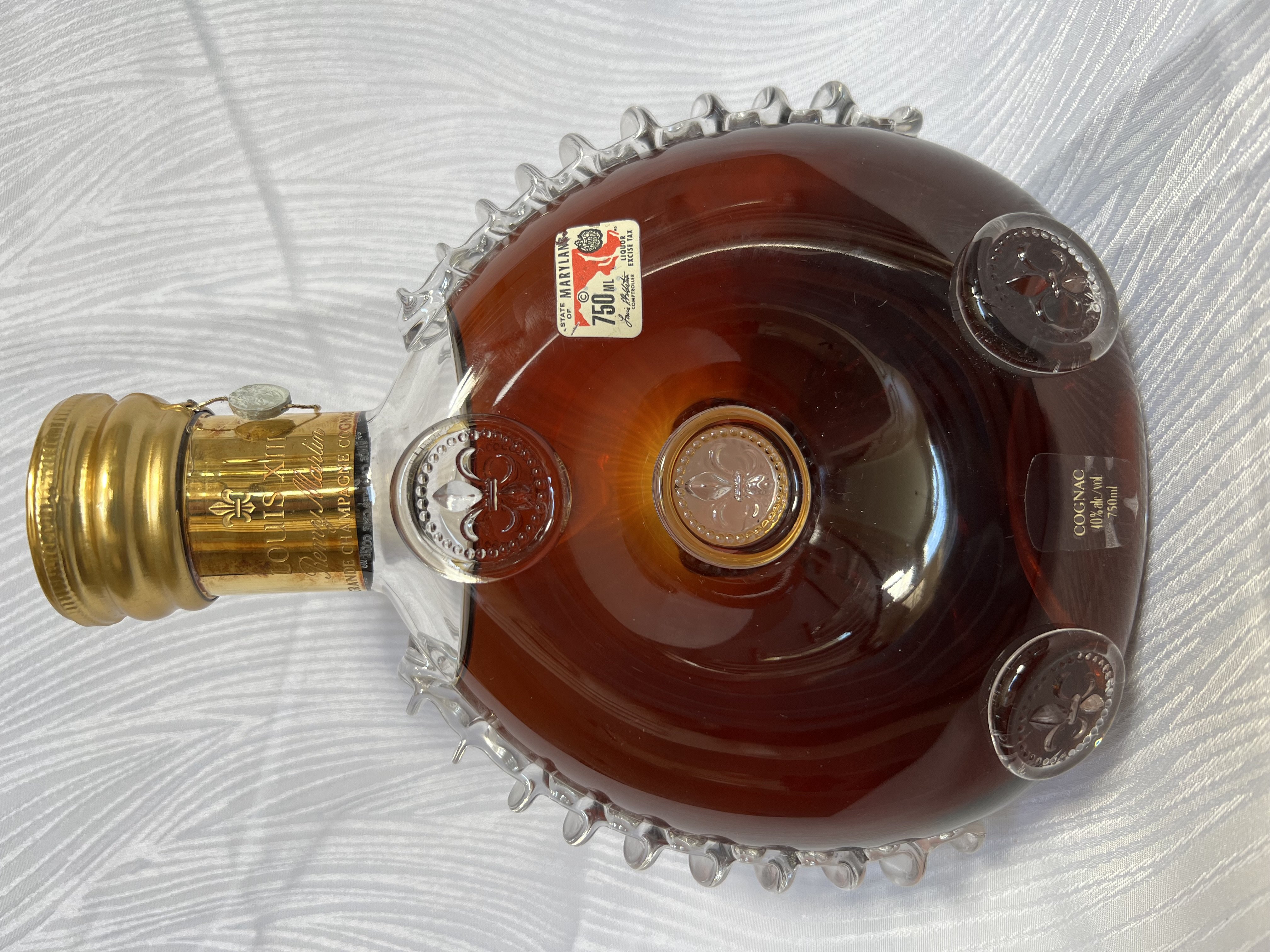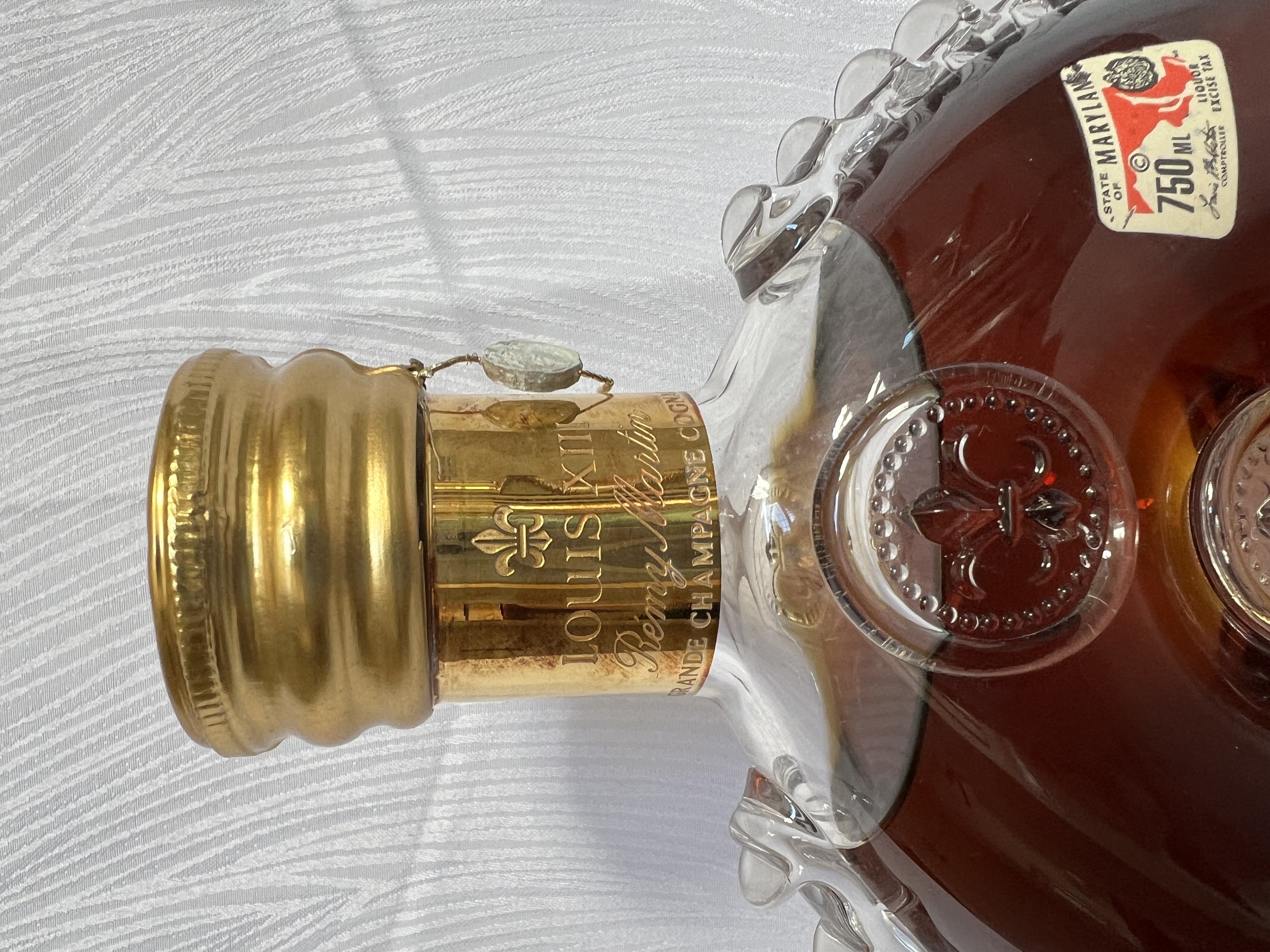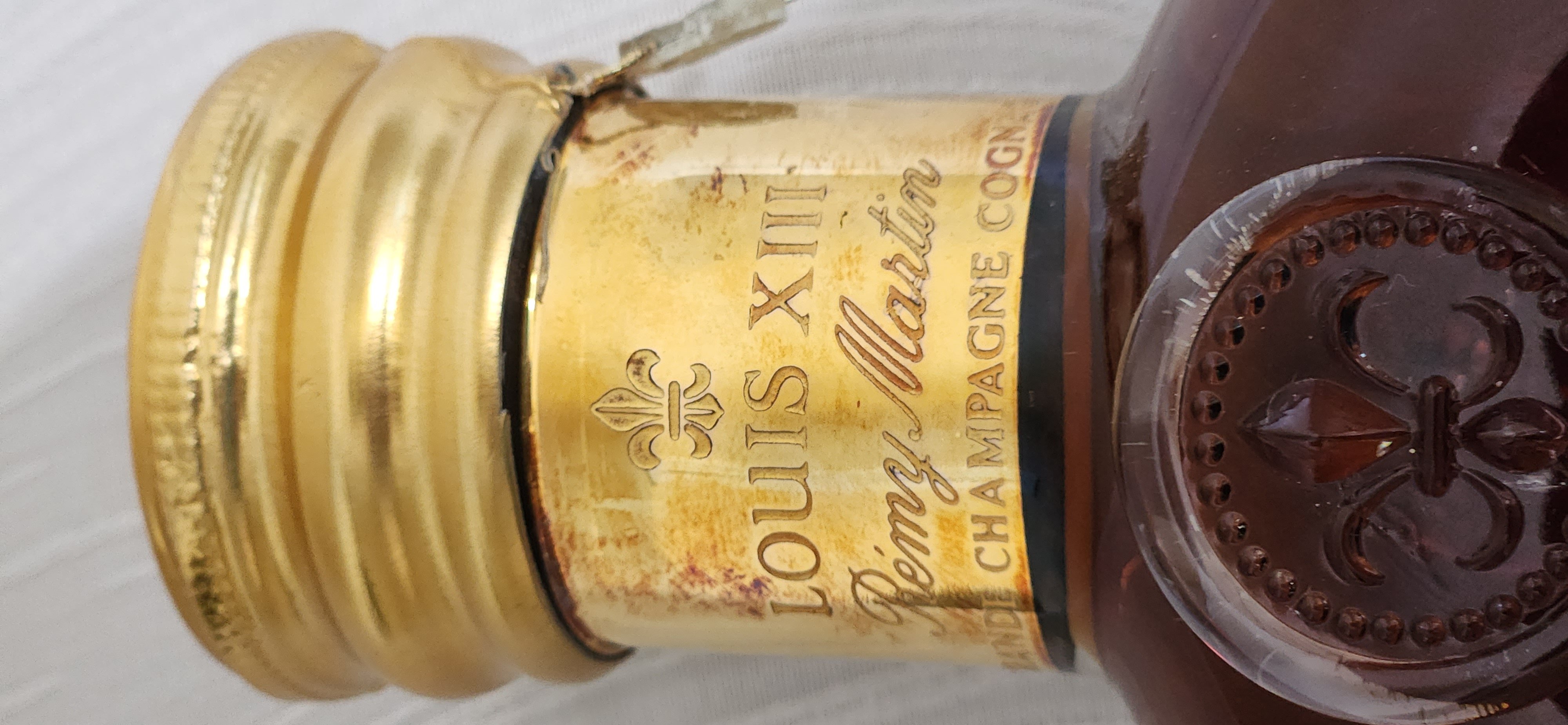 - Metal top: Louis XIII Remy Martin Grande Champagne Cognac (same front & back) Liquor Excise Tax sticker: State of Maryland 750 ml Sticker at bottom front of bottle: Cognac 40% alc/vol Back sticker: Produced in France by Remy Martin & Co Cognac Sole U.S.A. Distributor Premiere Wine Merchants, Inc. New York, NY