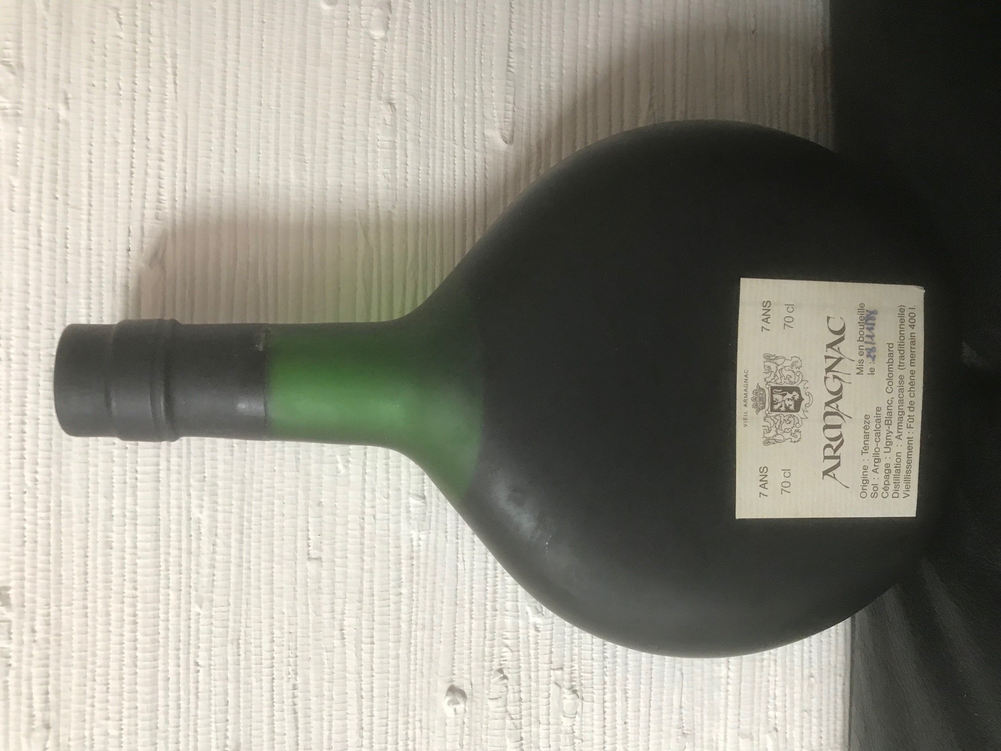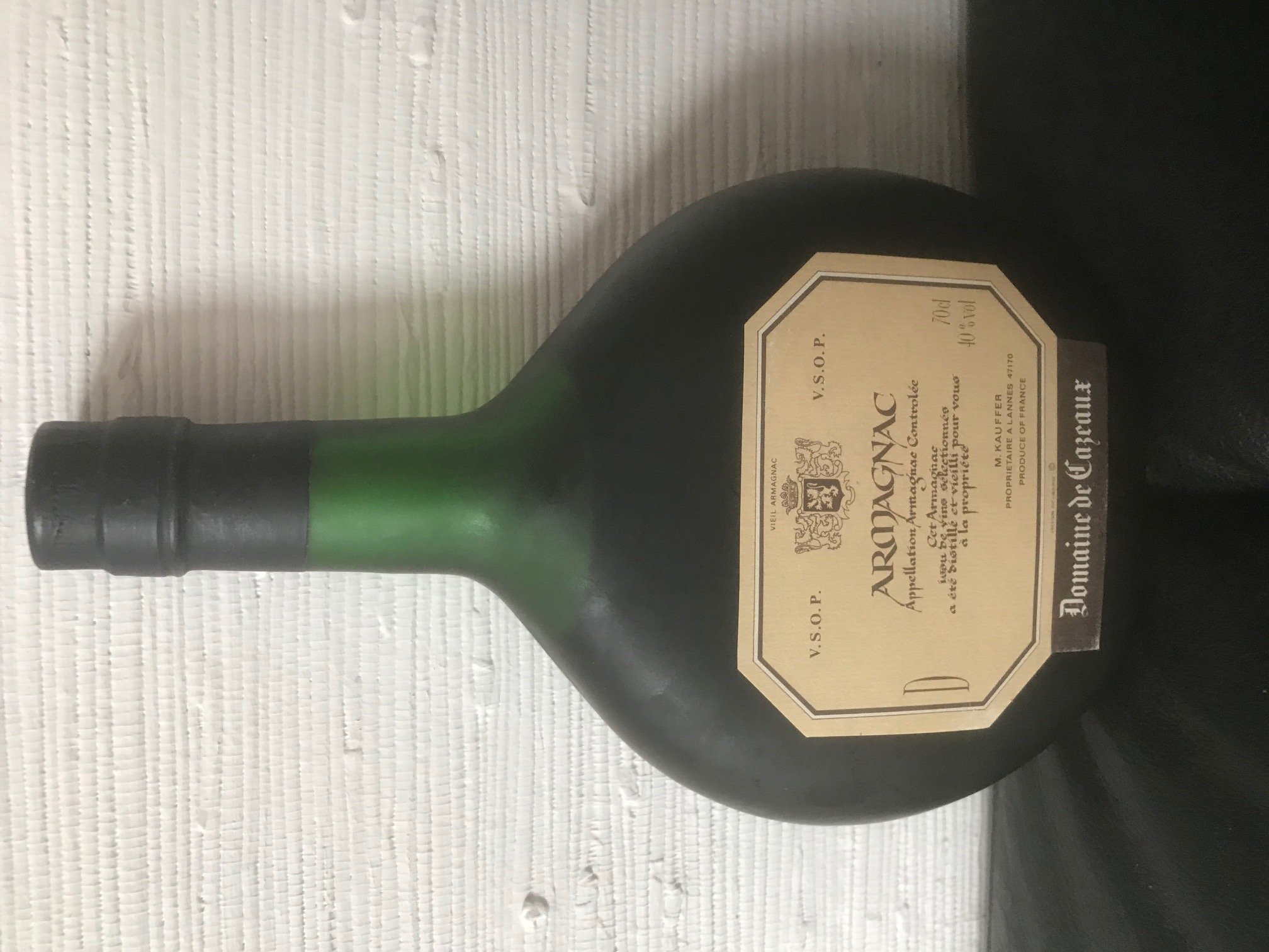 - Front V.S.O.P. D 70cl 40% vol Appellation Armagnac Controlée Cet Armagnac issu de vins selectionnés a été distillé et vieilli pour vous a la propriété M. KAUFFER Proprietaire a Lannes 47170 Produce of France Back 7 ANS 70 cl Origine: Ténarèze Sol: Argilo-calcaire Cépage: Ugny-Blanc, Colombard Distillation: Armagnacaise (traditionelle) Vieillissement: Fût de chene merrain 400 l. Mis en bouteille le: (handwriting) 28/11/88