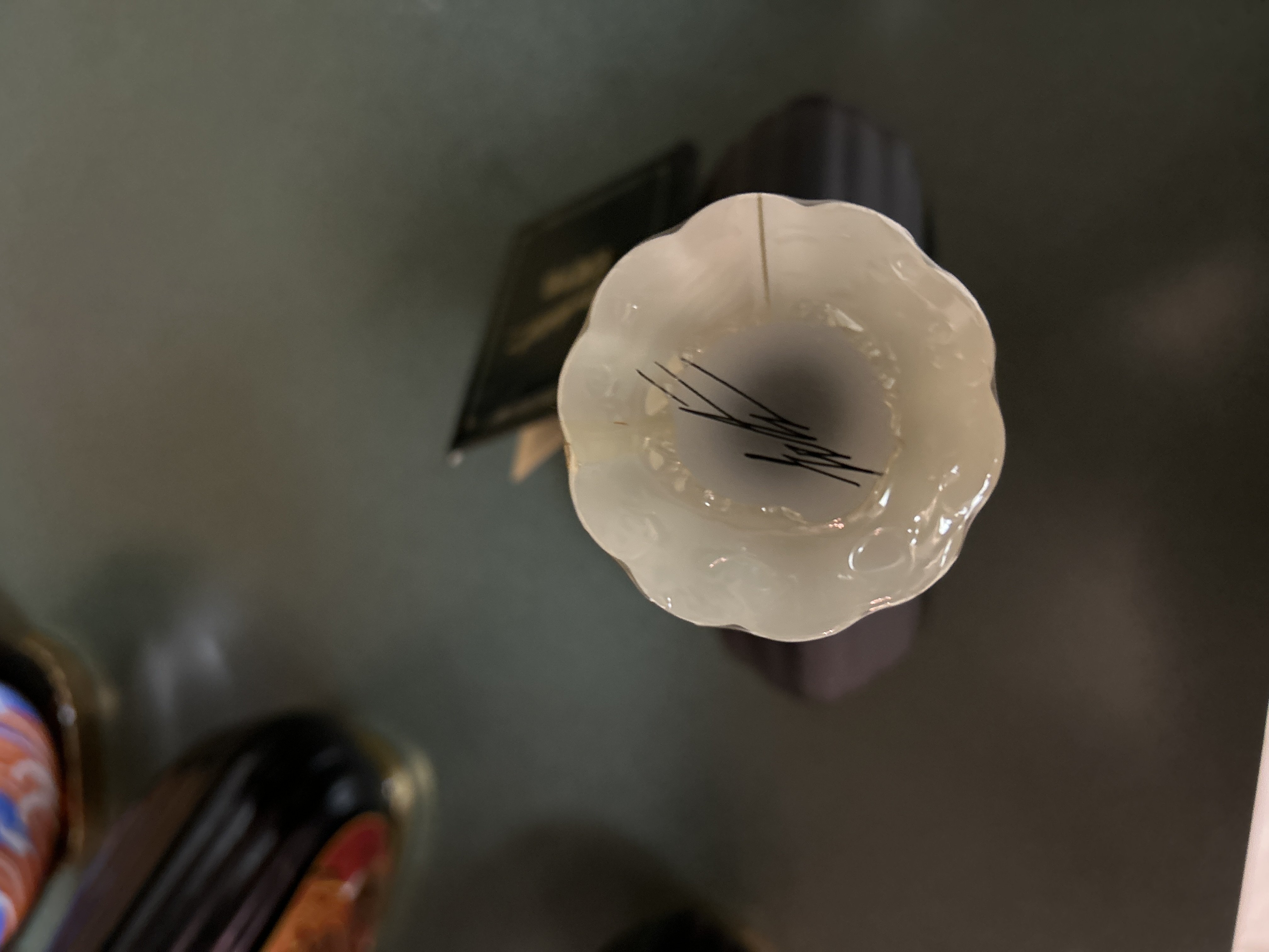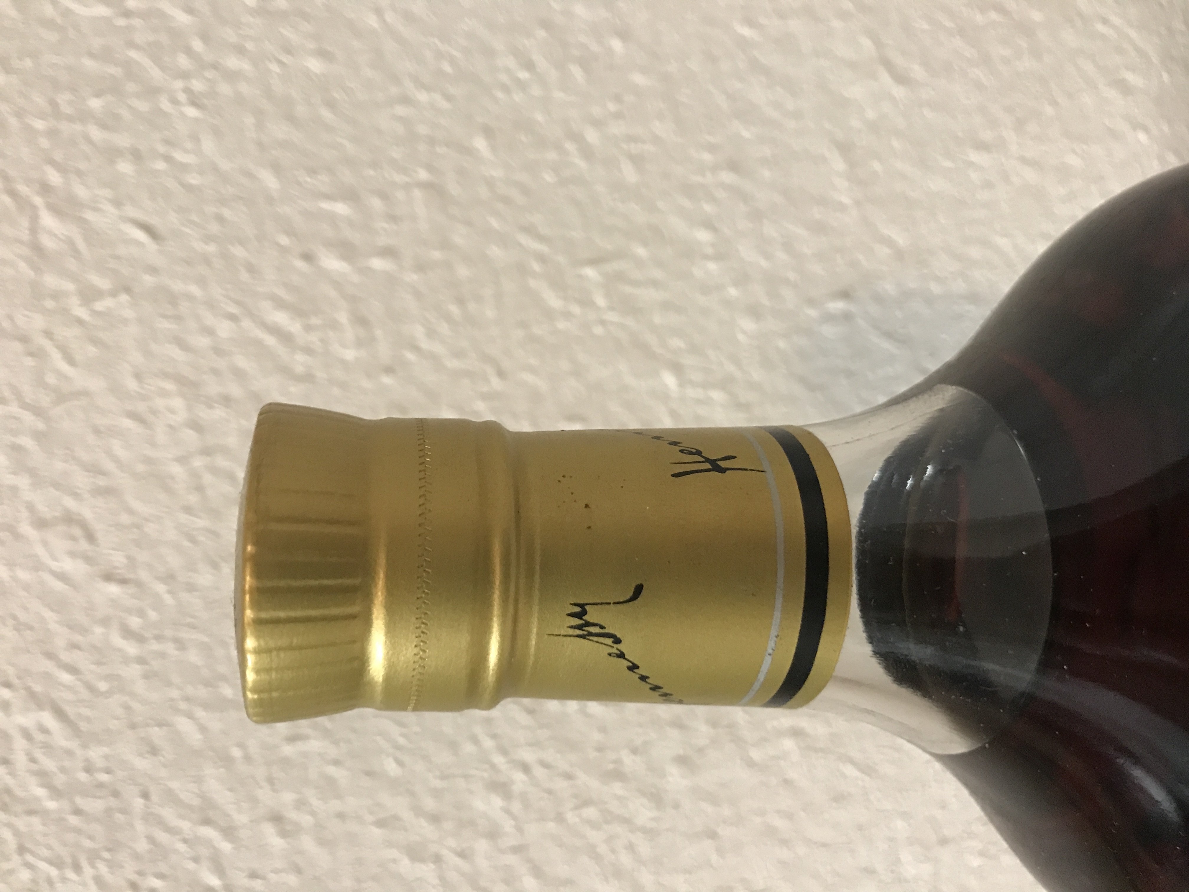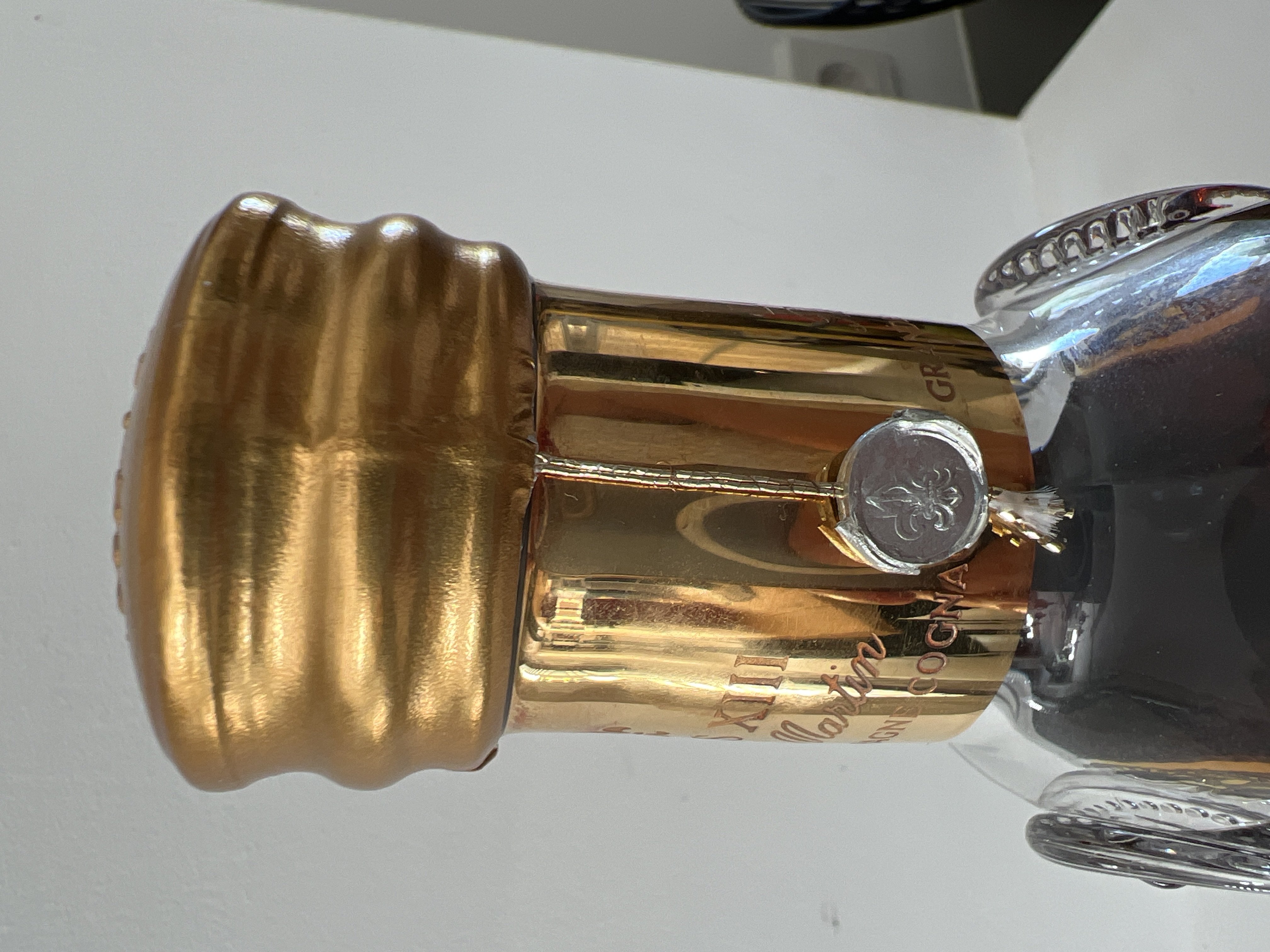 - Neck label- Louis XIII Remy Martin Grande Champagne Cognac- two transparent printed stickers one says produced in France by E. Remy Martin & Co Cognac ALCVOL The other label is the government warning label. The bottom of the bottle reads E. Remy Martin & C IE BACCARAT CRISTAL LIQUOR BOTTLE with a round stamp in the center reading Baccarat France . AF7149 COGNAC 0.75L FRANCE There is then two rows of hash marks like______ at the very bottom of the bottle- 12 in each row. The fleur-de-lis stopper has the same number of AF7149 as well as the little book in the box