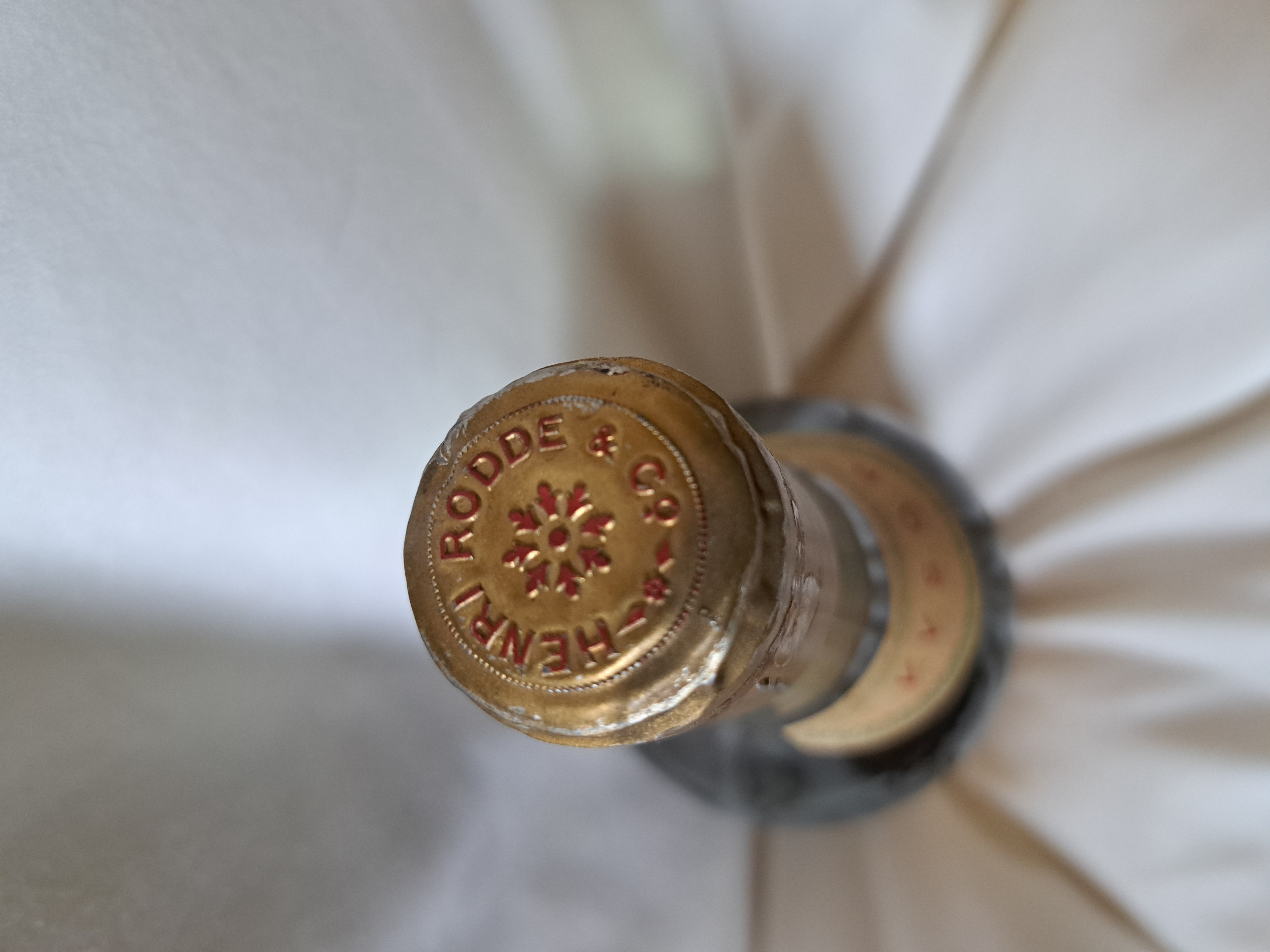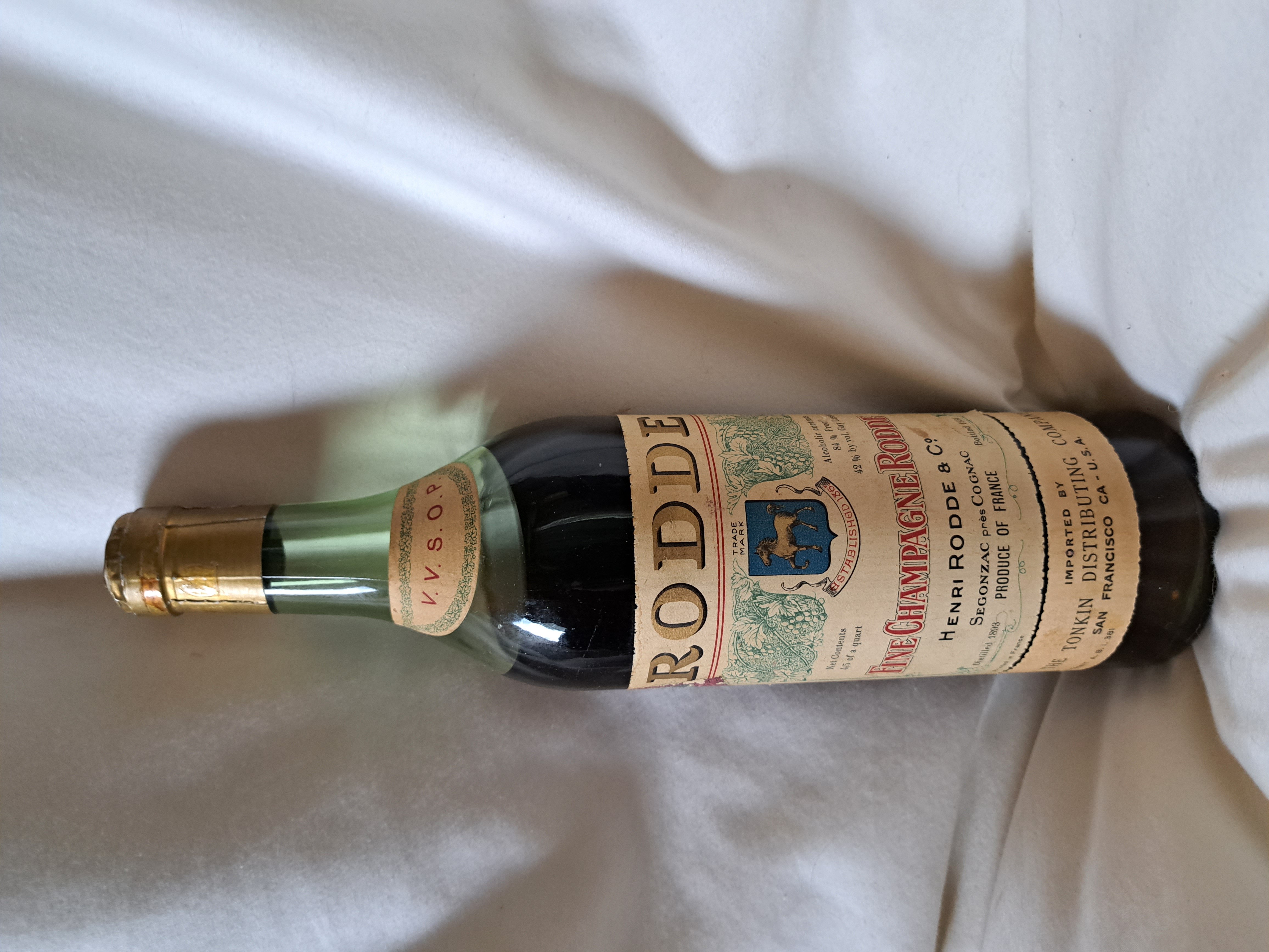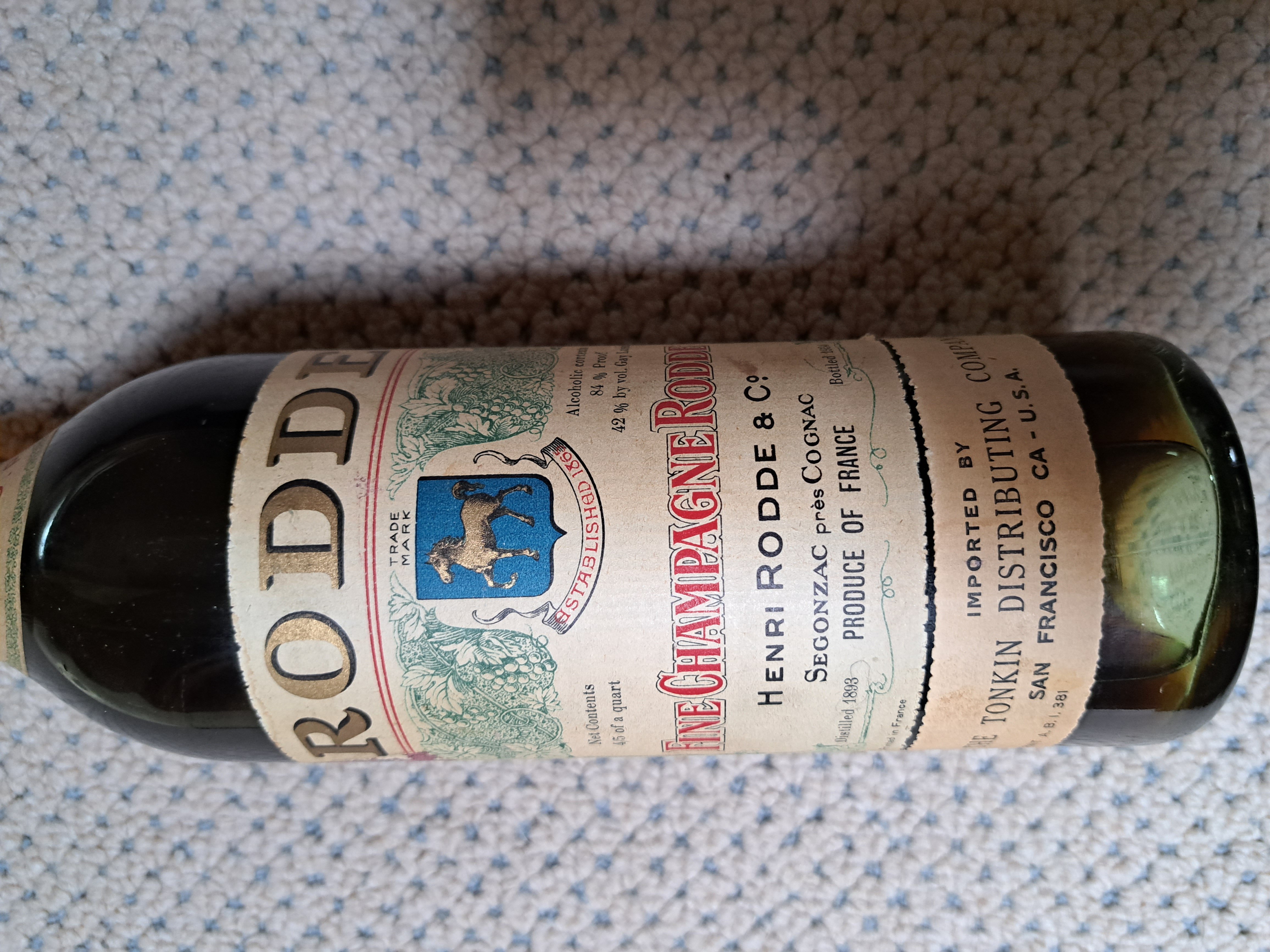 - Fine Champagne Rodde Henri Rodde & Co. Segonzac pres Cognac. Produce of France. Imprted by The Tonkin Distribution Co. San Francisco CA. Net contents 4/5 of a quart. Alcohol Content 84% proof. 42% alcohol by vol. Gay Lussac