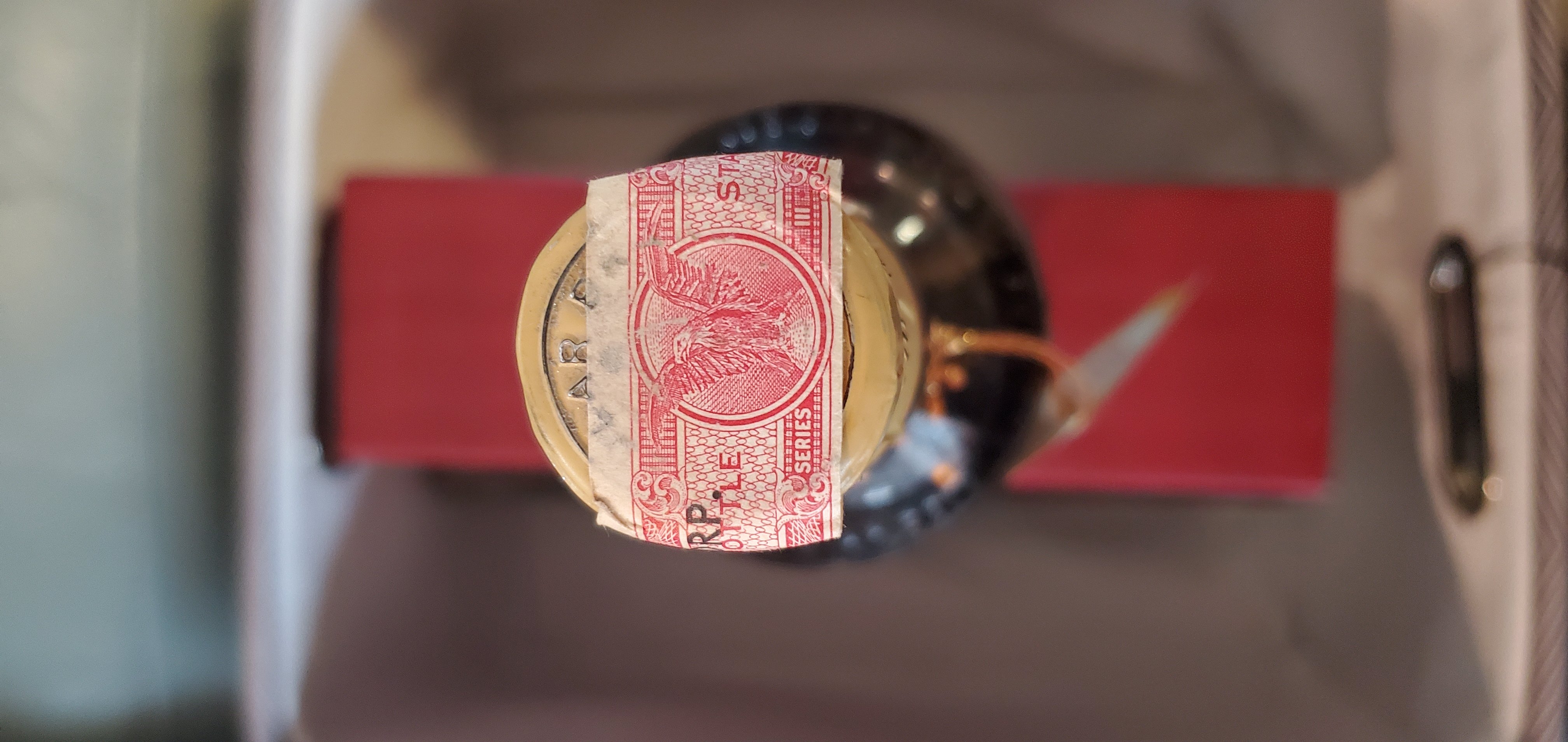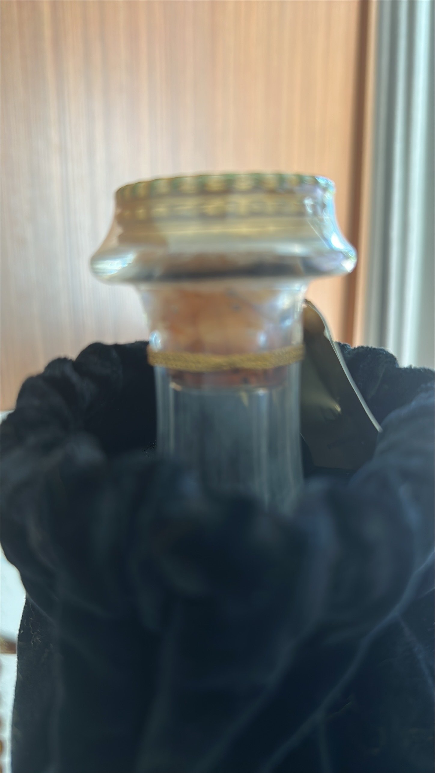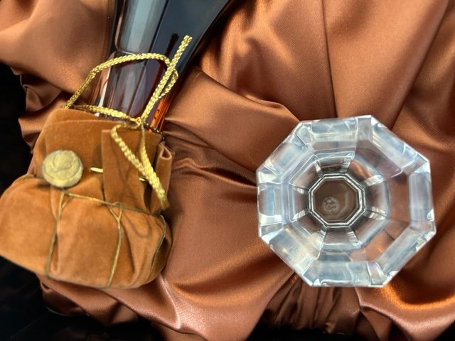 - This bottle has a velvet cover surrounded by what is on champagne bottles, a wire covering. It has a little tiny medallion hanging from that. There is a crystal bottle top in the box which is laying in a brownish satin finish