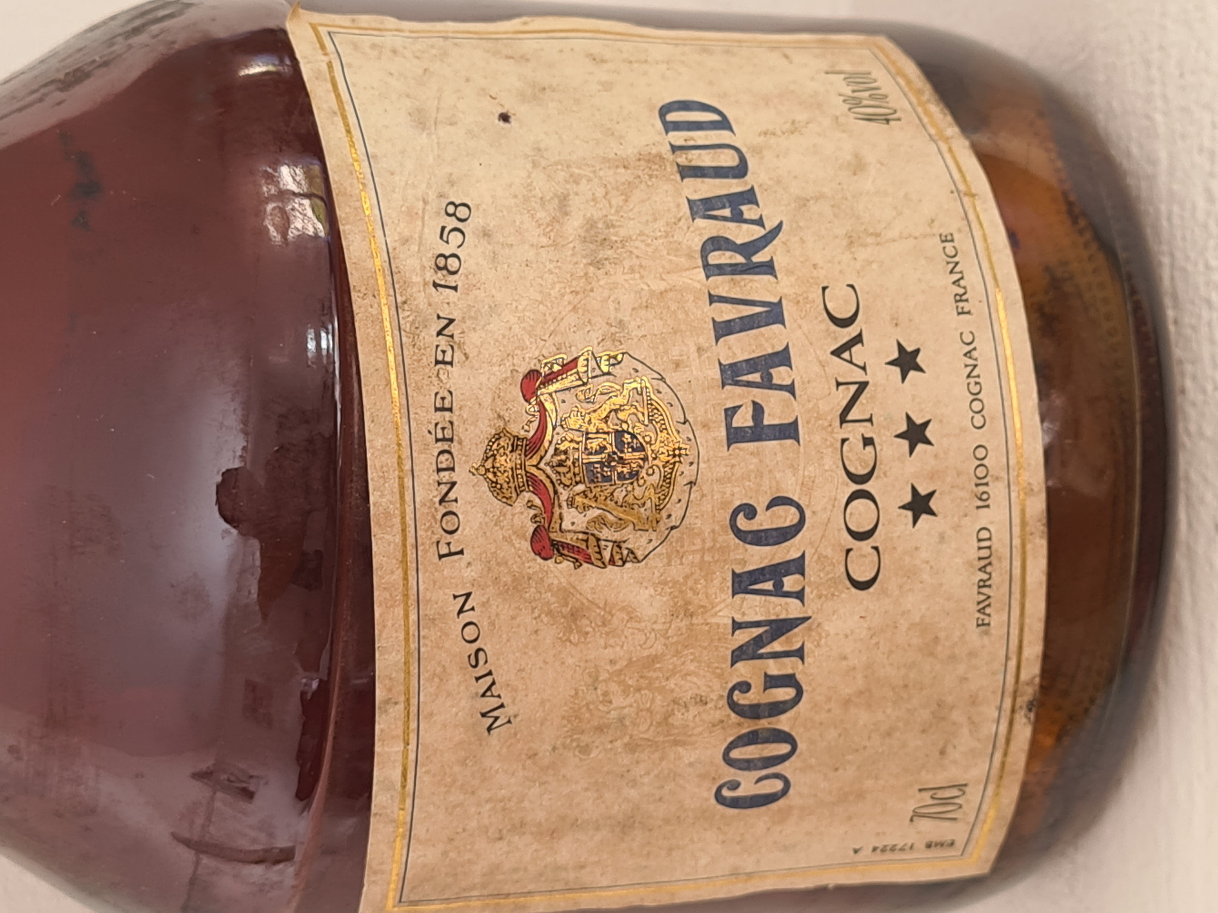 - Mis en bouteille à Cognac France Maison fondée en 1858 COGNAC FAVRAUD COGNAC *** FAVRAUD 16100 COGNAC FRANCE EMB 17224A 40% 70Cl