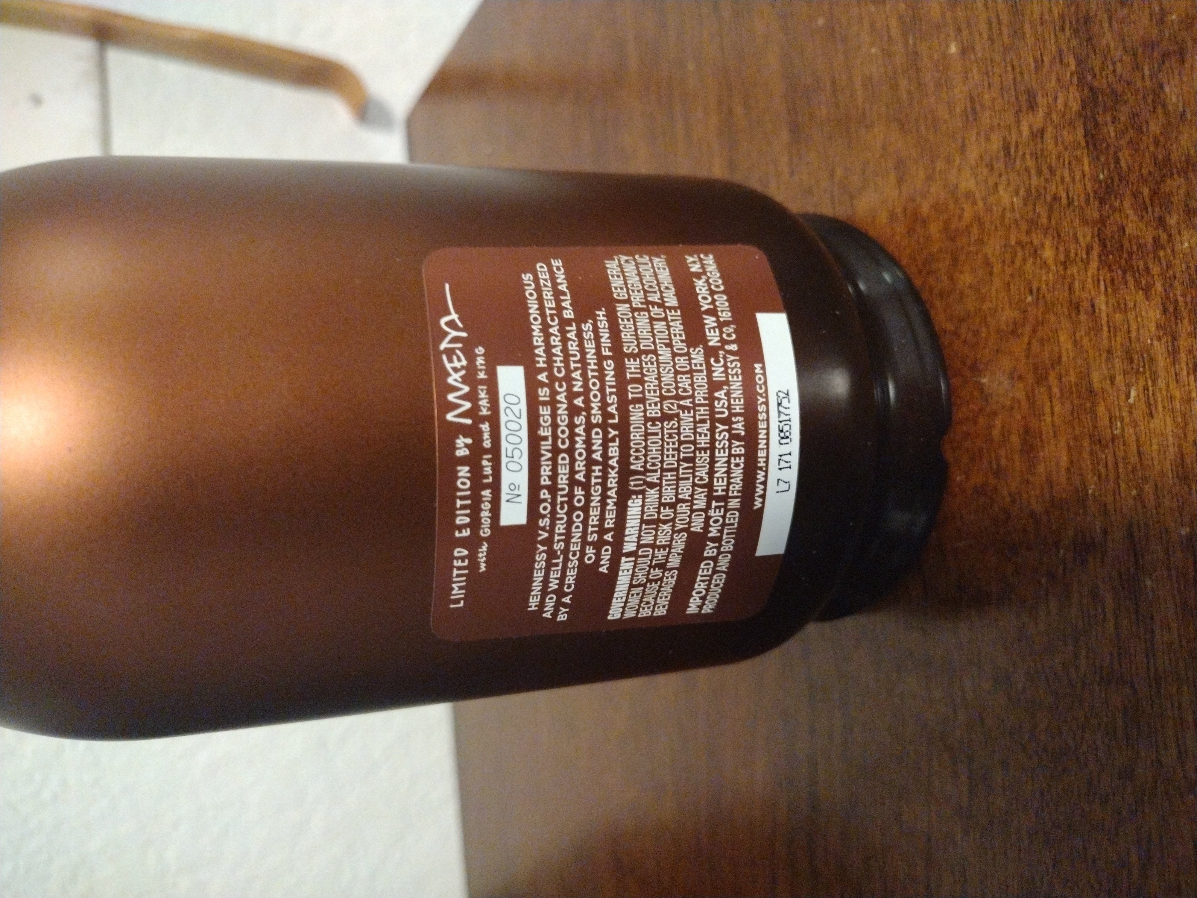 - LIMITED EDITION NO. 190121 <<REMIXING THE PRESENT>> www.hennessy.com IMPORTED BY MOET HENNESSY USA, INC., NEW YORK, N.Y. PRODUCED AND BOTTLED IN FRANCE BY JAS HENNESSY & CO. 16100 COGNAC GOVERNMENT WARNING: (1) According to the Surgeon General, women should not drink alcoholic beverages during pregnancy because of the risk of birth defects. (2) Consumption of alcoholic beverages impairs your ability to drive a car or operate machinery, and may cause health problems.