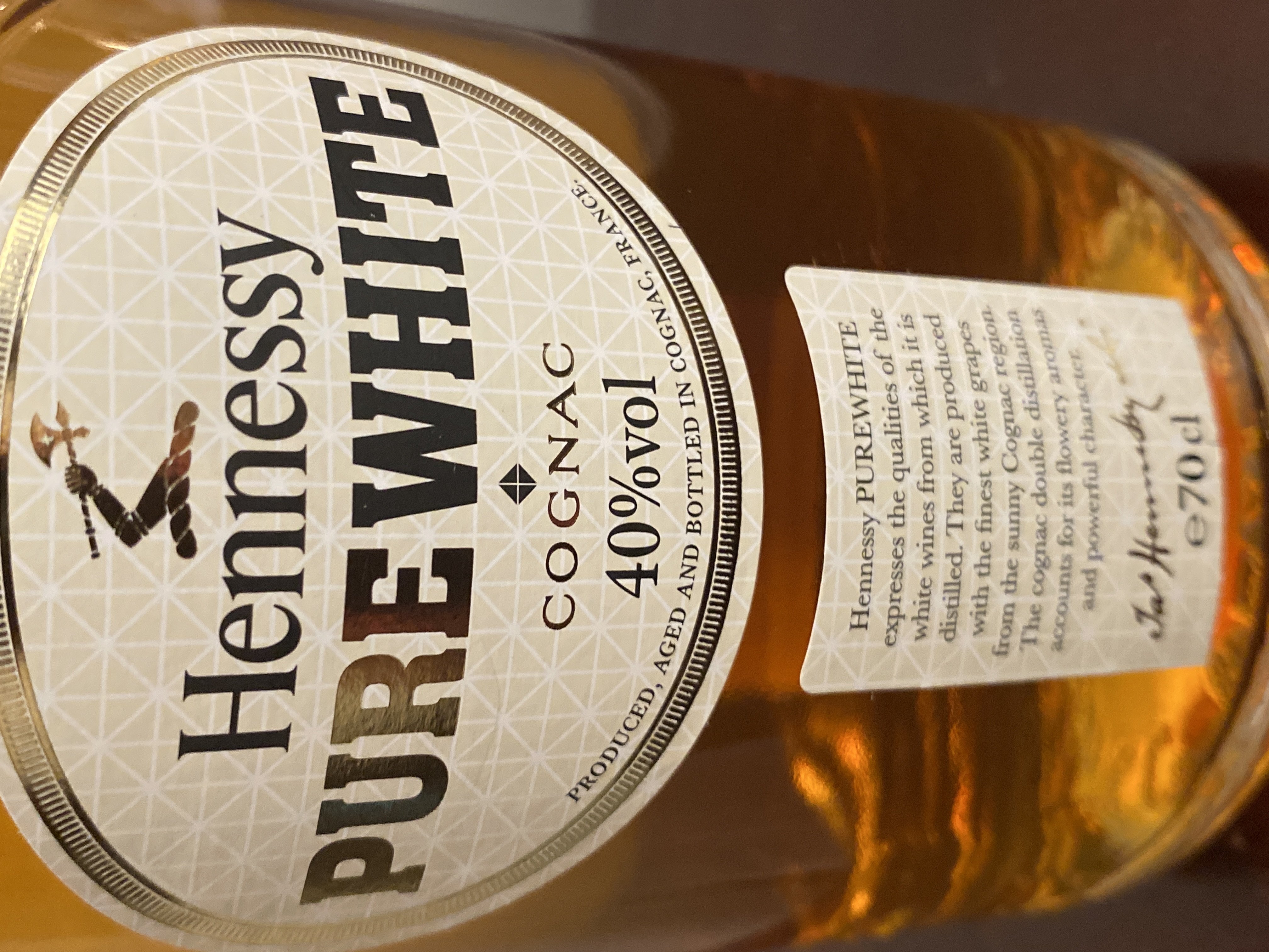 - Hennessy Pure White Cognac; 40%. Produced, Aged and bottled in Cognac France