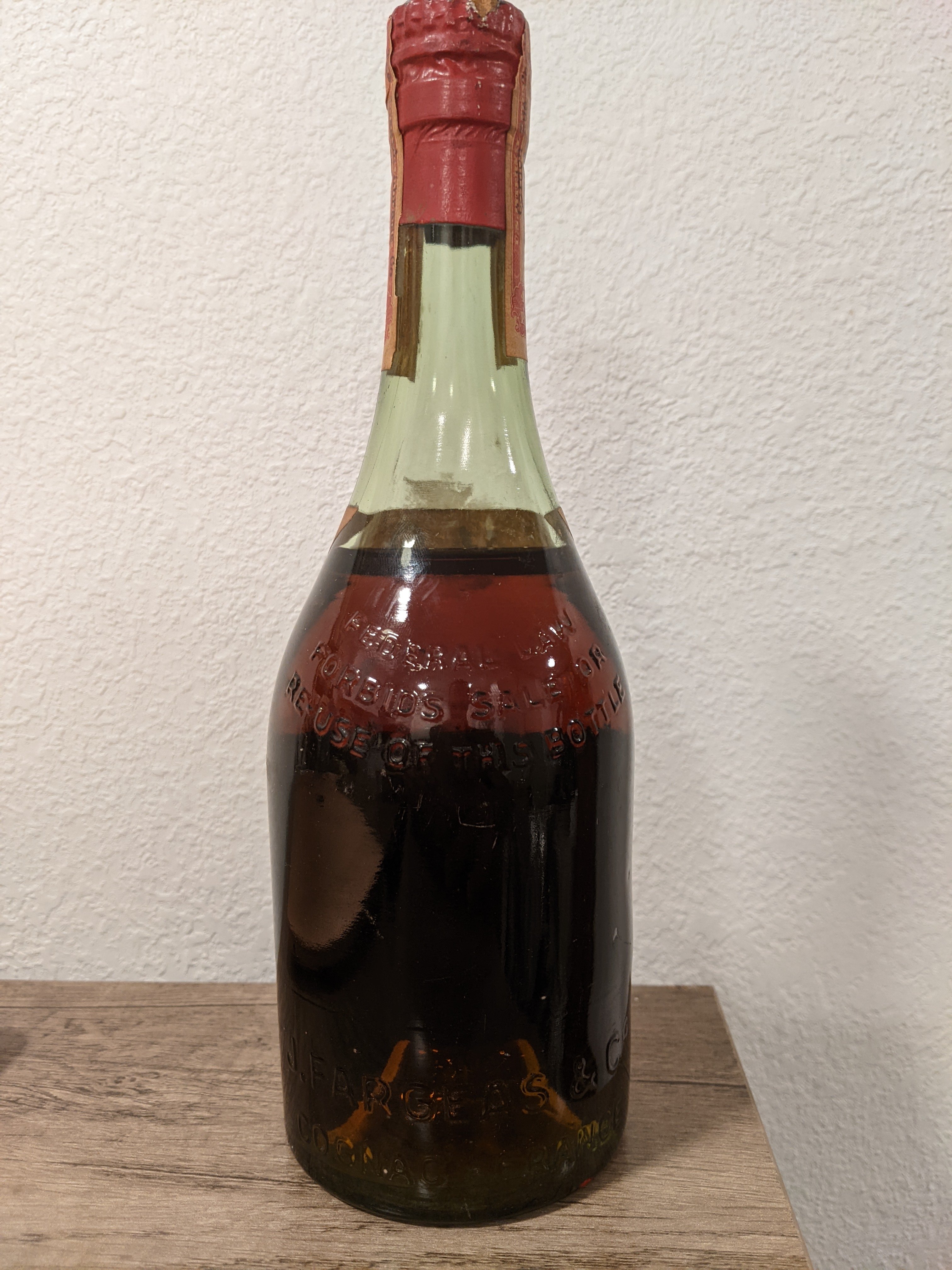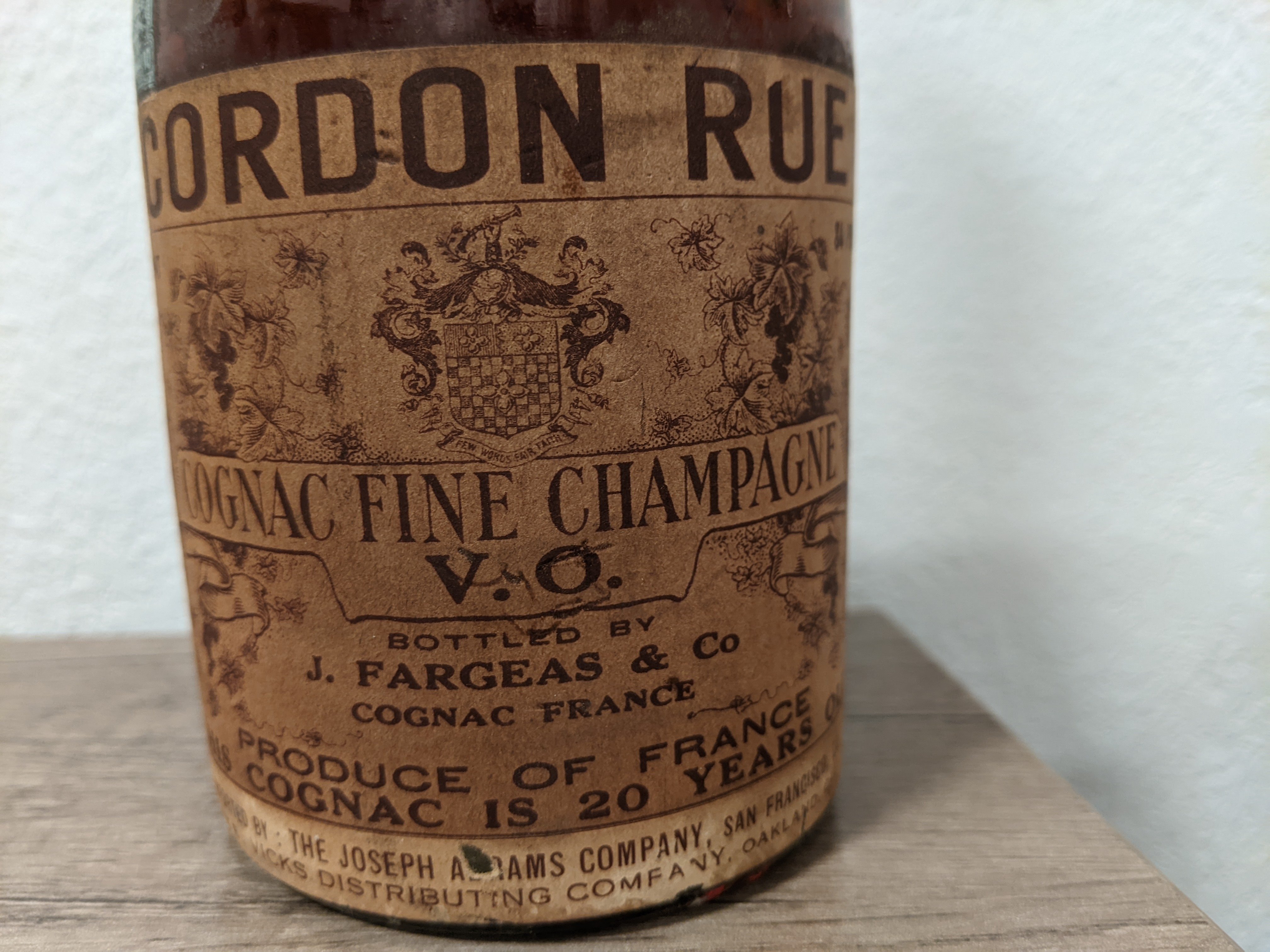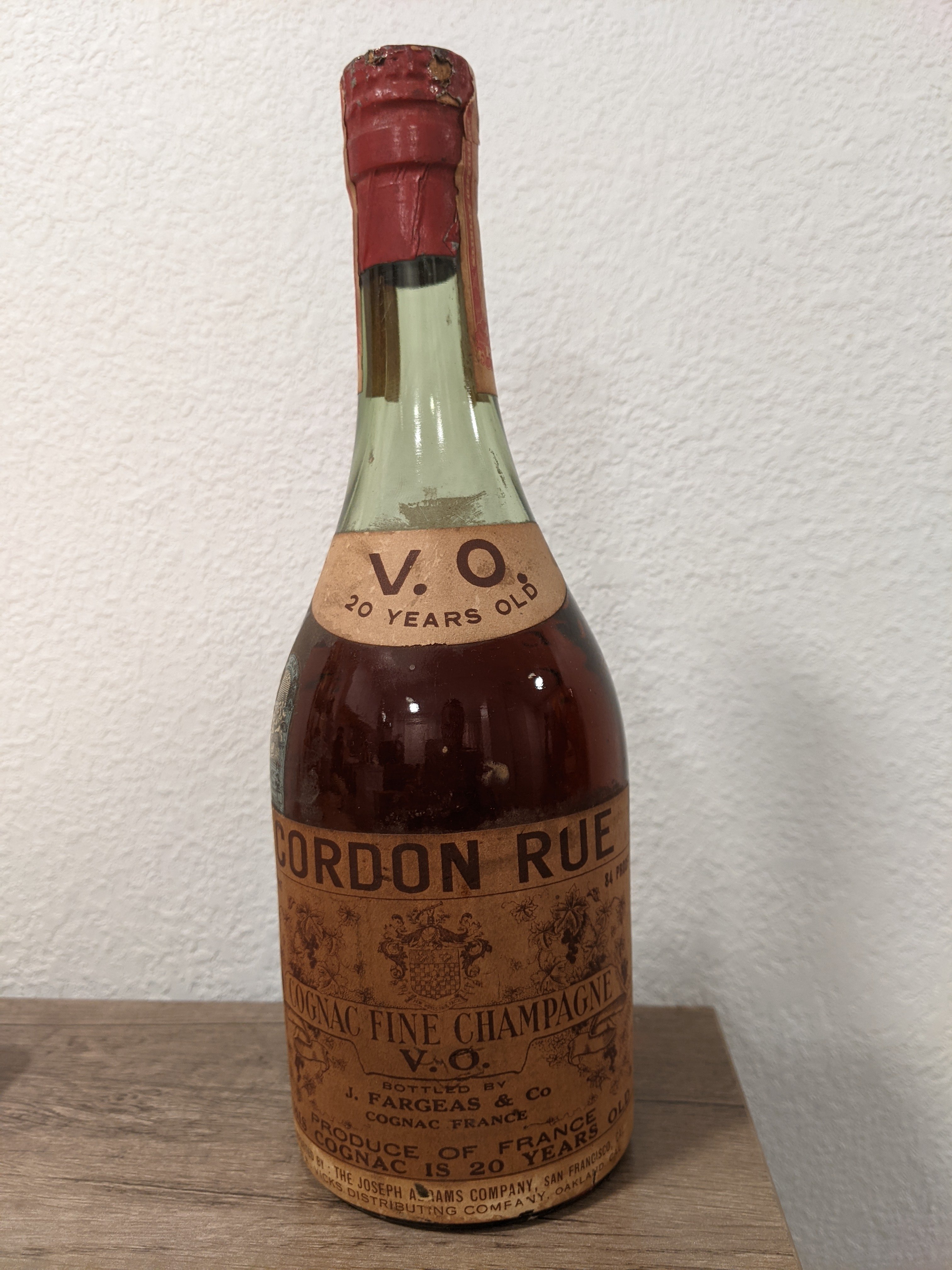 - V.O. 20 Years Old State of California Tax Stamp, One Pint, 10 Cents Cordon Rue 4/5 Pint 84 Proof Cognac Fine Champagne V.O. Bottled by J. Fargeas & Co Cognac France Produce of France This Cognac is 20 Years Old Imported by : The Joseph Abrams Company, San Francisco, Cal For : Vicks distributing company, Oakland, Cal Federal law forbids sale or reuse of this bottle