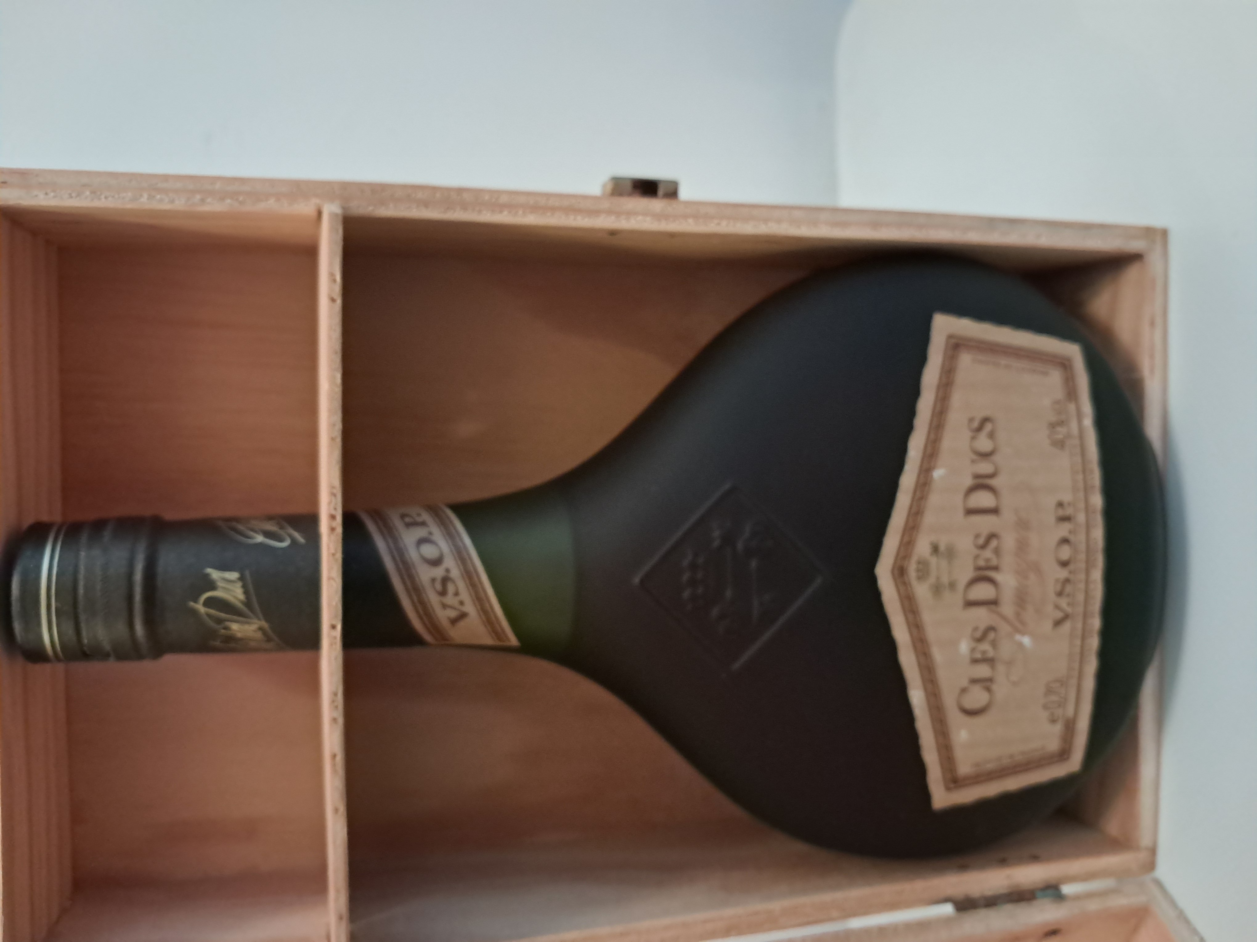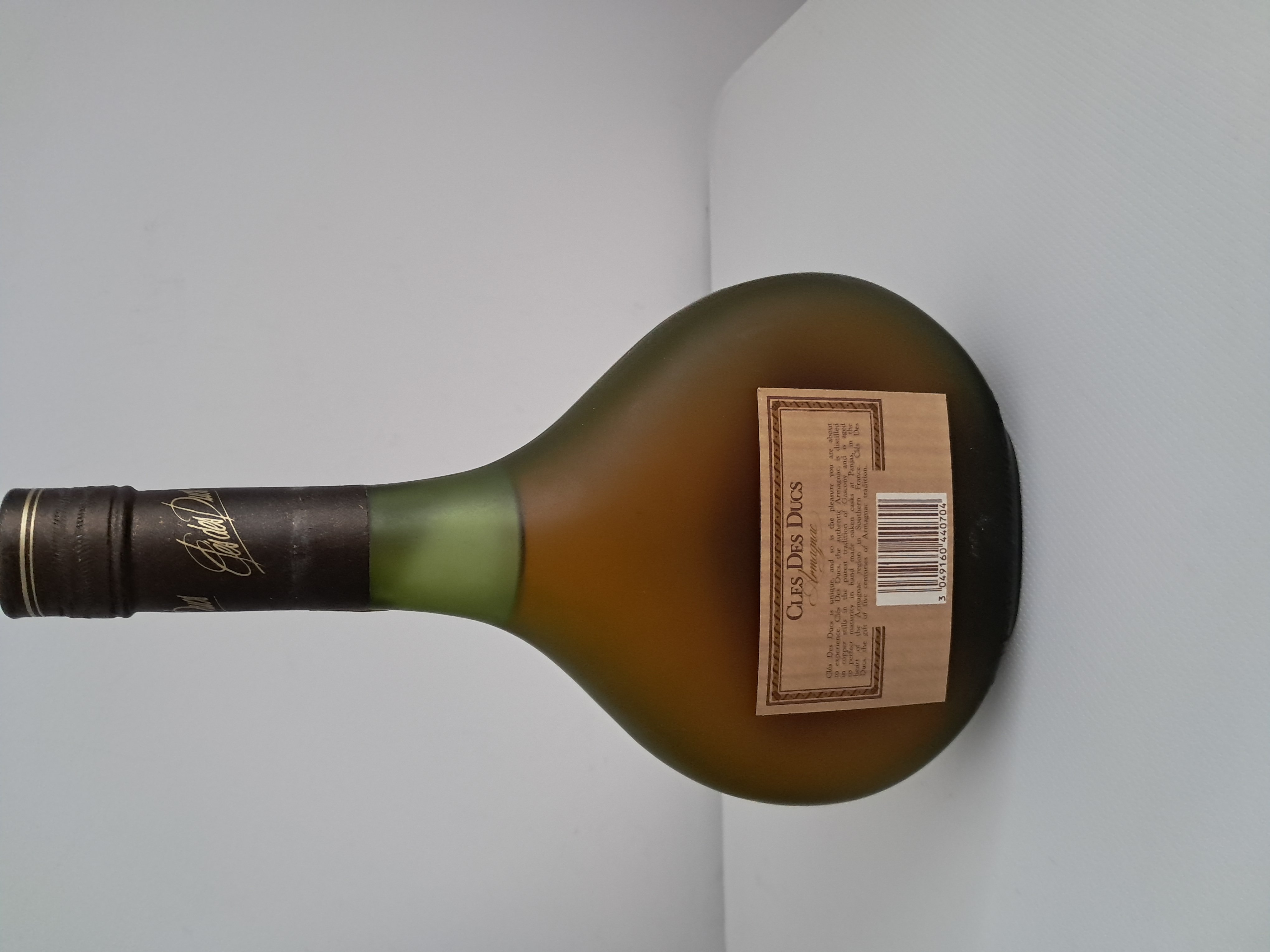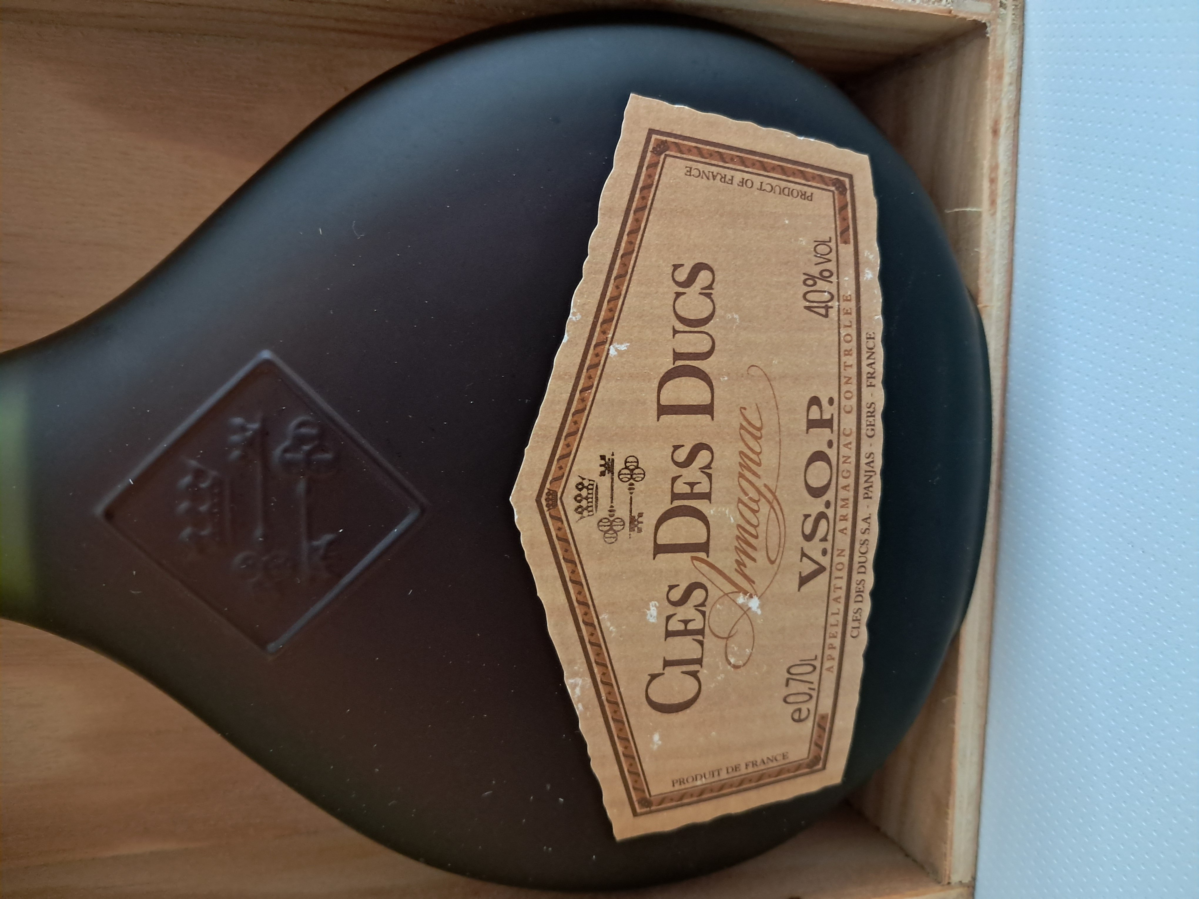 - 1) Text on label: Neck capsule: Clés Des Ducs Neck strip label: V.S.O.P Main label: Clés Des Ducs Armagnac e 0,70l V.S.O.P 40% 2) Visual elements: Neck: A dark green capsule features "Clés Des Ducs" in gold cursive script oriented vertically, topped by two thin gold bands. Below this, a cream-colored strip label with thin horizontal brown stripes displays "V.S.O.P" in brown block letters. Mid-bottle: An embossed diamond-shaped crest, possibly depicting a key, is subtly visible on the dark matte surface of the bottle. Lower label (main label): A roughly shield-shaped, cream-colored label with a decorative brown border. It features a small crown graphic at its top center. Font styles include a decorative serif for "Clés Des Ducs", cursive for "Armagnac", and block/sans-serif for "V.S.O.P", volume ("e 0,70l"), and alcohol percentage ("40%"). 3) Fill level estimate: well above shoulder into neck: great