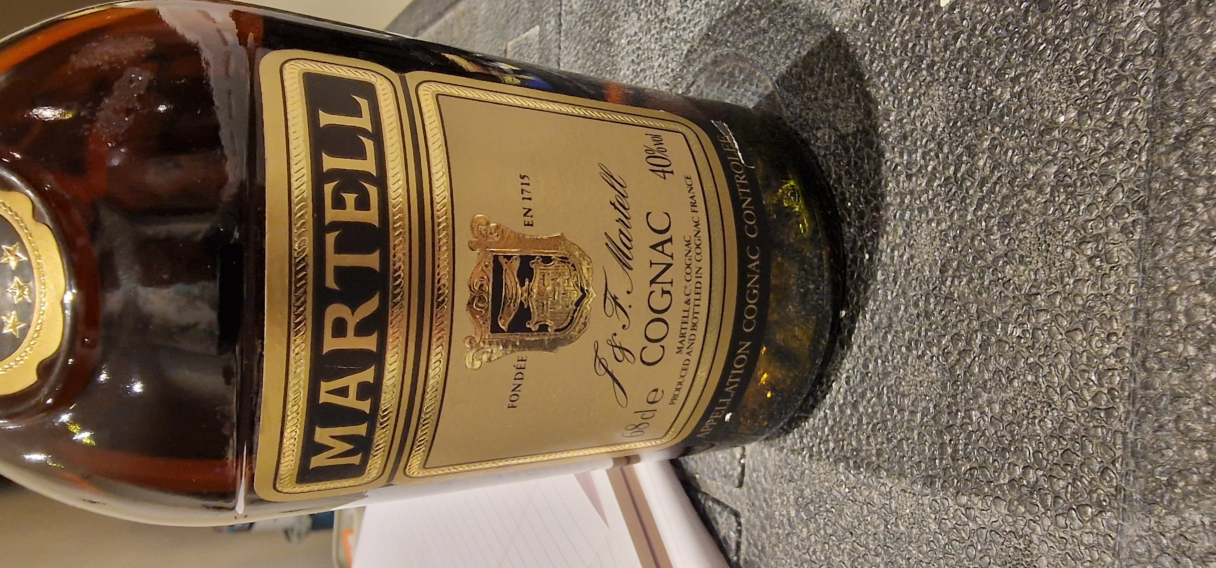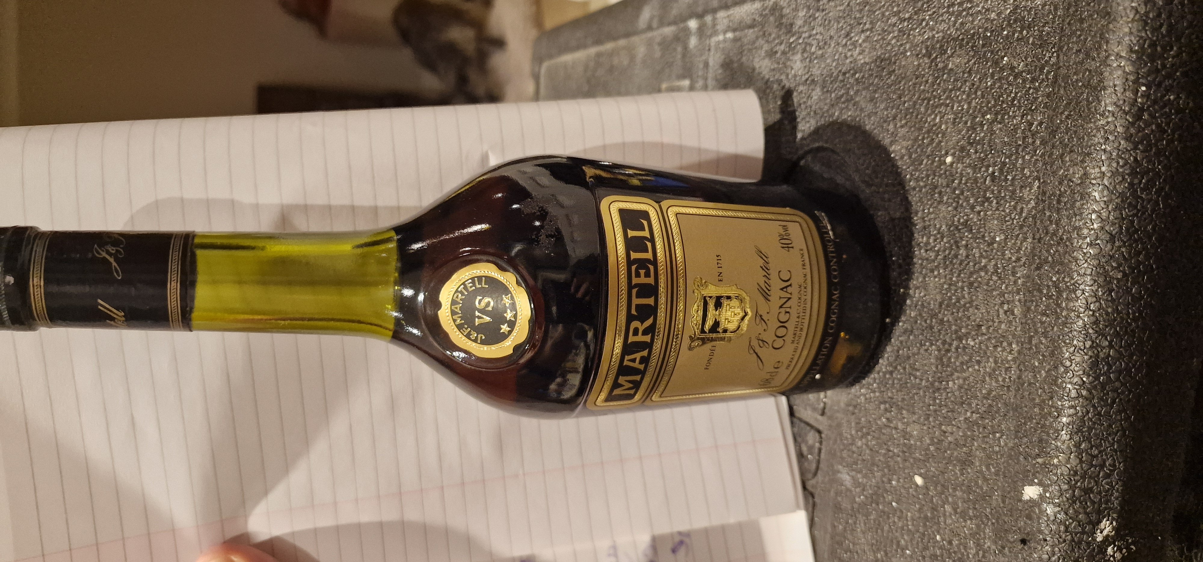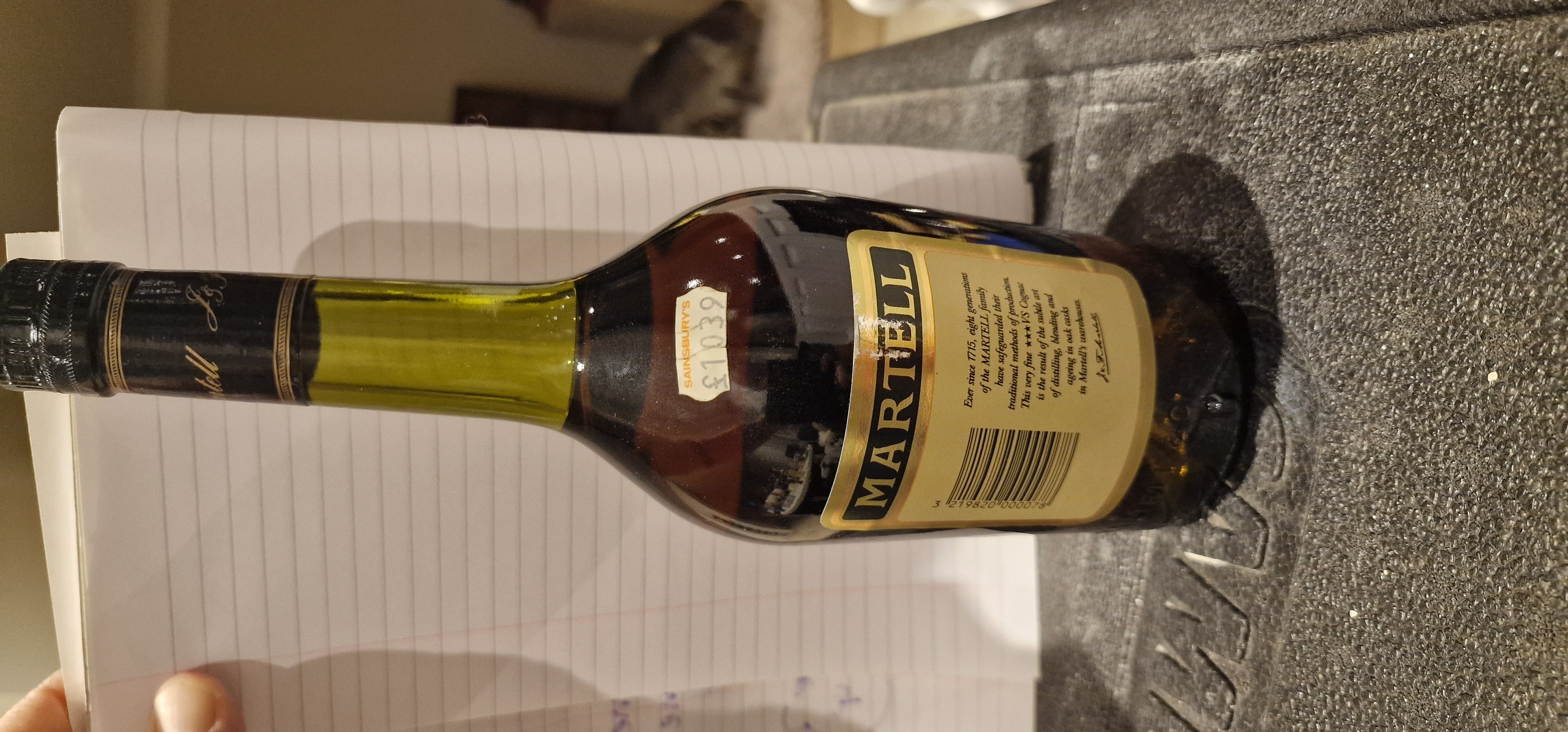 - 1) Text on label: MARTELL V.S MARTELL FONDÉE EN 1715 J. & F. Martell 68cl e COGNAC 40% vol APPELLATION COGNAC CONTROLÉE PRODUCED AND BOTTLED IN COGNAC, FRANCE Martell J & F Ever since 1715, eight generations of the MARTELL family have traditionally guarded their heritage through constant innovation. This very fine ★★★ V.S Cognac is the fruit of their art of distilling, blending and aging the finest 'eaux de vie' in Martell's cellars. J. & F. Martell SAINSBURY'S £10.39 2) Visual elements: Neck/Capsule: A black plastic screw cap and foil capsule, decorated with gold horizontal bands and "Martell J & F" in gold cursive script. The top of the cap features an embossed crest/emblem. Upper label (foil seal): A circular gold and black emblem on the front, featuring a golden star with "V.S" below it, all encircled by "MARTELL". Mid label (front): A gold-colored main label with a prominent black rectangular box containing "MARTELL". Below this, a coat of arms/crest is centrally placed, flanked by "FONDÉE" to the left and "EN 1715" to the right. Lower label (front): Gold background with text "J. & F. Martell COGNAC" and other details. Back label: Gold label featuring a vertical barcode on the left and descriptive text. A white sticker with a price ("SAINSBURY'S £10.39") is affixed to the upper right corner of this label. Font styles: The main brand name "MARTELL" is in a bold, block sans-serif style. "J. & F. Martell" (on both the main label and neck foil) is in a distinctive cursive/script style. "COGNAC" is also in a block sans-serif. Other descriptive texts, such as "FONDÉE," "EN 1715," "APPELLATION COGNAC CONTROLÉE," and the back label text, primarily use a serif font. 3) Fill level estimate: well above shoulder into neck: great Reason: The liquid level is clearly visible well into the lower part of the neck.