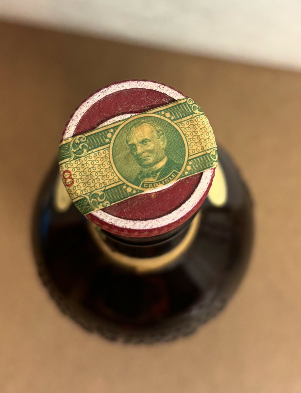 - 1) Text on label: Neck strip (stamped): NOV. 4, 194_ PAID Shoulder Label (oval): THIS WHISKEY IS 6 YEARS OLD Embossed on glass shoulder: A. Overholt REG. U.S. PAT. OFF. Main Front Label: BOTTLED IN BOND Established 4/5 QUART 100 PROOF ~1810~ REG. DIST. No. 3 PA. REG. IN U.S. PAT. OFF. OLD OVERHOLT STRAIGHT RYE WHISKEY DISTILLED BY A. Overholt Co. Inc. BROAD FORD, PA., U.S.A. HAMILTON BANK NOTE NEW YORK Back Label: FEDERAL LAW FORBIDS SALE OR RE-USE OF THIS BOTTLE. 4/5 QUART THIS WHISKEY HAS BEEN FILLED AND STAMPED UNDER THE PROVISIONS OF THE INTERNAL REVENUE LAWS OF THE UNITED STATES, PERMITTING THE BOTTLING OF LIQUOR IN BOND. FEDERAL LAW FORBIDS THE CONTENTS OF THIS BOTTLE WITHOUT DUE STAMPS AFFIXED, AND FORBIDS THE SALE OR RE-USE OF THIS BOTTLE. ALL PERSONS ARE WARNED THAT THE RE-USE OF THE BOTTLE FOR BOTTLING ANY SPIRITUOUS LIQUORS IS A FELONY, PUNISHABLE BY LAW. DISTILLED AND BOTTLED BY A. OVERHOLT CO. INC., BROADFORD, PA. REG. DIST. NO. 3 PA. I.R.B.W. NO. 2 PA. SOLE DISTRIBUTORS NATIONAL DISTILLERS PRODUCTS CORP., NEW YORK, N.Y. Tax strip/capsule (vertical text and top): U.S. INTERNAL REVENUE BONDED WAREHOUSE WHISKEY BOTTLED IN BOND 100 PROOF TAX PAID (On top circle) CARLISLE 2) Visual elements (concise): Neck/Capsule: A green, yellow, and red tax band/capsule seals the cork, featuring a green circular central emblem with a portrait of a man (likely A. Overholt) and "CARLISLE" below it. The green band has a subtle repeating pattern. A small, aged paper strip with a stamped date and "PAID" is also affixed to the neck. Shoulder: The words "A. Overholt" and "REG. U.S. PAT. OFF." are embossed into the glass. A small, separate yellow oval label with a red border prominently displays a large red number "6". Mid label: A rectangular main label with a vintage beige background and an ornate black border. It features a large central oval portrait of a man, framed by laurel leaves. A red banner across the top reads "BOTTLED IN BOND". To the left and right of the portrait are decorative elements: "Established" on a ribbon-like banner and "~1810~". Font styles: The labels utilize a mix of serif fonts (e.g., "OLD", "STRAIGHT RYE", "WHISKEY"), sans-serif fonts (e.g., "BOTTLED IN BOND", "4/5 QUART", "100 PROOF"), and a distinctive decorative/script font for "OVERHOLT" on the main label and for "Established" and "A. Overholt Co. Inc.". 3) Fill level estimate: below shoulder, not great, ok