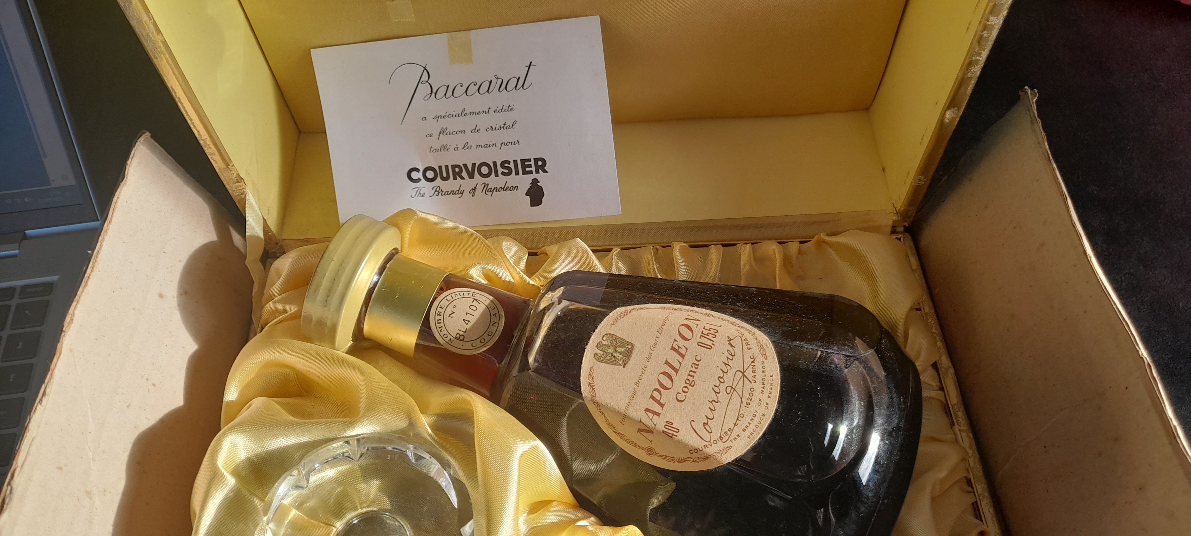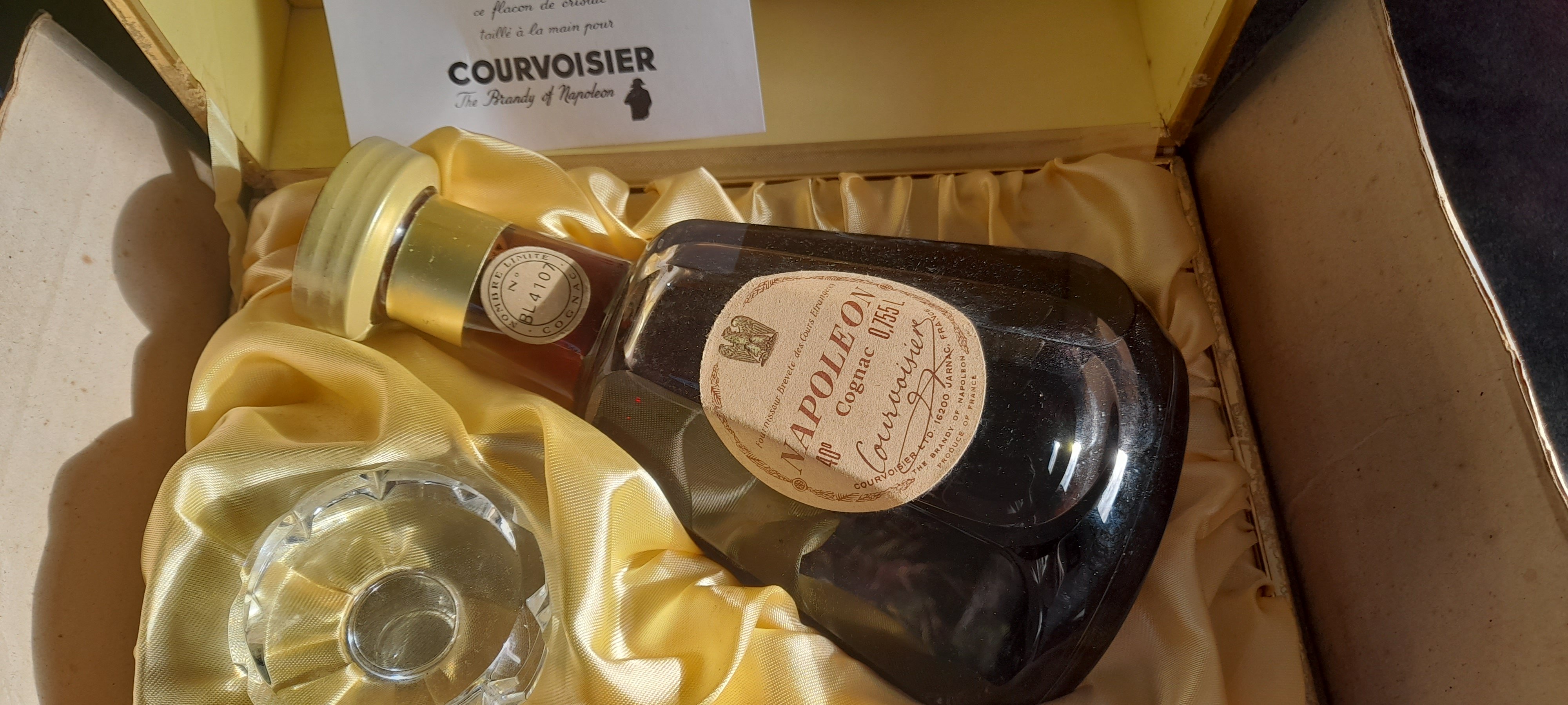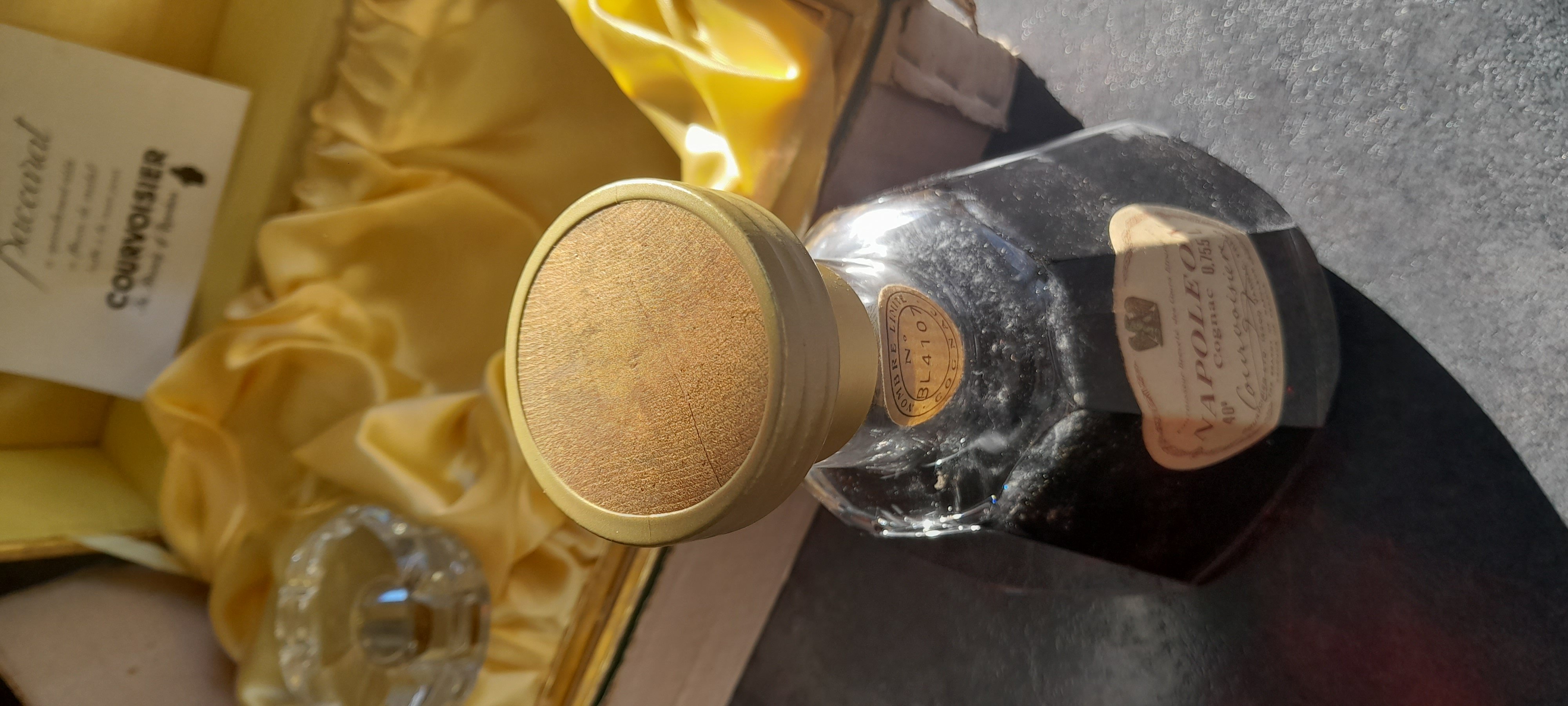 - 1) Text on label: Main Label (oval): NAPOLEON 40° Cognac Courvoisier 0,755 L COURVOISIER LTD. 16200 JARNAC. FRANCE. THE BRANDY OF NAPOLEON. PRODUCE OF FRANCE. Neck Label (small circular): SÉRIE LIMITÉE N° BL4107 COGNAC Box Lid Card (partial): ce flacon taillé à la main pour COURVOISIER The Brandy of Napoleon 2) Visual elements: Main Label: A cream-colored oval label with a decorative, patterned embossed border. At the top center, there's a crest-like emblem depicting a stylized bunch of grapes or a vine. Font styles: "NAPOLEON" in large, bold sans-serif. "Cognac" in a smaller serif font. "Courvoisier" in a prominent, elegant cursive/script font. The circular text is in a small, all-caps sans-serif font. Neck Label: A bright gold foil band wraps around the neck. A small circular cream label with a thin red border is affixed to this band. Font styles: "SÉRIE LIMITÉE", "N°", "BL4107", and "COGNAC" are all in sans-serif fonts, with "BL4107" being the most prominent. Box Lid Card: Features a black silhouette graphic of Napoleon's figure. Font styles: "COURVOISIER" is in a large, bold sans-serif. "The Brandy of Napoleon" is in a smaller, elegant script. The French text above it is in a standard serif font. 3) Fill level estimate: well above shoulder into neck: great