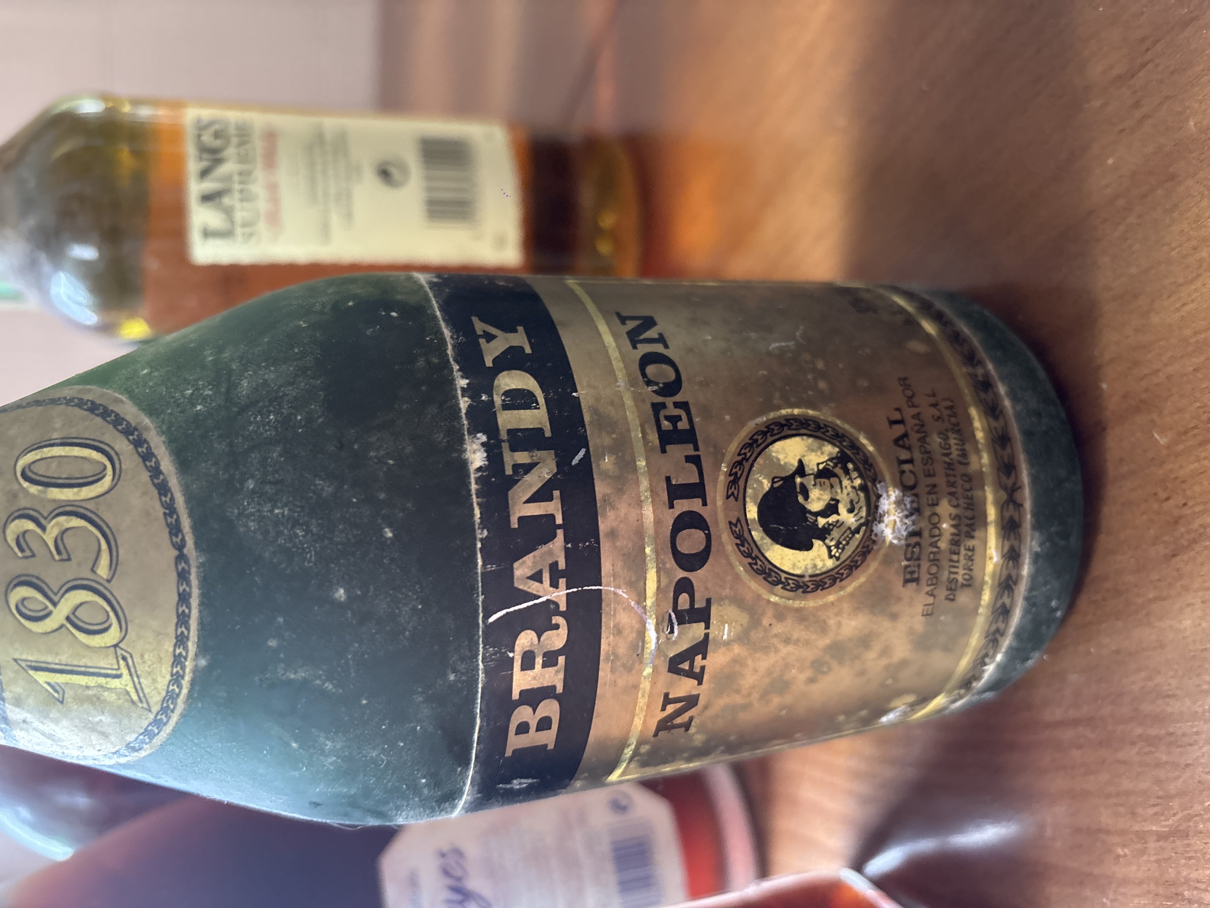 - 1) Text on label: d CARTHAGO 1830 BRANDY NAPOLEON ESPECIAL ELABORADO EN ESPAÑA POR DESTILERIAS CARTHAGO, S.A.L. TORRE PACHECO (MURCIA) 37% Vol N. E. 4148/MU 2) Visual elements: Neck: Stylized 'd' emblem and "CARTHAGO" text in gold on a dark green capsule. Upper label: A prominent "1830" in a decorative serif font, framed by a gold ornamental border. Mid label: "BRANDY" and "NAPOLEON" in large, bold serif fonts. Lower label: A circular medallion depicting a figure in a bicorne hat (likely Napoleon), surrounded by a gold wreath. Below the distillery information, there is a repeating gold ornamental pattern. Apparent font style(s): Sans-serif (for neck and small print), decorative serif (for "1830"), and bold serif (for "BRANDY", "NAPOLEON"). 3) Fill level estimate: above shoulder: good Reason: healthy air gap