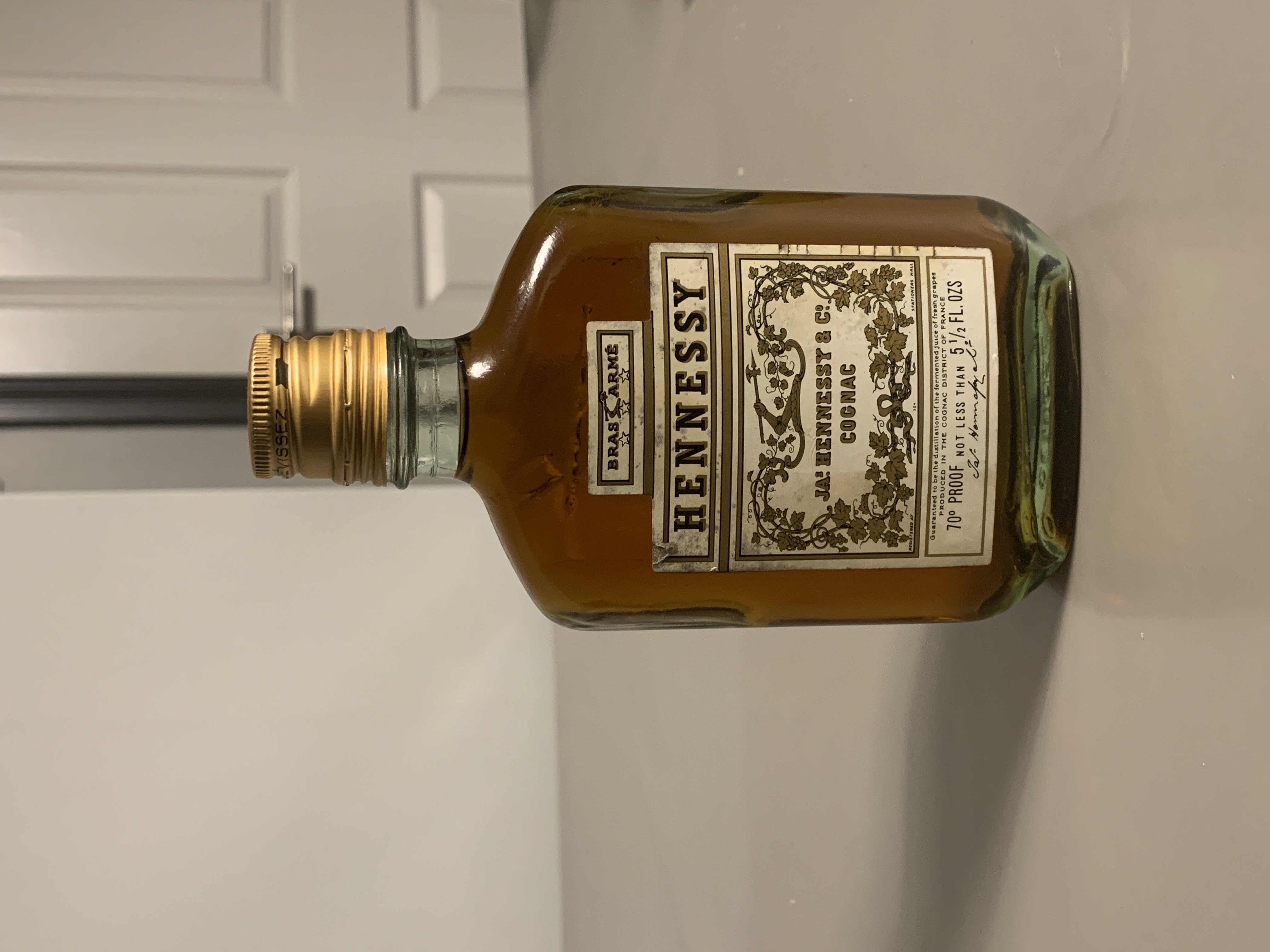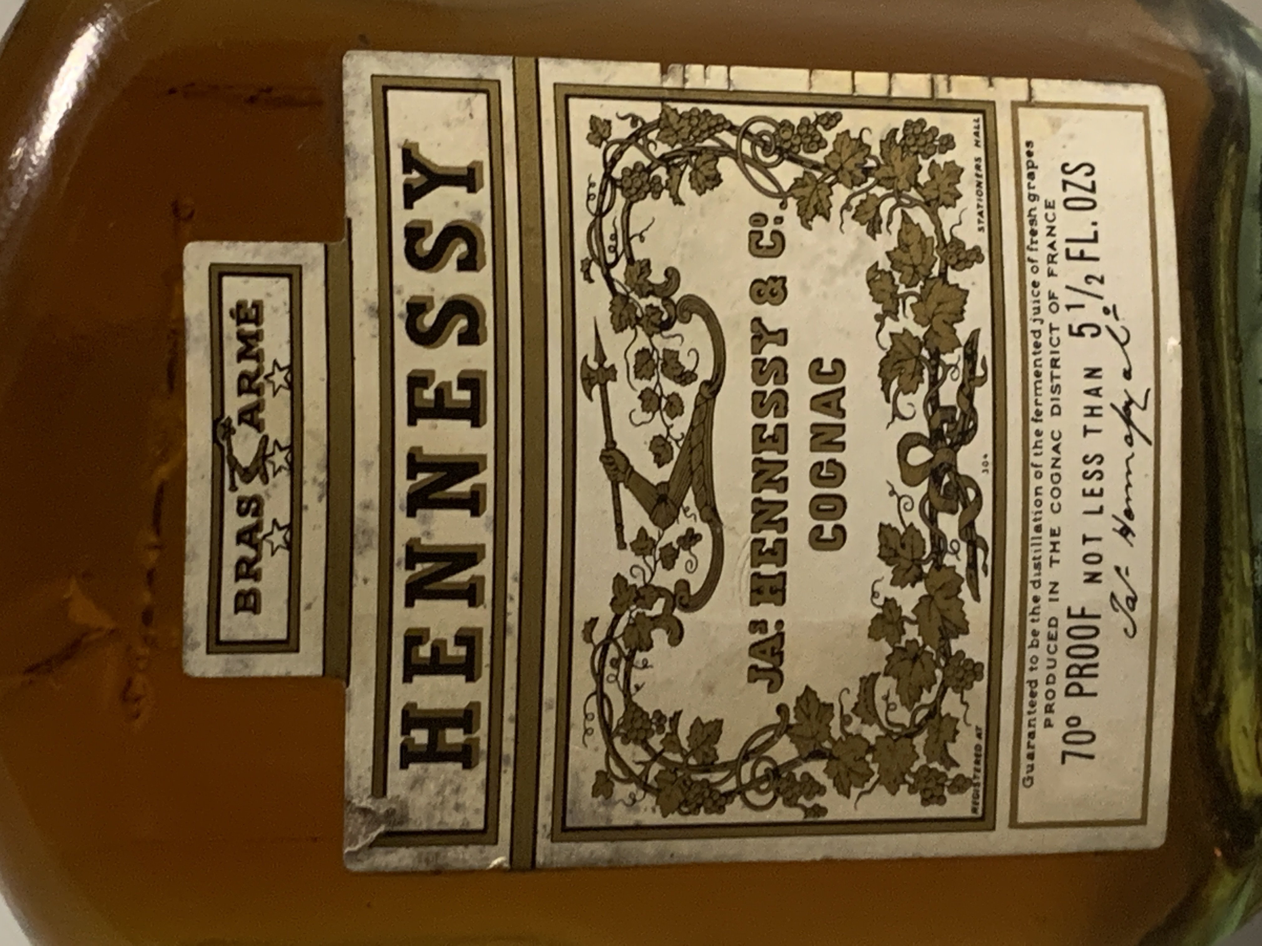 - Bras arme Hennessy Ja Hennessy & co Cognac Guaranteed to be the distillation of the fermented juice of fresh grapes produced in the cognac district of France 70 proof not less than 5 1/2 fl. ozs