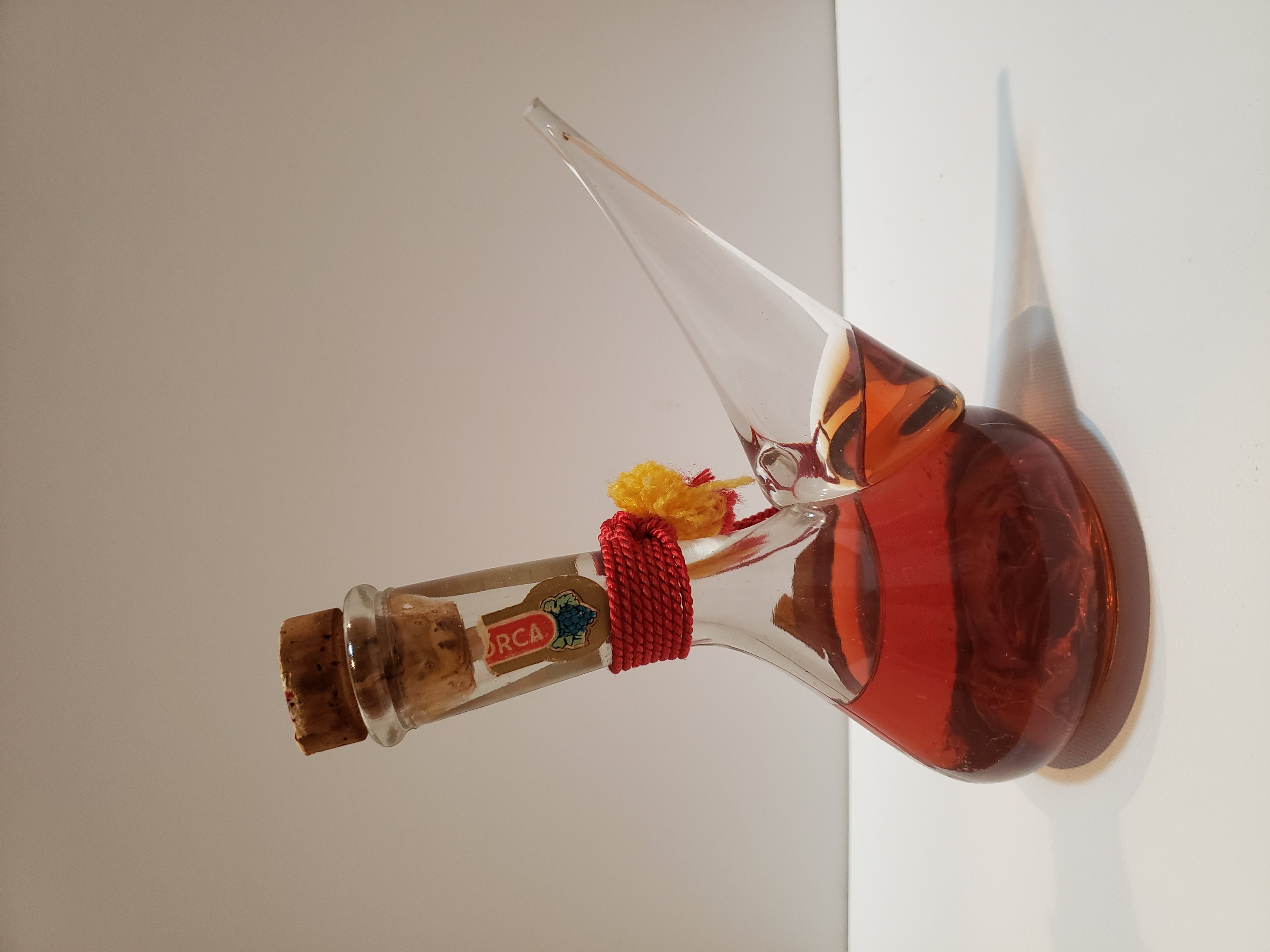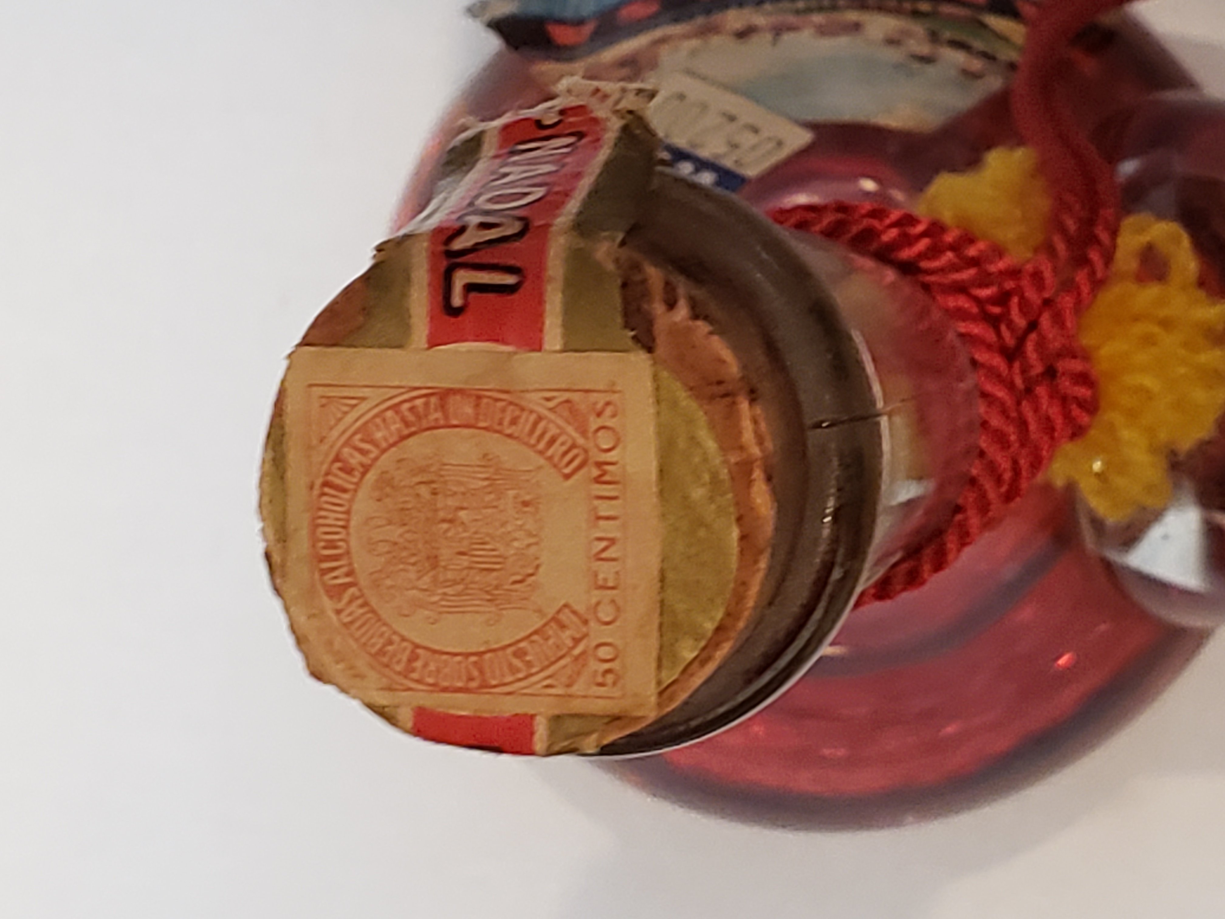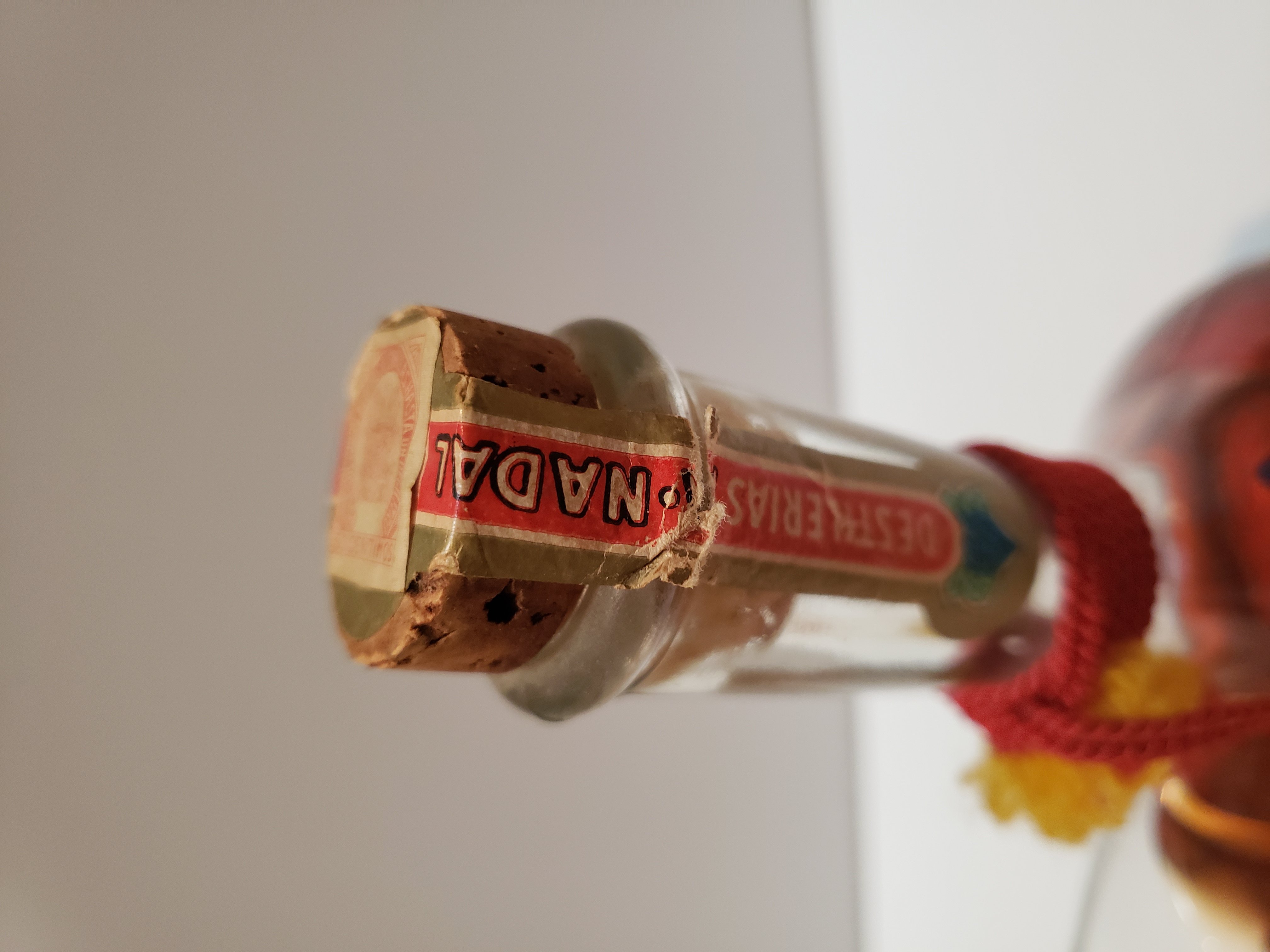 - I found this bottle when dealing with a friend's estate. I believe it may have come from Spain in the late 60s or early 70s. Her parents imported some hand carved wood furniture from Spain in that time frame. The cork is dry and broken, but I don't think it has ever been removed. Glass stem is sealed.