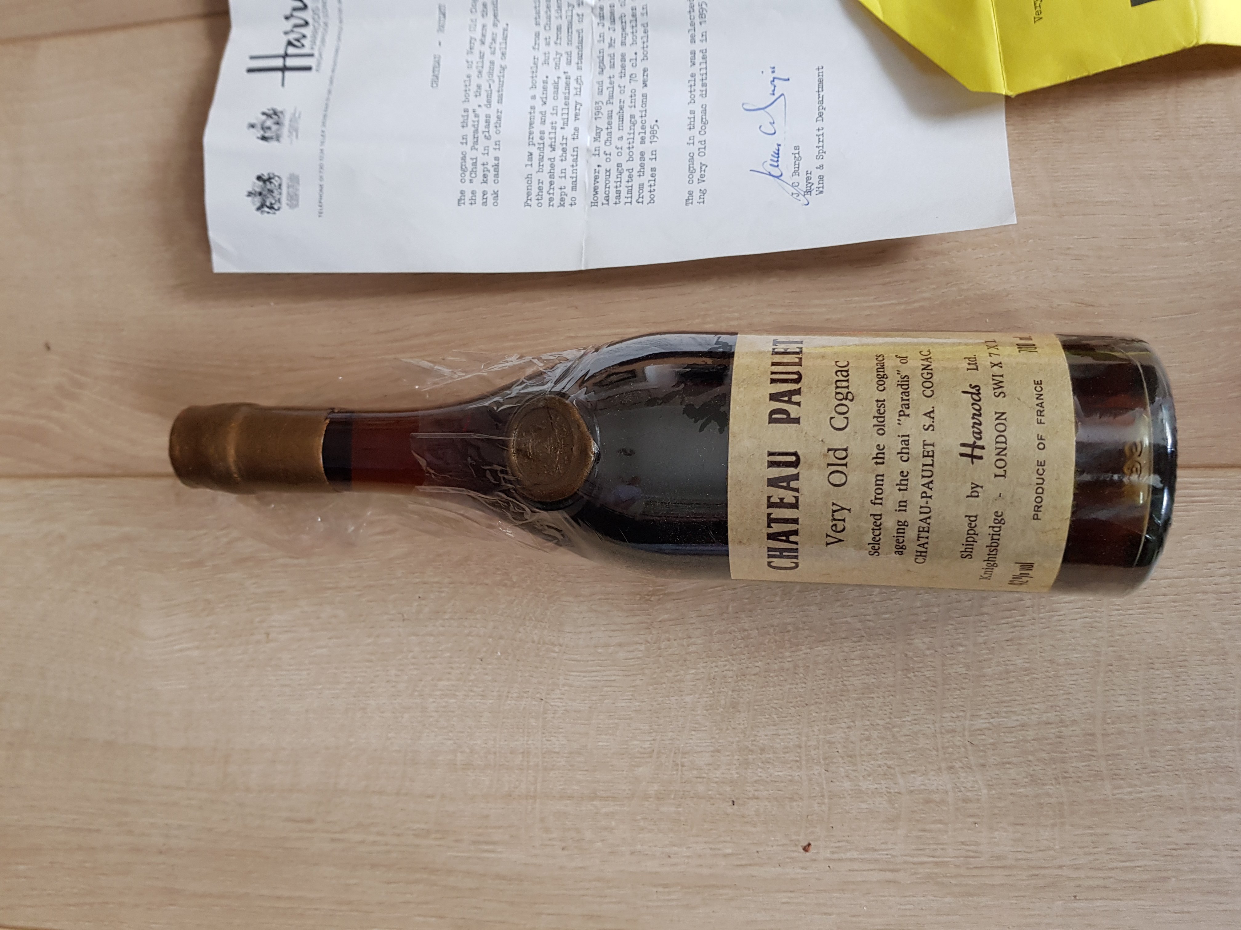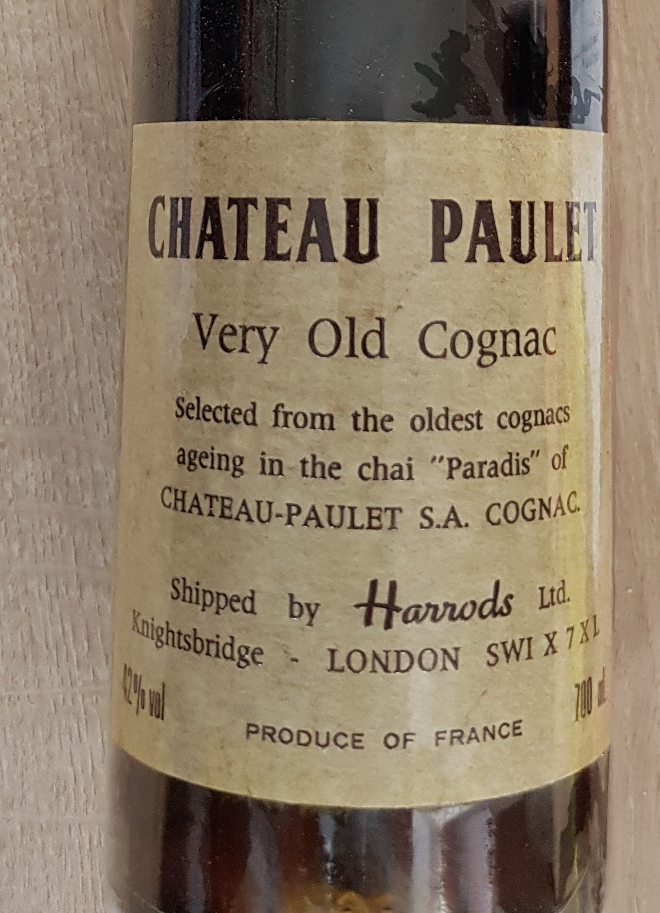 - 1895 label on box lid Sold by Harrods Chateau Paulet Very Old Cognac