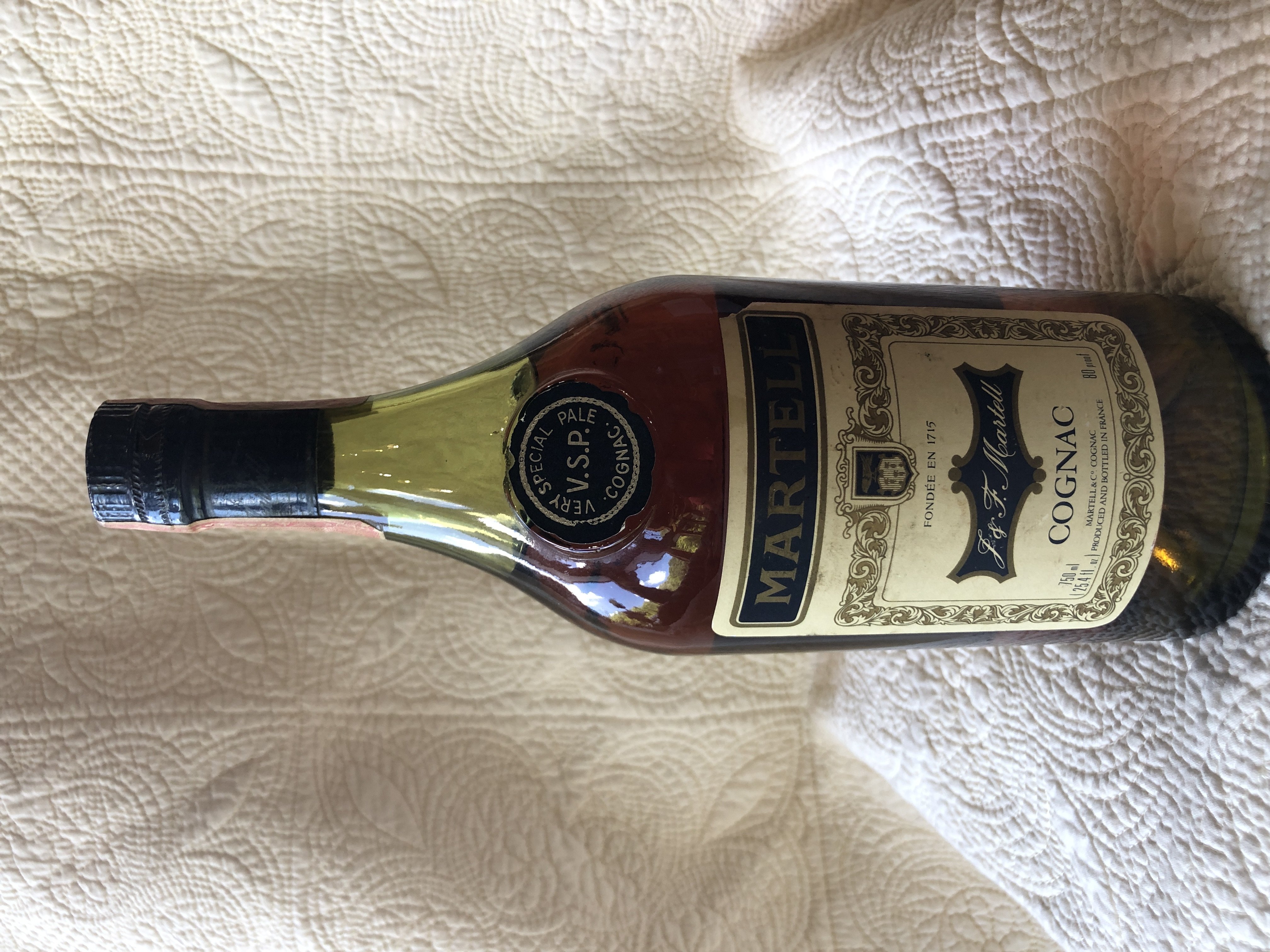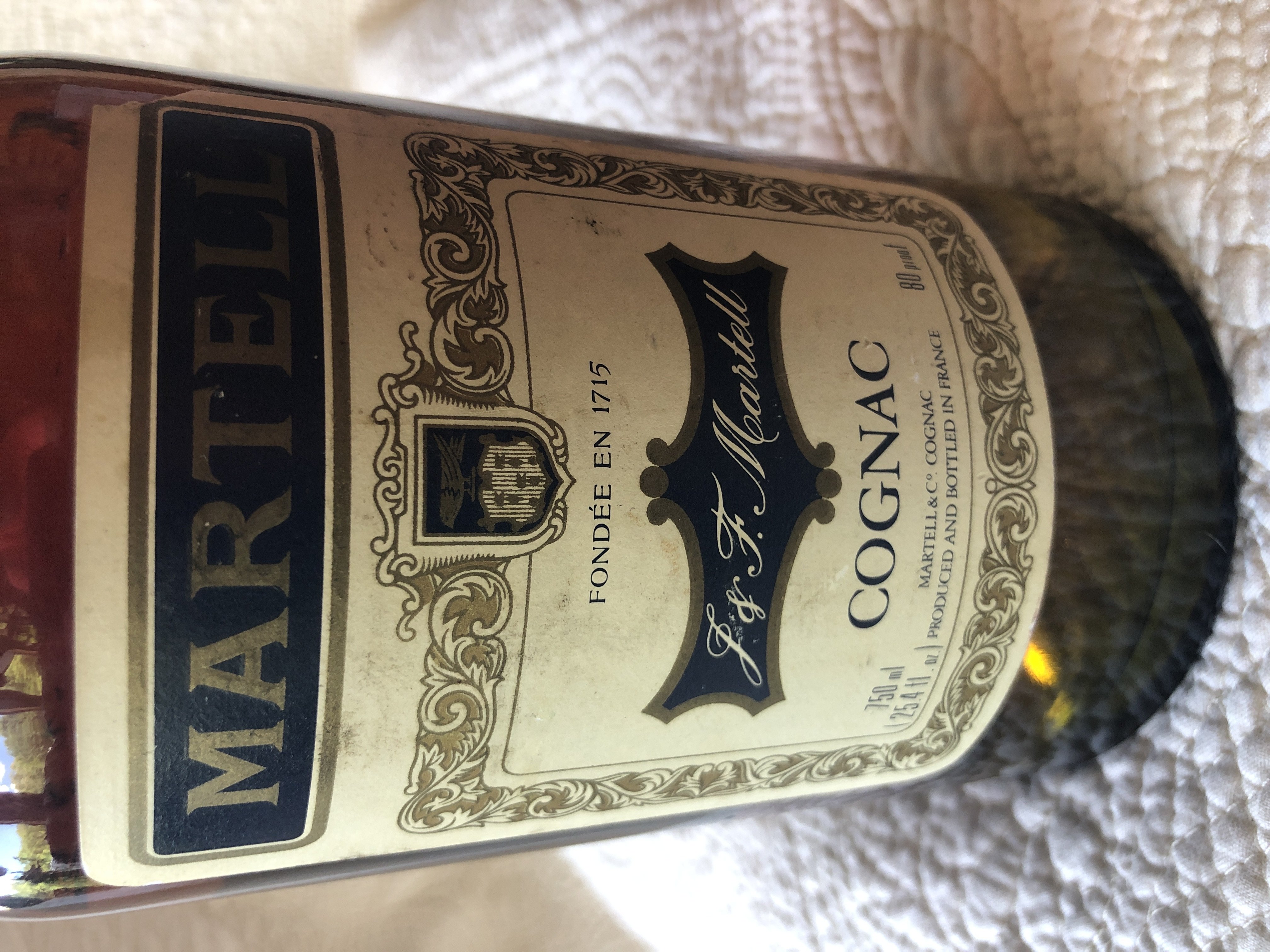 - MARTELL, very fine liqueur cognac brandy J & F Martell Cognac Argent then signature under 4/5 Quart. Cognac - France. 80 proof Product of France Produced and bottled in Cognac (France) Sole distributors for the U.S.A. The Jos. Garneau Co. New York, N.Y.