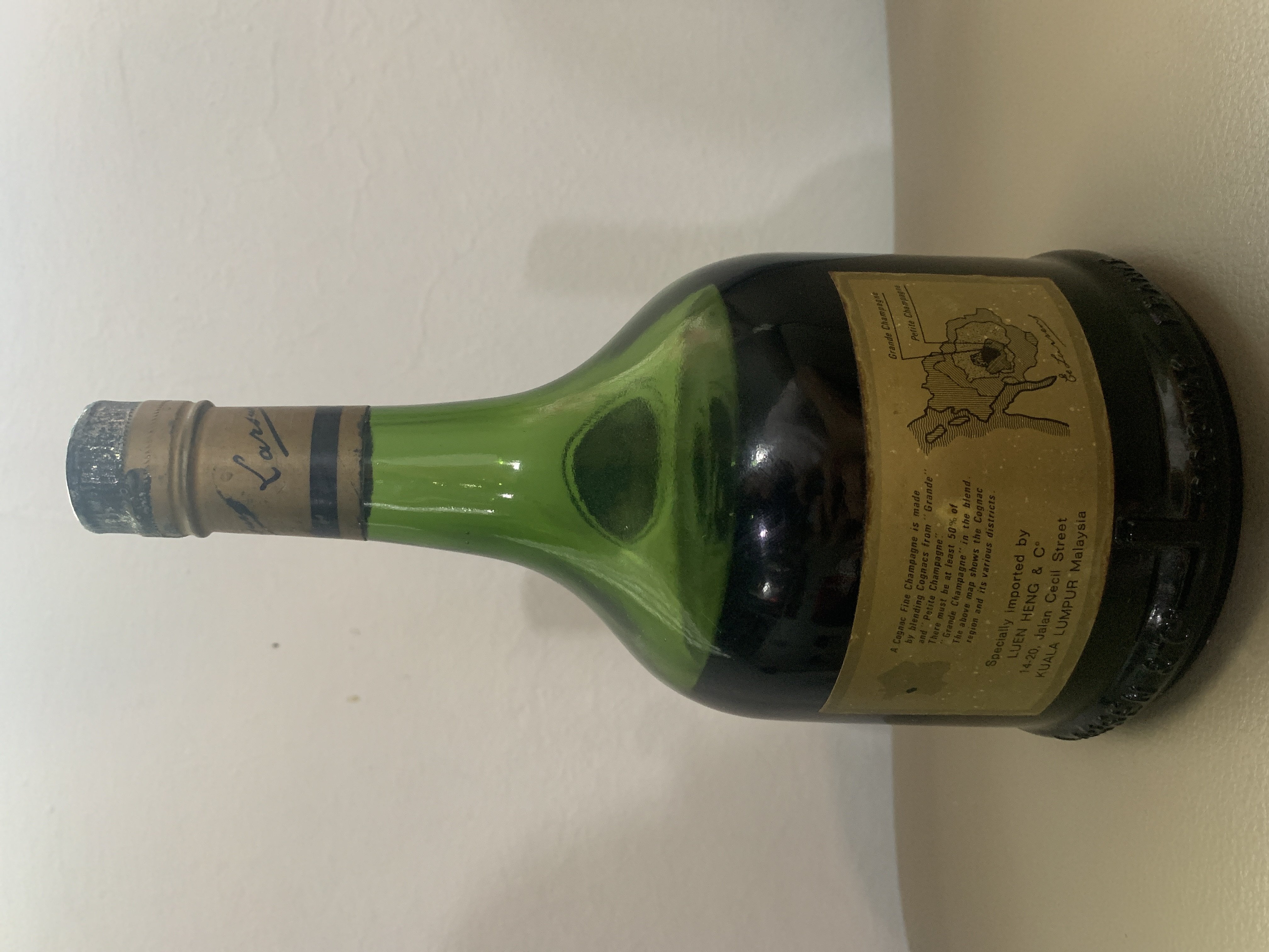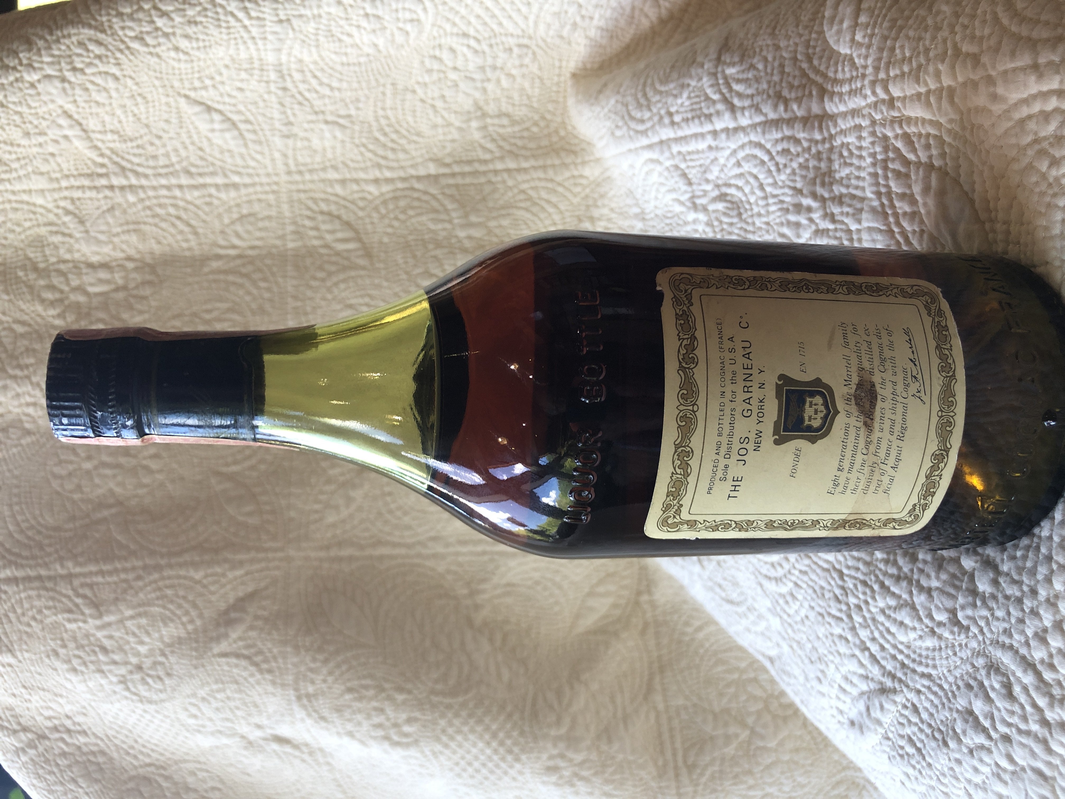 - J&F Martell….FONDEE EN 1715….Eight generations of the Martell family have maintained the finest quality for their fine Cognac Brar dies distilled exclusively from wines of the Cognac district of France and shipped with the official Acquit Regional Cognac. (signed: J & F Martell