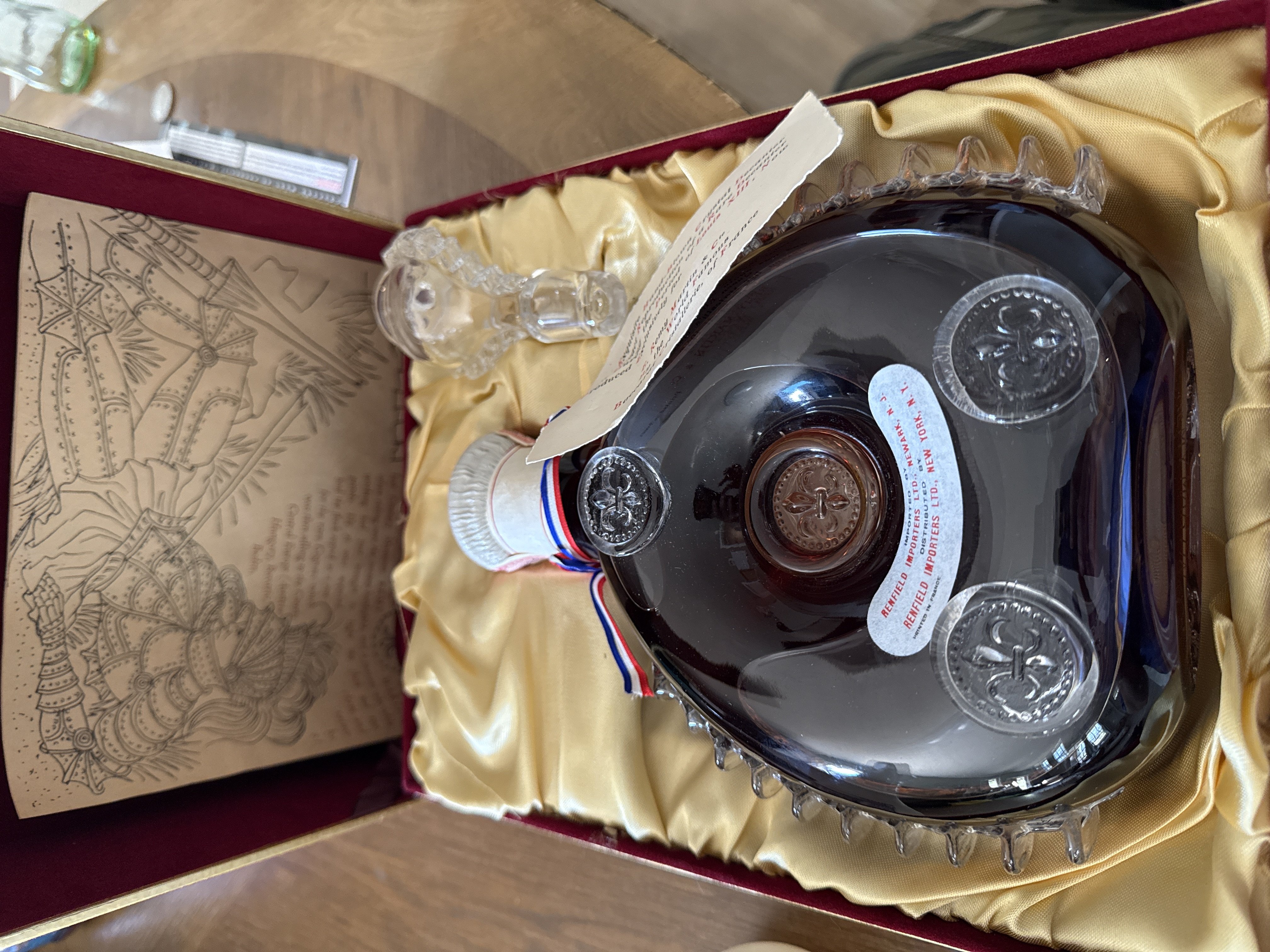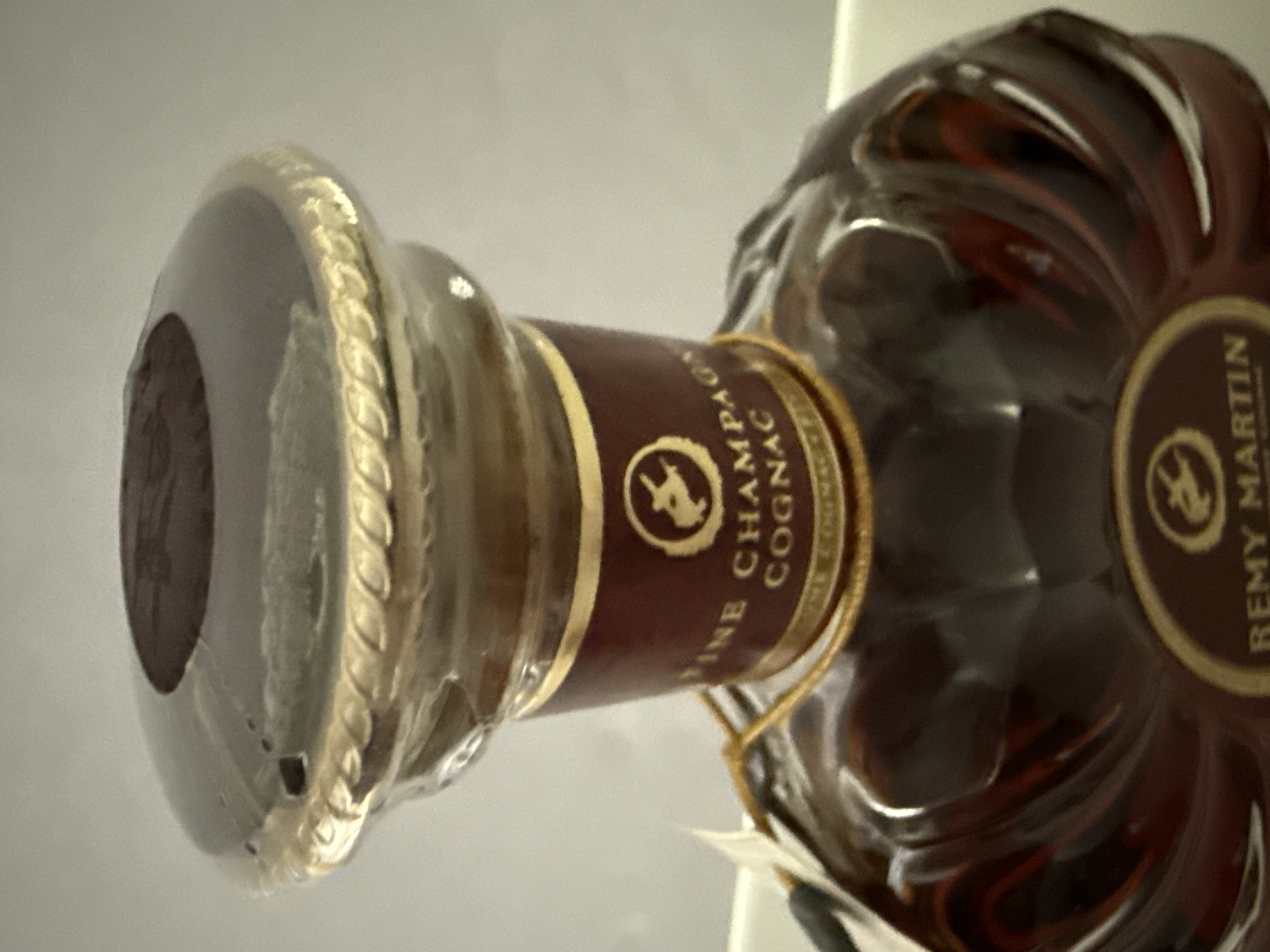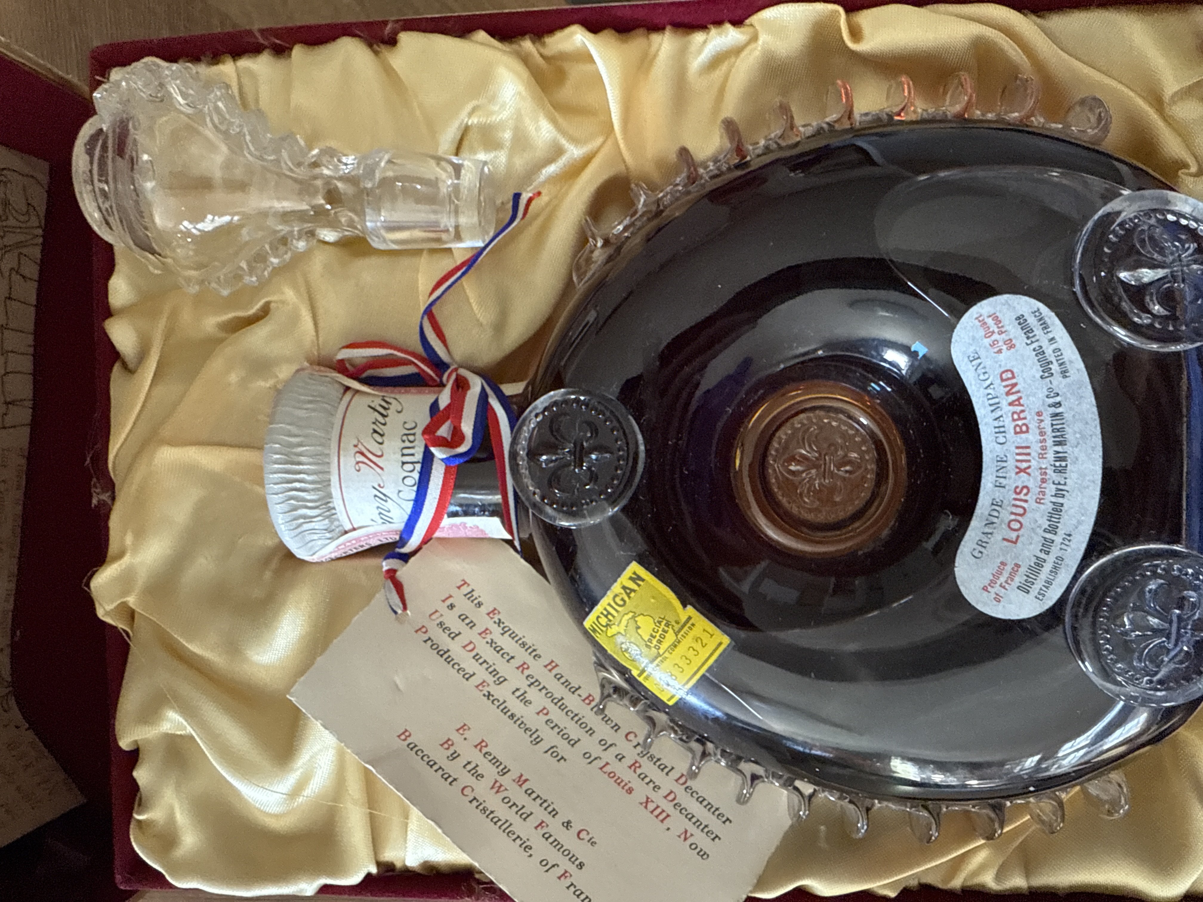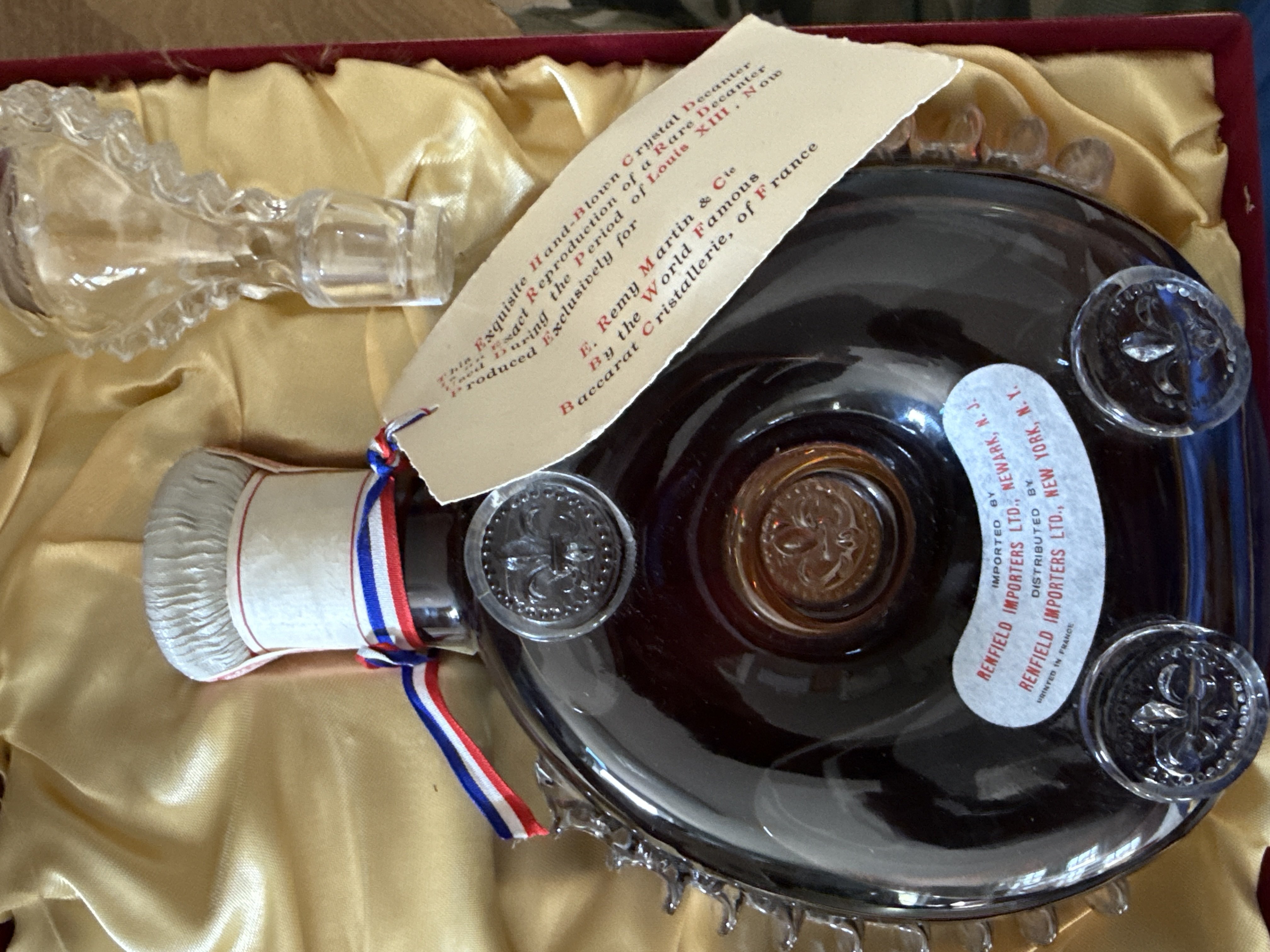 - 1) Text on label: Mid Label (curved white label): IMPORTED BY RENFIELD IMPORTERS LTD., NEWARK, N. J. DISTRIBUTED BY RENFIELD IMPORTERS LTD., NEW YORK, N. Y. PRINTED IN FRANCE Hang Tag (white tag attached to neck - visible sections, line breaks as seen): This decanter is an exact replica of a flask dug up near Cognac, buried with the French soldiers who fought in 1569 with the armies of the Duke of ANJOU, brother of King CHARLES IX. The Royalist Catholic Army was victorious over the Protestant forces of HENRI III, The Prince of CONDE. Another member of the royal family, the Prince of CONDE, was one of the Huguenot leaders. The Cognac soldiers had their flask of Cognac buried with them on the battlefield. Hang tag (attached with tricolor ribbon): This exquisite hand-blown Crystal Decanter is an exact reproduction of the original flask used by the French soldiers in the 16th Century. Produced exclusively for Rémy Martin & Cie for their world famous LOUIS XIII by Baccarat Cristallerie de France 2) Visual elements: Bottle: Features a distinct scalloped, ribbed body with an embossed fleur-de-lis emblem centrally on the mid-bottle and four smaller embossed fleur-de-lis emblems around the lower body. Neck: Adorned with a red, white, and blue ribbon tied in a bow. Stopper: A separate, clear glass stopper with a sculpted, possibly fleur-de-lis or crown, design is present in the box. Box: Lined with red velvet on the exterior and gold satin on the interior. Box lid (interior): Displays an intricate, detailed line drawing, appearing to be a historical or heraldic motif (possibly a king in armor). Fonts: The mid-label uses a combination of sans-serif and bold block sans-serif fonts. The hang tag primarily uses a sans-serif font. 3) Fill level estimate: well above shoulder into neck: great