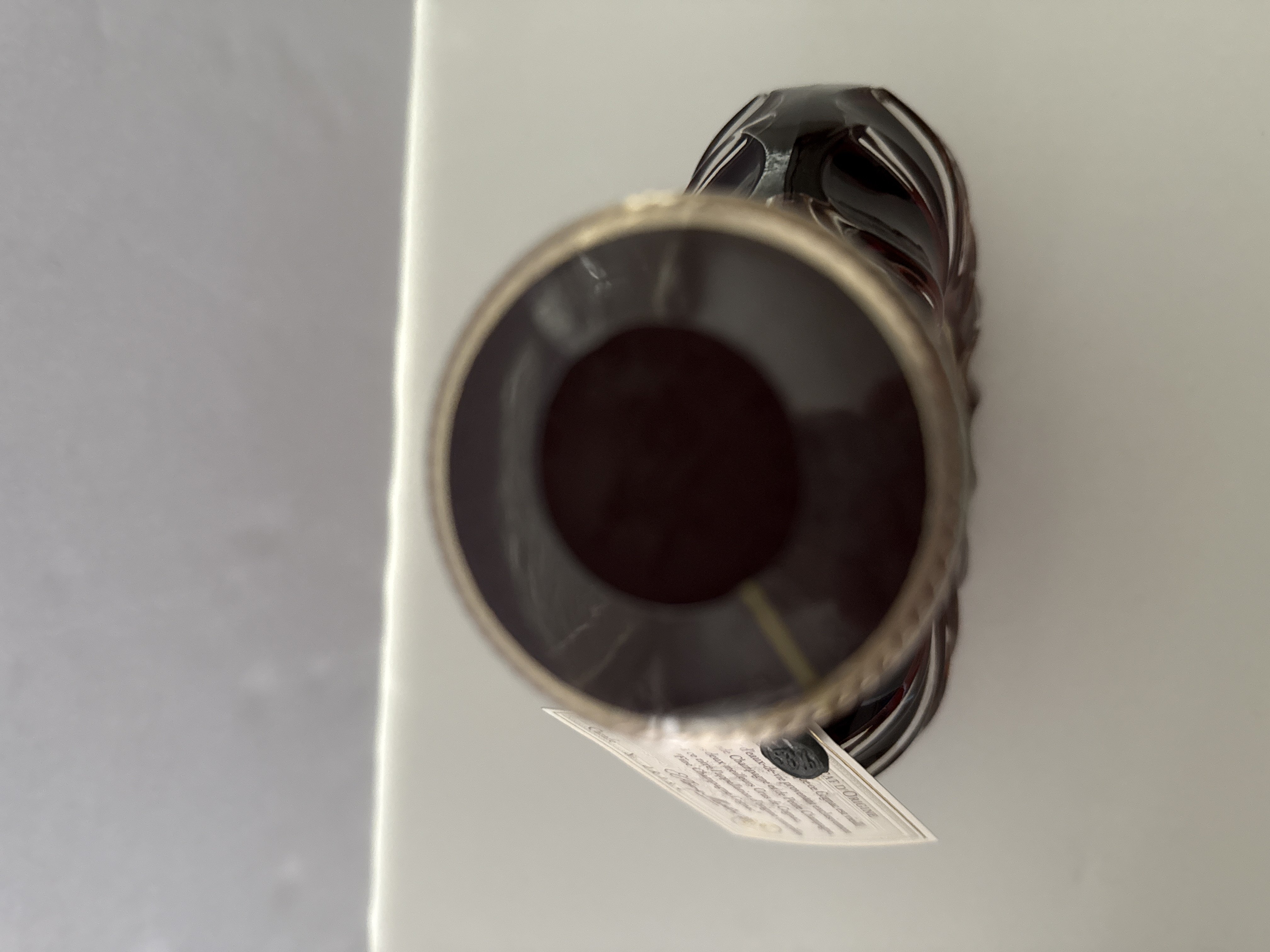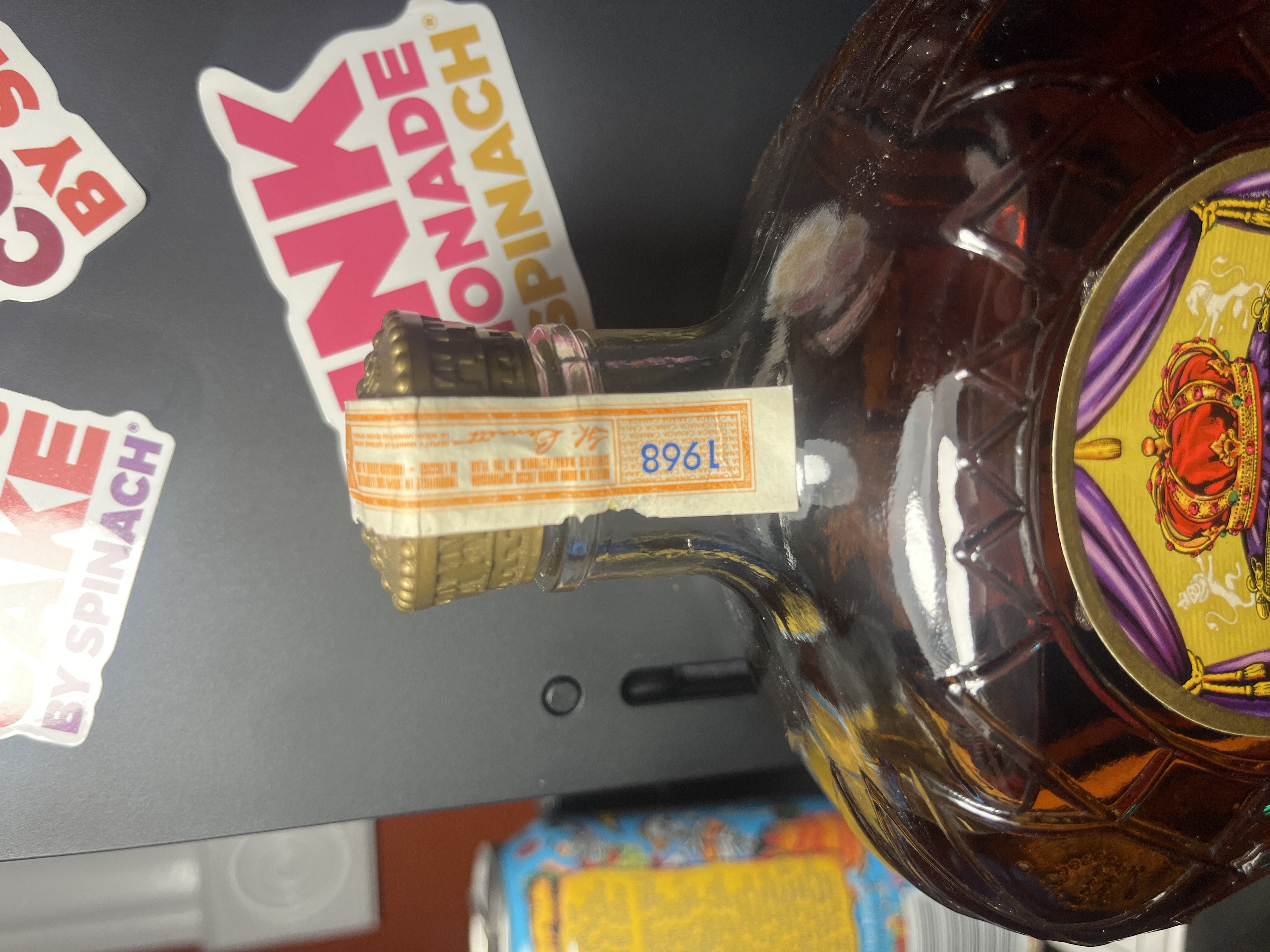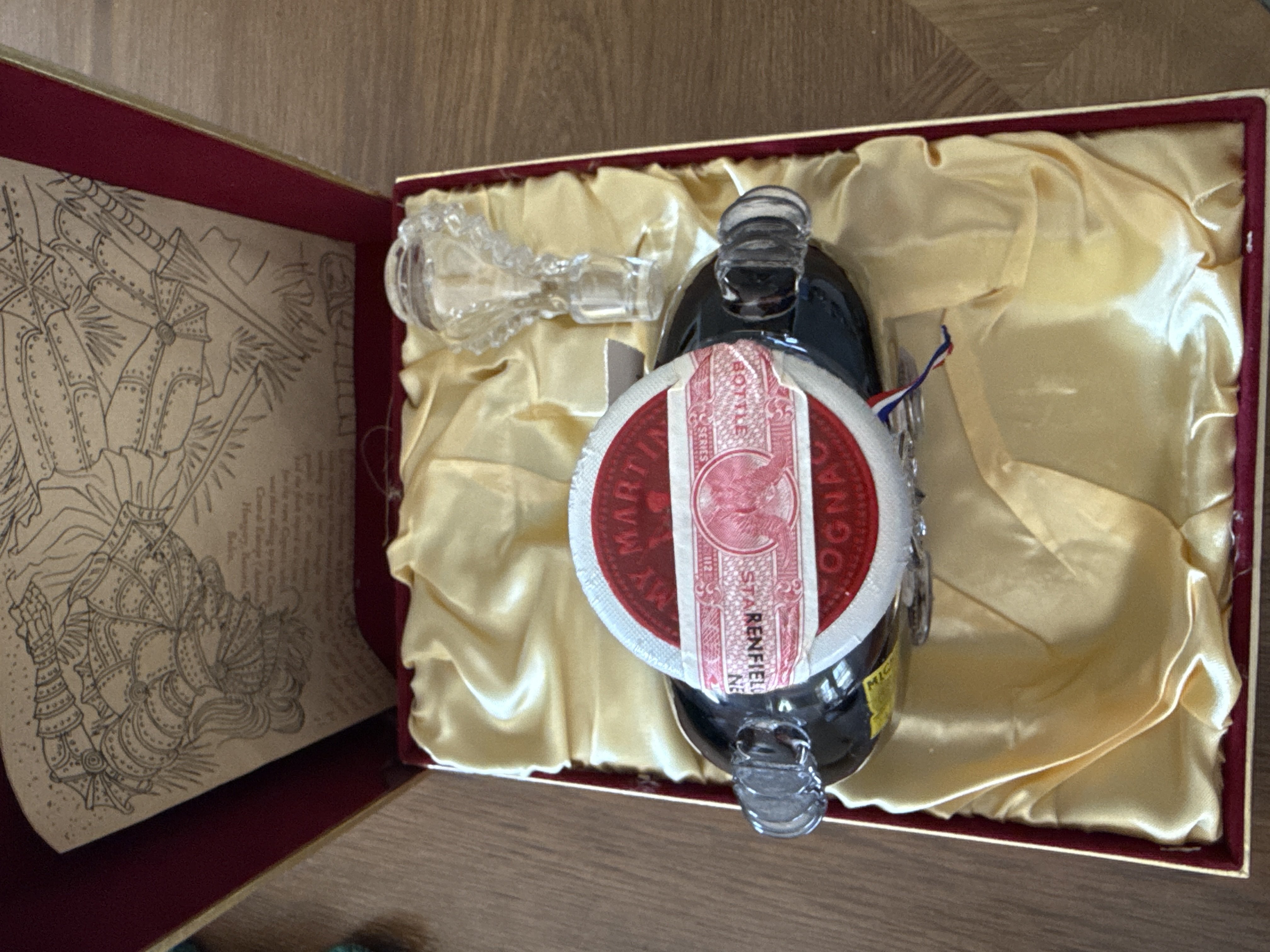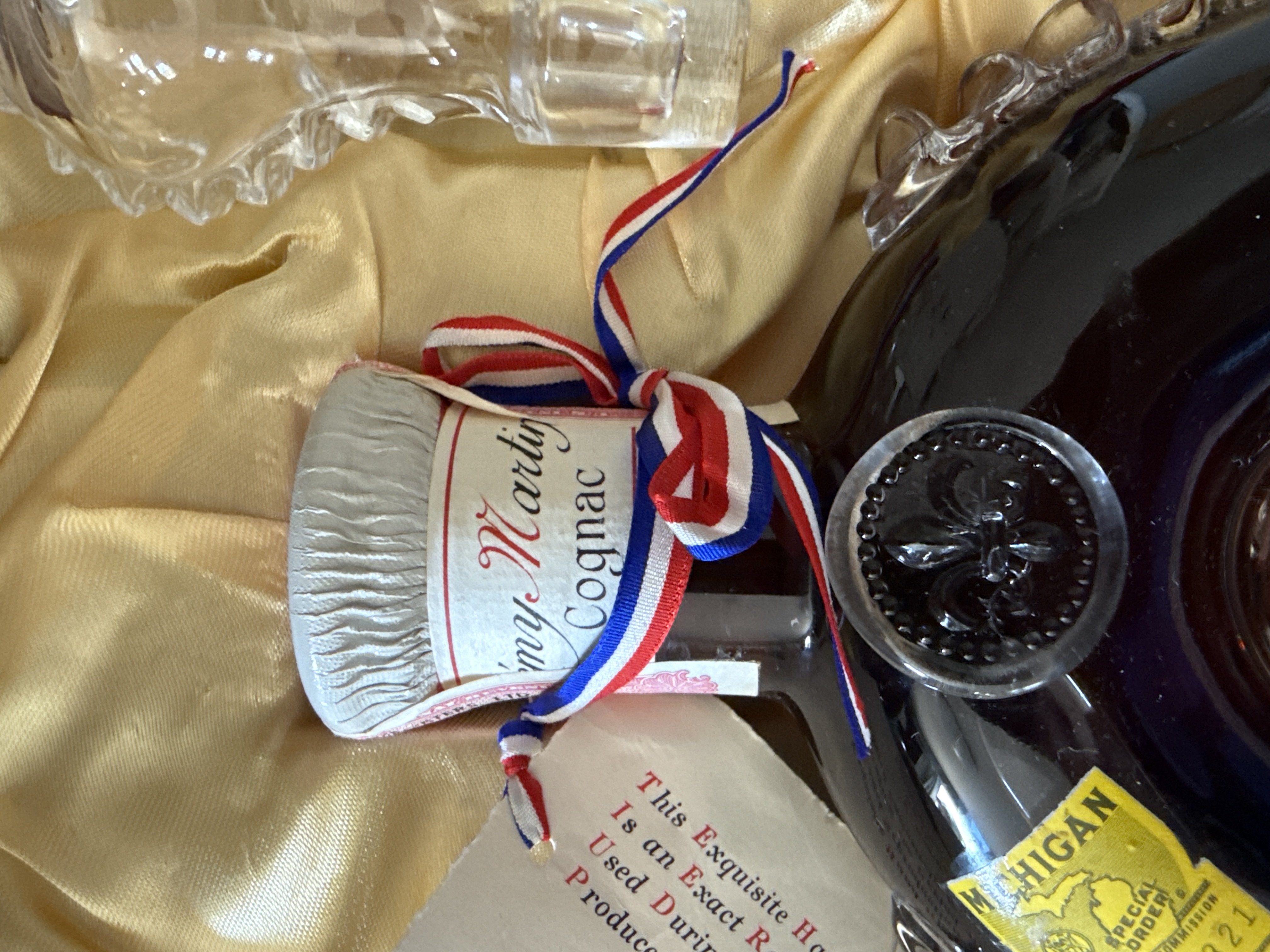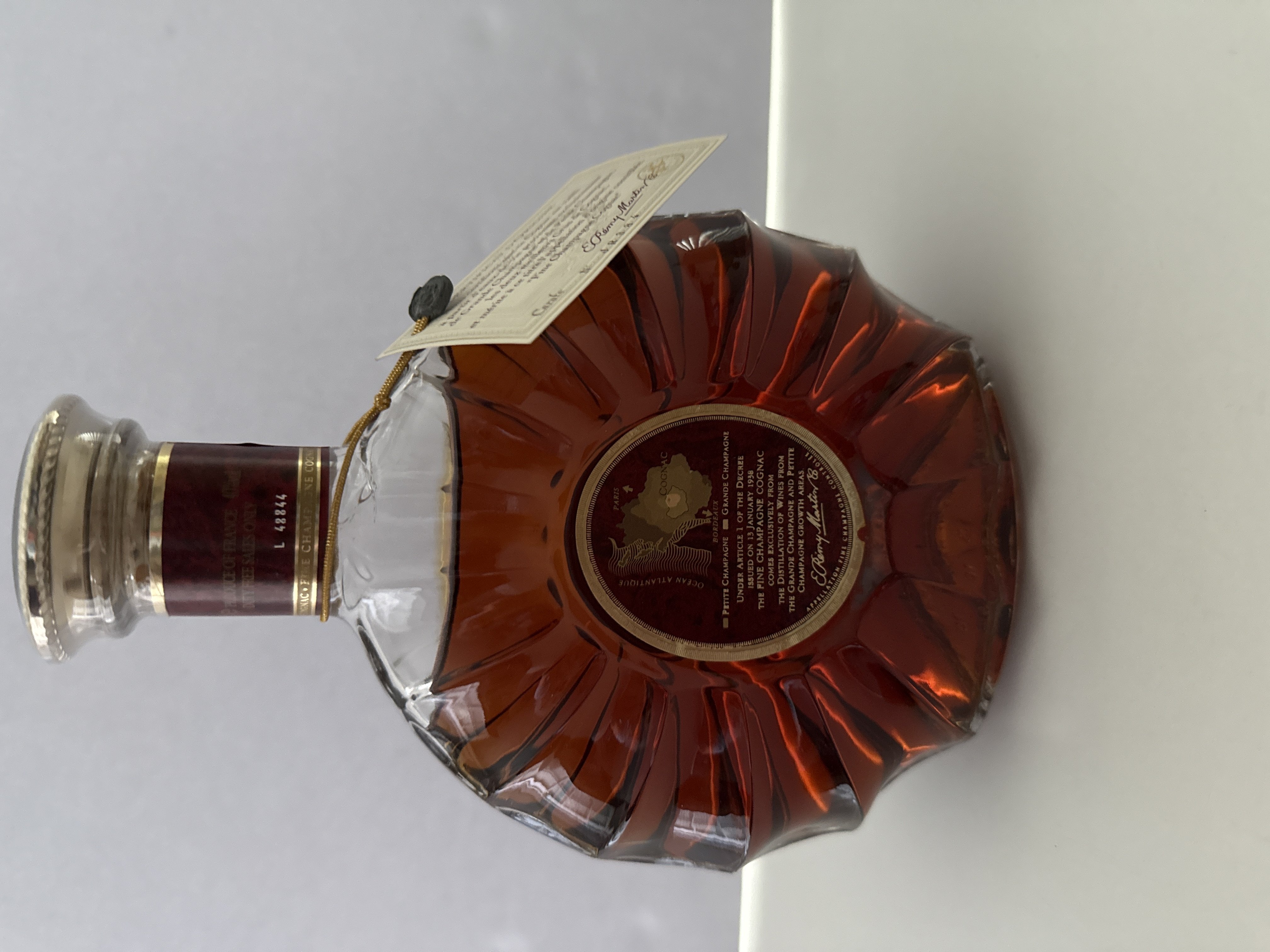 - 1) Text on label: Mid Label (curved white label): IMPORTED BY RENFIELD IMPORTERS LTD., NEWARK, N. J. DISTRIBUTED BY RENFIELD IMPORTERS LTD., NEW YORK, N. Y. PRINTED IN FRANCE Hang Tag (white tag attached to neck - visible sections, line breaks as seen): This decanter is an exact replica of a flask dug up near Cognac, buried with the French soldiers who fought in 1569 with the armies of the Duke of ANJOU, brother of King CHARLES IX. The Royalist Catholic Army was victorious over the Protestant forces of HENRI III, The Prince of CONDE. Another member of the royal family, the Prince of CONDE, was one of the Huguenot leaders. The Cognac soldiers had their flask of Cognac buried with them on the battlefield. Hang tag (attached with tricolor ribbon): This exquisite hand-blown Crystal Decanter is an exact reproduction of the original flask used by the French soldiers in the 16th Century. Produced exclusively for Rémy Martin & Cie for their world famous LOUIS XIII by Baccarat Cristallerie de France 2) Visual elements: Bottle: Features a distinct scalloped, ribbed body with an embossed fleur-de-lis emblem centrally on the mid-bottle and four smaller embossed fleur-de-lis emblems around the lower body. Neck: Adorned with a red, white, and blue ribbon tied in a bow. Stopper: A separate, clear glass stopper with a sculpted, possibly fleur-de-lis or crown, design is present in the box. Box: Lined with red velvet on the exterior and gold satin on the interior. Box lid (interior): Displays an intricate, detailed line drawing, appearing to be a historical or heraldic motif (possibly a king in armor). Fonts: The mid-label uses a combination of sans-serif and bold block sans-serif fonts. The hang tag primarily uses a sans-serif font. 3) Fill level estimate: well above shoulder into neck: great