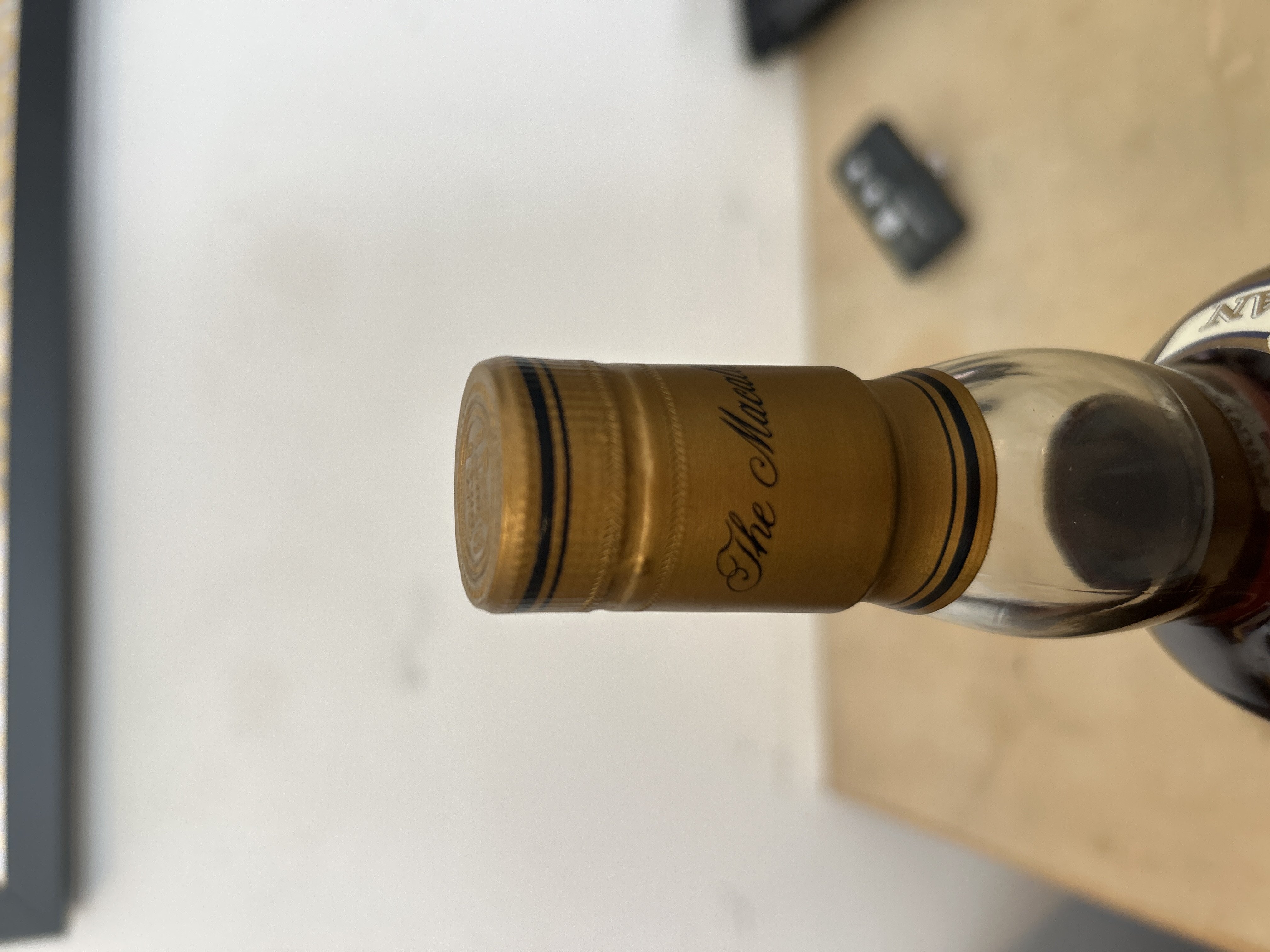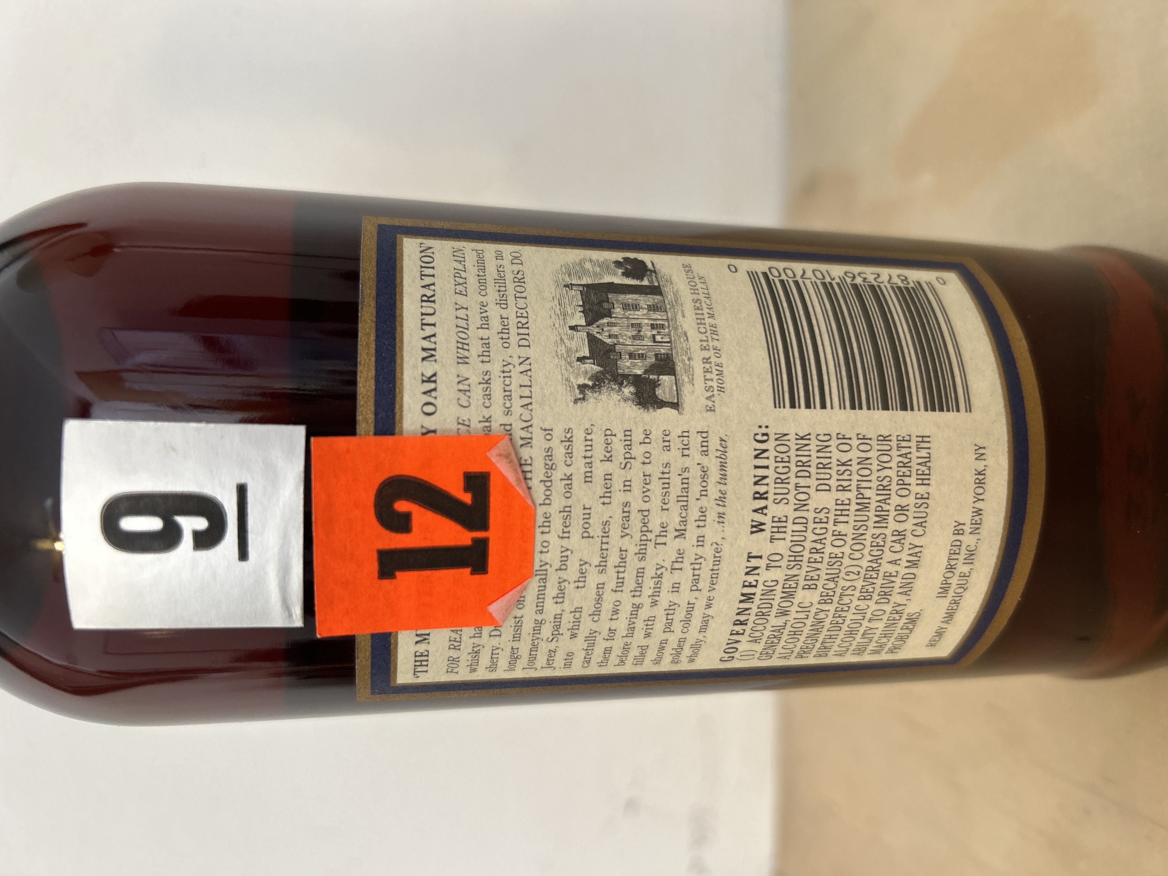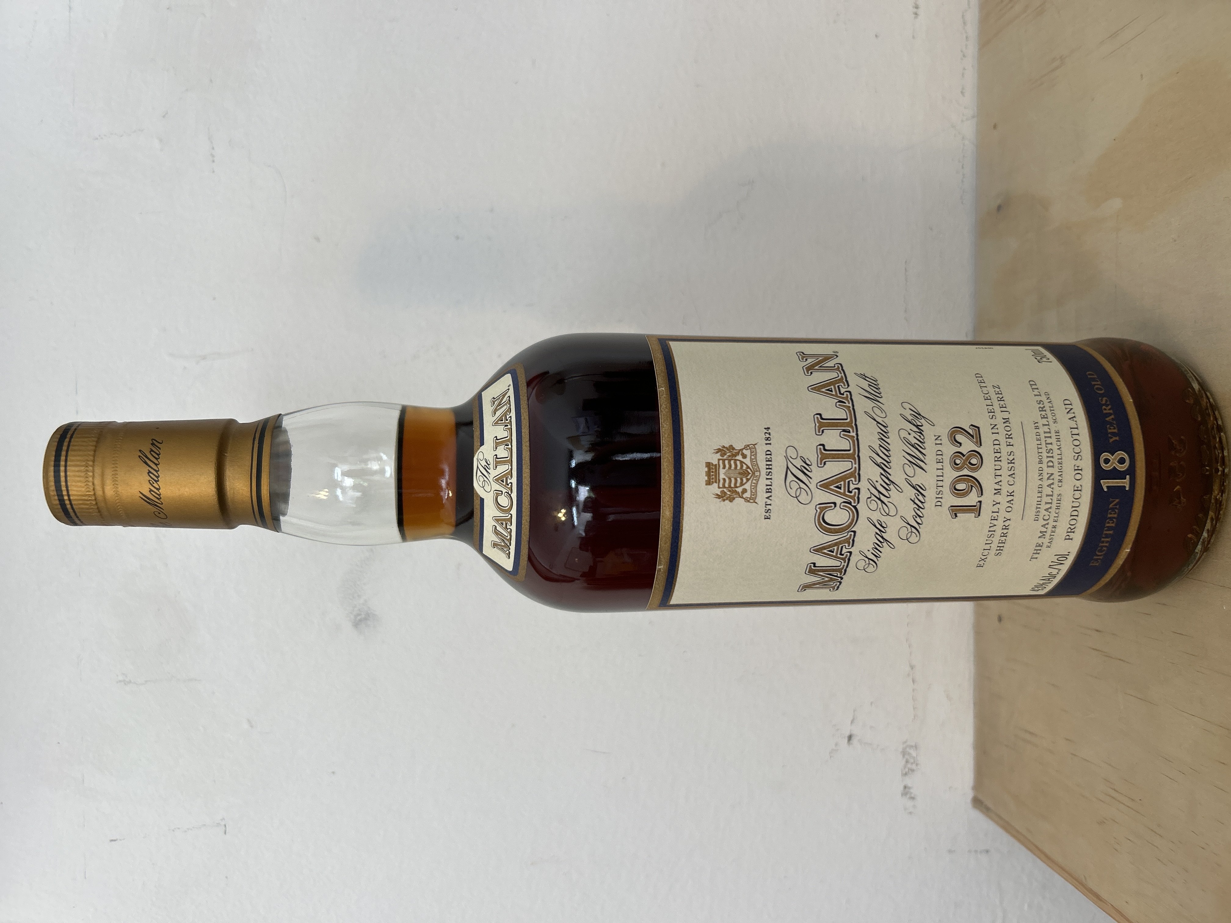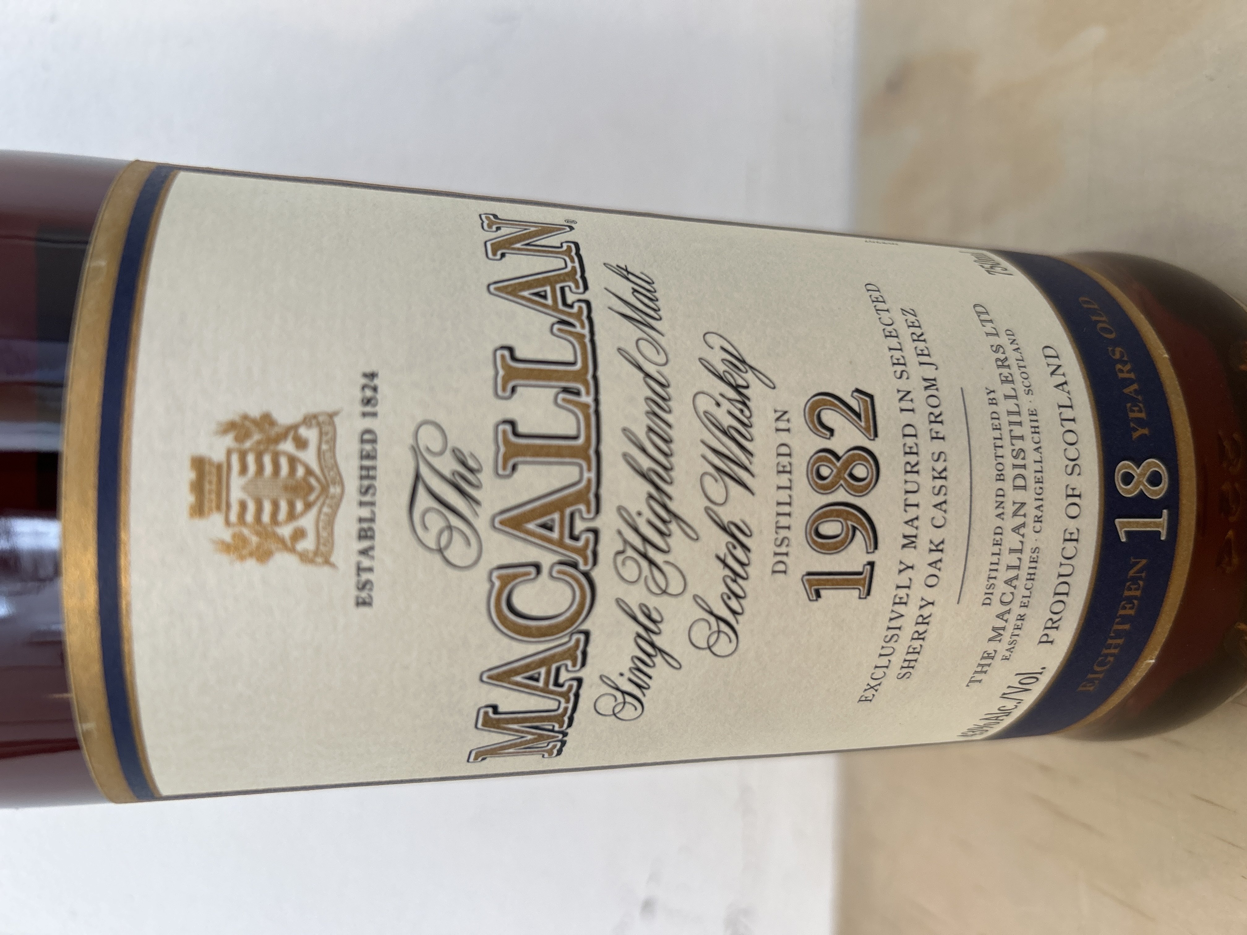 - 1) Text on label: Macallan The MACALLAN MACALLAN SCOTLAND ESTABLISHED 1824 The MACALLAN Single Highland Malt Scotch Whisky DISTILLED IN 1982 EXCLUSIVELY MATURED IN SELECTED SHERRY OAK CASKS FROM JEREZ DISTILLED AND BOTTLED BY THE MACALLAN DISTILLERS LTD EASTER ELCHIES CRAIGELLACHIE SCOTLAND PRODUCT OF SCOTLAND 43% Alc./Vol. 750ml EIGHTEEN 18 YEARS OLD 2) Visual elements: Neck/Capsule: Gold foil capsule with black horizontal stripes at the top and bottom. "Macallan" in cursive script is printed on the mid-capsule. Neck Label: An off-white banner label, bordered in navy blue with a gold outline, featuring "The MACALLAN". Main Label: A large, off-white label with a navy blue border outlined in gold. Upper Label: A gold crest/emblem depicting a crowned shield flanked by supporters. Lower Label: A navy blue strip label at the very bottom, with the age statement. Font Styles: Predominantly sans-serif for information text. "MACALLAN" appears in a prominent decorative block font. Descriptive text like "Single Highland Malt Scotch Whisky" and "The" on the main label use elegant cursive/script. Key numbers and dates ("1982", "18") are rendered in large, shaded serif block fonts. 3) Fill level estimate: well above shoulder into neck: great