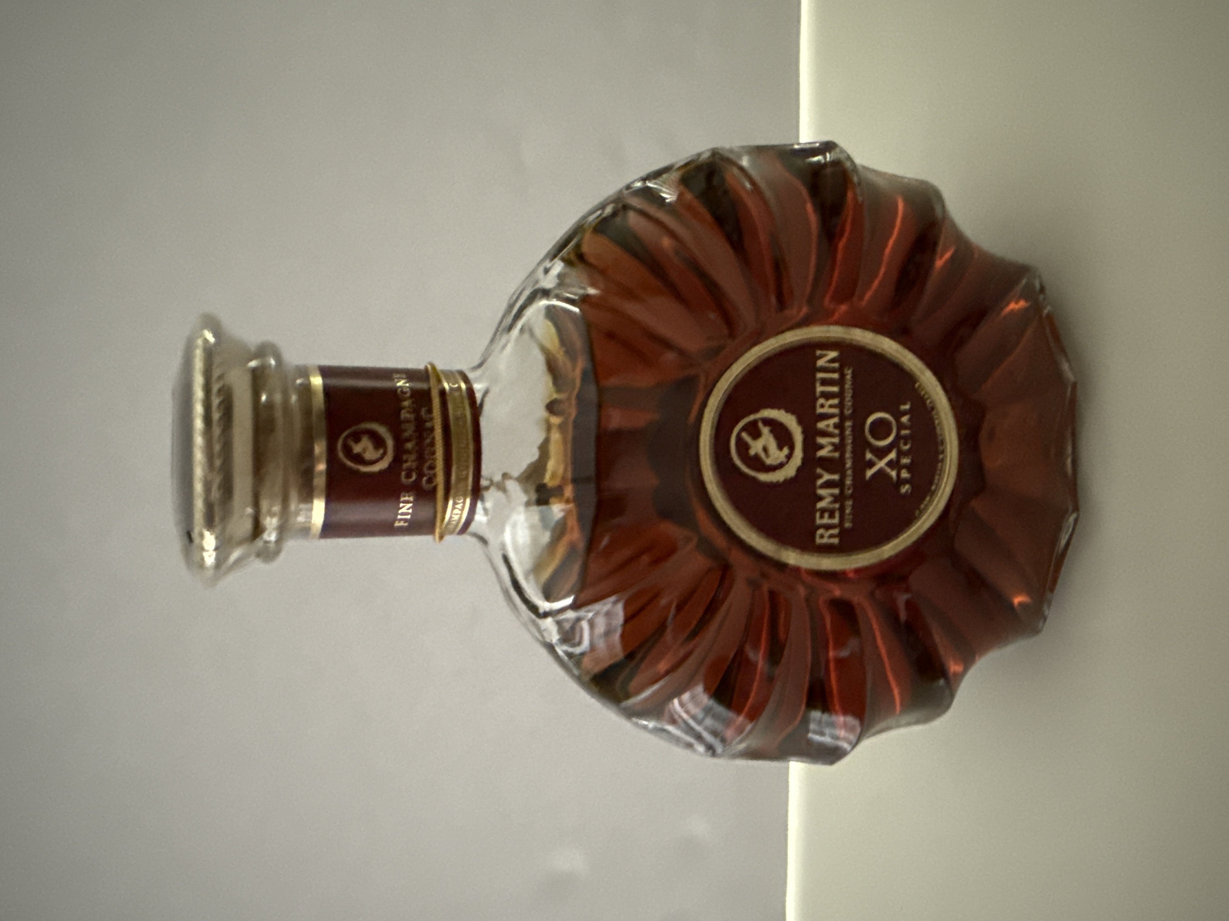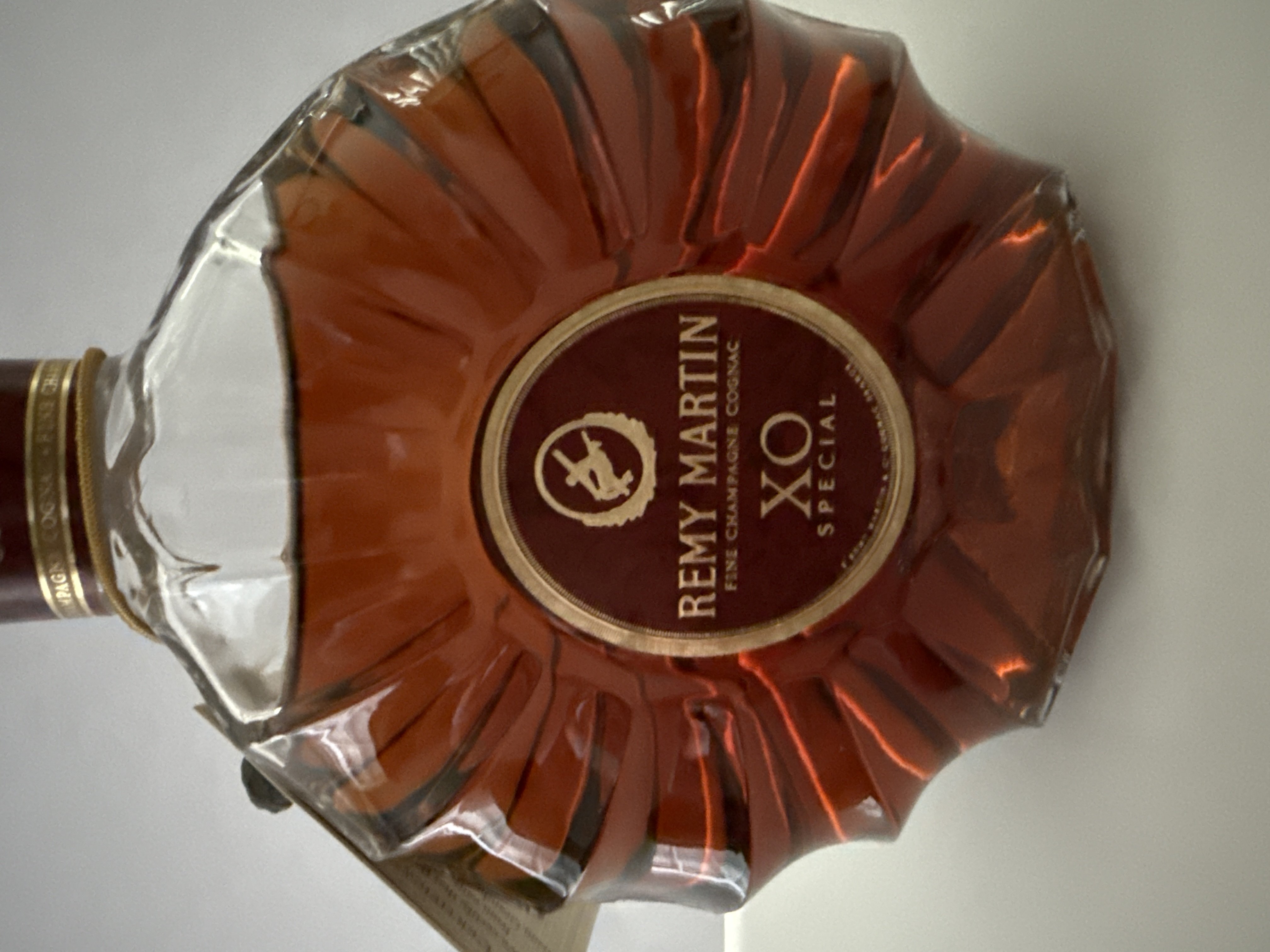 - 1) Text on label: Neck label: FINE CHAMPAGNE COGNAC Mid label: REMY MARTIN FINE CHAMPAGNE COGNAC XO SPECIAL 2) Visual elements: Neck label: Maroon-red label with gold serif text and a gold centaur emblem at the top. A thin gold band with repeating text (unreadable) is visible at the base of the neck label. Mid label: Circular, maroon-red label with a thick gold border. Features a gold centaur emblem at the top. Text includes "REMY MARTIN" (bold serif), "FINE CHAMPAGNE COGNAC" (smaller serif), "XO" (large block/sans-serif), and "SPECIAL" (small sans-serif). Bottle design: The main body of the bottle features a distinctive sunburst/fan-like pleated glass design radiating outwards from the center. Capsule: Gold-colored capsule with a textured (rope-like) band at its base. 3) Fill level estimate: well above shoulder into neck