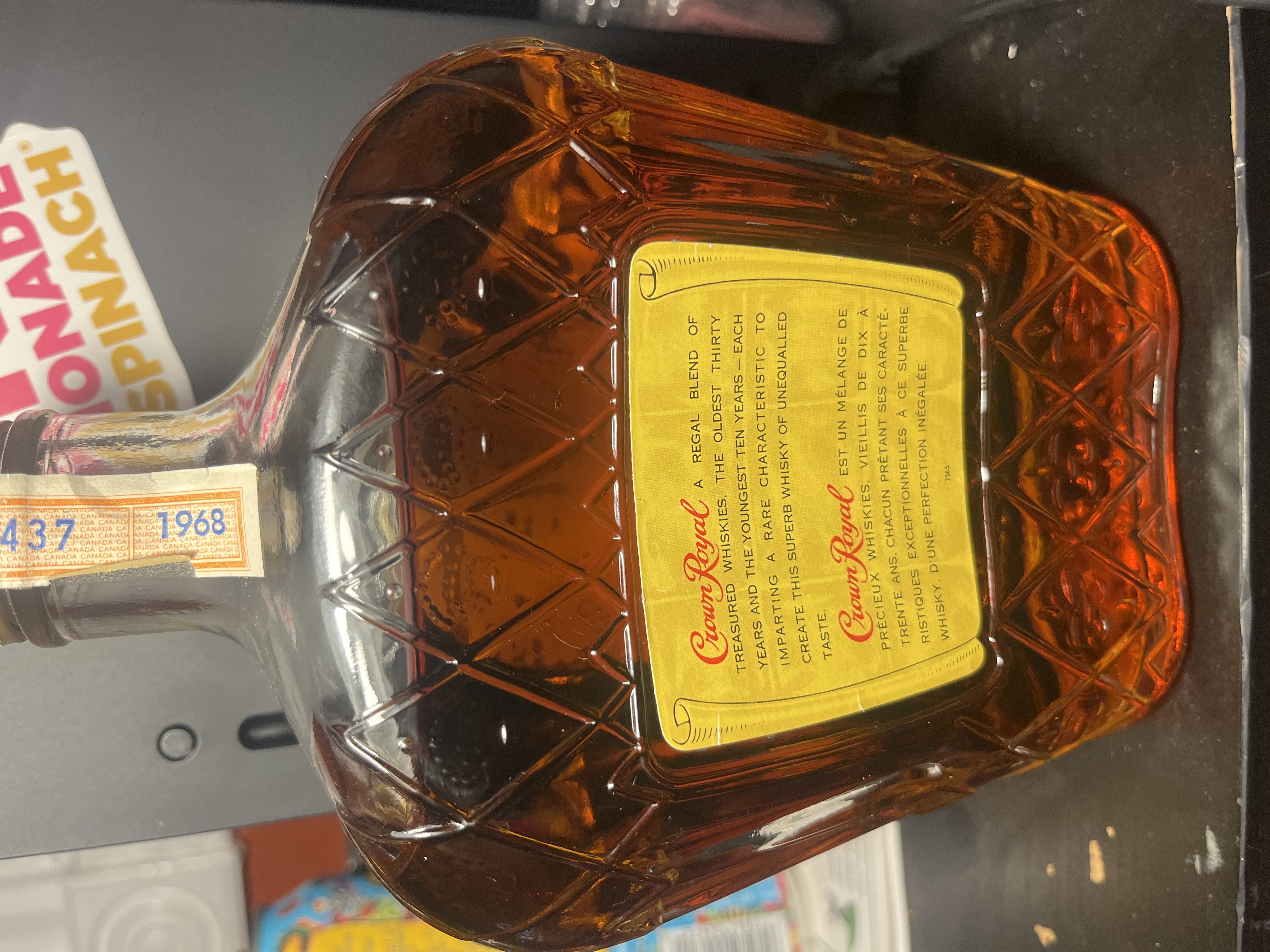 - 1) Text on label: Neck strip (partial, from left to right and top to bottom): BY AUTHORITY OF THE MINISTER OF NATIONAL REVENUE EXCISE 1968 PRODUCT OF CANADA DEPUTY MINISTER Main label: Seagram's Crown Royal De Luxe Canadian Whisky Canadien Joseph E. Seagram & Sons Limited WATERLOO ONTARIO CANADA 25 FL. OZ. LIQ. • 710 mL • 40% ALC/VOL 7564 2) Visual elements: Bottle: Clear glass bottle with faceted, diamond-cut patterns across its body and shoulders. Neck/Cap: A gold-colored, ornate foil wrap covers the top of the cork and neck, featuring embossed patterns. Neck strip: A rectangular paper tax band, predominantly white/off-white with orange borders and blue text "1968" in the center, wraps around the neck and cork. Mid label: This is the main label, with an irregular scroll-like shape and gold trim. It features purple draped curtains with gold tassels at the top. Below the curtains, an ornate red and gold crown rests on a purple cushion with gold accents. Two stylized white rampant creatures (possibly lions or unicorns) are visible on either side of the crown, set against a yellow background. Font styles: The main brand names ("Seagram's", "Crown Royal") are in an elaborate script/cursive style. "De Luxe" and "Canadian Whisky Canadien" use an elegant serif/script. The producer details, location, and volume/alcohol content are primarily in sans-serif, block-like fonts. 3) Fill level estimate: well above shoulder into neck: great