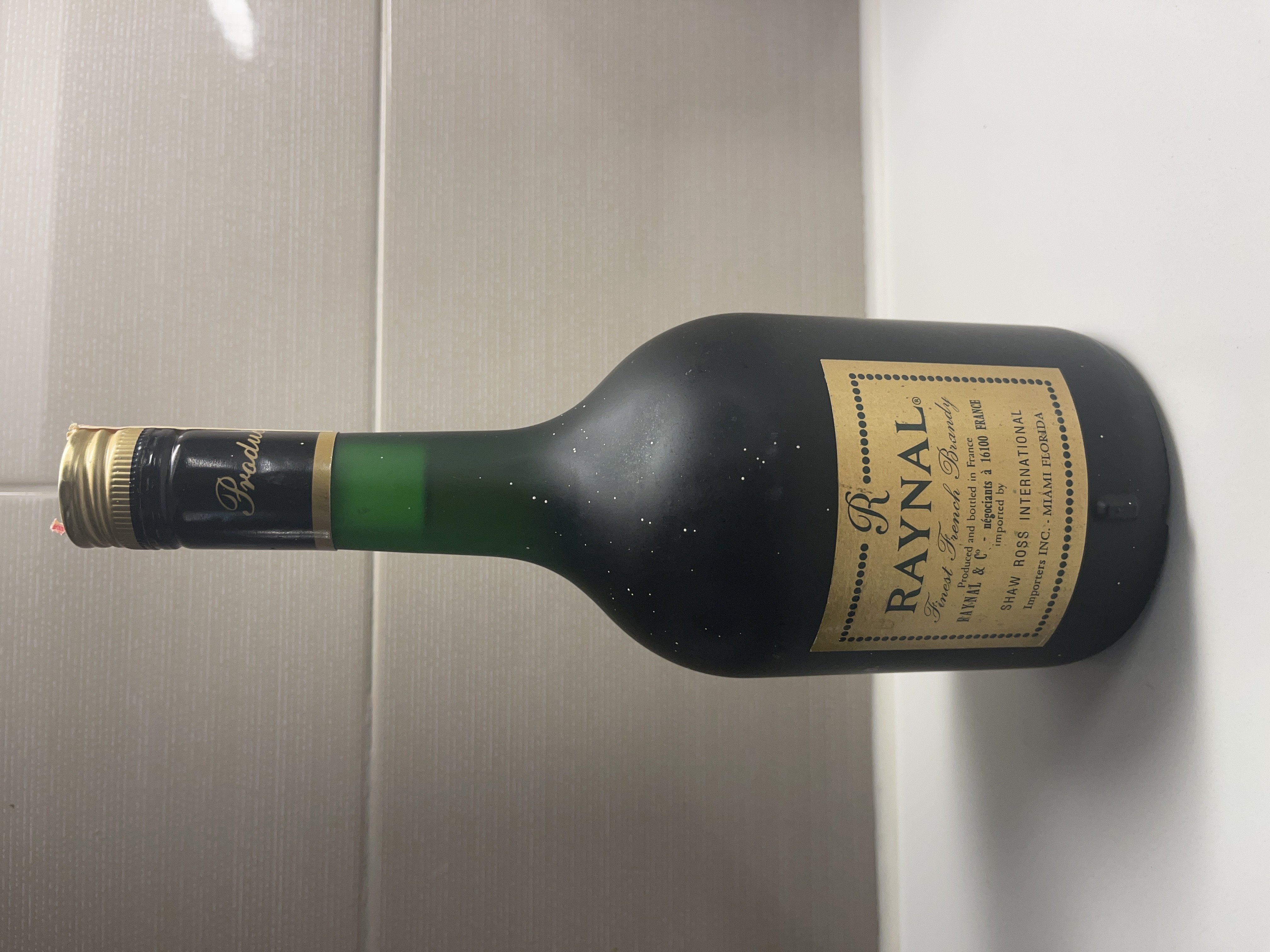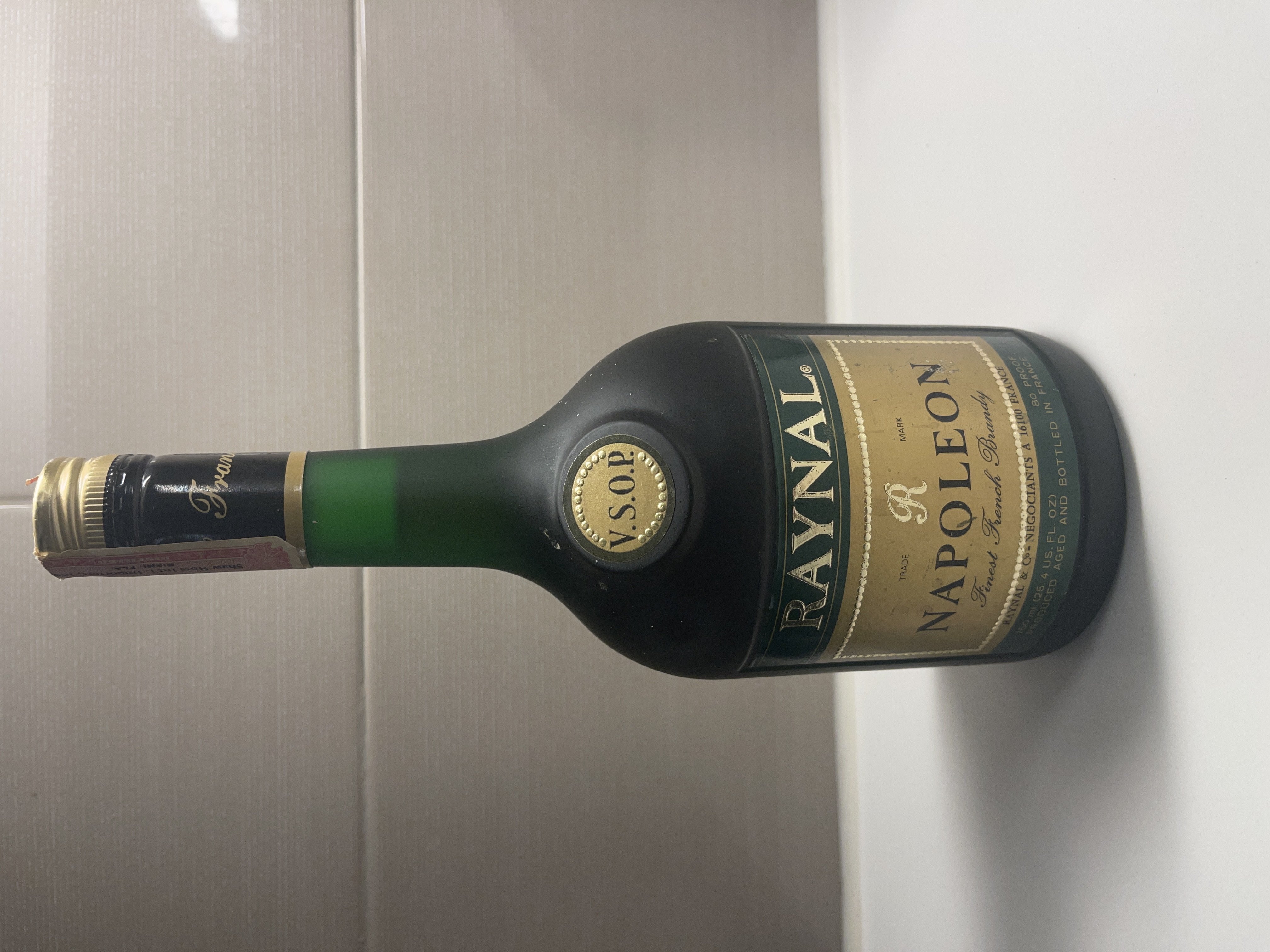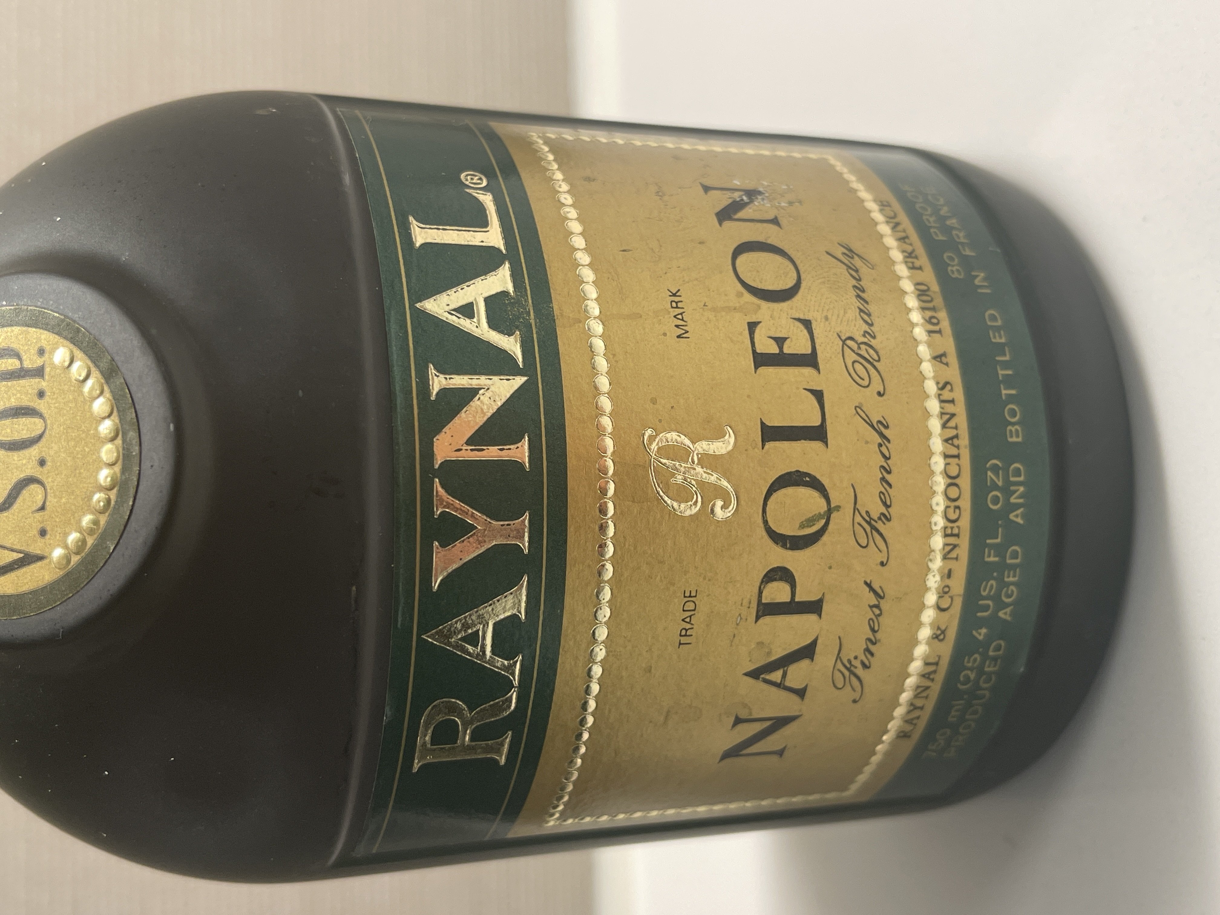 - 1) Text on label: Neck strip label (partially torn and faded): SHAW-ROSS INT'L IMPORTERS, INC. MIAMI, FLA. DISTILLED FROM GRAPE PRODUCTS Neck label: Français Embossed medallion on shoulder: V.S.O.P. Main label (green band at top): RAYNAL® Main label (gold section): TRADE R MARK NAPOLEON Finest French Brandy Main label (green band at bottom): RAYNAL & Co - NEGOCIANTS A 16100 FRANCE 750 ml. (25.4 US. FL. OZ) 80 PROOF PRODUCED AGED AND BOTTLED IN FRANCE 2) Visual elements: Neck/Capsule: A red and white strip label (tax band) is partially attached to the left side of the gold screw cap and neck. Neck: Gold-colored cursive script "Français" is printed on the glossy dark green neck glass. Shoulder: A circular gold medallion is affixed to the front of the frosted dark green shoulder, featuring "V.S.O.P." in block serif font surrounded by a border of small raised dots/beads. Mid label: The main label is rectangular with a gold background bordered by a thin gold line of small dots/beads. The top and bottom portions of the label are dark green bands. Mid label graphics: A stylized gold capital "R" monogram is centered above "NAPOLEON". Font styles: "RAYNAL" and "NAPOLEON" are in a bold, gold serif font. "Finest French Brandy" is in a gold cursive/script font. Smaller text (e.g., "TRADE MARK", "NEGOCIANTS A 16100 FRANCE") appears in a simple sans-serif or small serif font. 3) Fill level estimate: well above shoulder into neck: great